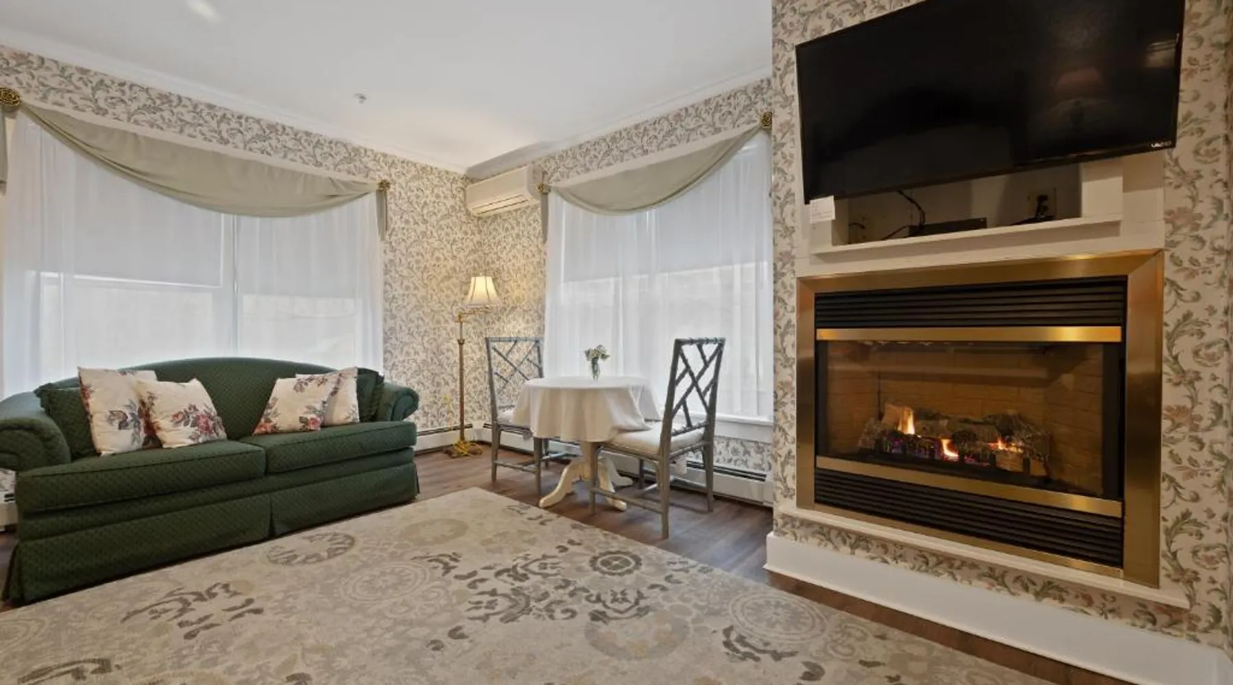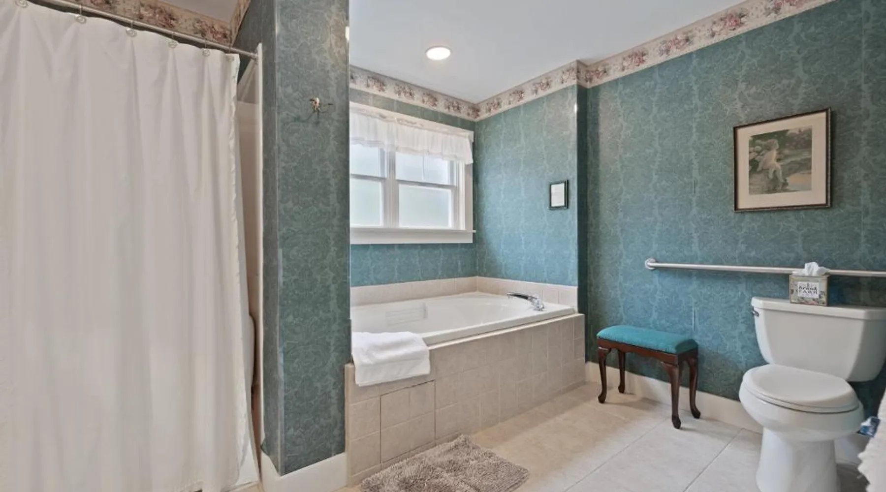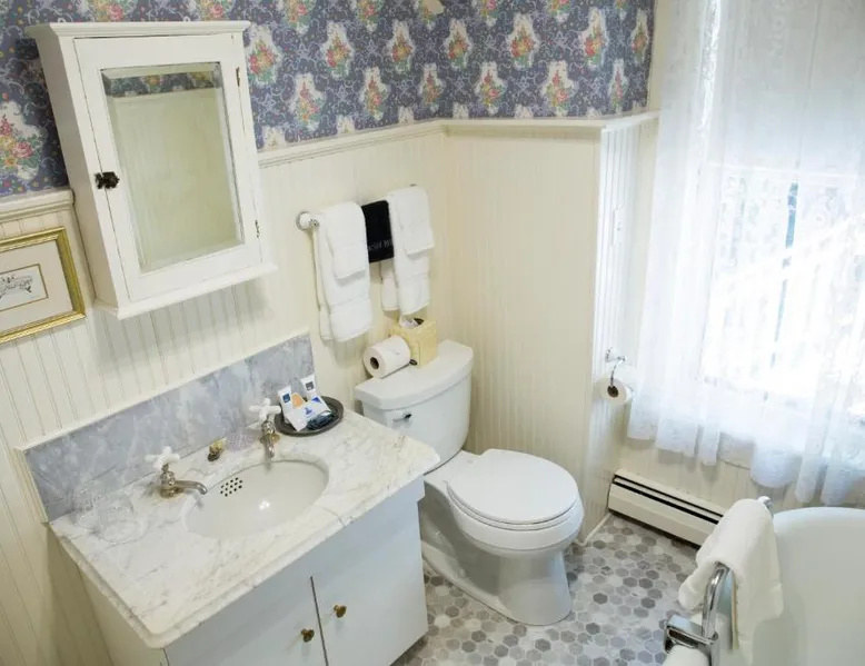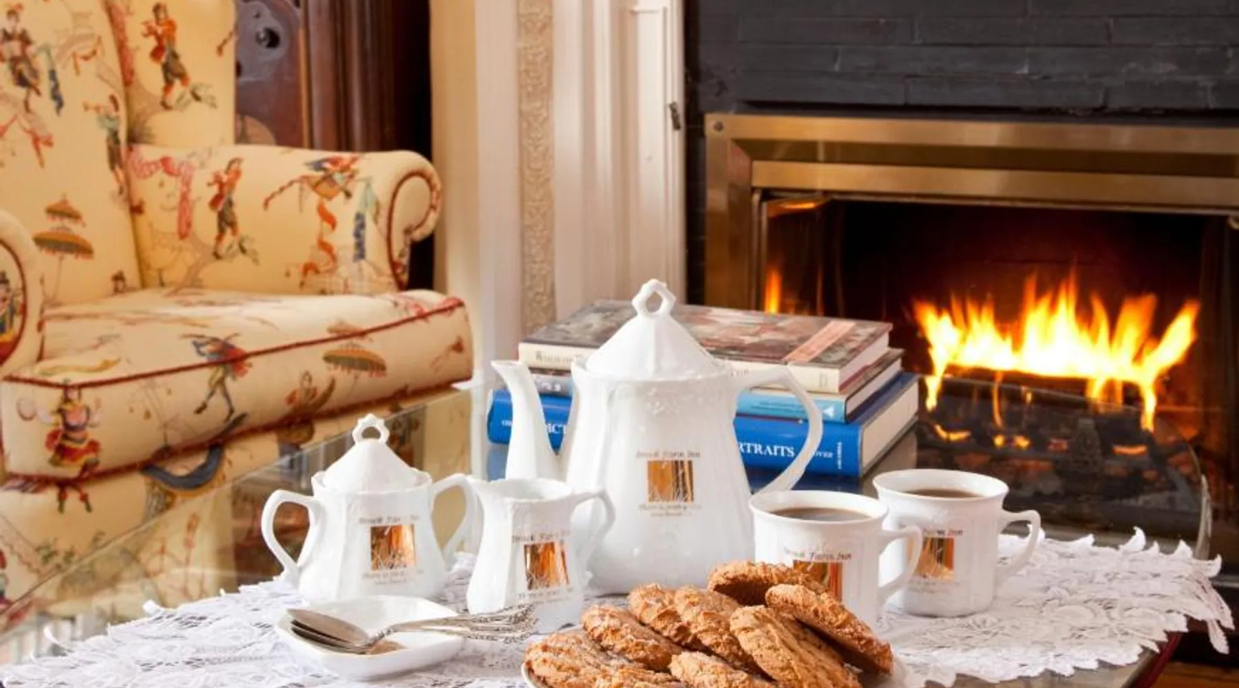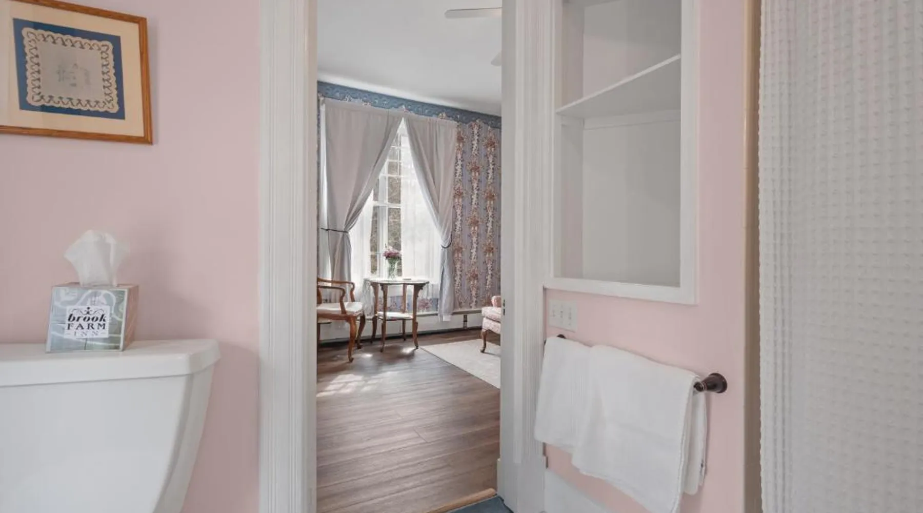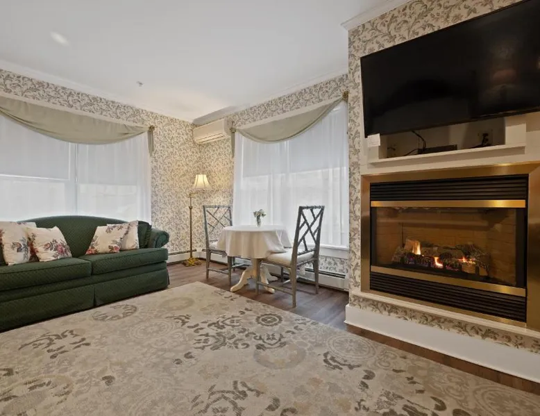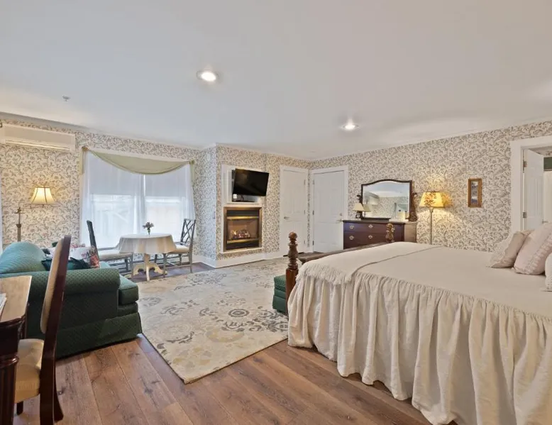 Historic Charm: Brook Farm Inn in Lenox offers a 4-star bed and breakfast experience within a historic building. The property is highly rated for its central location and excellent service. Outdoor Amenities: Guests can enjoy a seasonal outdoor swimming pool, a beautiful garden, and an outdoor fireplace. Free WiFi is available throughout the property, ensuring connectivity. Comfortable Accommodations: Rooms feature air-conditioning, private bathrooms with bidets, and modern amenities such as TVs and work desks. Balconies offer garden or pool views, enhancing the stay. Delicious Breakfast: A variety of breakfast options are available, including American, full English/Irish, vegetarian, vegan, and gluten-free. Fresh fruits, warm dishes, and juices are served daily. Nearby Attractions: Located 1.9 mi from Tanglewood and Cranwell Spa & Golf Club, 6.8 mi from Norman Rockwell Museum, and 28 mi from The Clark Art Institute. Albany International Airport is 49 mi away. Located on the second floor, this room features cool blues and subdued floral plus the refined style of East Lake furniture and marble. It also has a fireplace, a couch, a TV and a bathroom with a bathtub and shower.