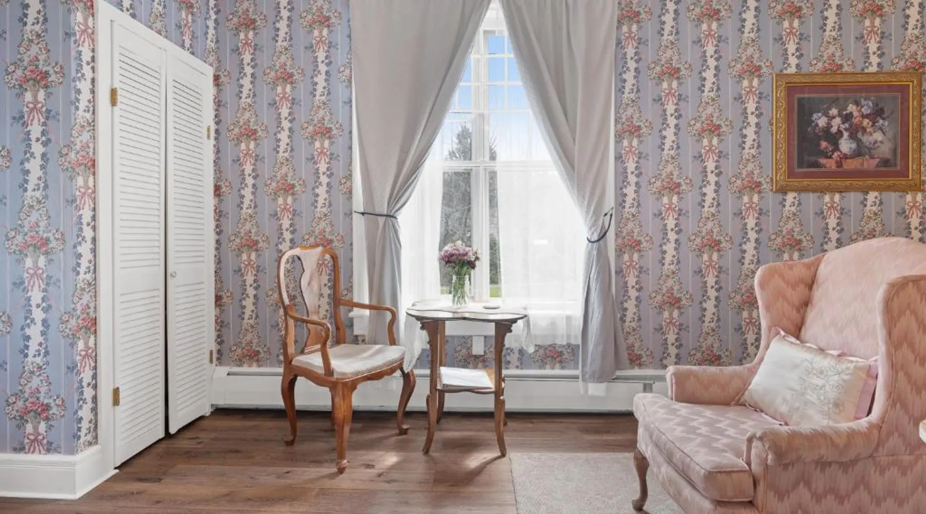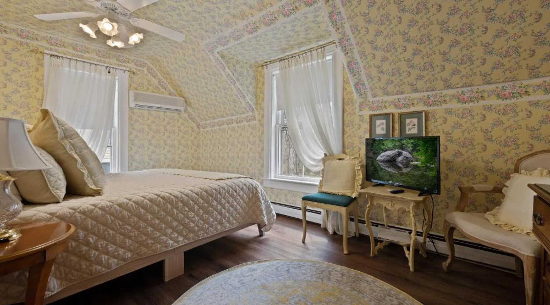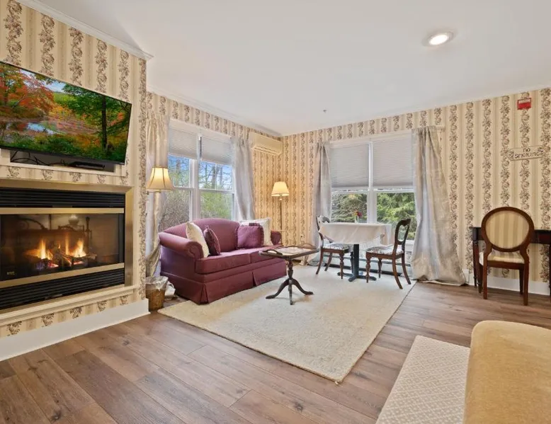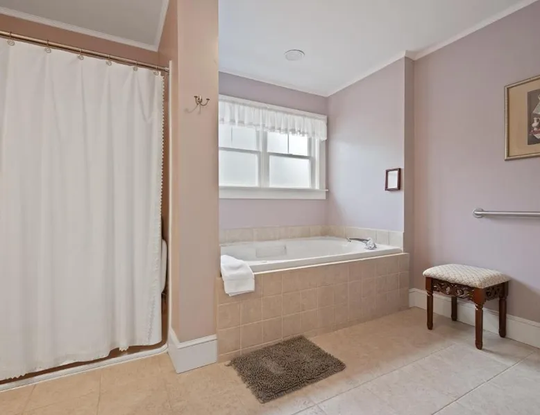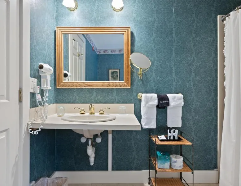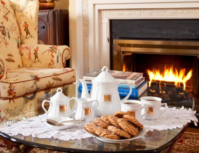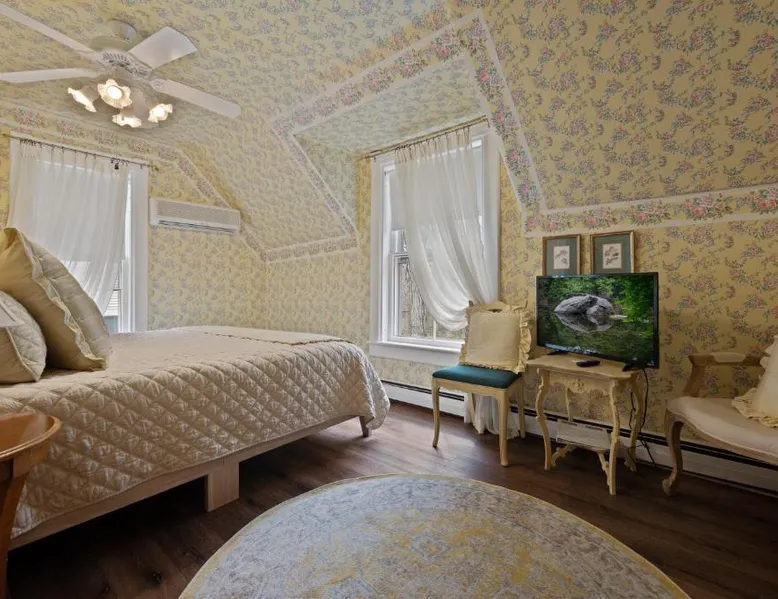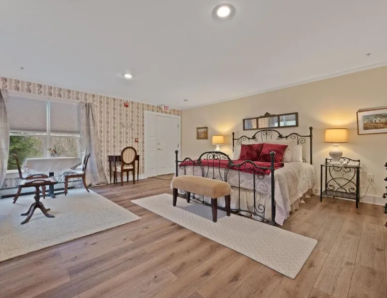 Historic Charm: Brook Farm Inn in Lenox offers a 4-star bed and breakfast experience within a historic building. The property is highly rated for its central location and excellent service. Outdoor Amenities: Guests can enjoy a seasonal outdoor swimming pool, a beautiful garden, and an outdoor fireplace. Free WiFi is available throughout the property, ensuring connectivity. Comfortable Accommodations: Rooms feature air-conditioning, private bathrooms with bidets, and modern amenities such as TVs and work desks. Balconies offer garden or pool views, enhancing the stay. Delicious Breakfast: A variety of breakfast options are available, including American, full English/Irish, vegetarian, vegan, and gluten-free. Fresh fruits, warm dishes, and juices are served daily. Nearby Attractions: Located 1.9 mi from Tanglewood and Cranwell Spa & Golf Club, 6.8 mi from Norman Rockwell Museum, and 28 mi from The Clark Art Institute. Albany International Airport is 49 mi away. Located on the second floor, this room features cool blues and subdued floral plus the refined style of East Lake furniture and marble. It also has a fireplace, a couch, a TV and a bathroom with a bathtub and shower.