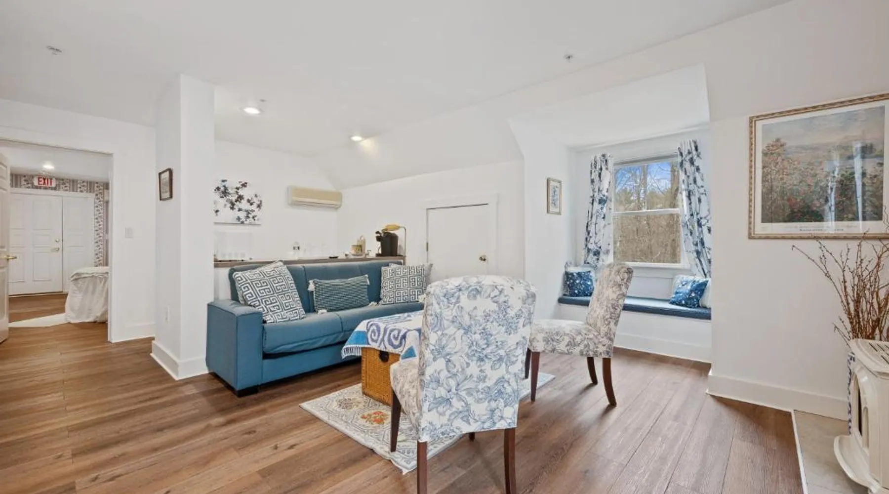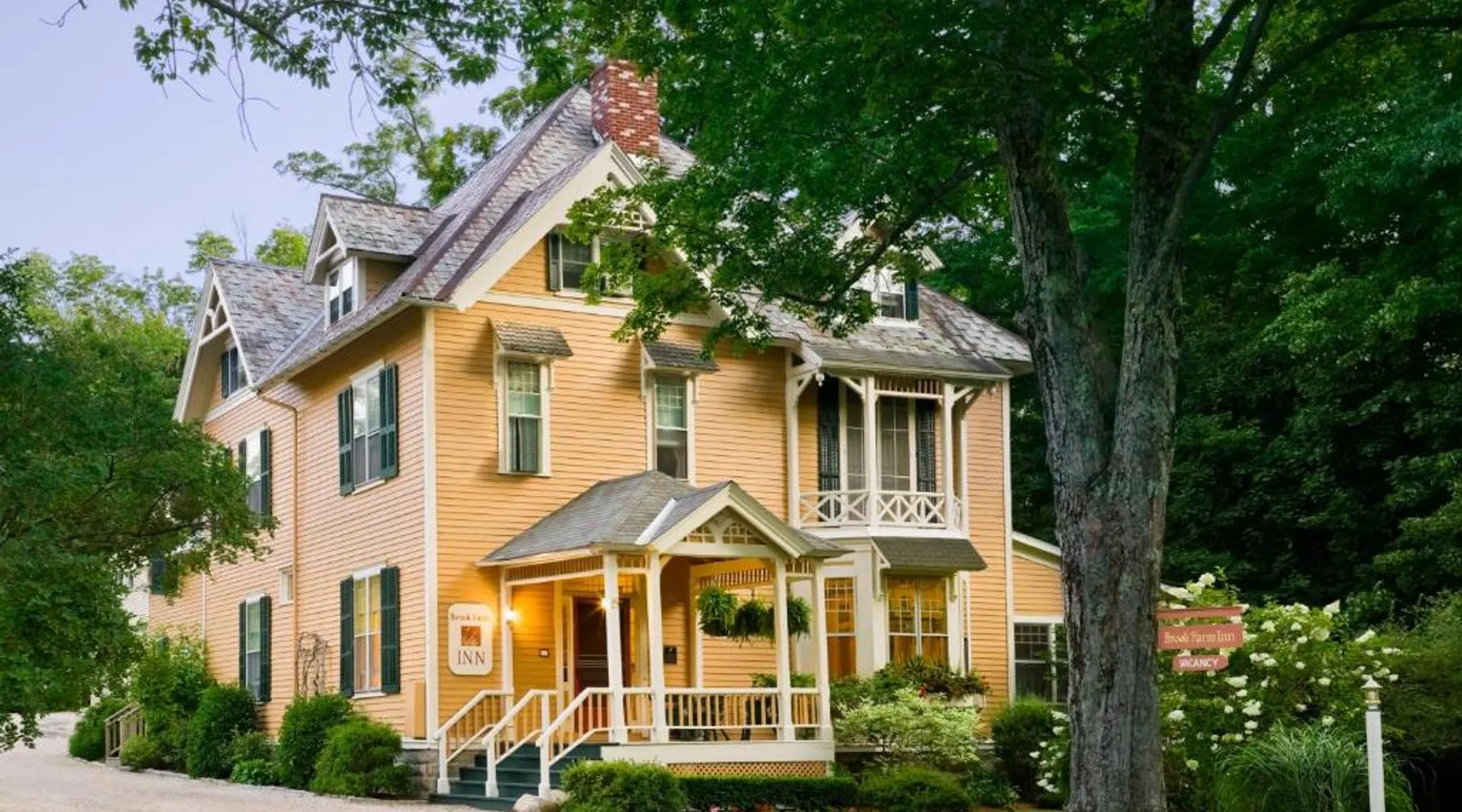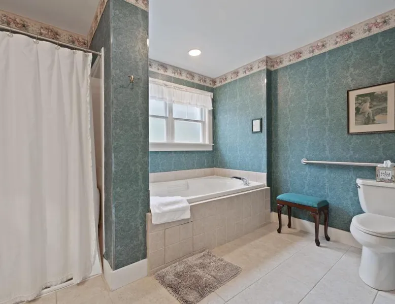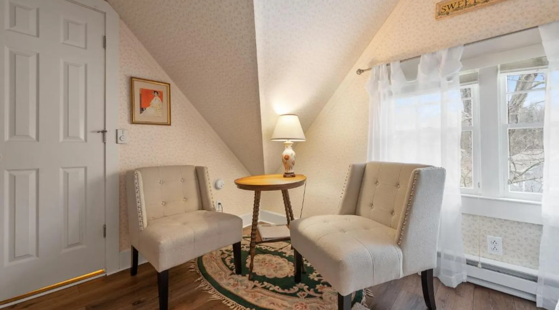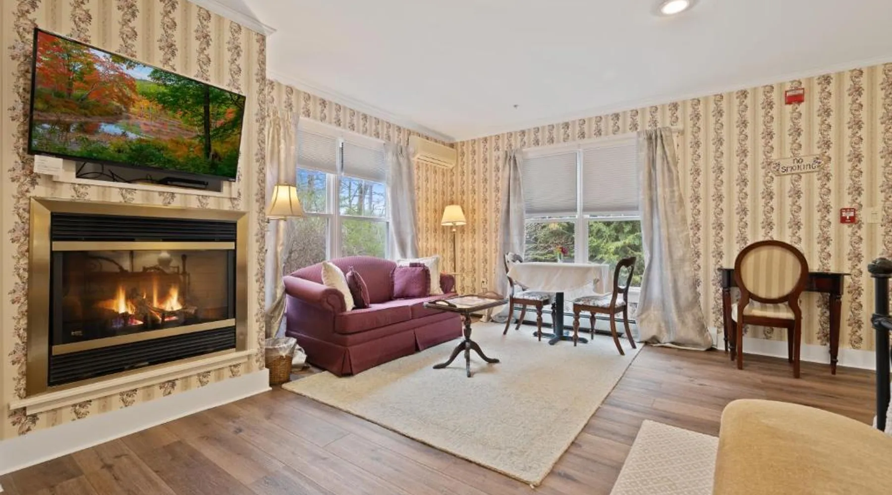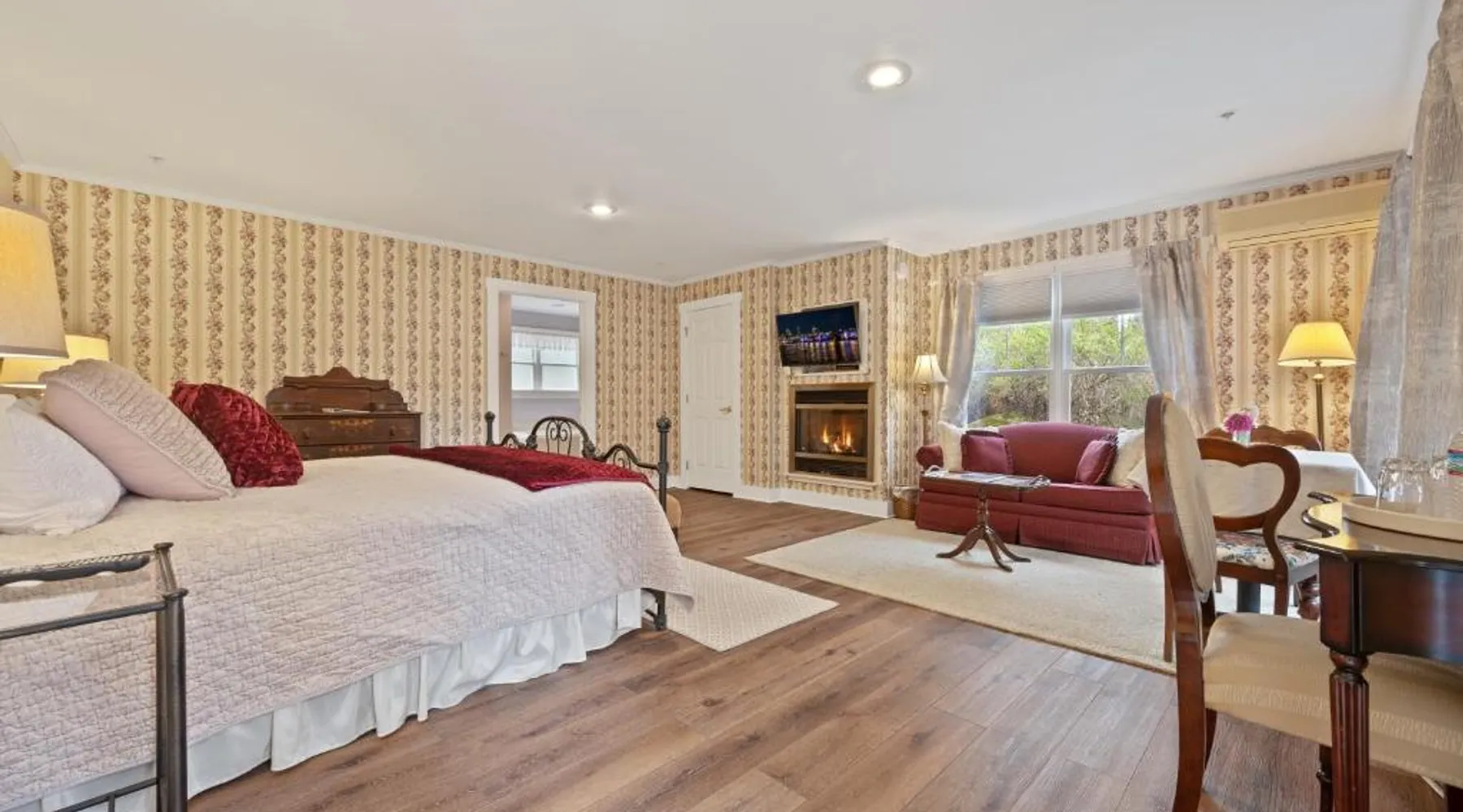 Historic Charm: Brook Farm Inn in Lenox offers a 4-star bed and breakfast experience within a historic building. The property is highly rated for its central location and excellent service. Outdoor Amenities: Guests can enjoy a seasonal outdoor swimming pool, a beautiful garden, and an outdoor fireplace. Free WiFi is available throughout the property, ensuring connectivity. Comfortable Accommodations: Rooms feature air-conditioning, private bathrooms with bidets, and modern amenities such as TVs and work desks. Balconies offer garden or pool views, enhancing the stay. Delicious Breakfast: A variety of breakfast options are available, including American, full English/Irish, vegetarian, vegan, and gluten-free. Fresh fruits, warm dishes, and juices are served daily. Nearby Attractions: Located 1.9 mi from Tanglewood and Cranwell Spa & Golf Club, 6.8 mi from Norman Rockwell Museum, and 28 mi from The Clark Art Institute. Albany International Airport is 49 mi away. Located on the second floor, this room features cool blues and subdued floral plus the refined style of East Lake furniture and marble. It also has a fireplace, a couch, a TV and a bathroom with a bathtub and shower.