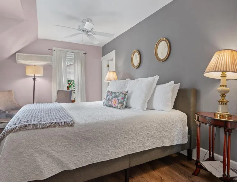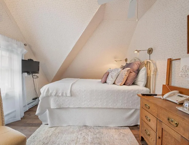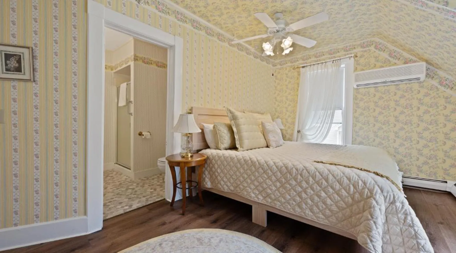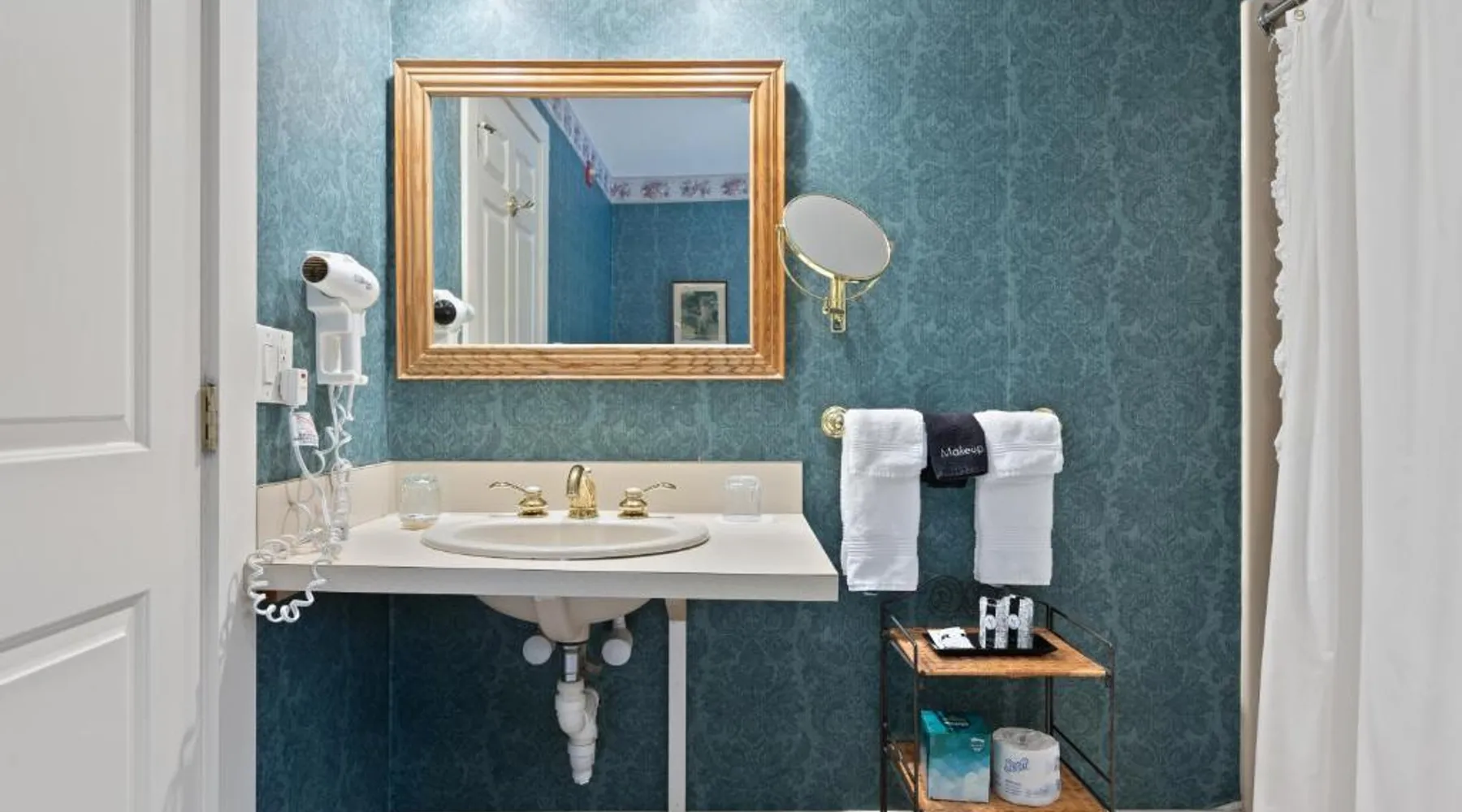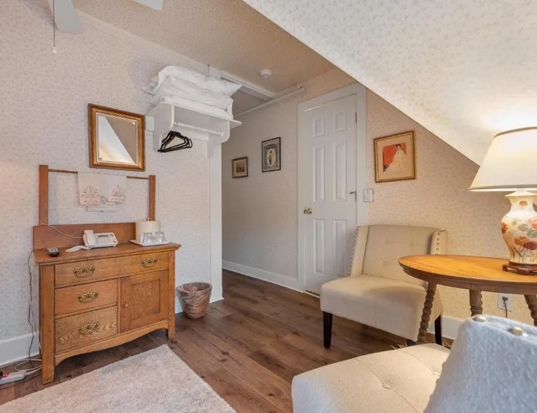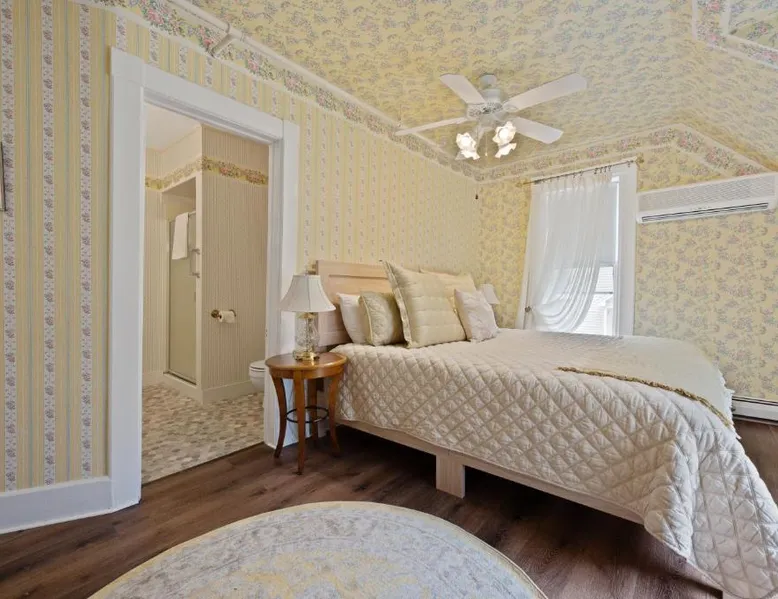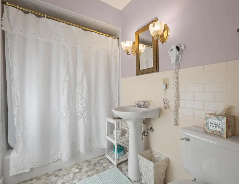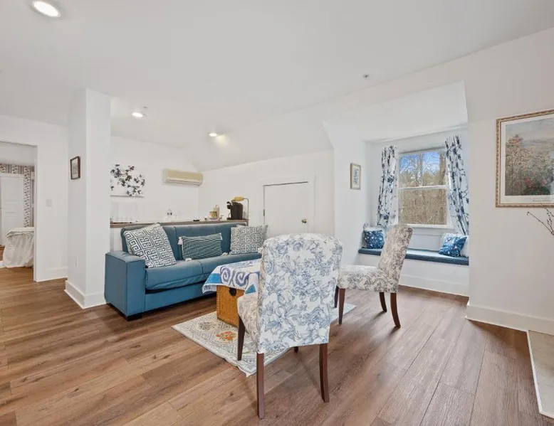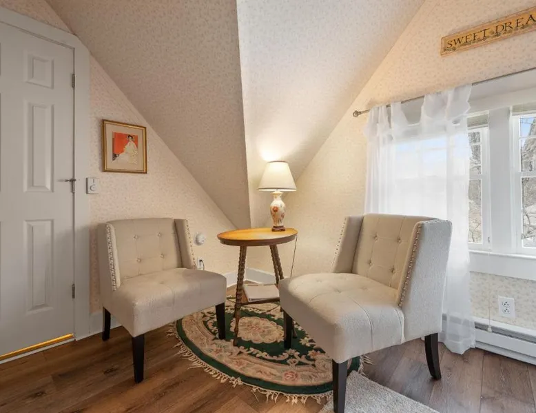 Historic Charm: Brook Farm Inn in Lenox offers a 4-star bed and breakfast experience within a historic building. The property is highly rated for its central location and excellent service. Outdoor Amenities: Guests can enjoy a seasonal outdoor swimming pool, a beautiful garden, and an outdoor fireplace. Free WiFi is available throughout the property, ensuring connectivity. Comfortable Accommodations: Rooms feature air-conditioning, private bathrooms with bidets, and modern amenities such as TVs and work desks. Balconies offer garden or pool views, enhancing the stay. Delicious Breakfast: A variety of breakfast options are available, including American, full English/Irish, vegetarian, vegan, and gluten-free. Fresh fruits, warm dishes, and juices are served daily. Nearby Attractions: Located 1.9 mi from Tanglewood and Cranwell Spa & Golf Club, 6.8 mi from Norman Rockwell Museum, and 28 mi from The Clark Art Institute. Albany International Airport is 49 mi away. Located on the second floor, this room features cool blues and subdued floral plus the refined style of East Lake furniture and marble. It also has a fireplace, a couch, a TV and a bathroom with a bathtub and shower.
