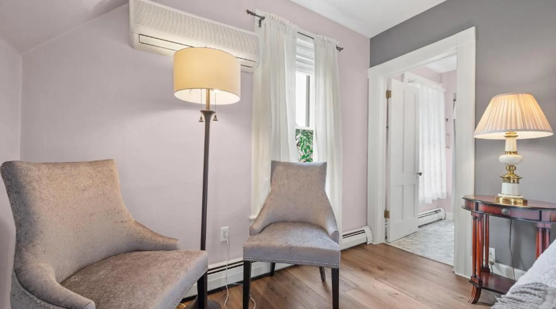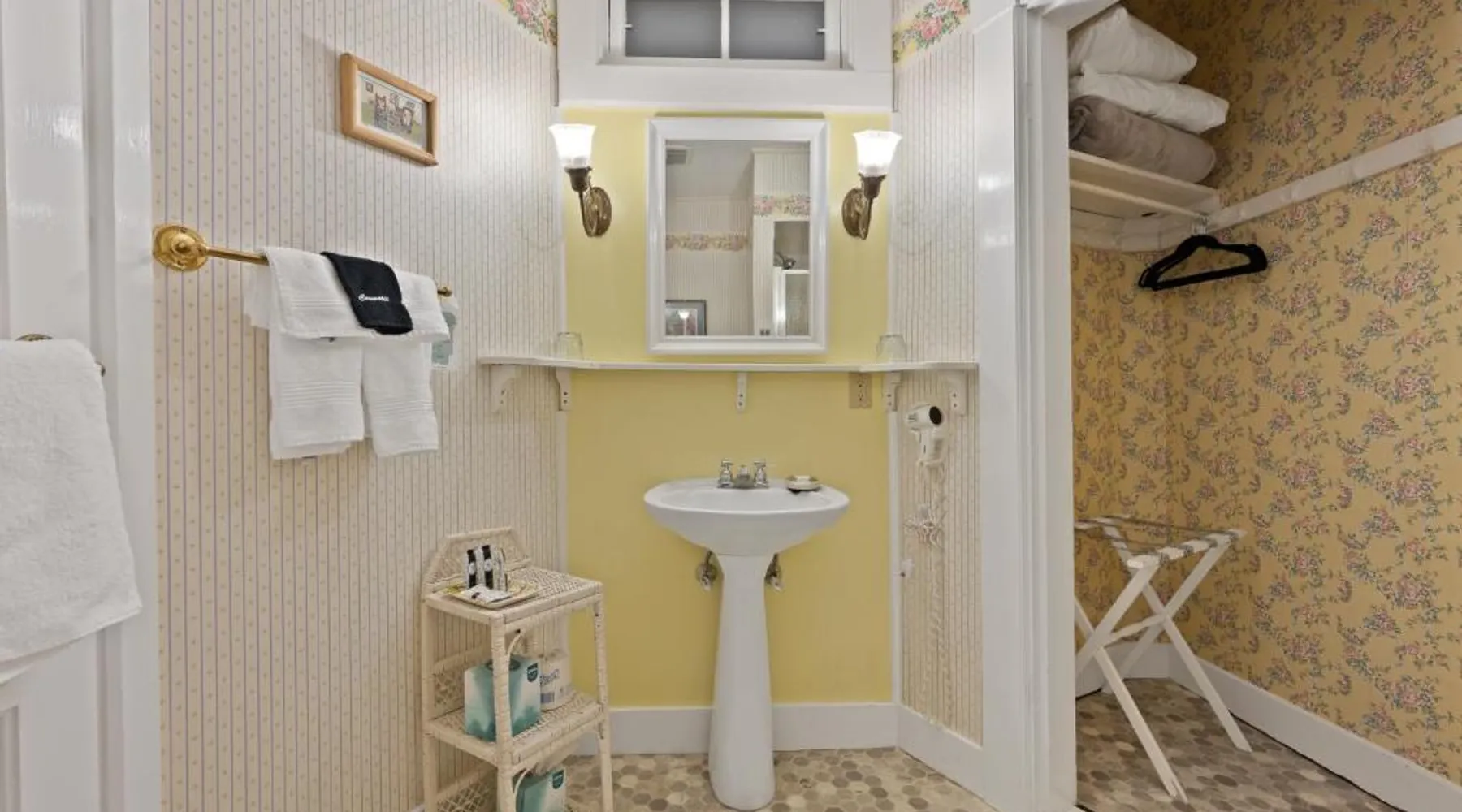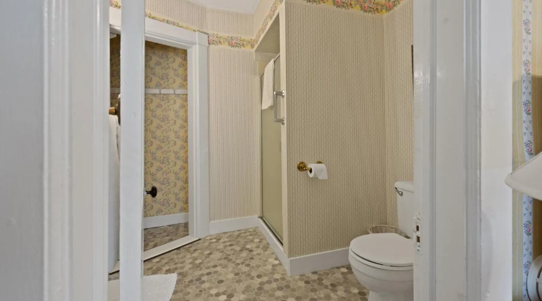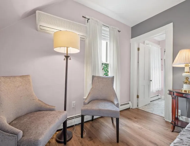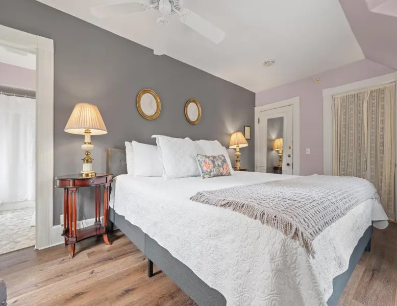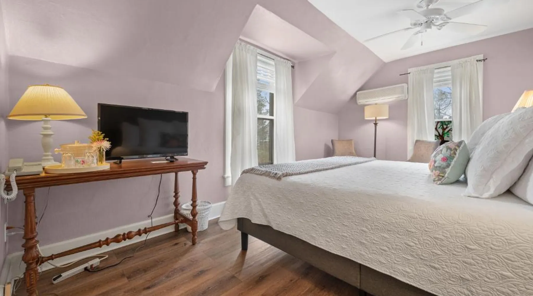 Historic Charm: Brook Farm Inn in Lenox offers a 4-star bed and breakfast experience within a historic building. The property is highly rated for its central location and excellent service. Outdoor Amenities: Guests can enjoy a seasonal outdoor swimming pool, a beautiful garden, and an outdoor fireplace. Free WiFi is available throughout the property, ensuring connectivity. Comfortable Accommodations: Rooms feature air-conditioning, private bathrooms with bidets, and modern amenities such as TVs and work desks. Balconies offer garden or pool views, enhancing the stay. Delicious Breakfast: A variety of breakfast options are available, including American, full English/Irish, vegetarian, vegan, and gluten-free. Fresh fruits, warm dishes, and juices are served daily. Nearby Attractions: Located 1.9 mi from Tanglewood and Cranwell Spa & Golf Club, 6.8 mi from Norman Rockwell Museum, and 28 mi from The Clark Art Institute. Albany International Airport is 49 mi away. Located on the second floor, this room features cool blues and subdued floral plus the refined style of East Lake furniture and marble. It also has a fireplace, a couch, a TV and a bathroom with a bathtub and shower.