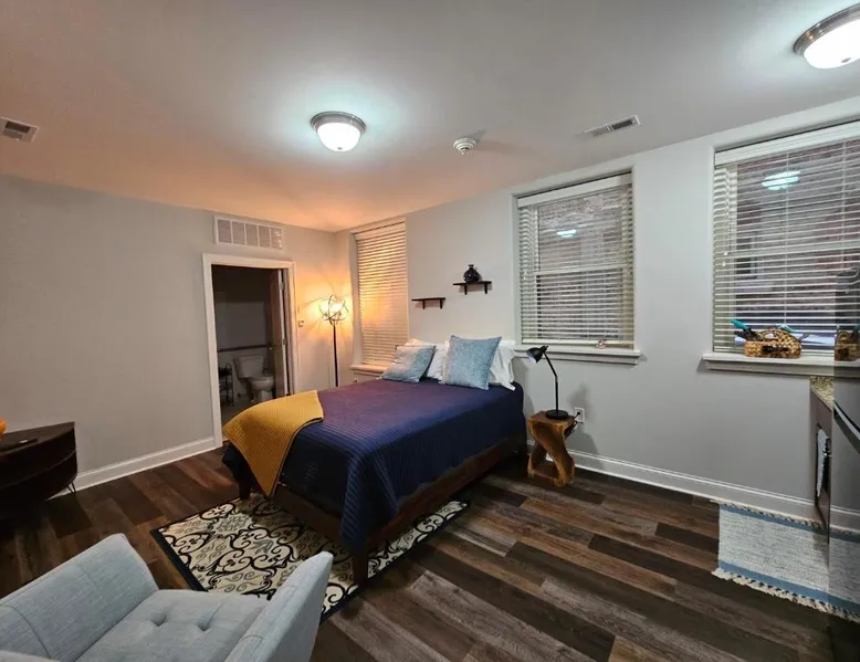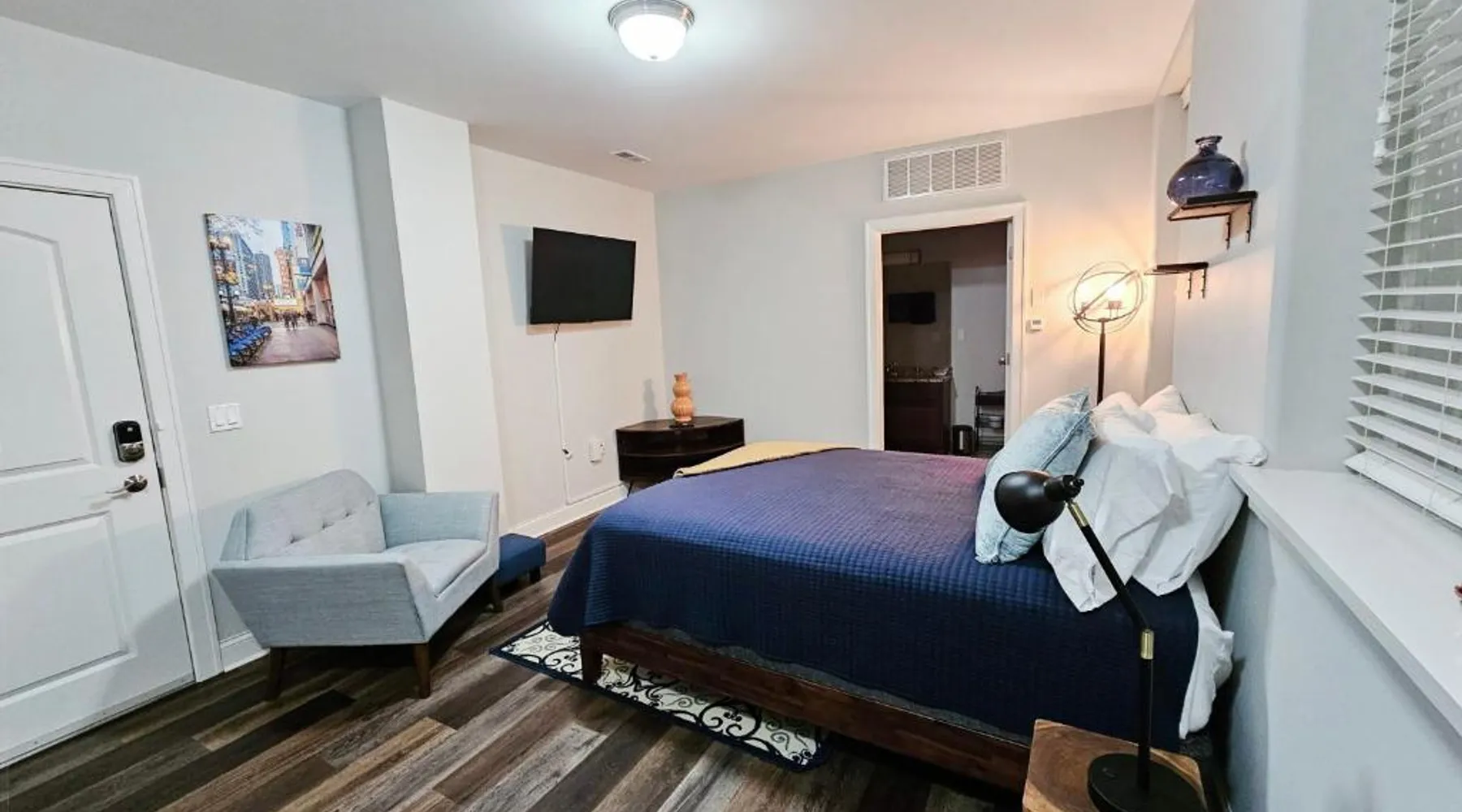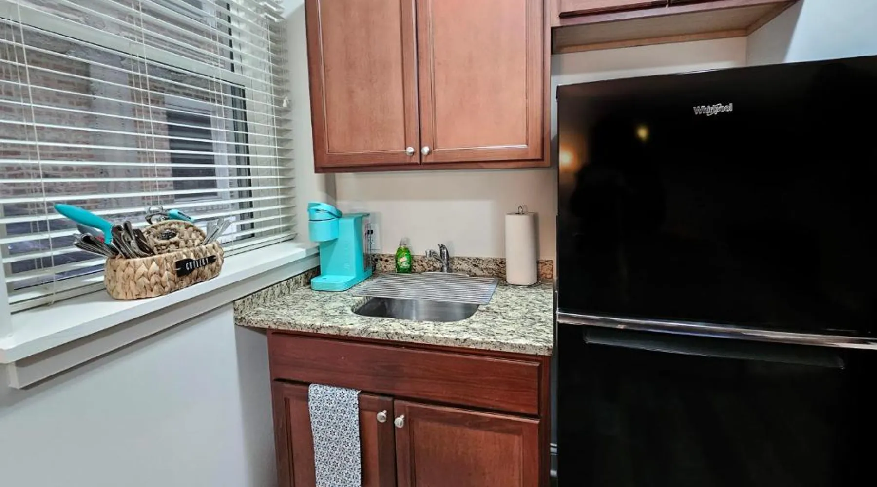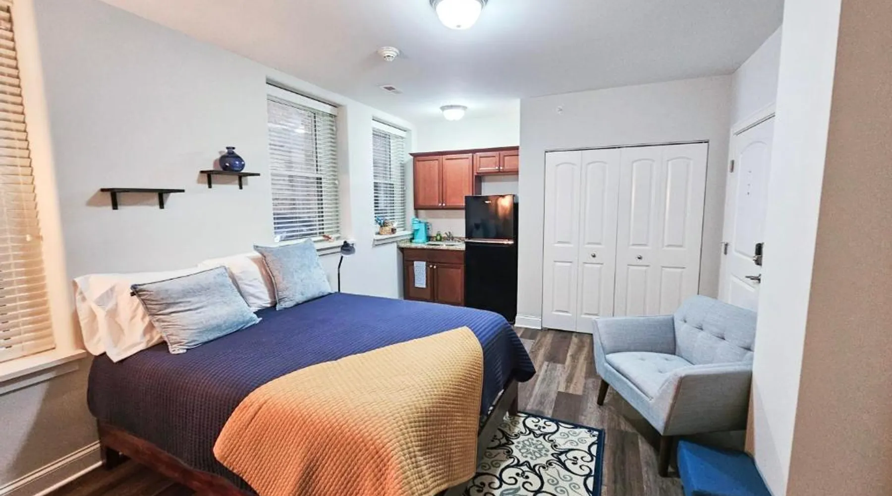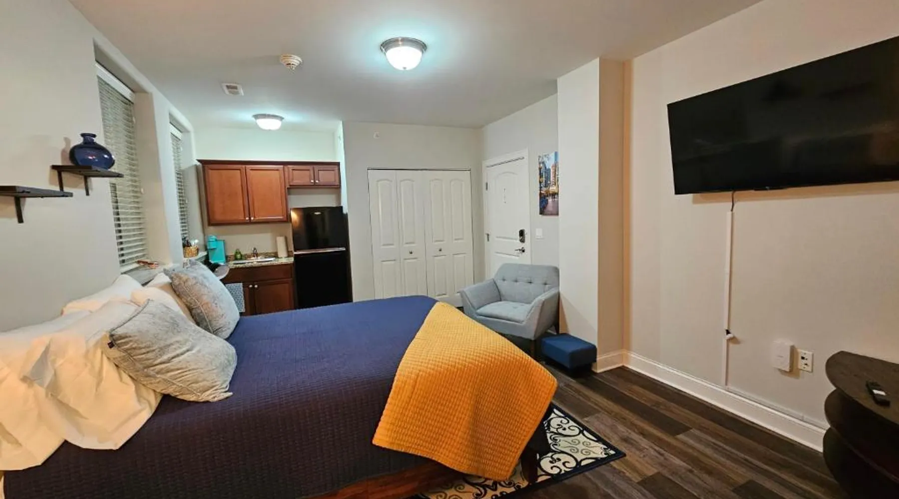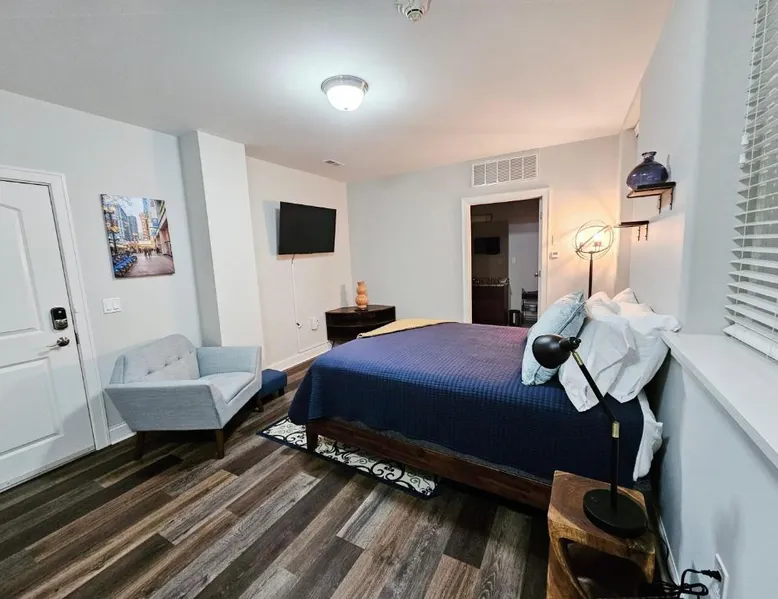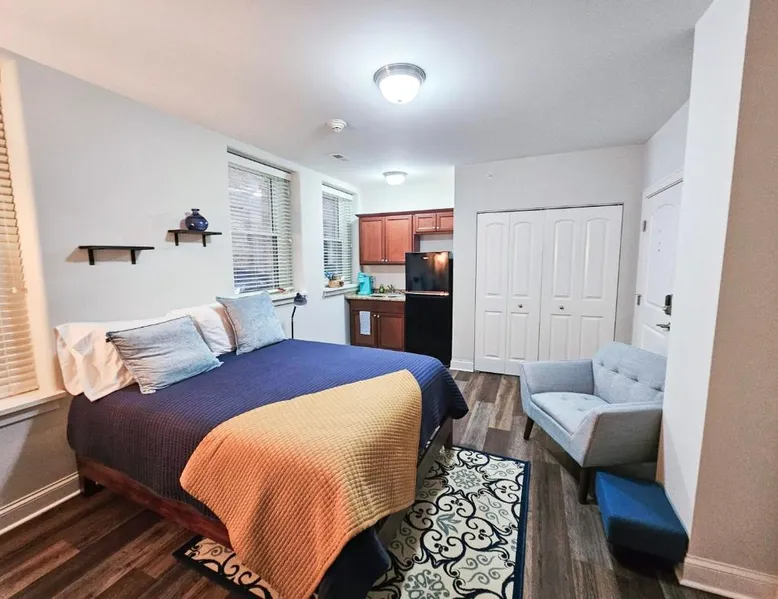Comfortable Living Space: Cute + Cozy Studio at The Inman - 207 in Champaign offers a one-bedroom apartment with a city view. The property includes a kitchenette, air-conditioning, and a elevator for easy access. Modern Amenities: Guests enjoy free WiFi, a tea and coffee maker, hairdryer, refrigerator, microwave, kitchenware, and a TV. Free on-site private parking is available. Convenient Location: Located 6.8 mi from University of Illinois-Willard Airport, the apartment is a 6-minute walk from Orpheum Children's Science Museum and 1.2 mi from Illini Union. Nearby attractions include Champaign Memorial Stadium, Krannert Art Museum, and an ice-skating rink. The well-equipped kitchenette features a refrigerator, kitchenware and a microwave. The apartment offers air conditioning, a tea and coffee maker, heating, a TV, as well as city views. The unit offers 1 bed.