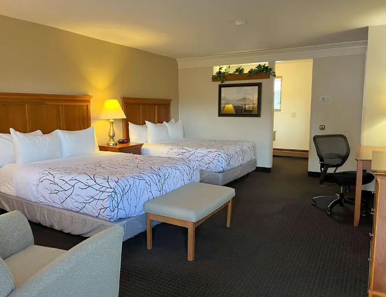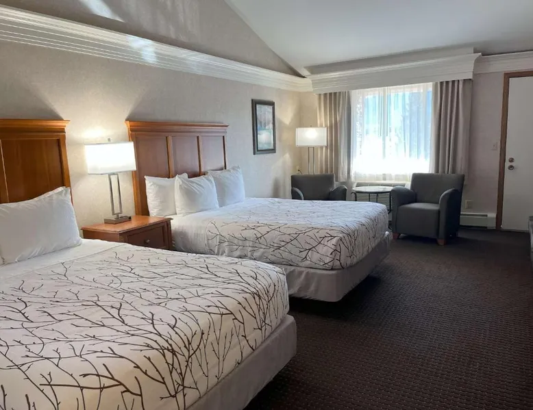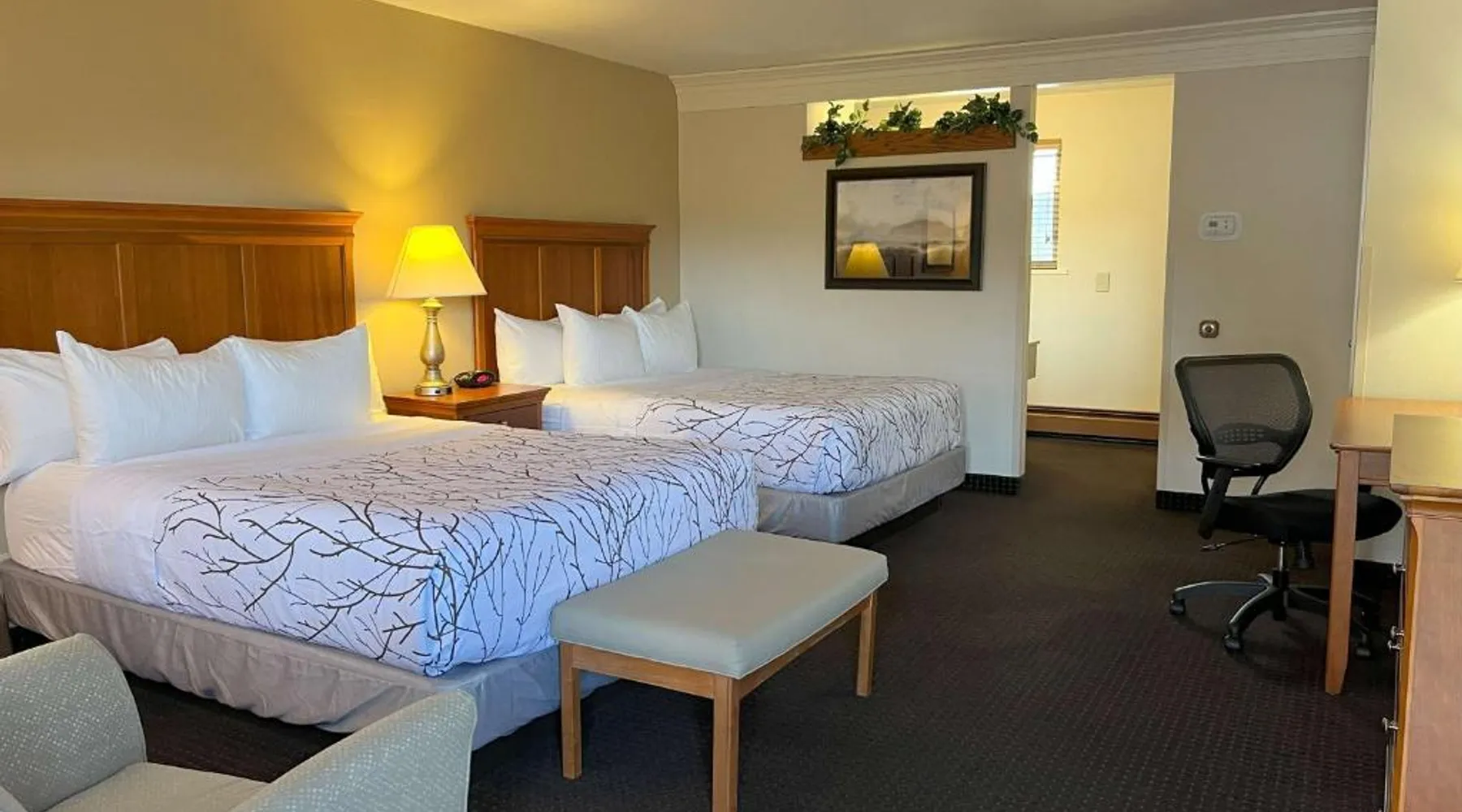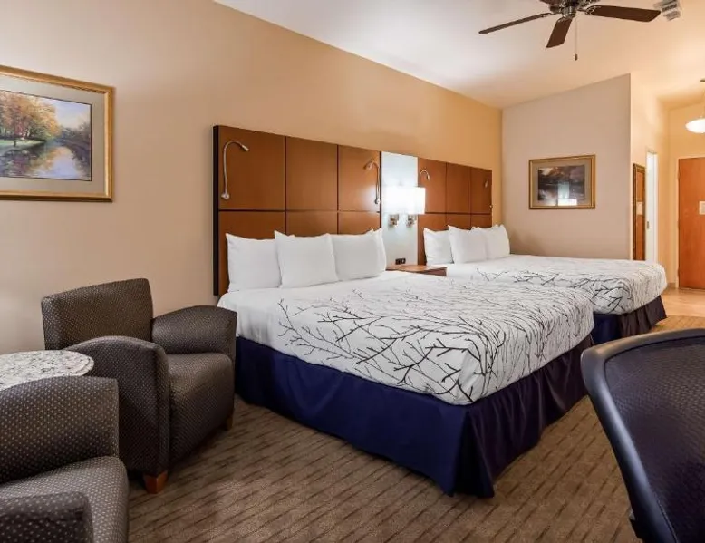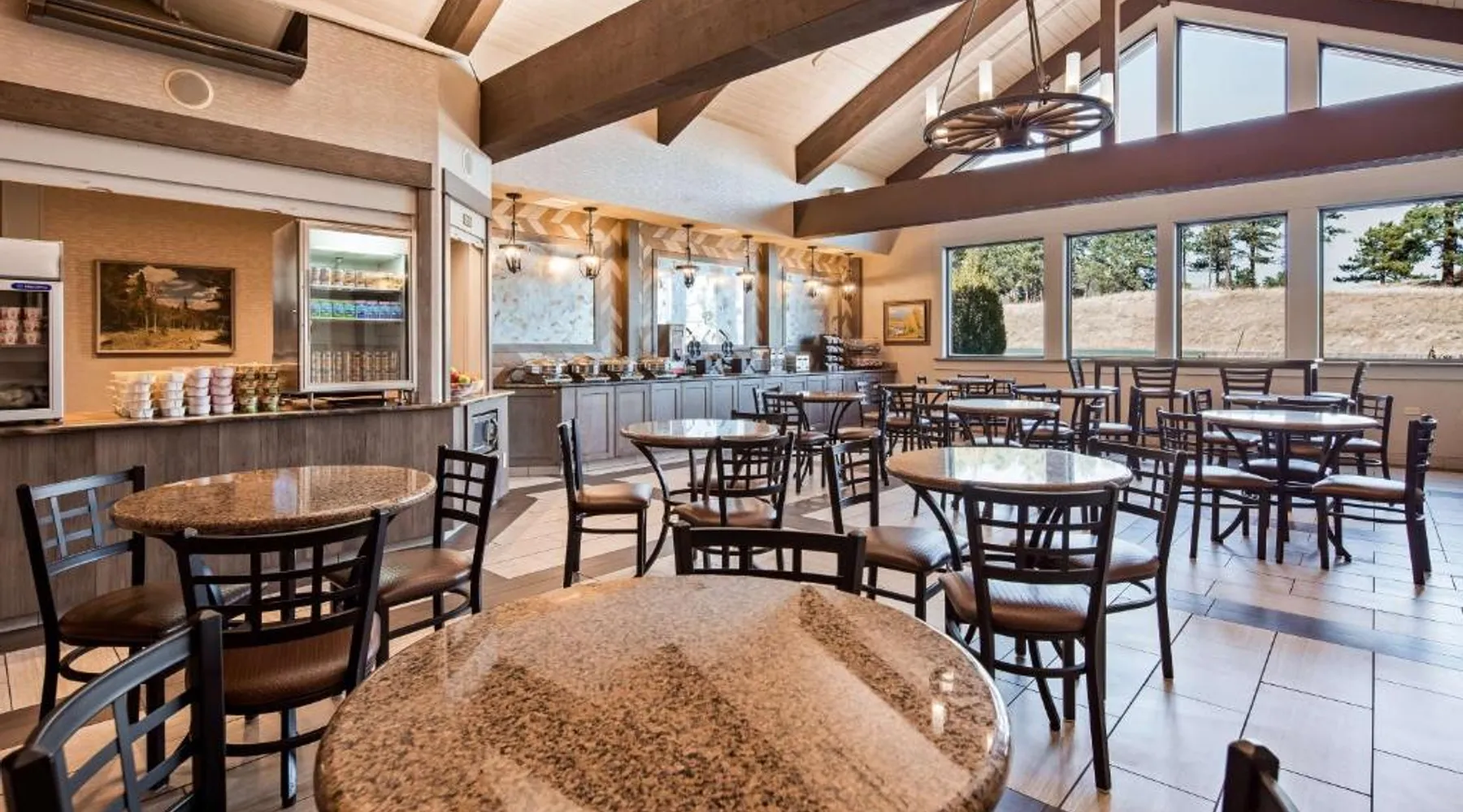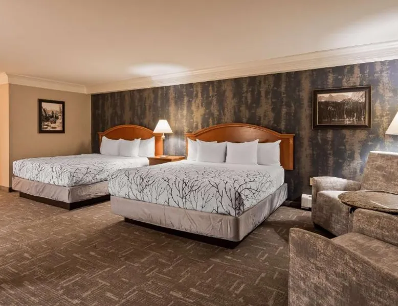 Comfortable Accommodations: Best Western Plus Silver Saddle Inn in Estes Park offers family rooms with balconies and seating areas. Each room includes a work desk, refrigerator, microwave, and free WiFi. Leisure Facilities: Guests can enjoy an indoor swimming pool, hot tub, and fitness center. Additional amenities include a minimarket, electric vehicle charging station, and bicycle parking. Dining Experience: A complimentary American buffet breakfast is served daily, featuring fresh pastries, fruits, and juices. Convenient Location: Located 2 minutes from Rocky Mountain Adventures and less than 0.6 mi from Lakes Estes Marina, the hotel is near attractions such as Wynbrier Wildlife Gallery and Open Air Adventure Park. The quadruple room offers a tea and coffee maker and a safe deposit box. The unit has 2 beds.