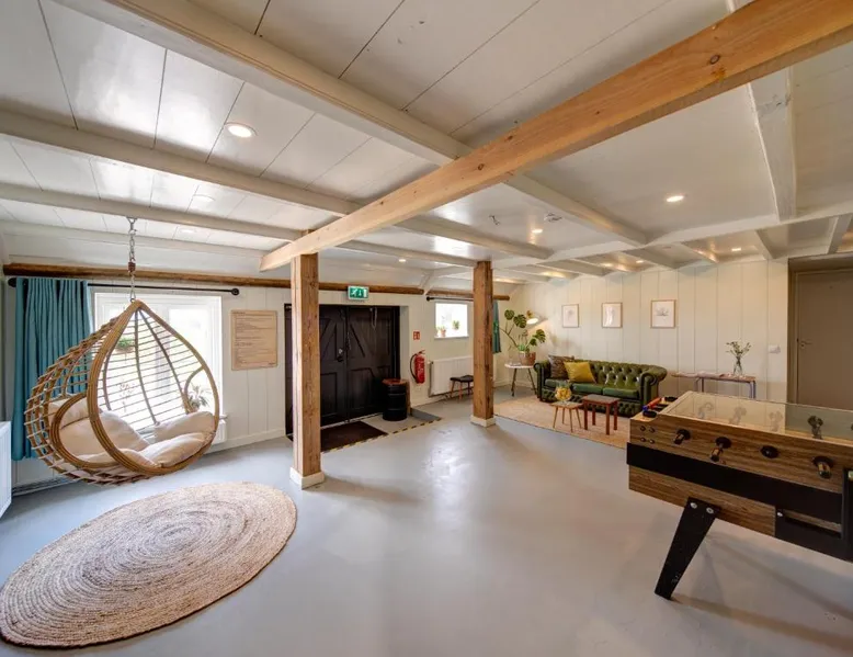 Spacious Accommodations: Groepsaccommodatie Fries en Fruitig Nijhuizum in Nijhuizum offers nine bedrooms and six bathrooms. The property features a private entrance and a quiet street view. Outdoor Amenities: Guests can enjoy a garden, terrace, and bar. The terrace includes outdoor furniture and a barbecue area. Free WiFi is available throughout the holiday home. Facilities and Services: The holiday home provides private check-in and check-out, a 24-hour front desk, and free on-site parking. Additional services include bike hire, meeting rooms, and an outdoor play area. Local Attractions: Located 64 mi from Groningen Eelde Airport, the property is near Holland Casino Leeuwarden (22 mi) and Workum Station (2 mi). Other attractions include Hindeloopen Station (5 mi) and Stavoren Station (12 mi). This spacious holiday home consists of 9 bedrooms, kitchen, a terrace and 6 bathrooms with a shower. Guests will find a stovetop, a refrigerator, a dishwasher and kitchenware in the well-equipped kitchen. The holiday home also provides guests with a barbecue. Among the room amenities are a private entrance, a tea and coffee maker, a dining area as well as an outdoor dining area and garden views. The unit offers 48 beds.