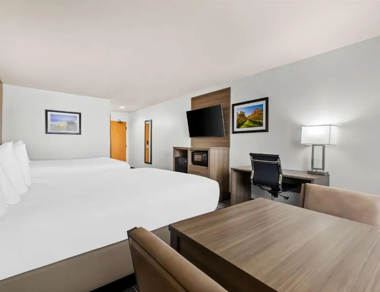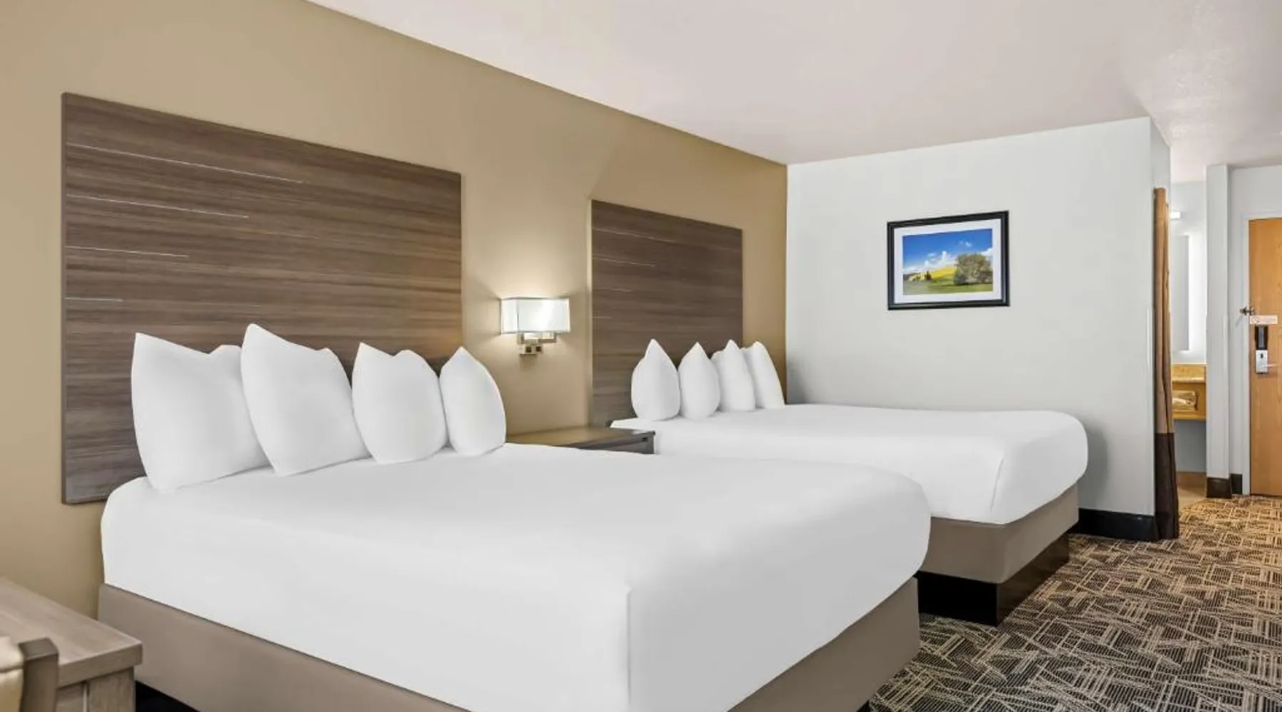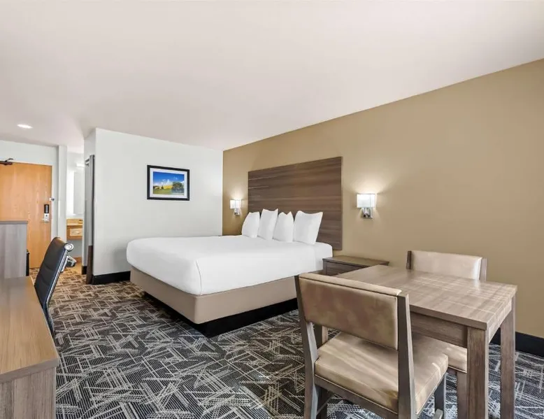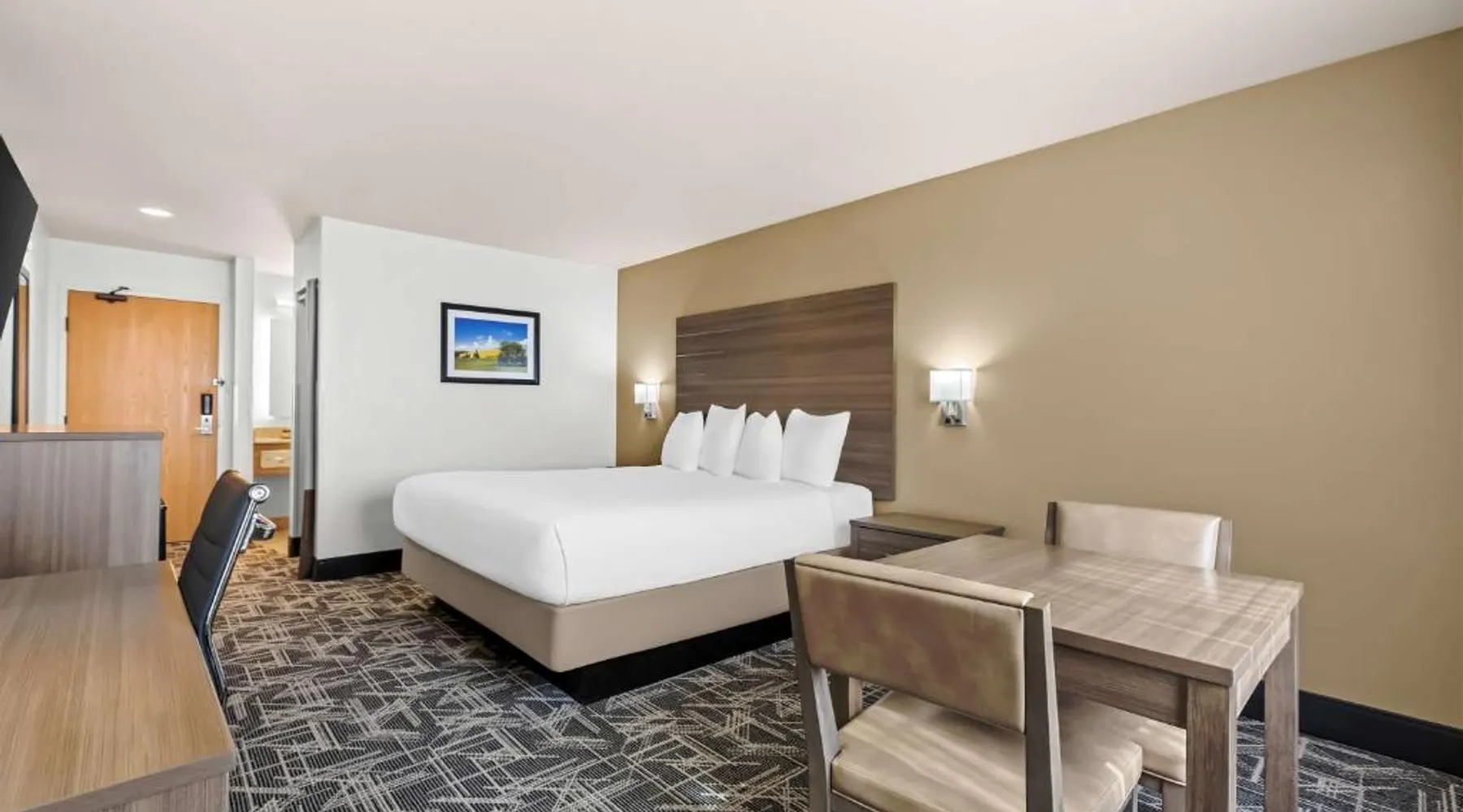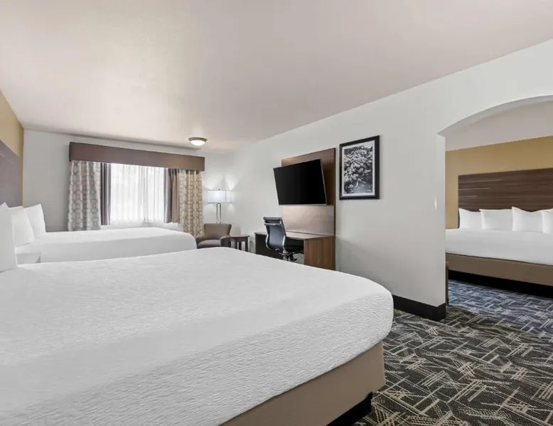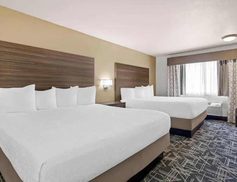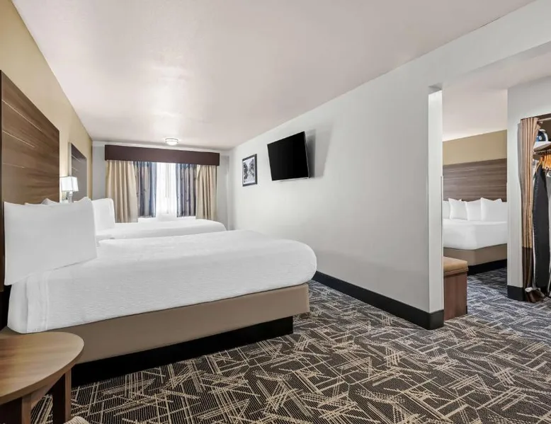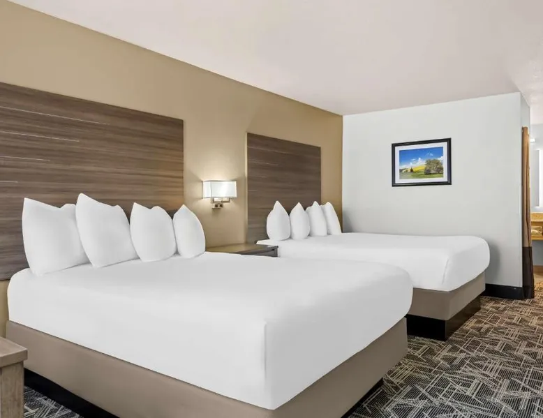 Comfortable Accommodations: Best Western Plus Caldwell Inn & Suites in Caldwell offers family rooms with air-conditioning, free WiFi, and amenities such as a work desk and microwave. Each room includes a tea and coffee maker, refrigerator, and flat-screen TV. Leisure Facilities: Guests can enjoy a fitness center, indoor swimming pool, and hot tub. Additional facilities include a minimarket, business area, outdoor seating, picnic area, and barbecue facilities. Free on-site private parking is available. Dining Options: A buffet breakfast with American and vegan options is served daily. Breakfast includes juice, fresh pastries, pancakes, cheese, and fruits. Location and Attractions: Located 24 mi from Boise Airport, the hotel is near attractions such as Extramile Arena (27 mi) and Roaring Springs Water Park (16 mi). Guests appreciate the friendly staff and excellent service. The spacious double room offers air conditioning, a tea and coffee maker and a seating area. The unit has 1 bed.