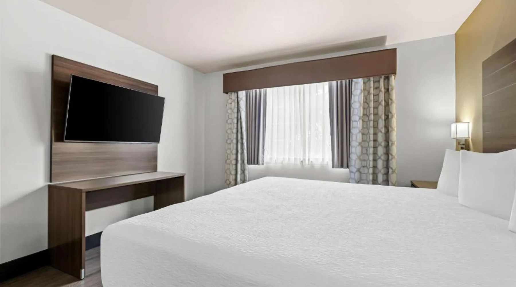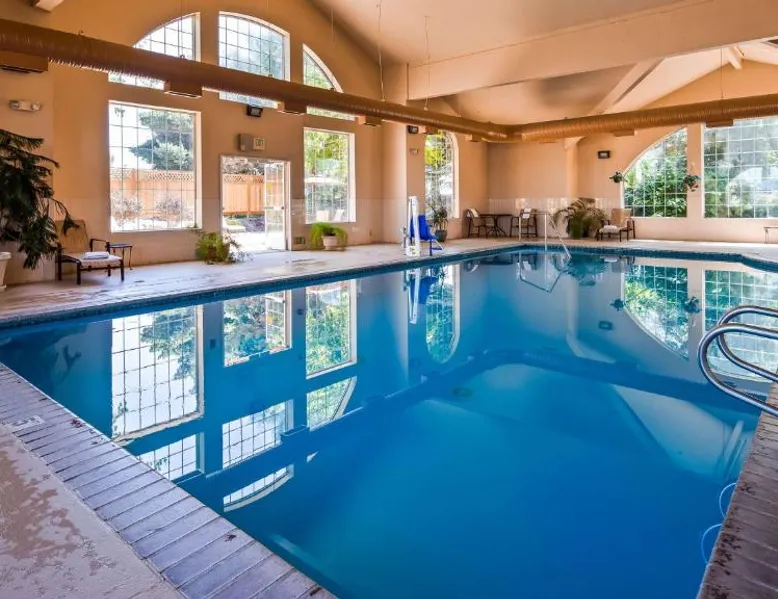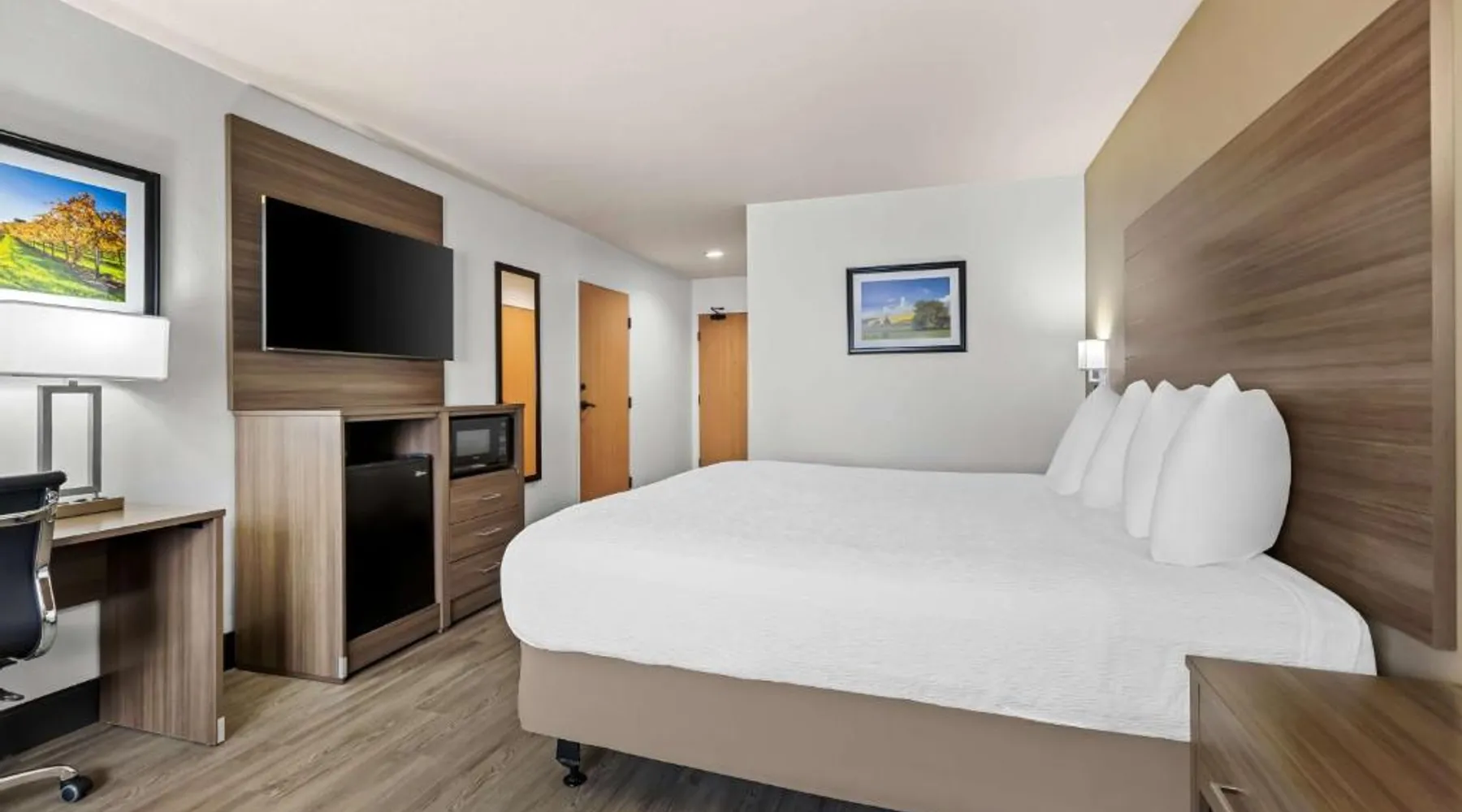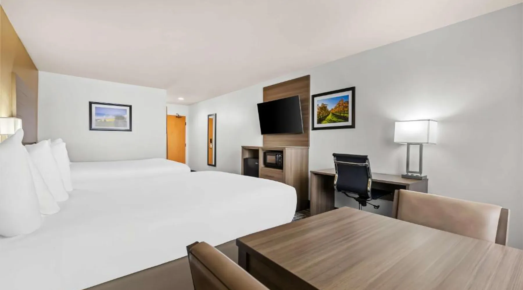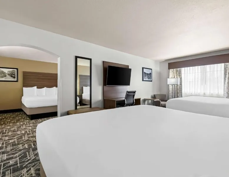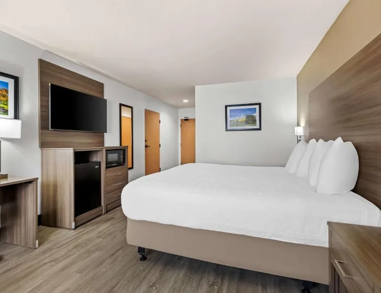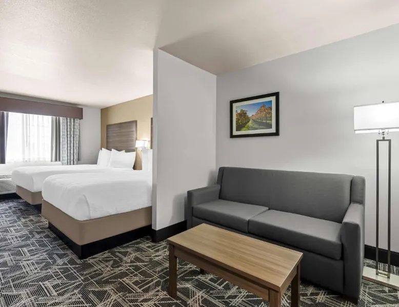 Comfortable Accommodations: Best Western Plus Caldwell Inn & Suites in Caldwell offers family rooms with air-conditioning, free WiFi, and amenities such as a work desk and microwave. Each room includes a tea and coffee maker, refrigerator, and flat-screen TV. Leisure Facilities: Guests can enjoy a fitness center, indoor swimming pool, and hot tub. Additional facilities include a minimarket, business area, outdoor seating, picnic area, and barbecue facilities. Free on-site private parking is available. Dining Options: A buffet breakfast with American and vegan options is served daily. Breakfast includes juice, fresh pastries, pancakes, cheese, and fruits. Location and Attractions: Located 24 mi from Boise Airport, the hotel is near attractions such as Extramile Arena (27 mi) and Roaring Springs Water Park (16 mi). Guests appreciate the friendly staff and excellent service. The spacious double room offers air conditioning, a tea and coffee maker and a seating area. The unit has 1 bed.