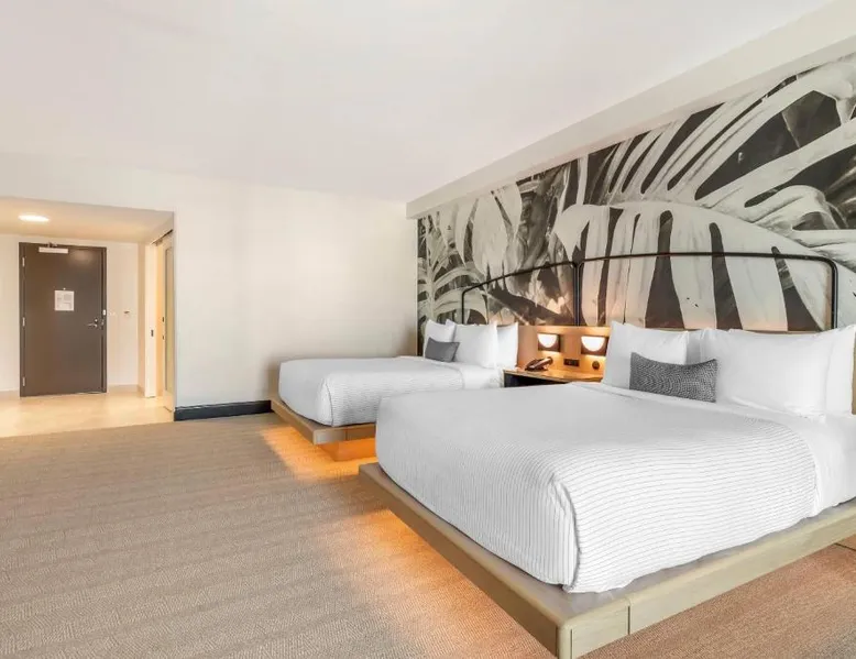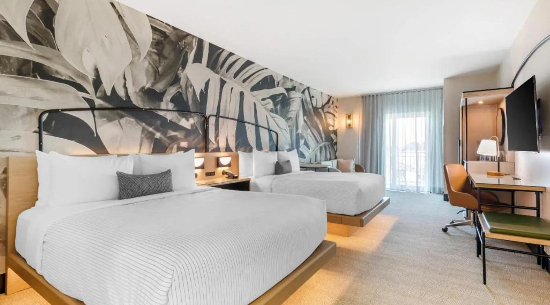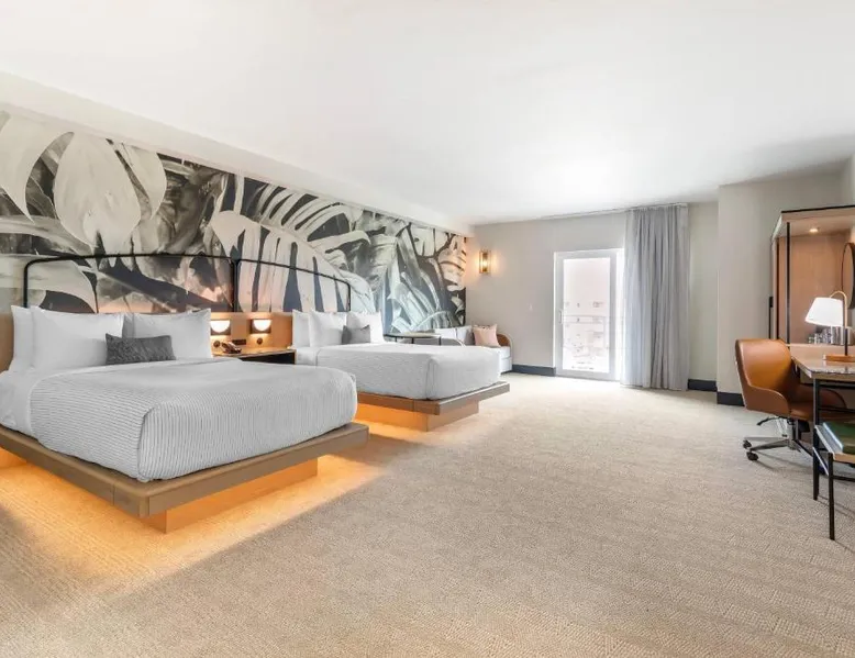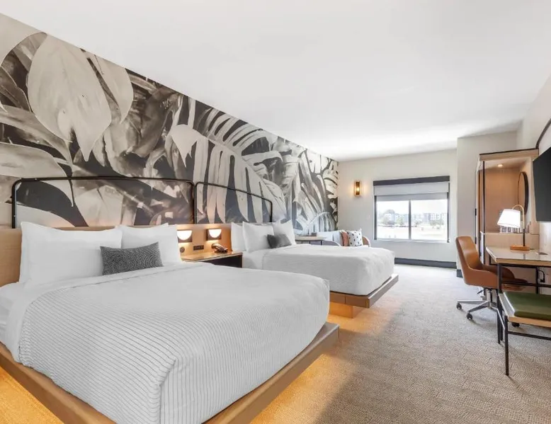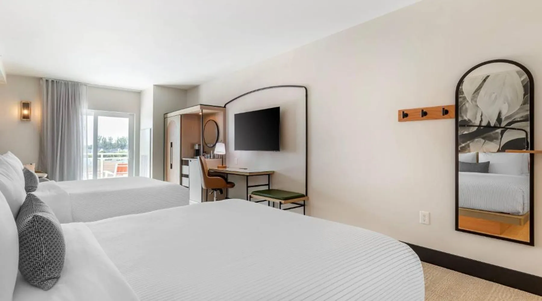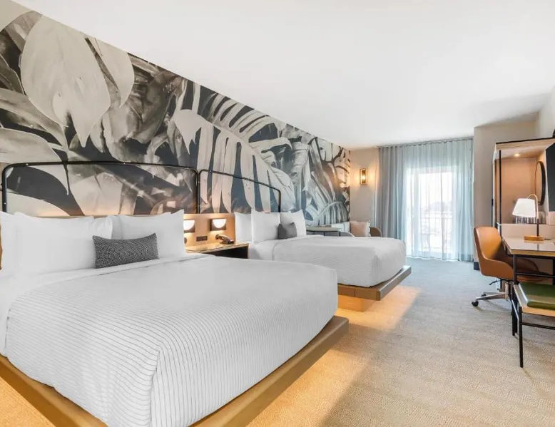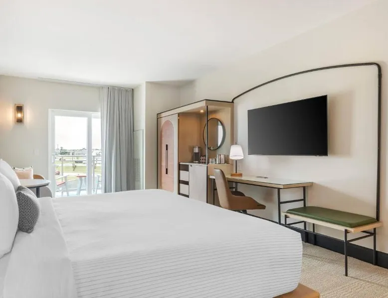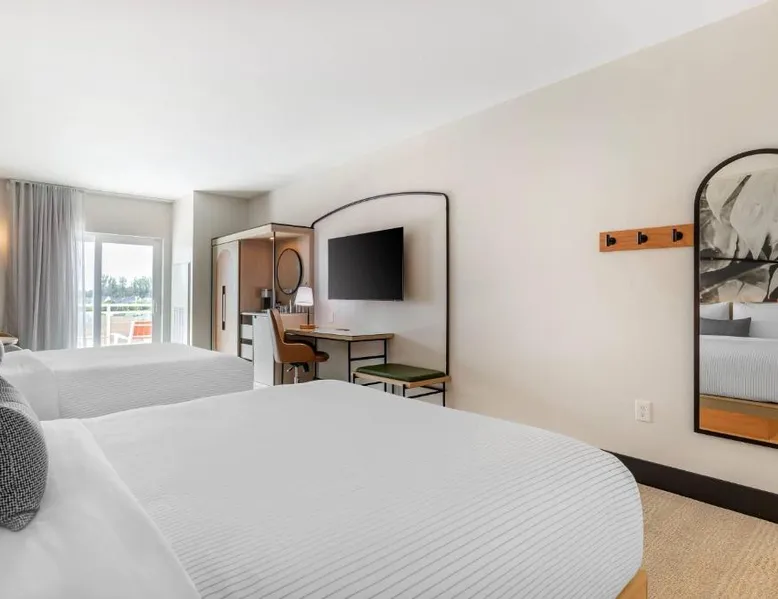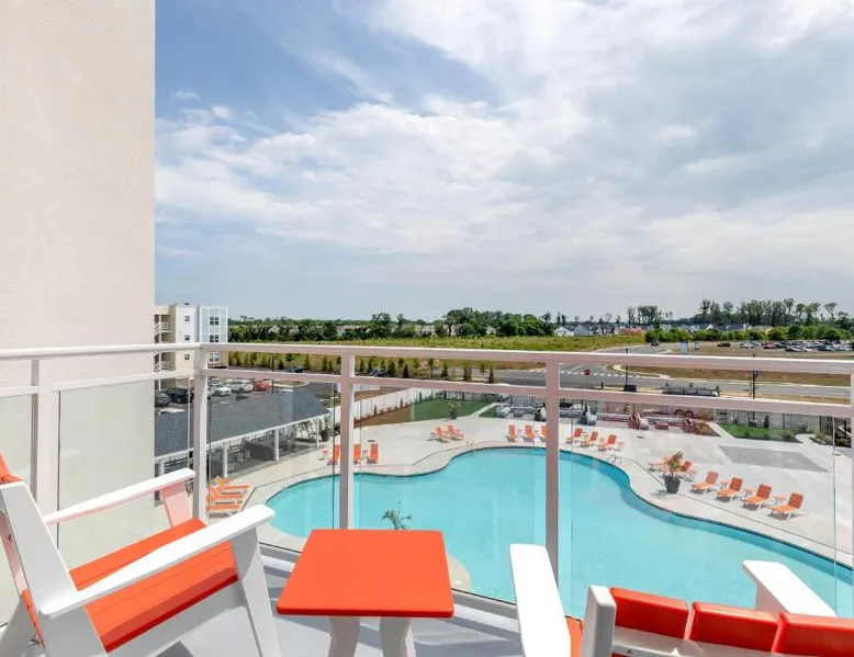 Comfortable Accommodations: Cambria Hotel Rehoboth Beach in Rehoboth Beach offers family rooms with air-conditioning, private entrances, and balconies. Each room includes a wardrobe, refrigerator, work desk, and microwave. Exceptional Facilities: Guests enjoy a fitness center, indoor swimming pool, and free WiFi in public areas. Additional amenities include a restaurant, bar, lounge, outdoor fireplace, hot tub, and games room. Dining Experience: The modern, family-friendly restaurant serves American cuisine with brunch, lunch, and dinner. The bar offers cocktails in a relaxed setting. Prime Location: Located 4.3 mi from Rehoboth Beach Boardwalk and near attractions such as Thunder Lagoon Waterpark (21 mi) and Ocean City Harbor (29 mi). Free on-site parking is available. Guest Satisfaction: Highly rated for room cleanliness, attentive staff, and excellent swimming pool. The spacious quadruple room features air conditioning, a private entrance, a wardrobe as well as a balcony with pool views. The unit has 2 beds.