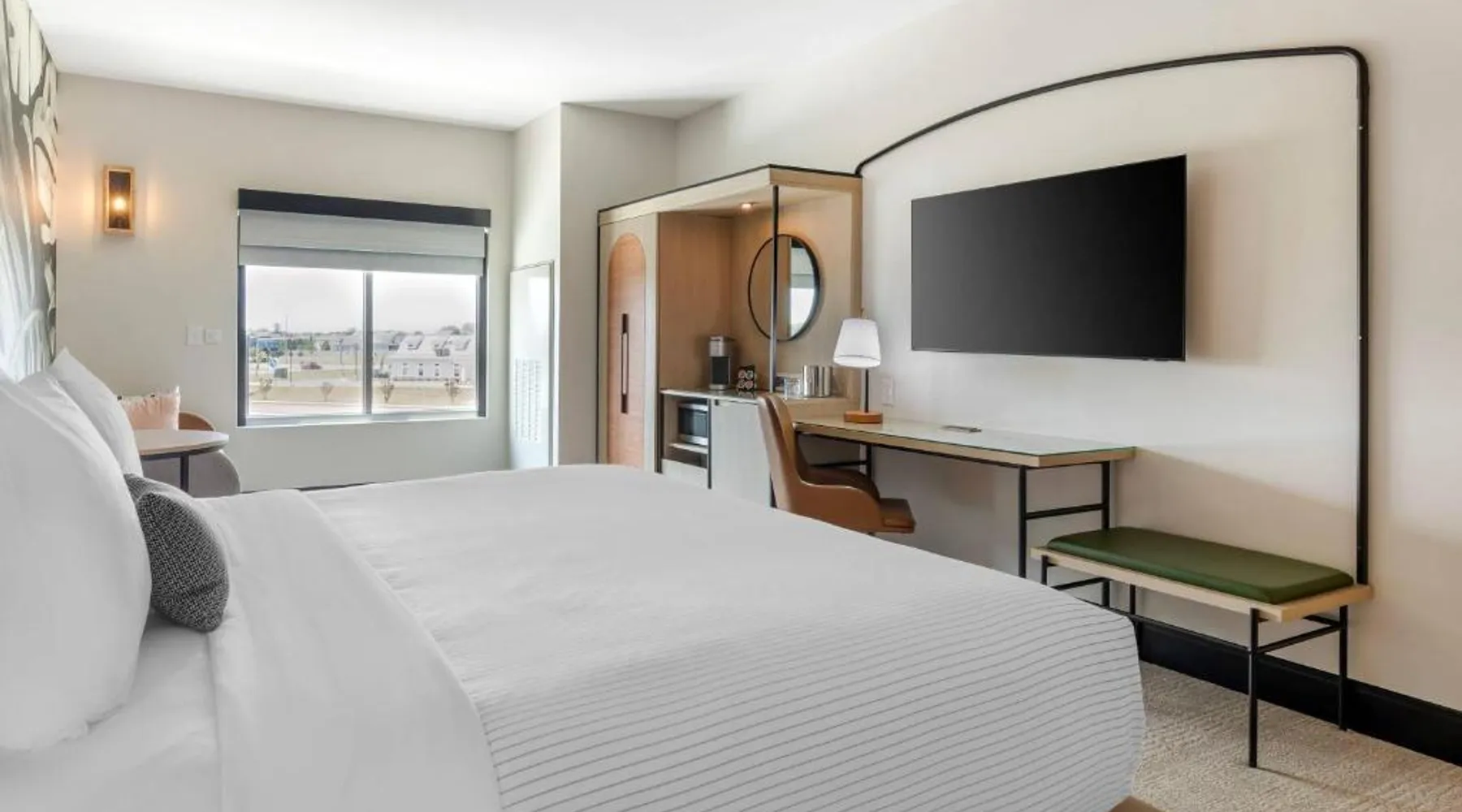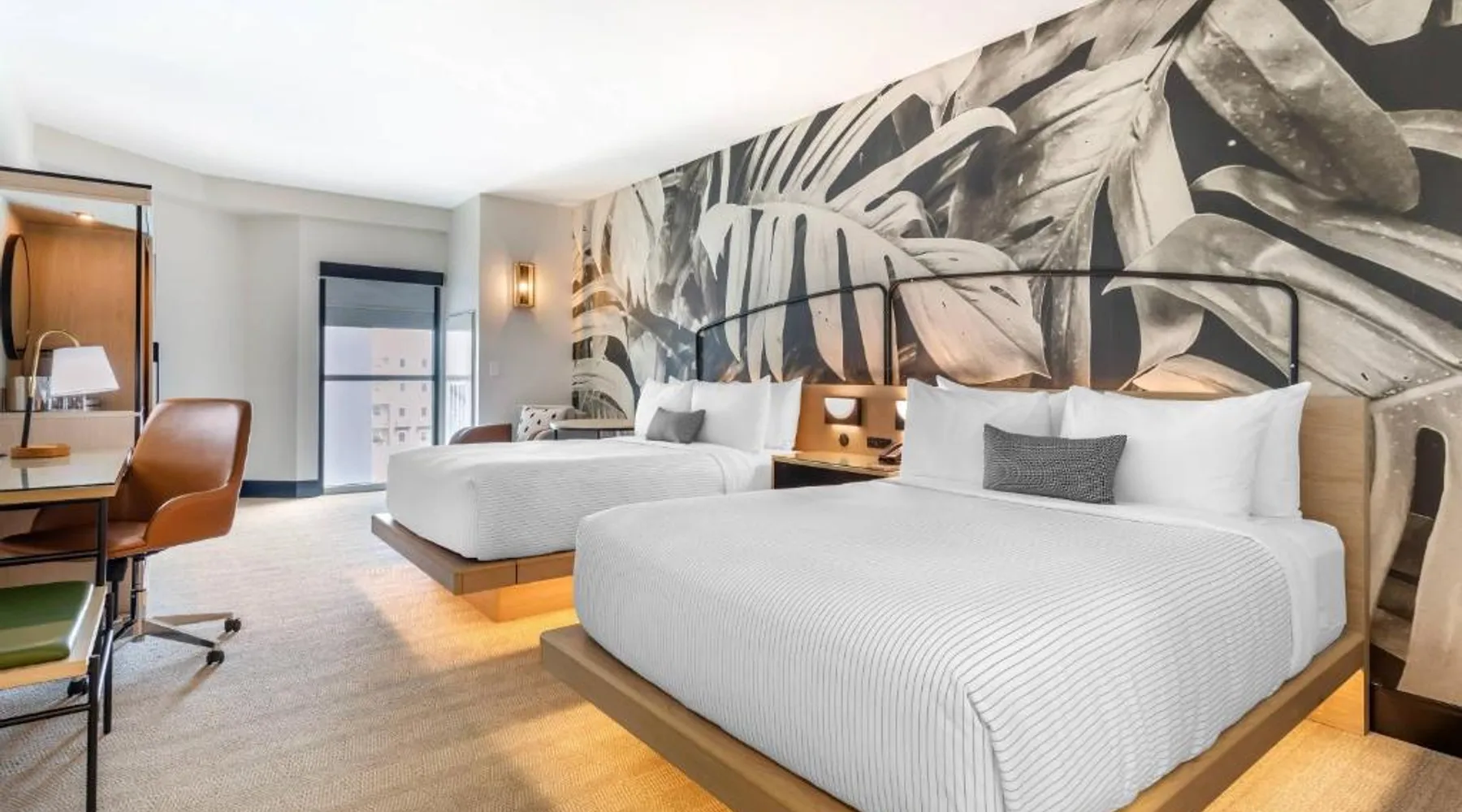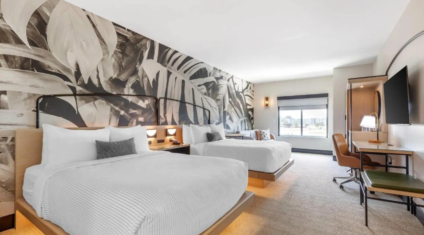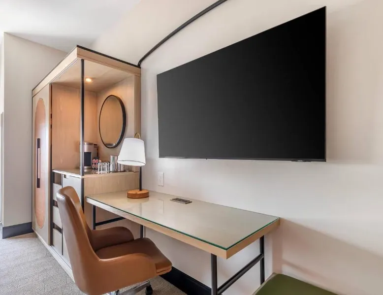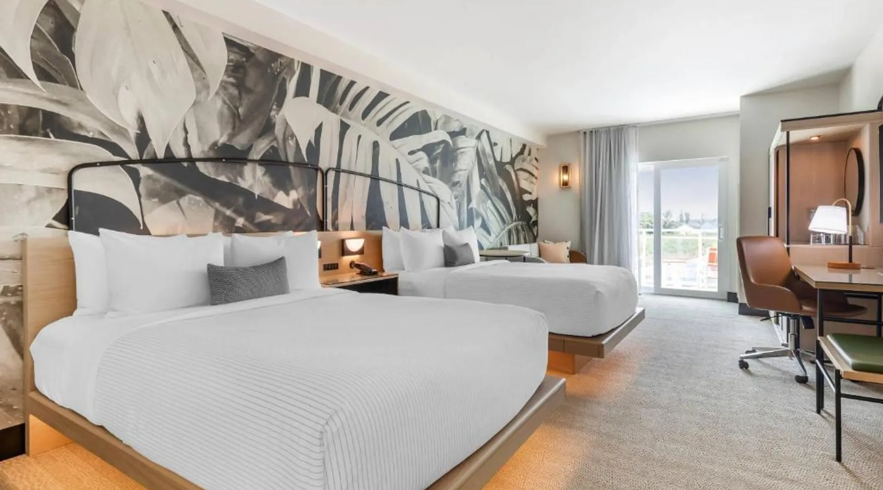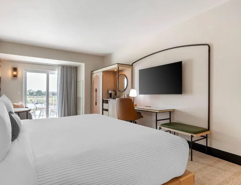 Comfortable Accommodations: Cambria Hotel Rehoboth Beach in Rehoboth Beach offers family rooms with air-conditioning, private entrances, and balconies. Each room includes a wardrobe, refrigerator, work desk, and microwave. Exceptional Facilities: Guests enjoy a fitness center, indoor swimming pool, and free WiFi in public areas. Additional amenities include a restaurant, bar, lounge, outdoor fireplace, hot tub, and games room. Dining Experience: The modern, family-friendly restaurant serves American cuisine with brunch, lunch, and dinner. The bar offers cocktails in a relaxed setting. Prime Location: Located 4.3 mi from Rehoboth Beach Boardwalk and near attractions such as Thunder Lagoon Waterpark (21 mi) and Ocean City Harbor (29 mi). Free on-site parking is available. Guest Satisfaction: Highly rated for room cleanliness, attentive staff, and excellent swimming pool. The spacious quadruple room features air conditioning, a private entrance, a wardrobe as well as a balcony with pool views. The unit has 2 beds.