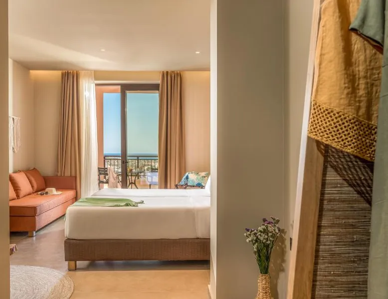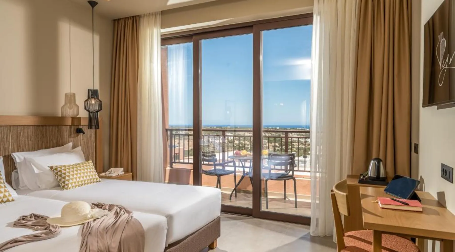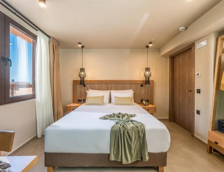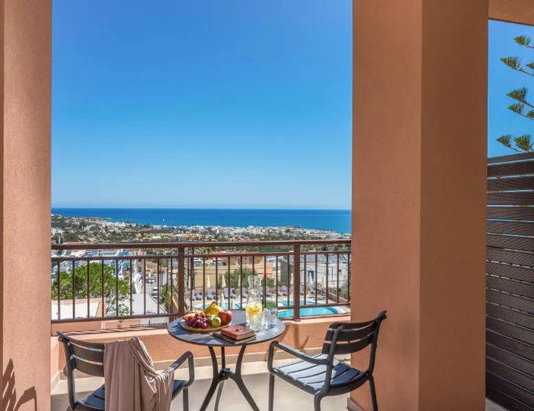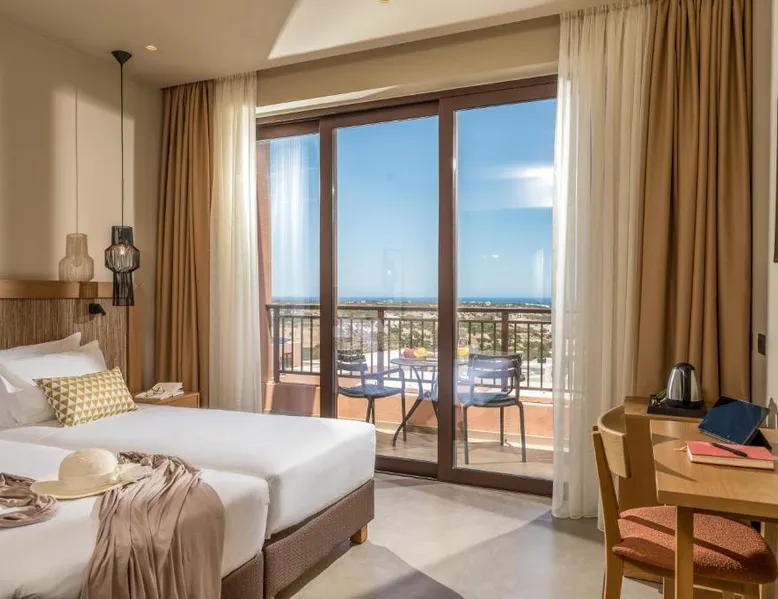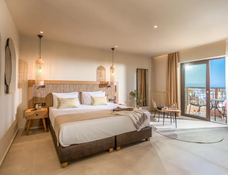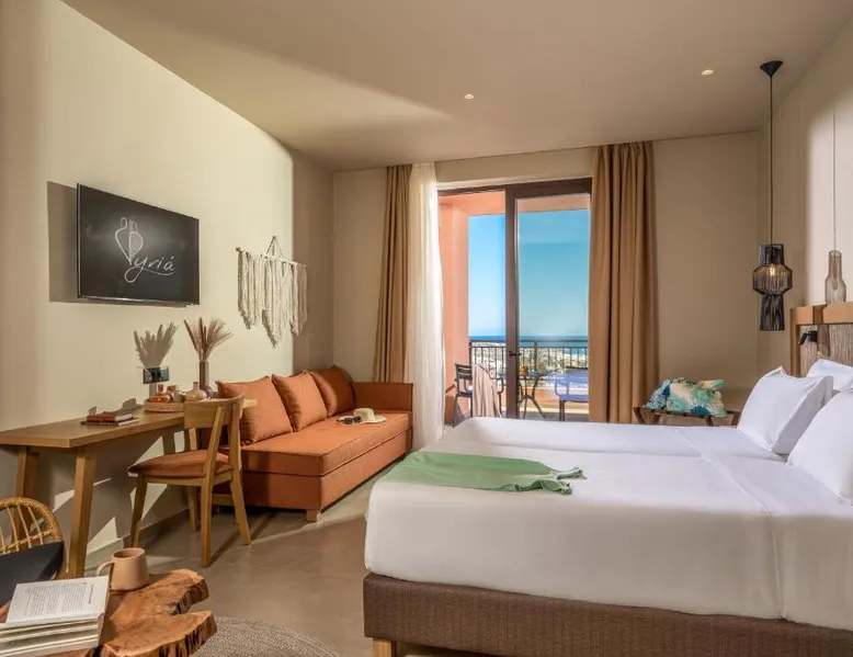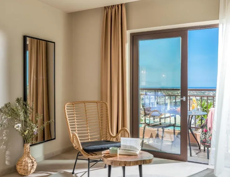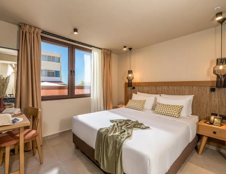 Comfortable Accommodations: Hotel Pyriá in Piskopiano offers family rooms with air-conditioning, private bathrooms, and modern amenities. Each room includes a work desk, TV, and free WiFi, ensuring a pleasant stay. Exceptional Facilities: Guests can relax on the sun terrace or in the garden, enjoy the seasonal outdoor swimming pool, and take advantage of the pool bar. Additional facilities include a lounge, fitness center, and free parking. Dining Experience: The restaurant serves Greek and Mediterranean cuisine with vegetarian, vegan, and gluten-free options. Breakfast includes local specialties, fresh pastries, and a variety of beverages. Prime Location: Located 13 mi from Heraklion International Airport, Hotel Pyriá is a short walk from Limenas Hersonissou Beach and near attractions such as Aquaworld Aquarium. Highly rated for its swimming pool, attentive staff, and delicious breakfast. The spacious double room features air conditioning, a private entrance, a balcony with sea views as well as a private bathroom boasting a walk-in shower.