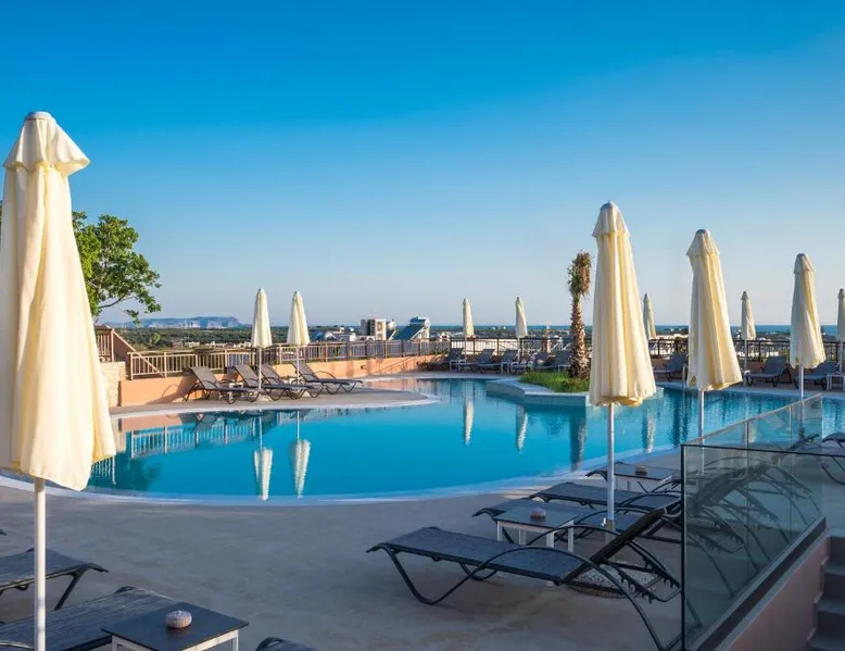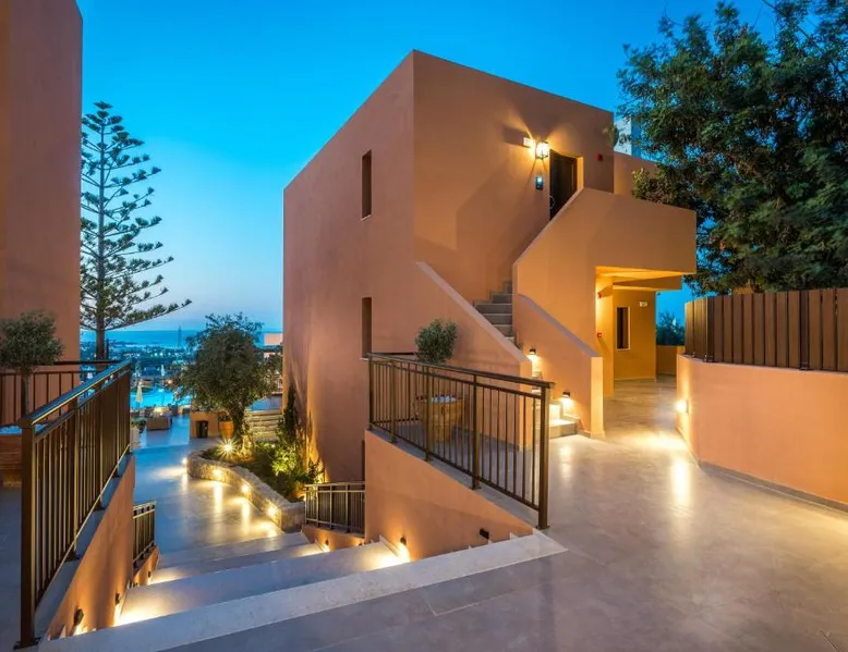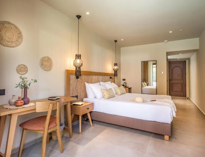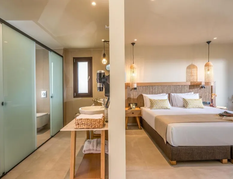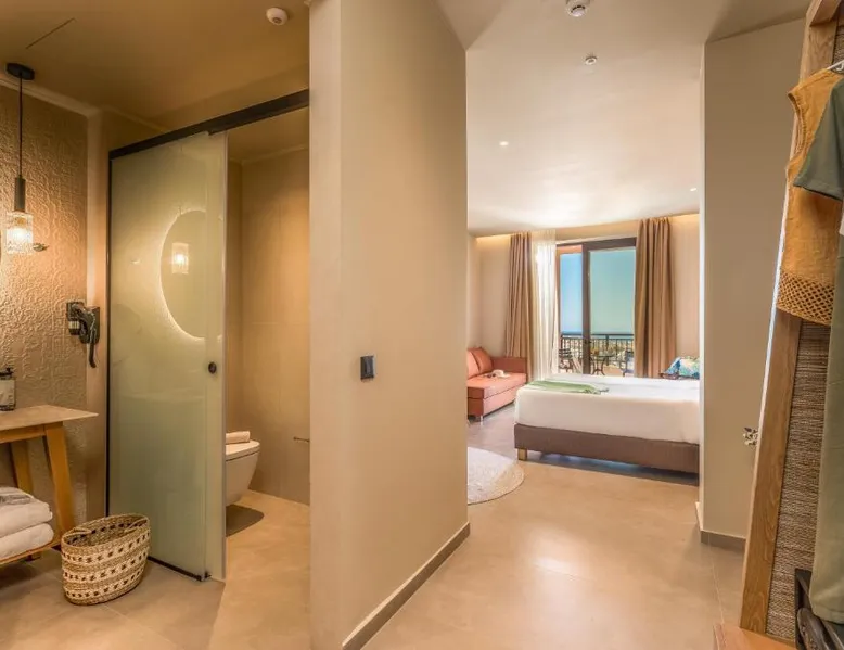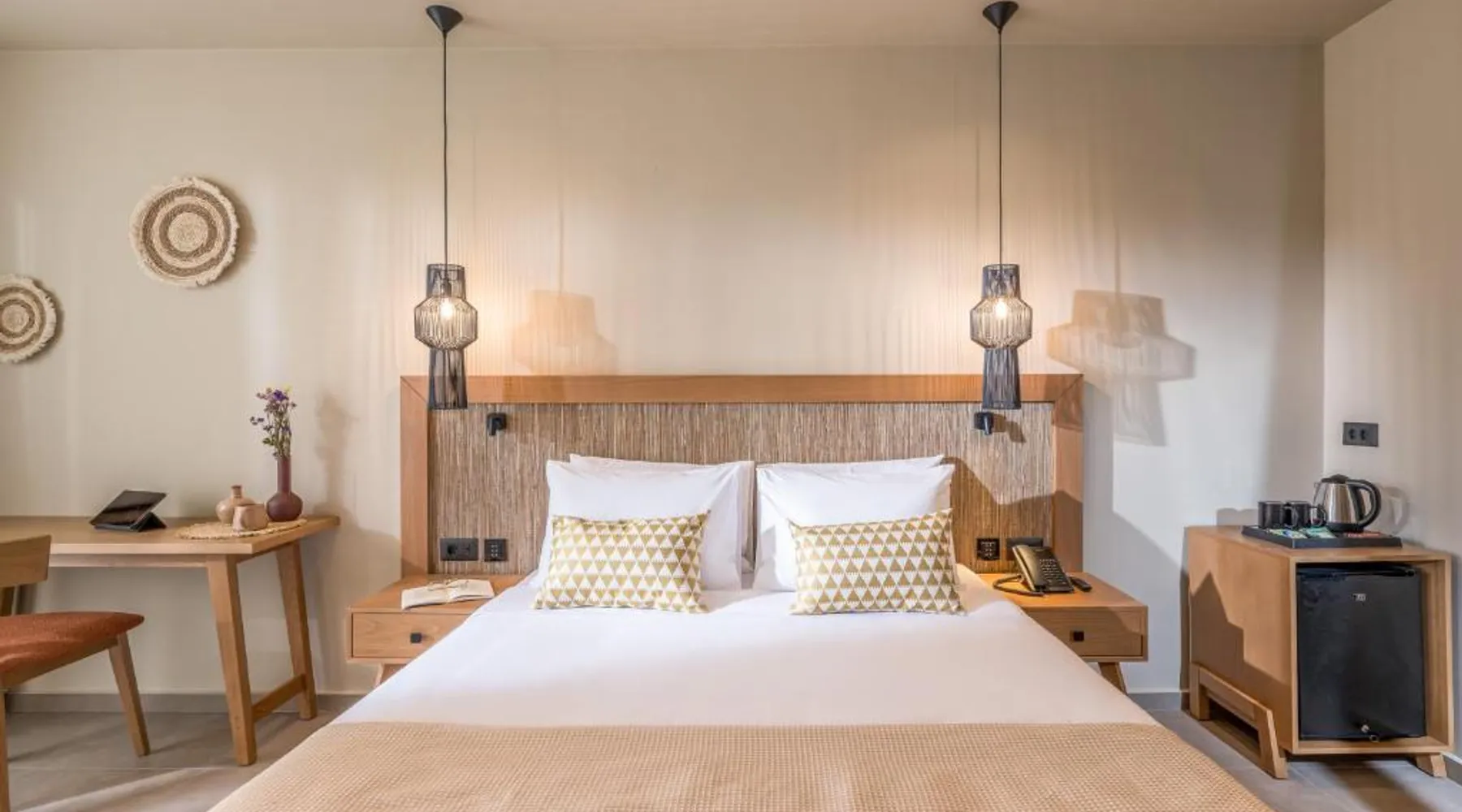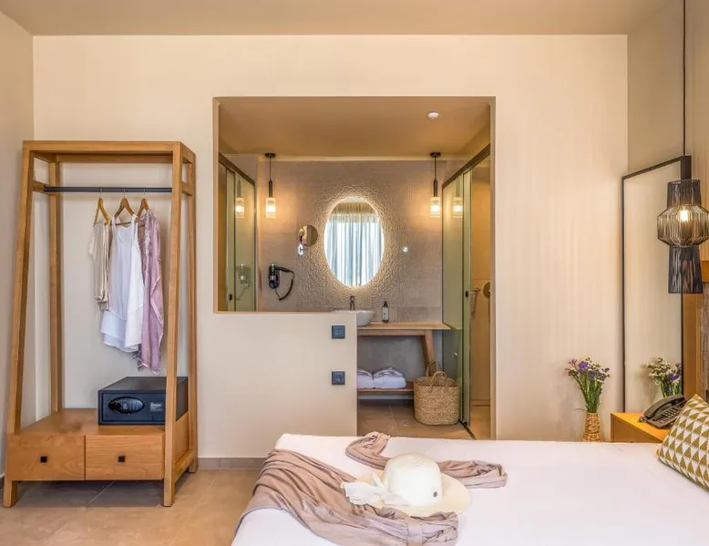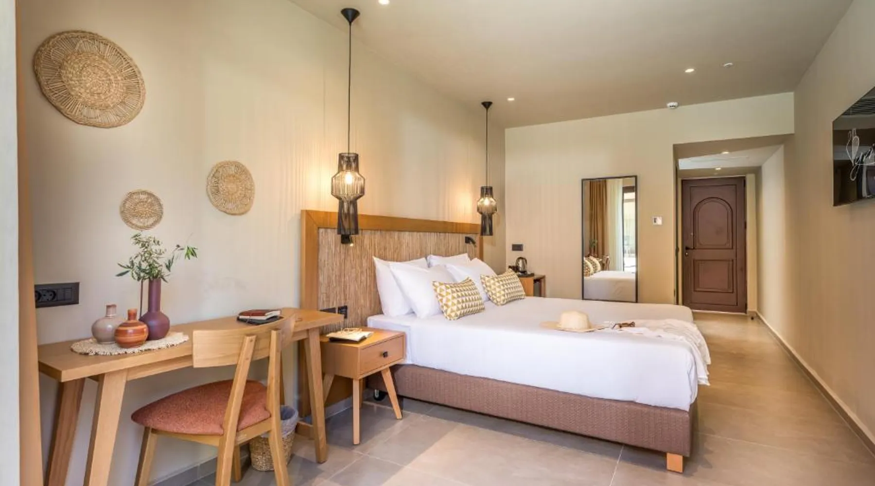 Comfortable Accommodations: Hotel Pyriá in Piskopiano offers family rooms with air-conditioning, private bathrooms, and modern amenities. Each room includes a work desk, TV, and free WiFi, ensuring a pleasant stay. Exceptional Facilities: Guests can relax on the sun terrace or in the garden, enjoy the seasonal outdoor swimming pool, and take advantage of the pool bar. Additional facilities include a lounge, fitness center, and free parking. Dining Experience: The restaurant serves Greek and Mediterranean cuisine with vegetarian, vegan, and gluten-free options. Breakfast includes local specialties, fresh pastries, and a variety of beverages. Prime Location: Located 13 mi from Heraklion International Airport, Hotel Pyriá is a short walk from Limenas Hersonissou Beach and near attractions such as Aquaworld Aquarium. Highly rated for its swimming pool, attentive staff, and delicious breakfast. The spacious double room features air conditioning, a private entrance, a balcony with sea views as well as a private bathroom boasting a walk-in shower.