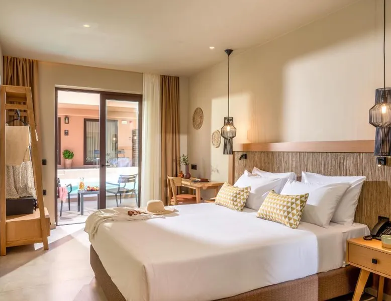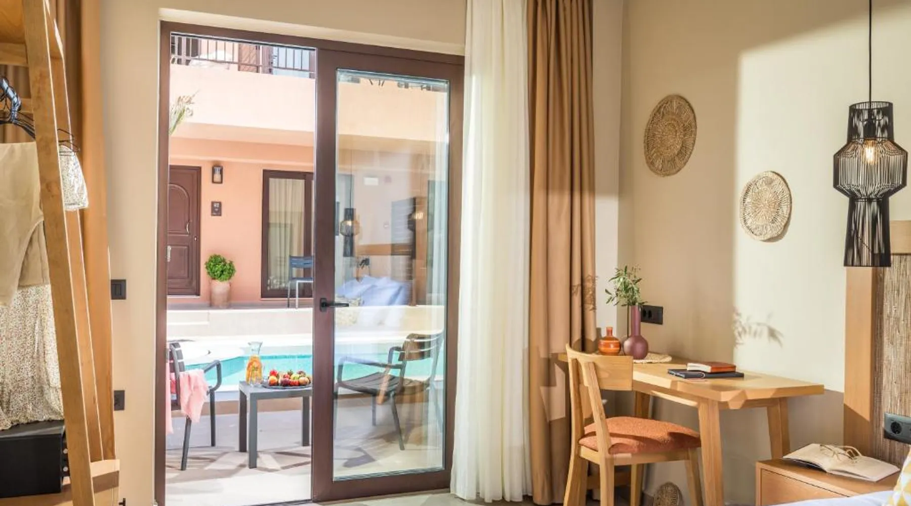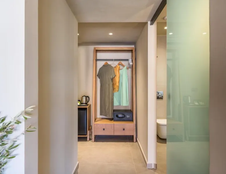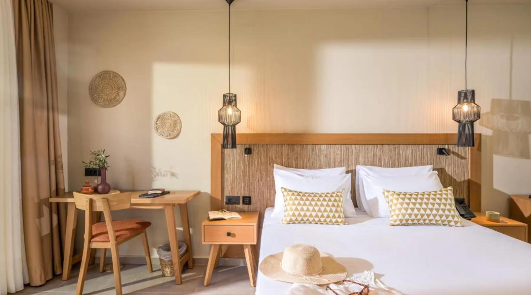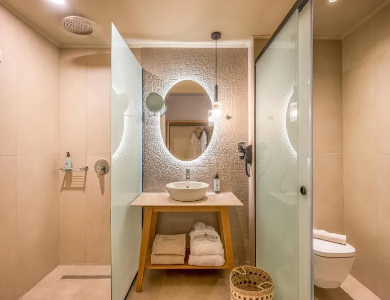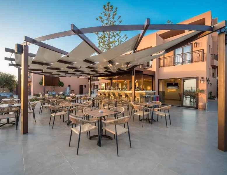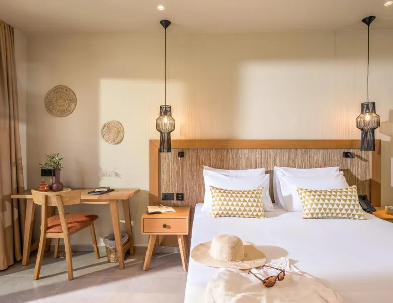 Comfortable Accommodations: Hotel Pyriá in Piskopiano offers family rooms with air-conditioning, private bathrooms, and modern amenities. Each room includes a work desk, TV, and free WiFi, ensuring a pleasant stay. Exceptional Facilities: Guests can relax on the sun terrace or in the garden, enjoy the seasonal outdoor swimming pool, and take advantage of the pool bar. Additional facilities include a lounge, fitness center, and free parking. Dining Experience: The restaurant serves Greek and Mediterranean cuisine with vegetarian, vegan, and gluten-free options. Breakfast includes local specialties, fresh pastries, and a variety of beverages. Prime Location: Located 13 mi from Heraklion International Airport, Hotel Pyriá is a short walk from Limenas Hersonissou Beach and near attractions such as Aquaworld Aquarium. Highly rated for its swimming pool, attentive staff, and delicious breakfast. The spacious double room features air conditioning, a private entrance, a balcony with sea views as well as a private bathroom boasting a walk-in shower.