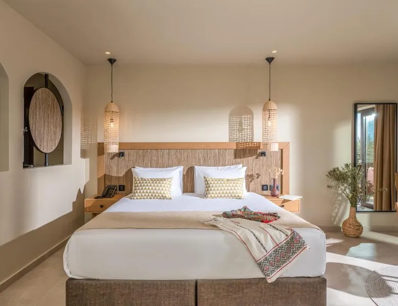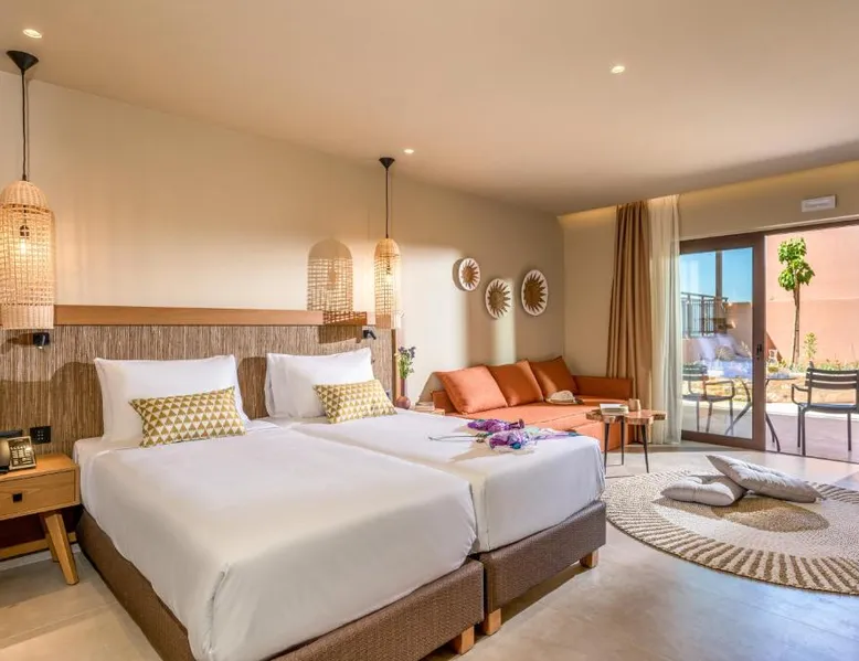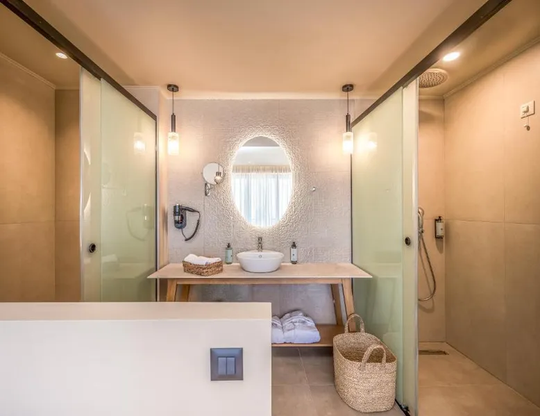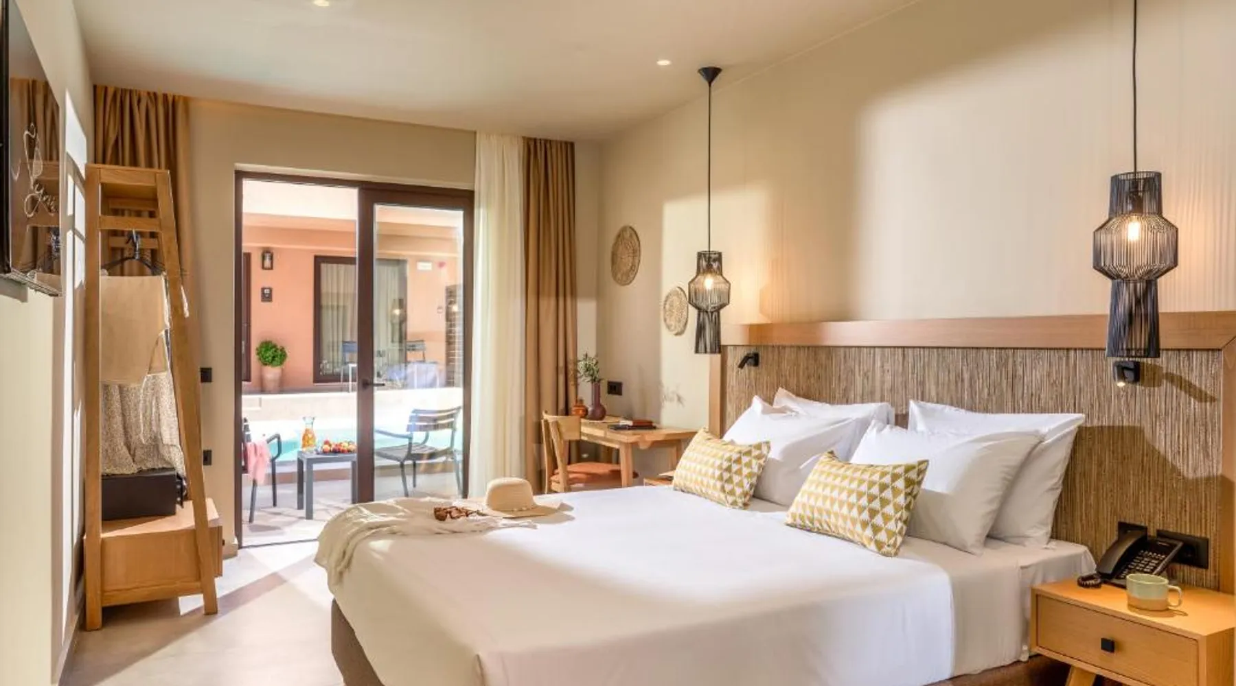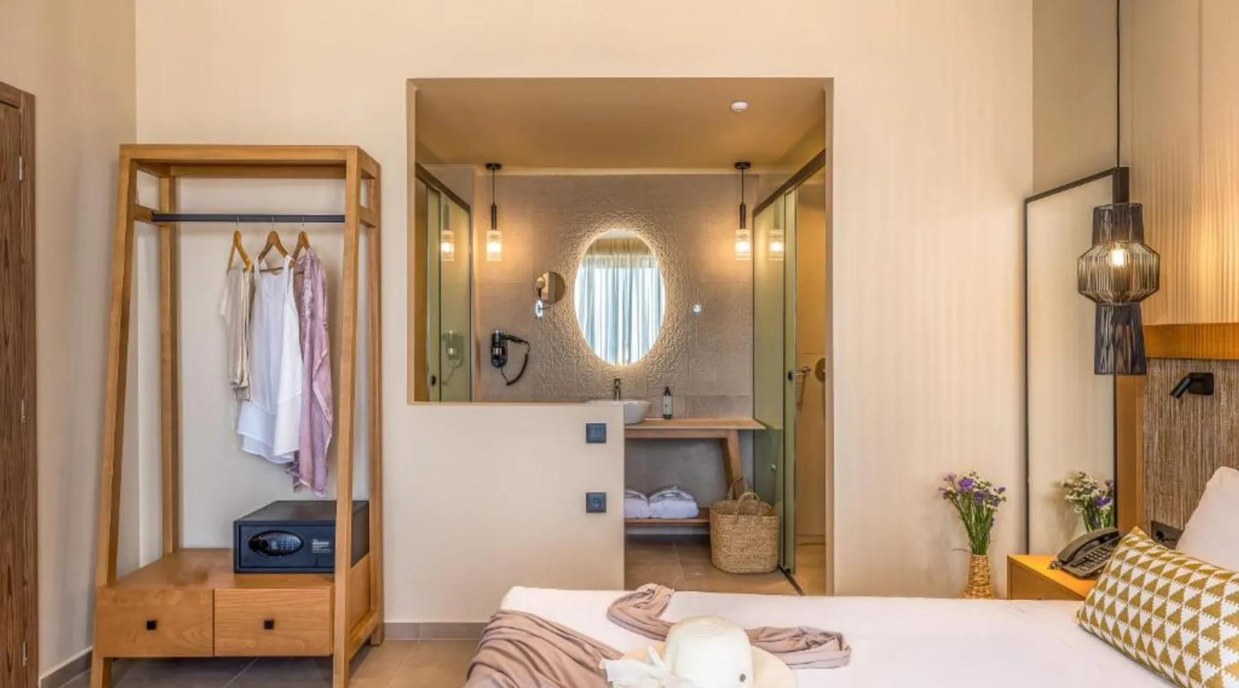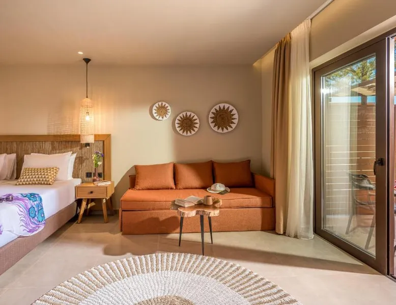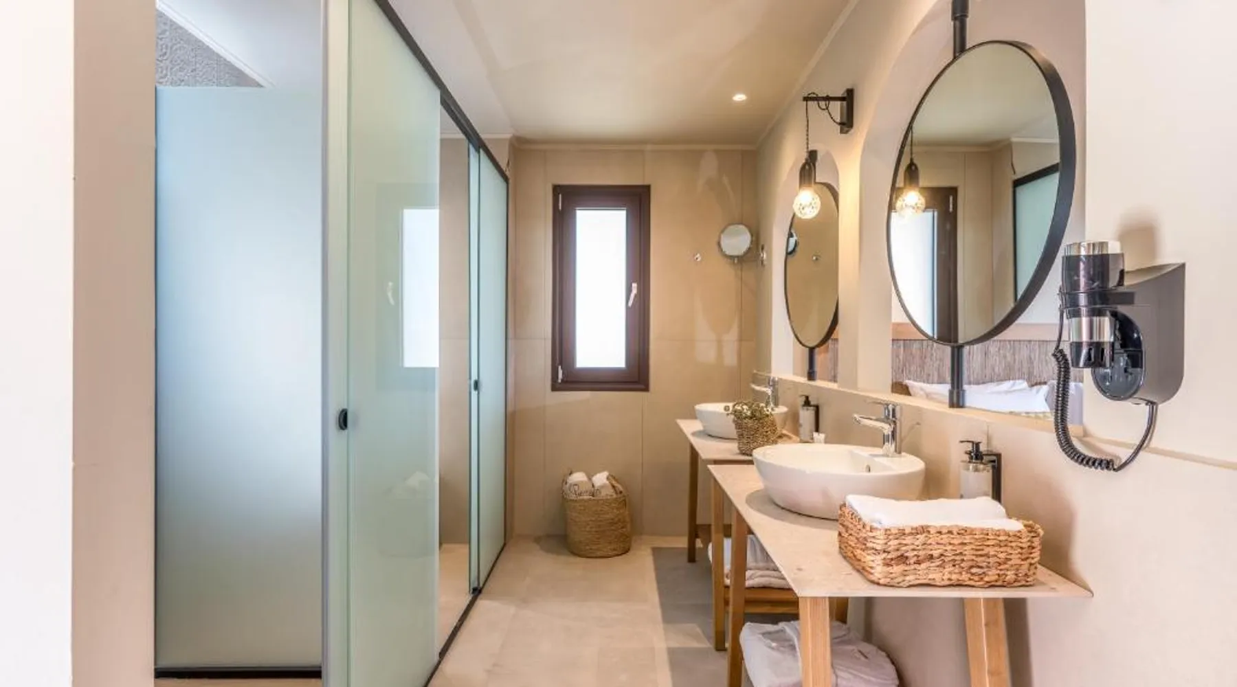 Comfortable Accommodations: Hotel Pyriá in Piskopiano offers family rooms with air-conditioning, private bathrooms, and modern amenities. Each room includes a work desk, TV, and free WiFi, ensuring a pleasant stay. Exceptional Facilities: Guests can relax on the sun terrace or in the garden, enjoy the seasonal outdoor swimming pool, and take advantage of the pool bar. Additional facilities include a lounge, fitness center, and free parking. Dining Experience: The restaurant serves Greek and Mediterranean cuisine with vegetarian, vegan, and gluten-free options. Breakfast includes local specialties, fresh pastries, and a variety of beverages. Prime Location: Located 13 mi from Heraklion International Airport, Hotel Pyriá is a short walk from Limenas Hersonissou Beach and near attractions such as Aquaworld Aquarium. Highly rated for its swimming pool, attentive staff, and delicious breakfast. The spacious double room features air conditioning, a private entrance, a balcony with sea views as well as a private bathroom boasting a walk-in shower.