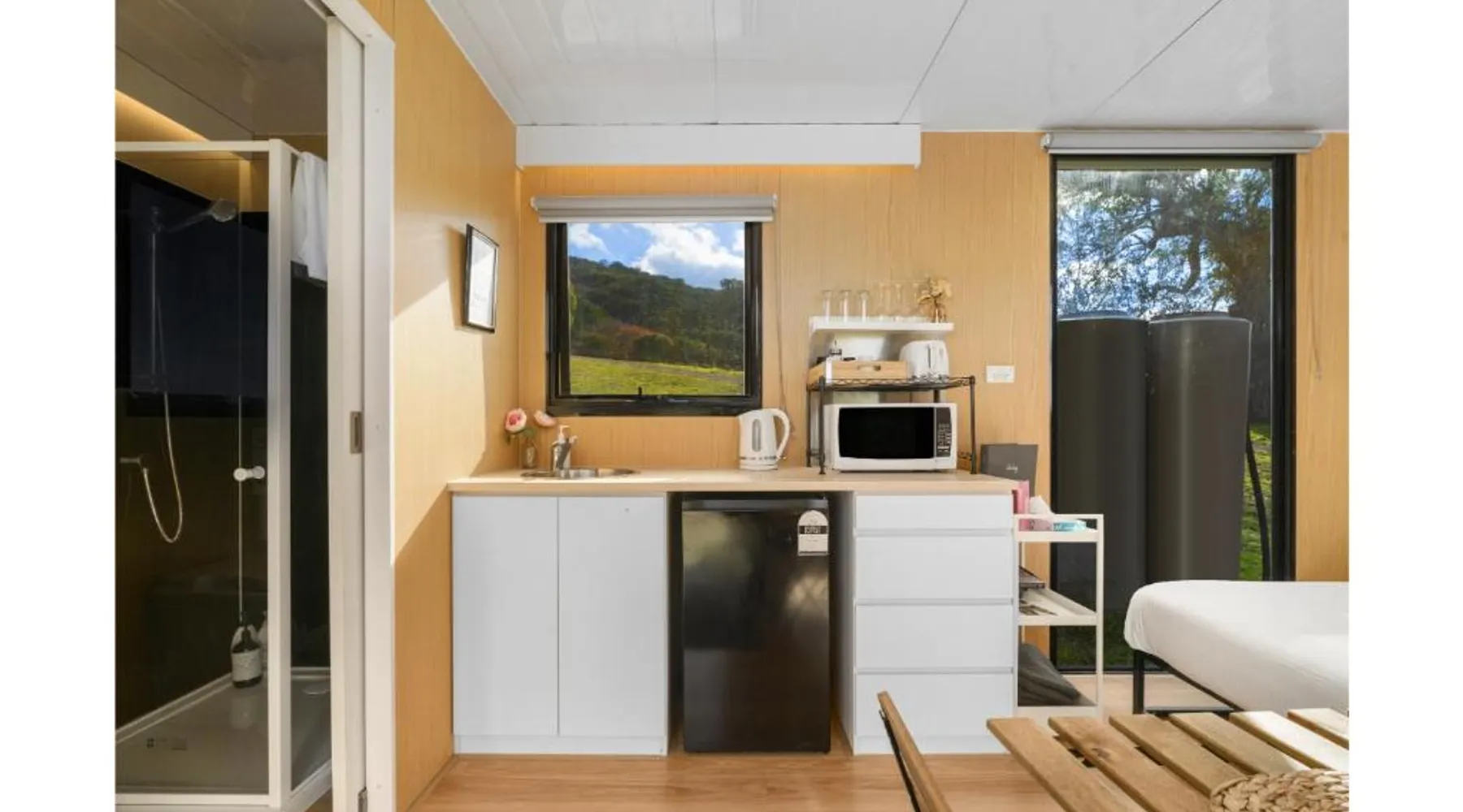 Comfortable Accommodations: Rae at Lake George Winery by Tiny Away in Lake George offers a holiday home with one bedroom and one bathroom. The property features a private entrance and a fully equipped kitchen with modern appliances. Outdoor Spaces: Guests can relax in the garden or on the patio, enjoying lake and mountain views. The property includes a barbecue for outdoor dining and a private entrance, ensuring privacy and comfort. Convenient Amenities: The holiday home is pet-friendly and includes air-conditioning, a tea and coffee maker, and a hairdryer. Free on-site parking is available, and the reception staff speak English. Local Attractions: Canberra Center is 28 mi away, the Australian War Memorial 29 mi, and the National Gallery of Australia 30 mi from the property. Canberra Airport is 27 mi distant. Boasting a private entrance, this air-conditioned mobile home includes 1 bedroom and 1 bathroom with a hairdryer. Guests will find a stovetop, a refrigerator, kitchenware and a microwave in the well-equipped kitchen. The mobile home also features a barbecue. The mobile home has a tea and coffee maker, a patio and lake views. The unit has 1 bed.