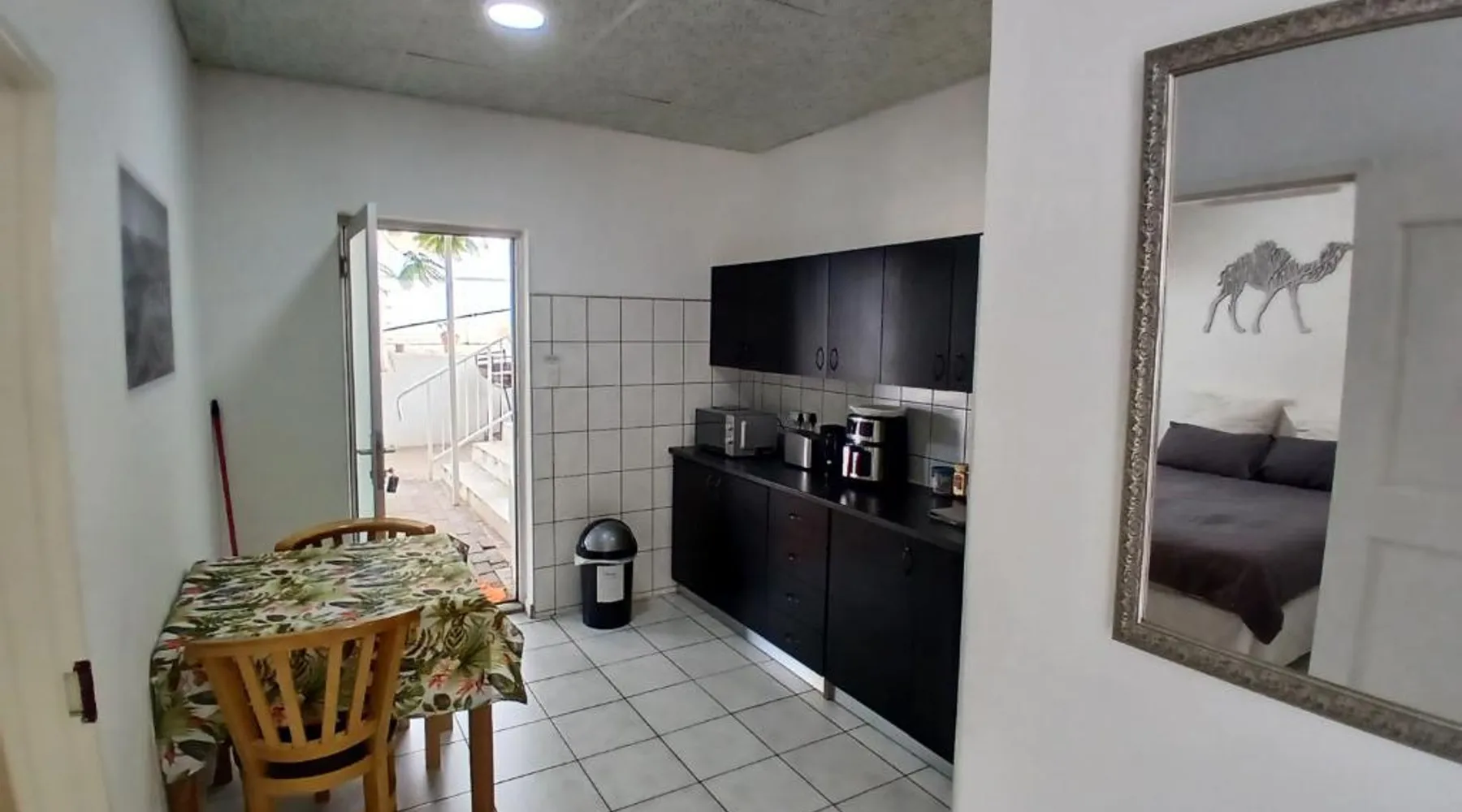Modern Comforts: Villa Saffier in Windhoek offers a recently renovated apartment with one bedroom and one bathroom. Guests enjoy air-conditioning, a terrace, and a kitchenette equipped with a refrigerator, microwave, and electric kettle. Outdoor Amenities: The property features a garden, terrace, and seasonal outdoor swimming pool. Free WiFi is available throughout the apartment, ensuring connectivity for all visitors. Convenient Location: Located 5 mi from Eros Airport, Villa Saffier is close to Eros Shopping Center (1.9 mi), National Theater Namibia and Windhoek Railway Station (2.5 mi each), and the National Museum of Namibia ACRE (3.1 mi). Free on-site private parking is provided. Guest Satisfaction: Highly rated by guests for its attentive host and impeccable room cleanliness, Villa Saffier offers a comfortable and pleasant stay. This apartment features a private pool. In the kitchen, guests will find a refrigerator, kitchenware, a microwave and a toaster. Boasting a terrace with garden views, this apartment also features air conditioning and a flat-screen TV with cable channels. The unit has 1 bed.