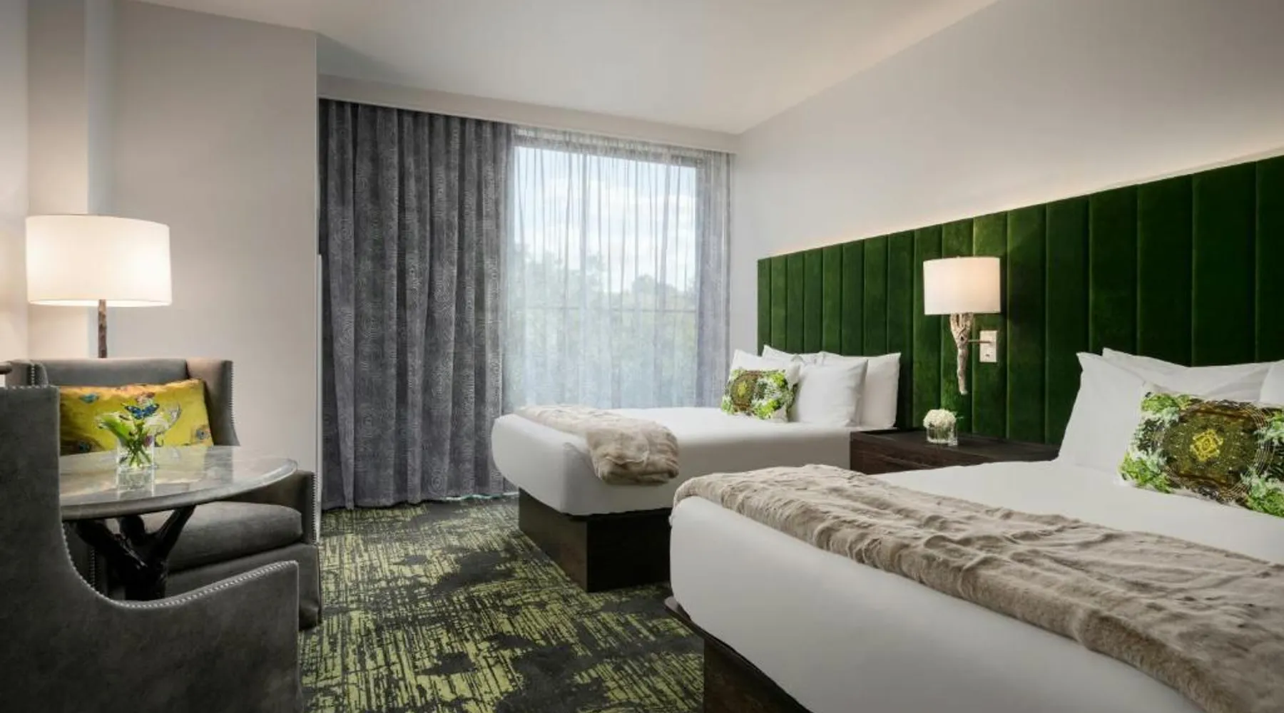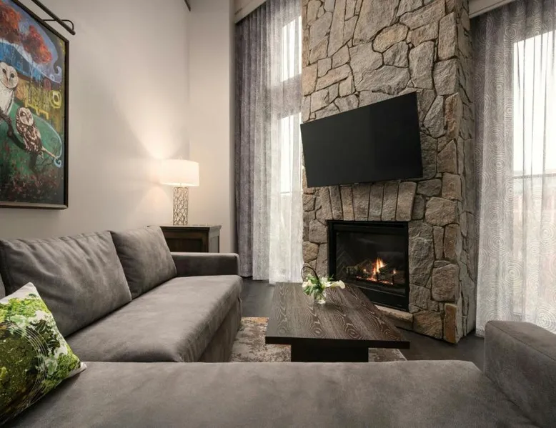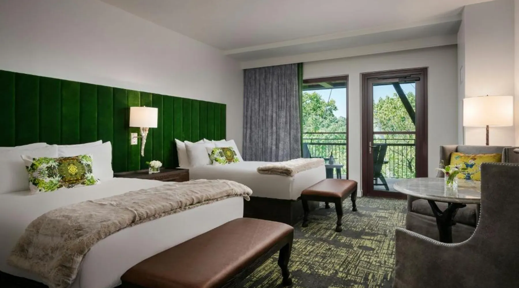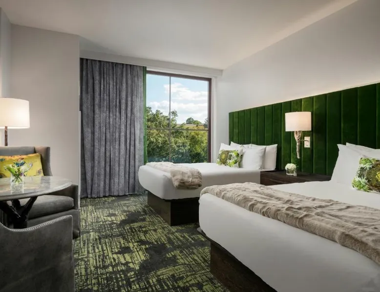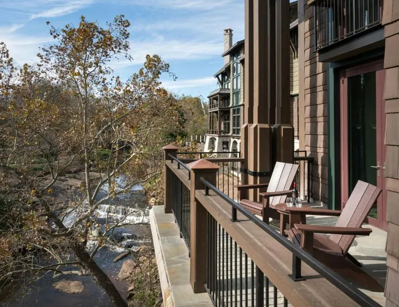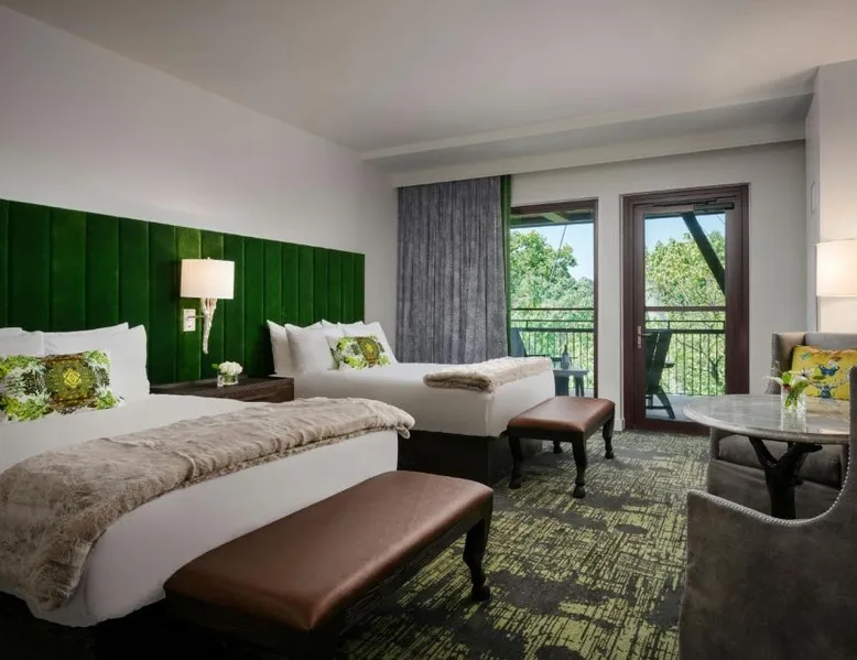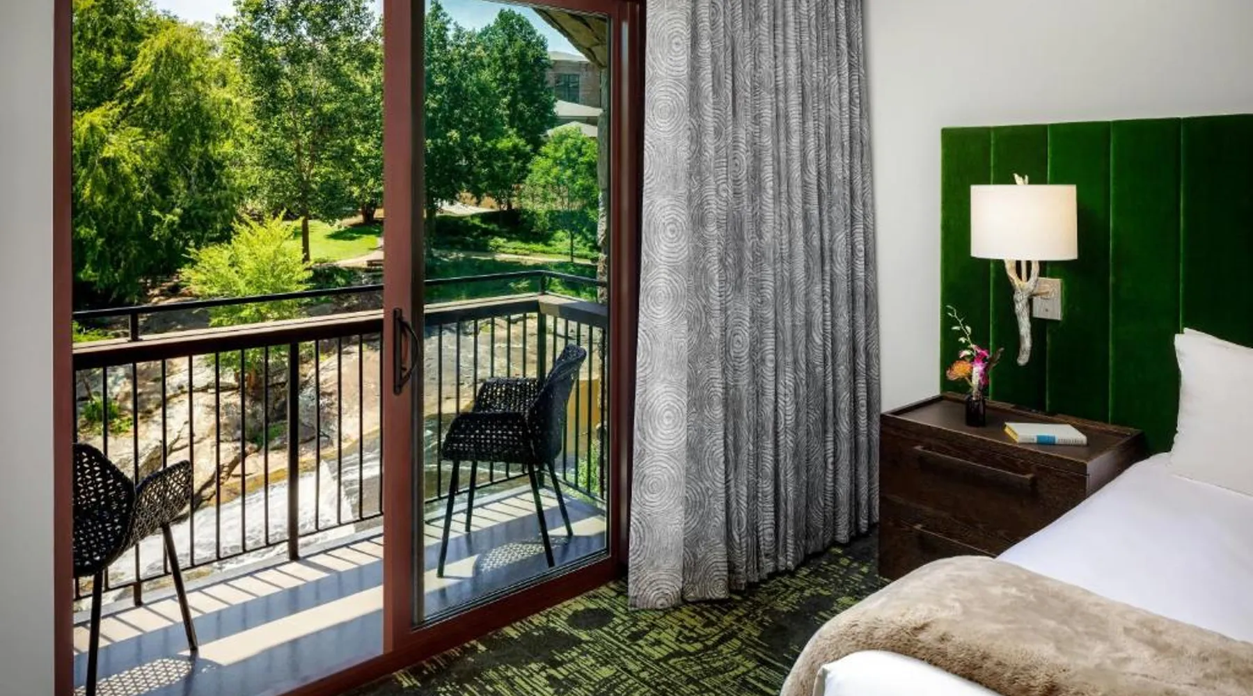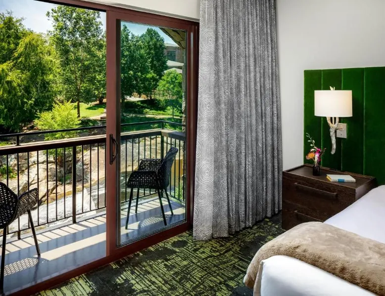 Prime City Center Location: Grand Bohemian Lodge Greenville, Autograph Collection in Greenville offers a convenient location with the Peace Center a 6-minute walk away and Greenville Zoo 1.2 mi nearby. Greenville-Spartanburg International Airport is 13 mi from the hotel. Exceptional Facilities: Guests enjoy spa and wellness facilities, a fitness center, sun terrace, restaurant, bar, and free WiFi. Additional amenities include a lounge, outdoor fireplace, and electric vehicle charging station. Comfortable Accommodations: Rooms feature air-conditioning, private bathrooms, balconies with city or river views, and modern amenities such as flat-screen TVs and work desks. Interconnected rooms and family rooms cater to all travelers. Dining Experience: The family-friendly restaurant serves American cuisine with vegetarian options. Breakfast includes champagne and warm dishes, while lunch and dinner offer a variety of meals in a traditional setting. This air-conditioned family room includes a flat-screen TV with cable channels, a private bathroom as well as a balcony with city views. The unit offers 2 beds.
