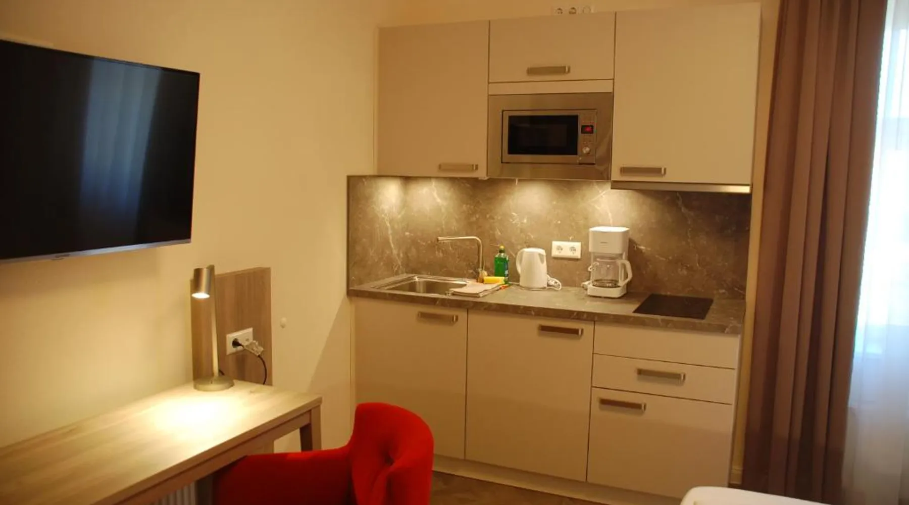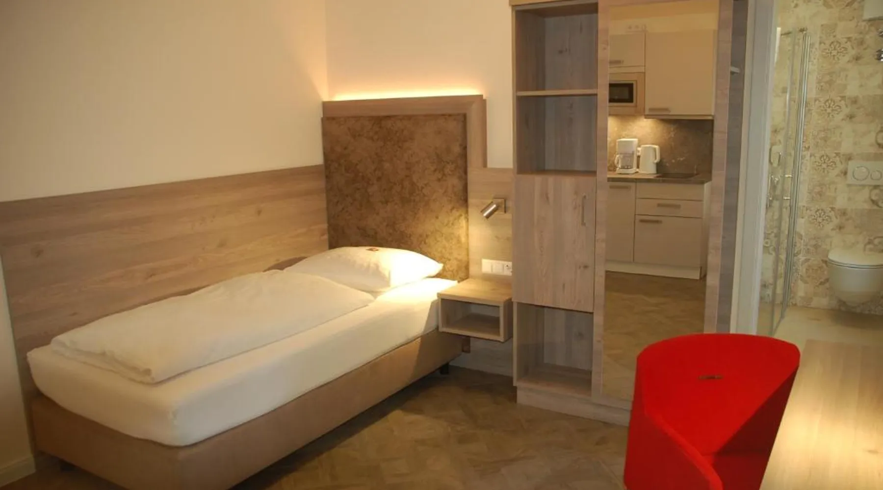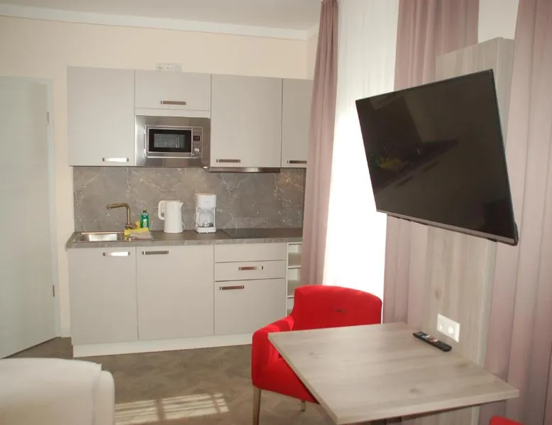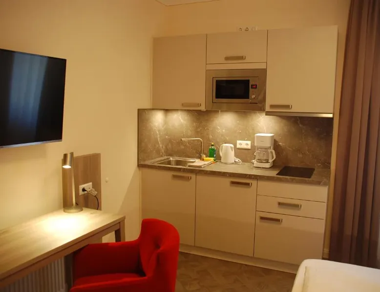 Comfortable Accommodations: Aparthotel Weißenhorn in Weißenhorn offers recently renovated aparthotel units with free WiFi and free on-site private parking. Each room includes a kitchenette, private bathroom, and a seating area. Modern Amenities: Guests can enjoy a coffee machine, refrigerator, microwave, stovetop, electric kettle, and kitchenware. Additional amenities include a dining table, TV, hairdryer, and wardrobe. Convenient Location: Located 28 mi from Memmingen Airport, the aparthotel is near attractions such as Ulm City Hall (13 mi), Ulm Museum (14 mi), and Illereichen Castle (14 mi). Guests appreciate the room cleanliness and convenient location. The double room provides a coffee machine, a seating area, as well as a private bathroom featuring a shower and a hairdryer. In the well-equipped kitchenette, guests will find a stovetop, a refrigerator, kitchenware and a microwave. This double room features a wardrobe, heating and a flat-screen TV. The unit offers 1 bed.
