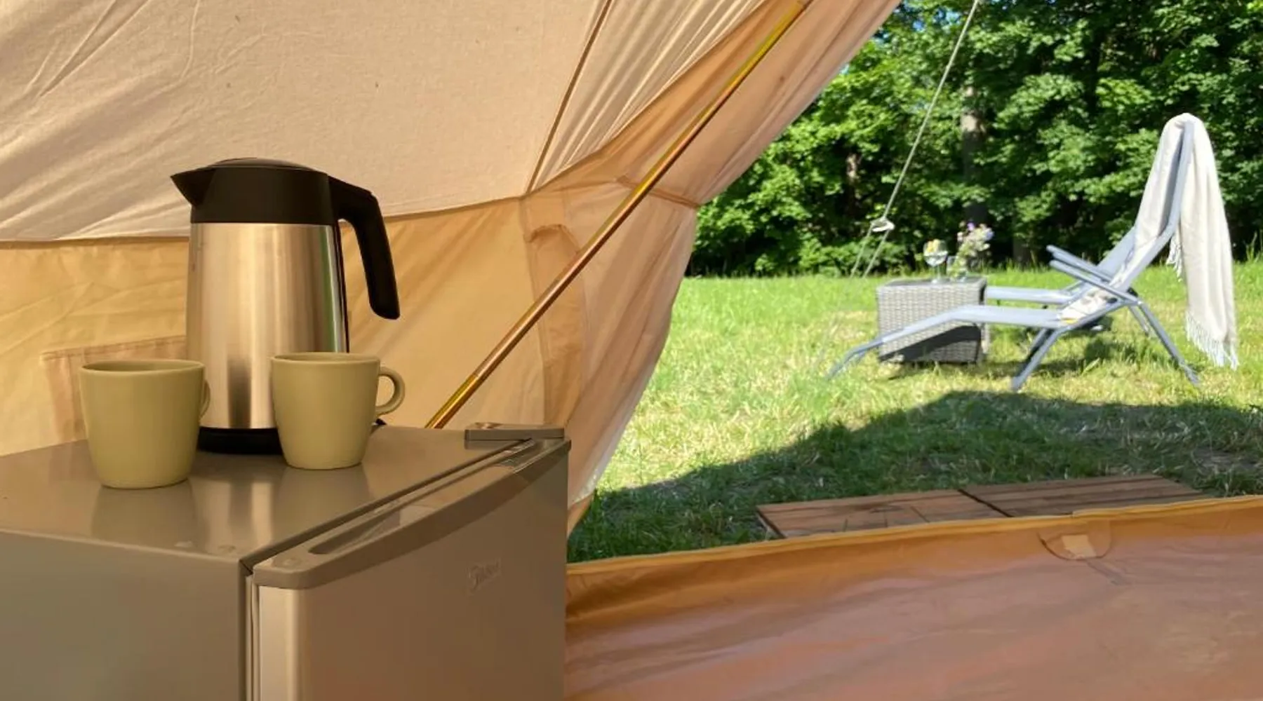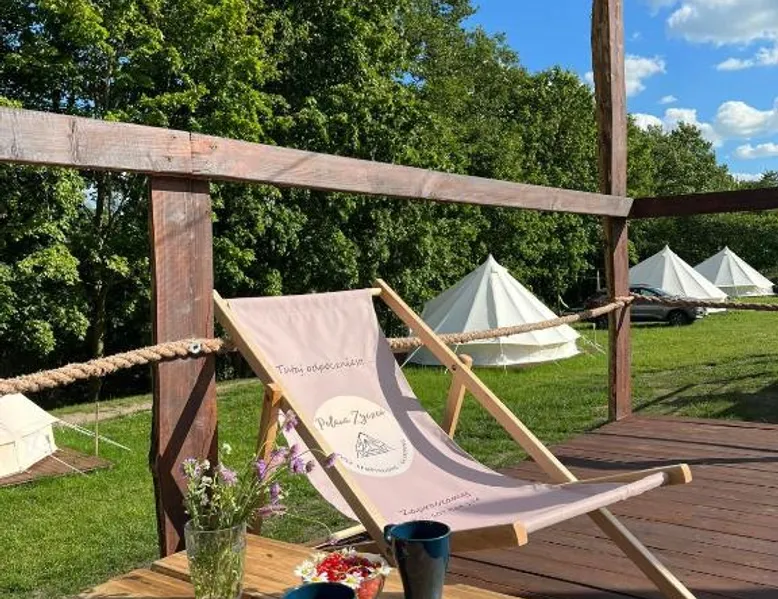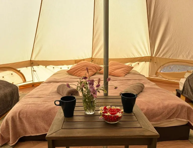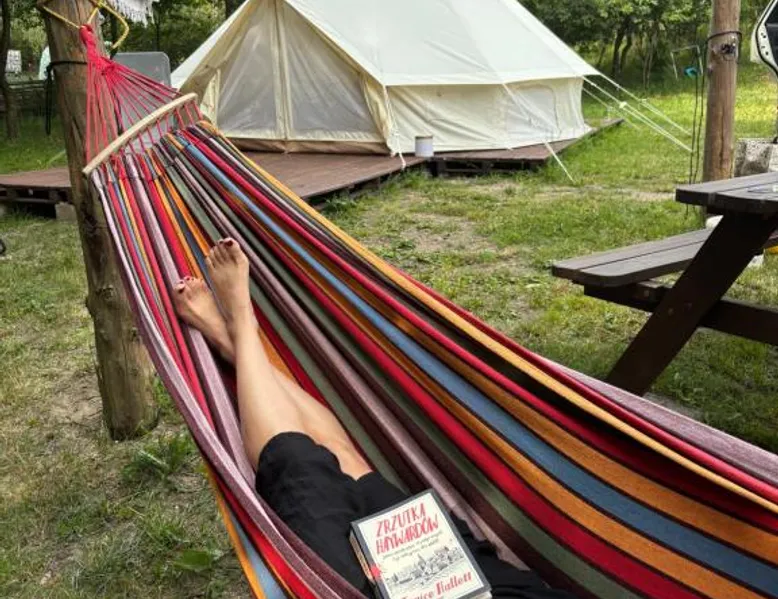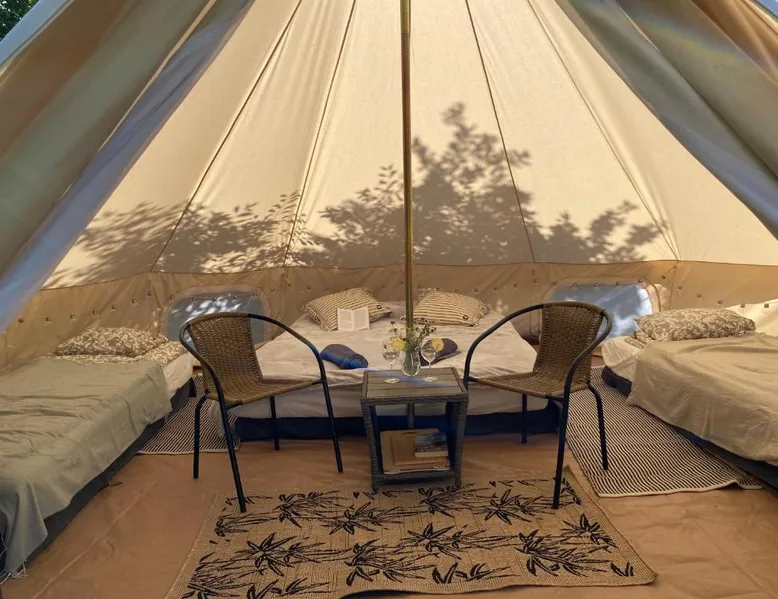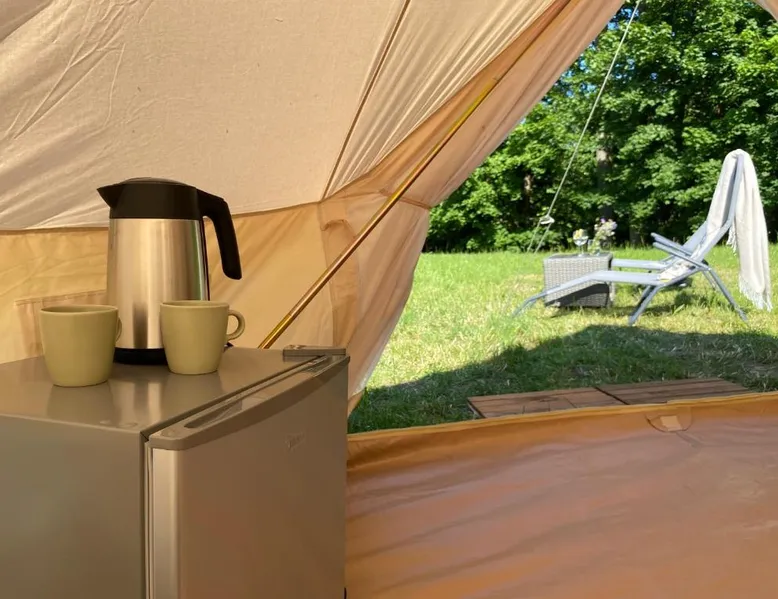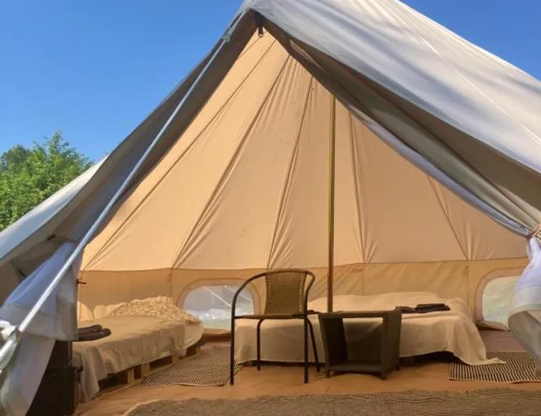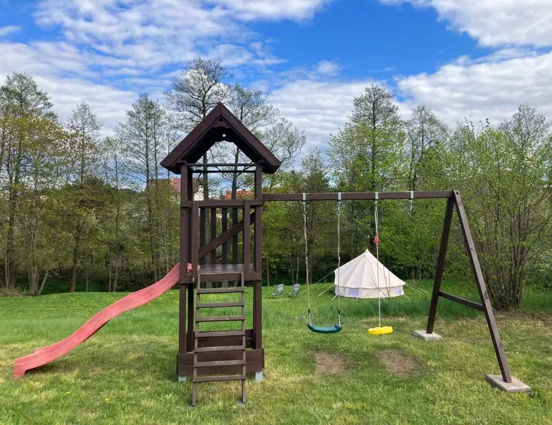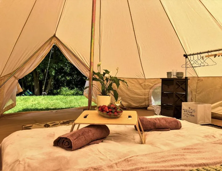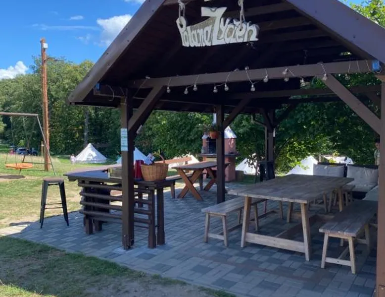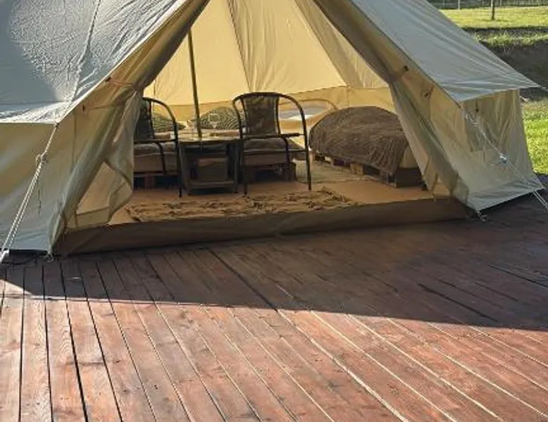 Elegant Accommodations: Mazury Glamping Kruklanki Polana Życzeń in Kruklanki offers luxury tents with garden and tennis court views. Each tent features a private entrance, family rooms, and modern amenities. Comfortable Facilities: Guests enjoy a private check-in and check-out service, outdoor fireplace, outdoor play area, and barbecue facilities. Additional amenities include free on-site parking, bicycle parking, and a children's playground. Delicious Breakfast: A continental breakfast with cheese is served daily, providing a perfect start to the day. Local Attractions: Located 73 mi from Olsztyn-Mazury Airport, the property is near Indian Village (5.6 mi), Boyen Fortress (9.9 mi), Talki Golf Course (18 mi), and Wolf's Lair (27 mi). The tent offers a seating area, a dining area, as well as a shared bathroom featuring a shower. Among the room amenities are a washing machine, a private entrance, a tea and coffee maker as well as an outdoor dining area and garden views. The unit offers 3 beds.