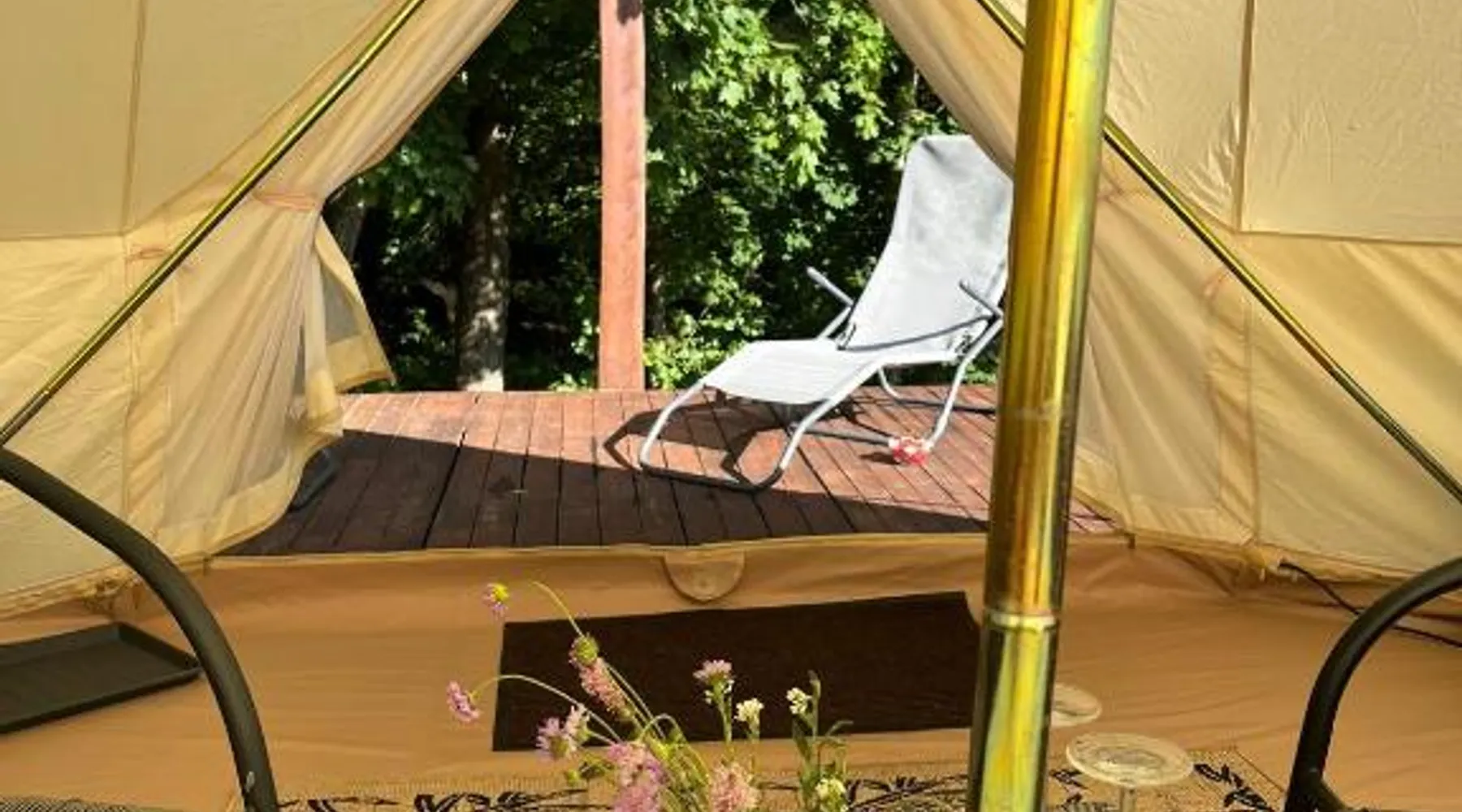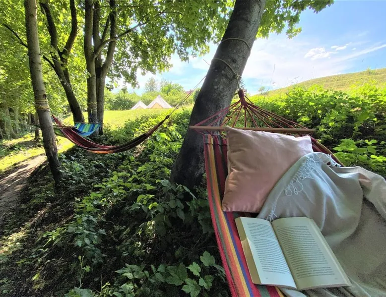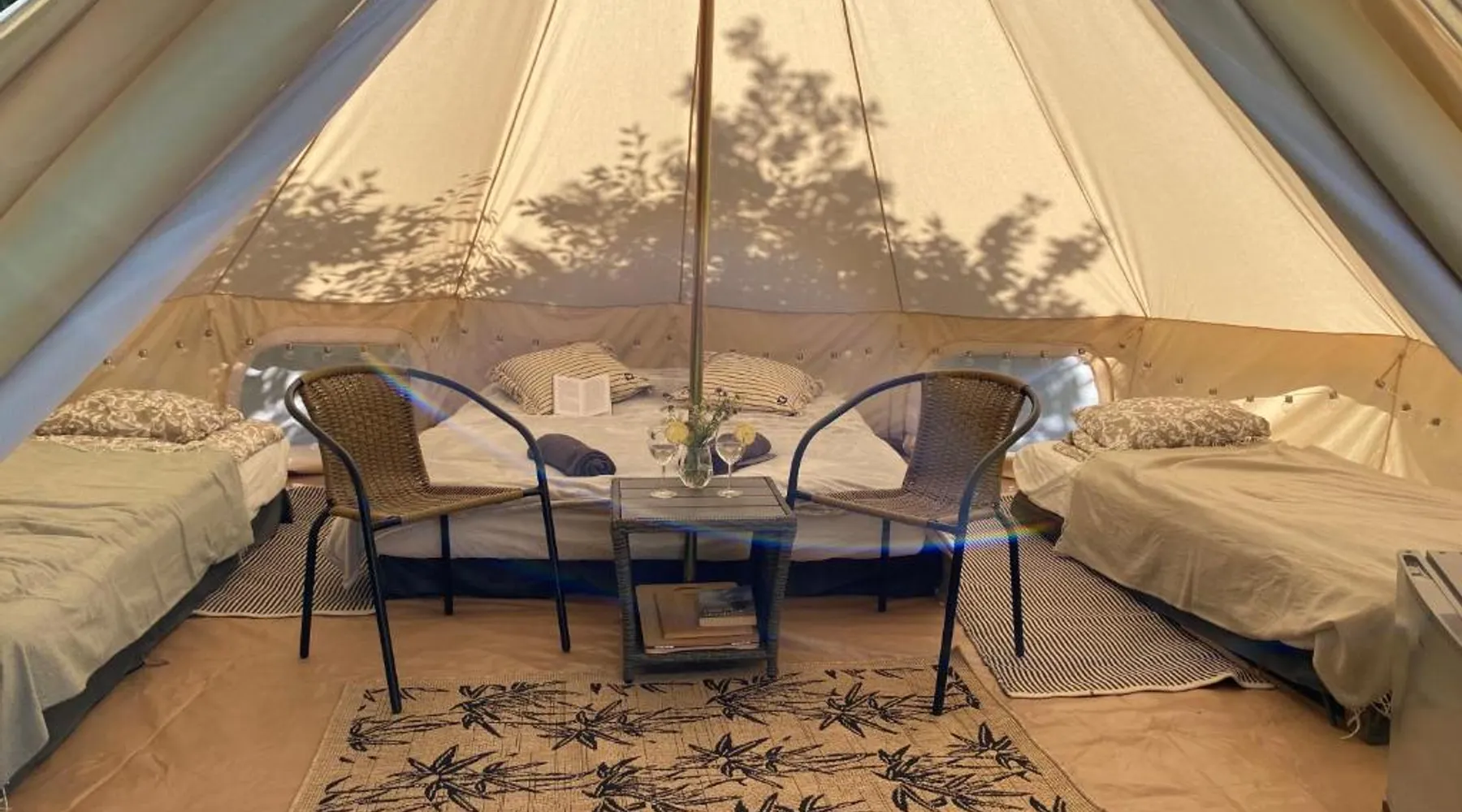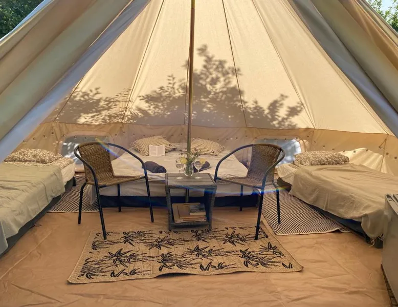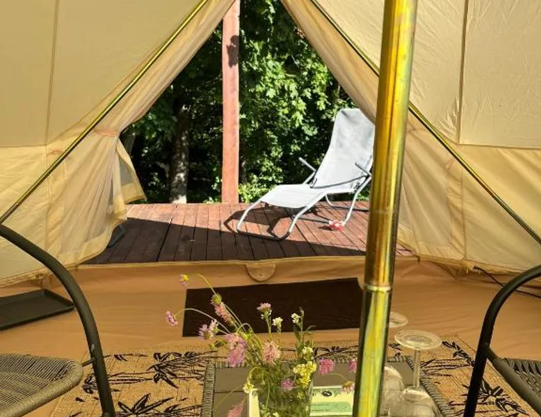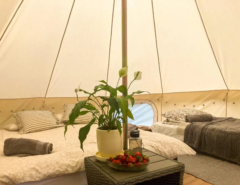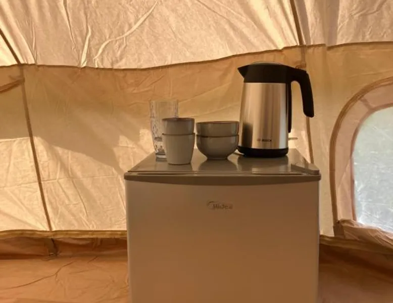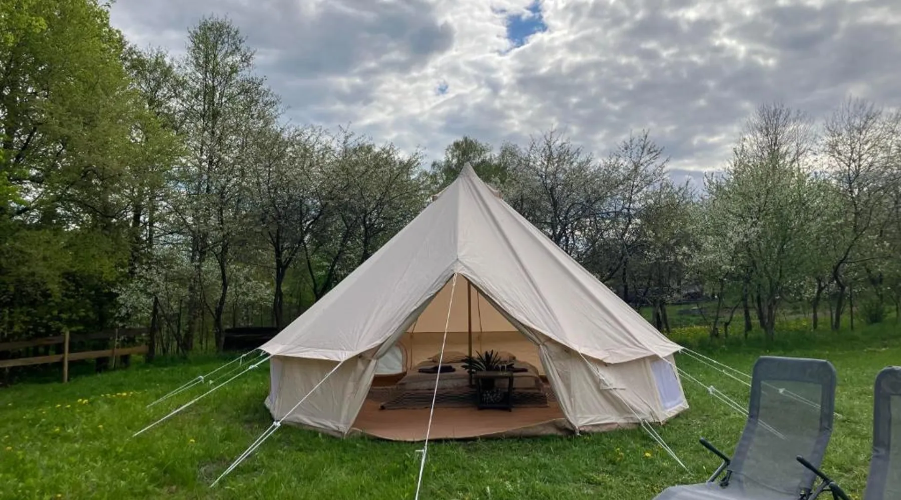 Elegant Accommodations: Mazury Glamping Kruklanki Polana Życzeń in Kruklanki offers luxury tents with garden and tennis court views. Each tent features a private entrance, family rooms, and modern amenities. Comfortable Facilities: Guests enjoy a private check-in and check-out service, outdoor fireplace, outdoor play area, and barbecue facilities. Additional amenities include free on-site parking, bicycle parking, and a children's playground. Delicious Breakfast: A continental breakfast with cheese is served daily, providing a perfect start to the day. Local Attractions: Located 73 mi from Olsztyn-Mazury Airport, the property is near Indian Village (5.6 mi), Boyen Fortress (9.9 mi), Talki Golf Course (18 mi), and Wolf's Lair (27 mi). The tent offers a seating area, a dining area, as well as a shared bathroom featuring a shower. Among the room amenities are a washing machine, a private entrance, a tea and coffee maker as well as an outdoor dining area and garden views. The unit offers 3 beds.