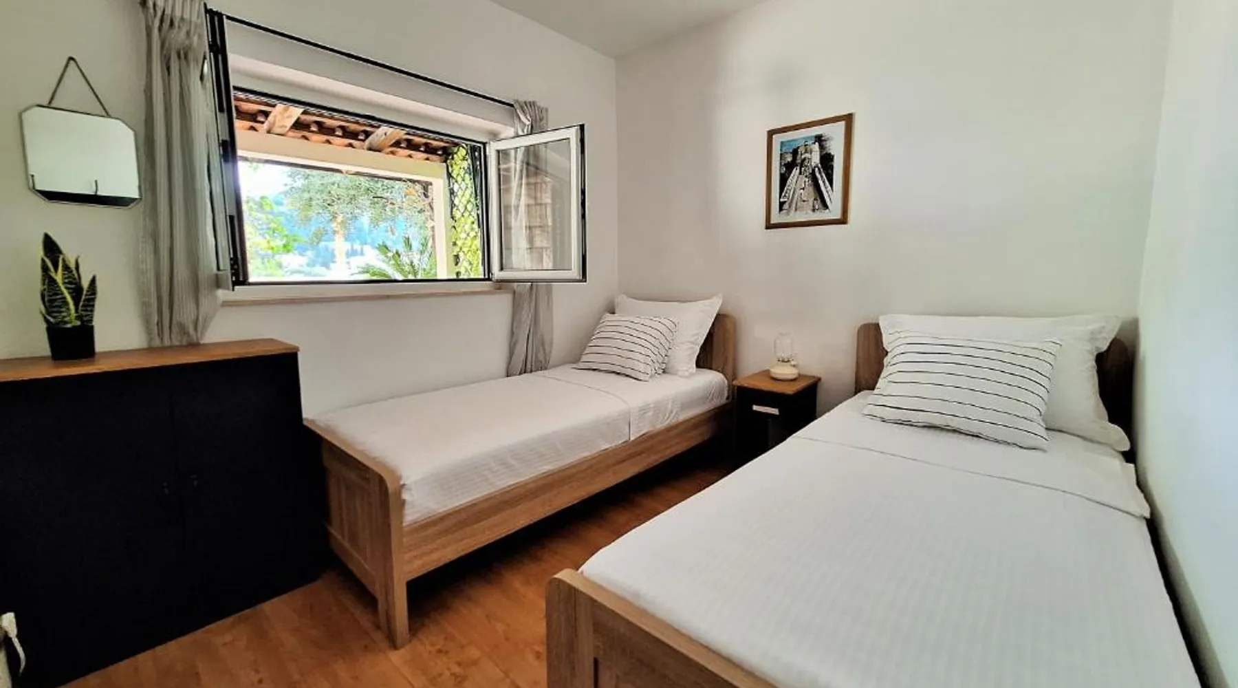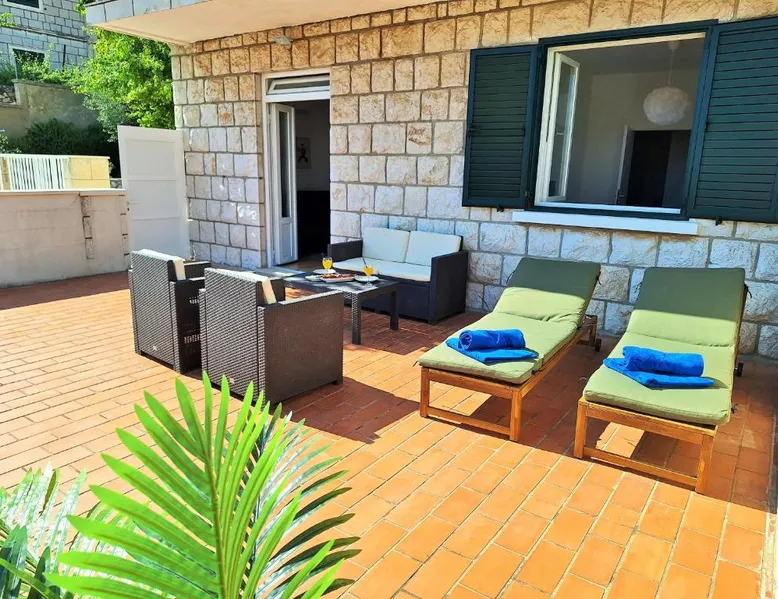 Modern Comforts: Villa Blue Promenade in Dubrovnik offers a recently renovated apartment with a terrace and free WiFi. The property includes air-conditioning, a fully equipped kitchen, and a private bathroom. Convenient Facilities: Guests can enjoy free on-site private parking, a paid shuttle service, and family rooms. Additional amenities include streaming services, a washing machine, and a dining area. Prime Location: Located 12 mi from Dubrovnik Airport, the apartment is a 6-minute walk from Lapad Bay Beach. Nearby attractions include Orlando Column and Pile Gate, each 2.5 mi away. Boating is available in the surroundings. Guest Satisfaction: Highly rated by guests for its friendly host, convenient location, and easy beach access. Featuring a private entrance, this air-conditioned apartment consists of 1 living room, 2 separate bedrooms and 1 bathroom with a shower and a hairdryer. Meals can be prepared in the well-fitted kitchen, which comes with a refrigerator, a dishwasher, kitchenware and a microwave. Boasting a terrace with garden views, this apartment also provides a washing machine and a flat-screen TV with streaming services. The unit offers 3 beds.