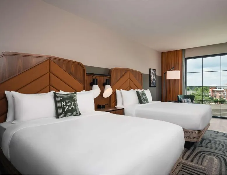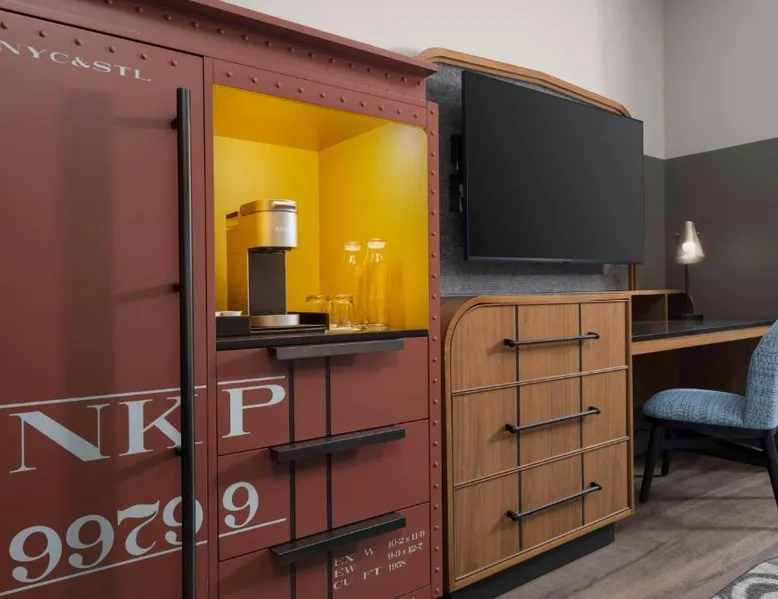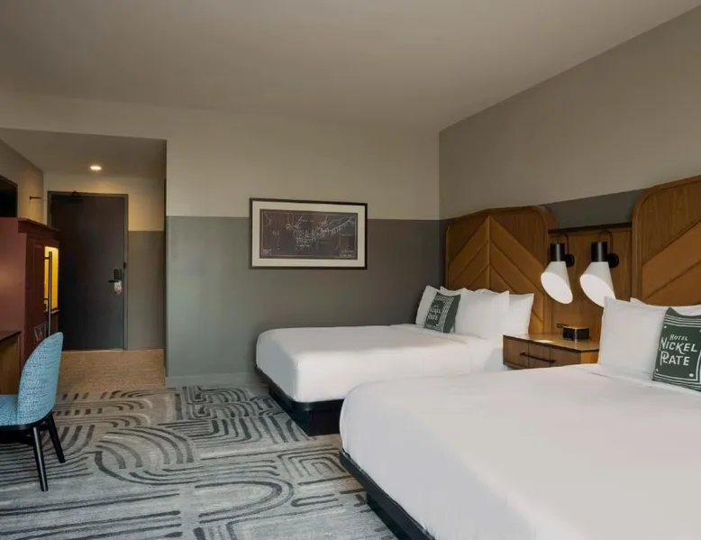 Comfortable Accommodations: Hotel Nickel Plate Fishers in Fishers offers 4-star comfort with air-conditioning, free toiletries, and a work desk. Each room includes a tea and coffee maker, refrigerator, and TV. Exceptional Facilities: Guests can enjoy a fitness room, elevator, 24-hour front desk, and room service. Additional amenities include bathrobes, bath, sofa bed, and interconnected rooms. Prime Location: Located 18 mi from Lucas Oil Stadium and 20 mi from Indianapolis Motor Speedway, the hotel is near attractions such as the Indianapolis Museum of Art (15 mi) and the Children's Museum of Indianapolis (14 mi). Guest Satisfaction: Highly rated for its attentive staff and excellent service support, the hotel also features a bar and comfortable rooms. The air-conditioned quadruple room features a flat-screen TV with cable channels, a tea and coffee maker, a seating area and a safe deposit box. The unit has 2 beds.