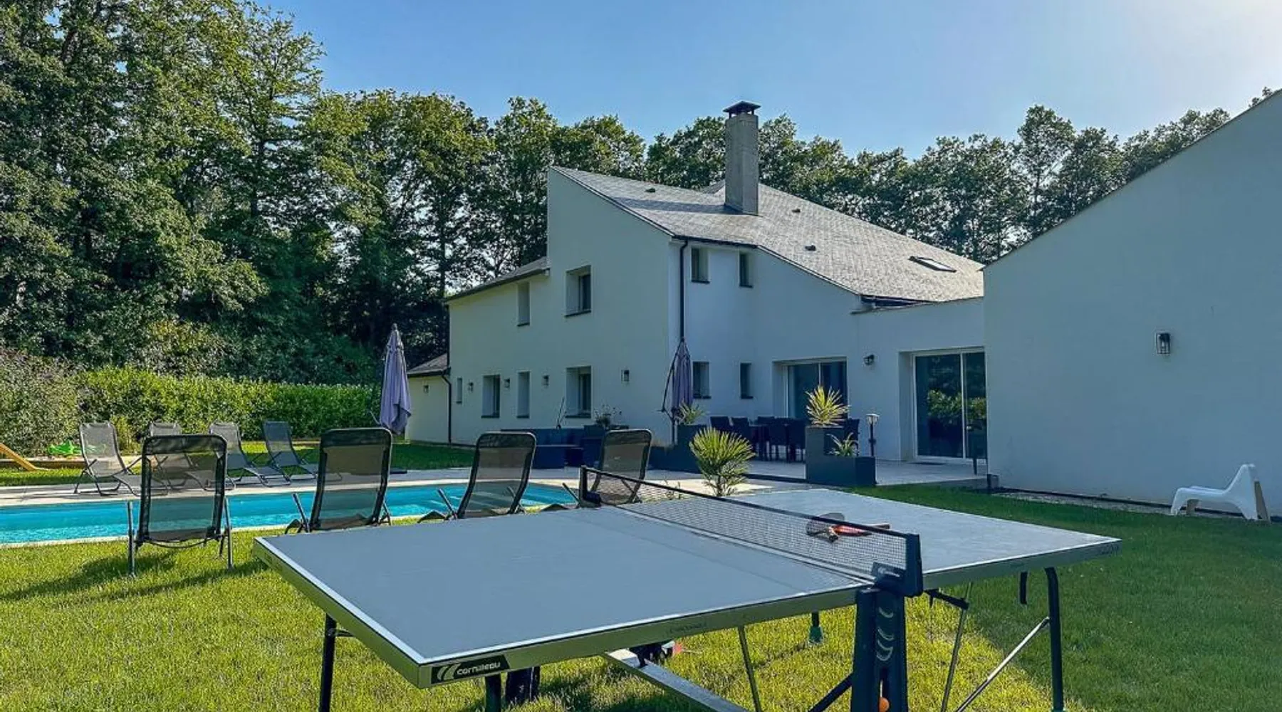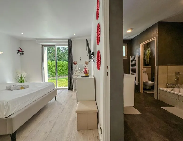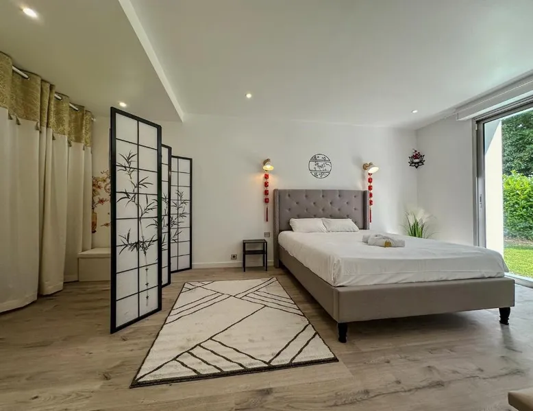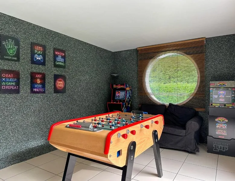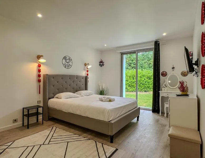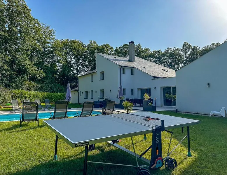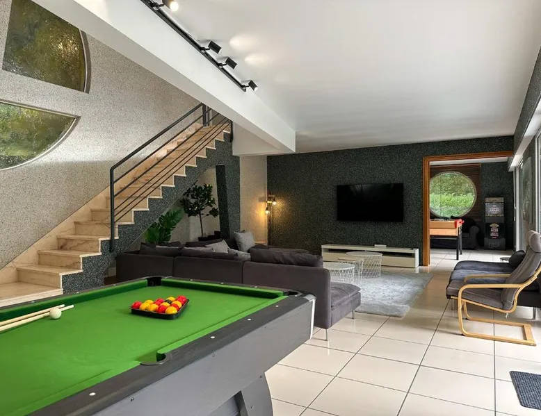 Spacious Accommodations: Villa avec piscine, Cinéma, terrain privé in Nogent-le-Phaye offers six bedrooms and four bathrooms. The property features a garden, terrace, and a year-round outdoor swimming pool. Free WiFi is available throughout the villa. Modern Amenities: Guests can enjoy air-conditioning, a heated pool, balcony, and a games room. The villa includes a fully equipped kitchen, washing machine, and a work desk. Additional amenities include streaming services, a fireplace, and a barbecue. Convenient Location: Located 44 mi from Paris Orly Airport, the villa is near attractions such as the Municipal Theater of Chartres and Chartres Cathedral, each 4.3 mi away. Other points of interest include Chartrexpo at 2.7 mi and Rambouillet Castle at 26 mi. Highly Rated by Guests: Guests appreciate the spaciousness and excellent facilities, making it a highly rated choice for a comfortable stay. The fireplace is a top feature of this villa. Boasting a private entrance, this spacious villa also comes with 6 separate bedrooms and 4 bathrooms with a bath and a shower. Guests will find a refrigerator, a dishwasher, kitchenware and an oven in the well-fitted kitchen. The villa also includes a barbecue. The air-conditioned villa features a TV with streaming services, a washing machine, a coffee machine, tumble dryer as well as garden views. The unit has 11 beds.