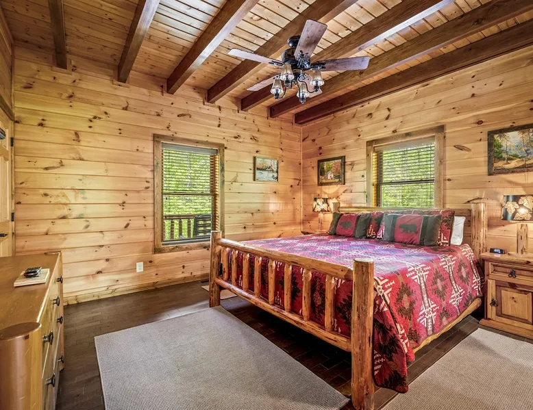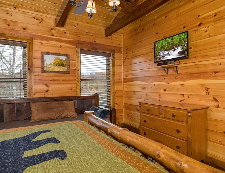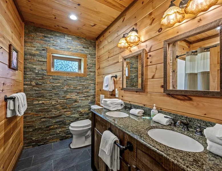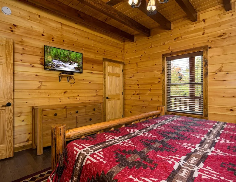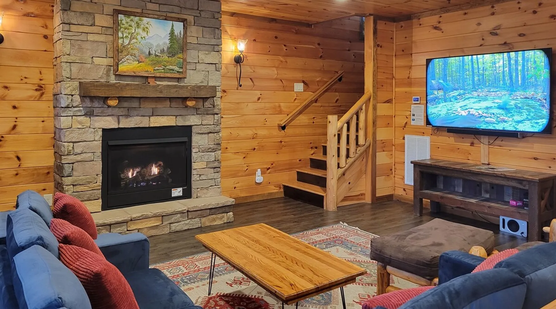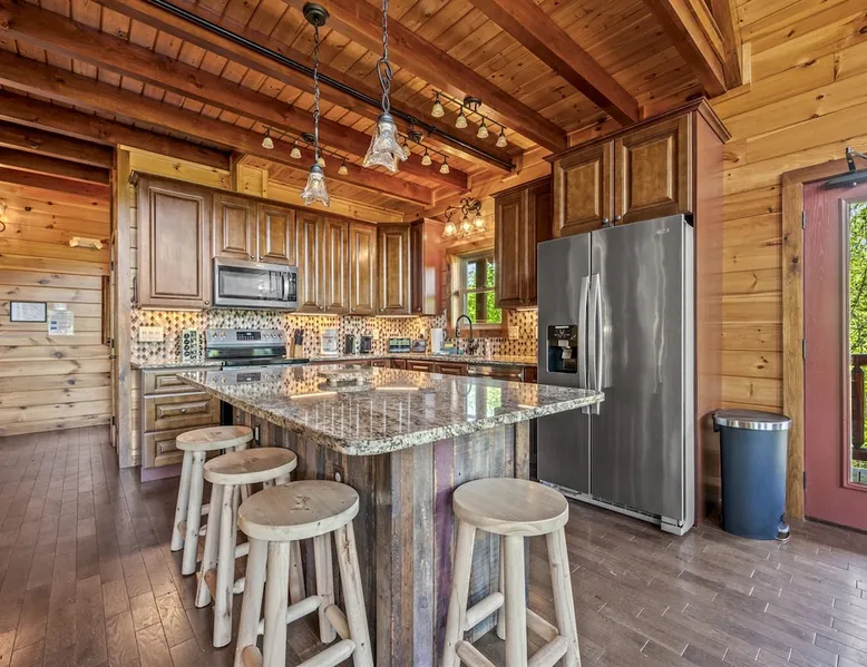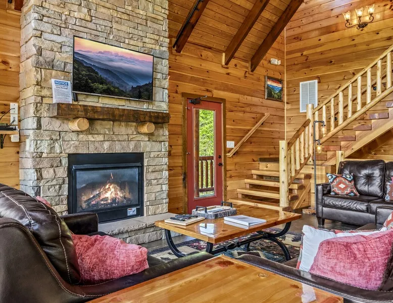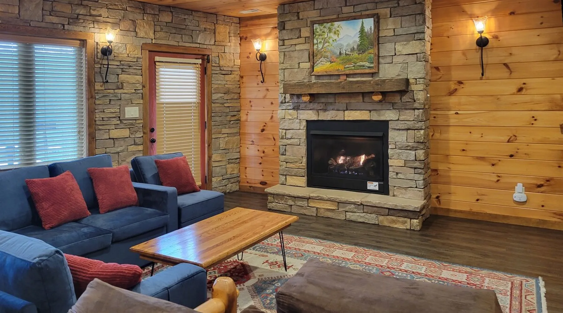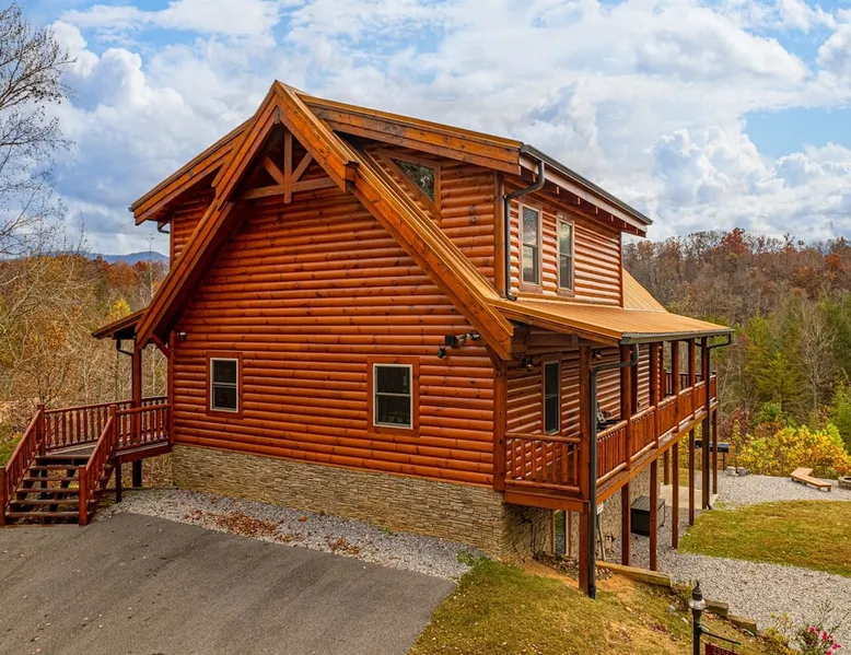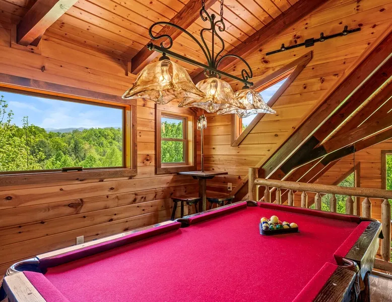 Ridge View Lodge - 3-level log home on 1.5 acres overlooks the ridge, woods & mountains. Floor-to-ceiling windows in the great room maximize the view. Modern kitchen + kitchenette. Open decks with rockers, covered porches, yard/firepit to enjoy nature. Media/Game room with smart TV, Foosball, skee-ball, and arcade. Pool table in loft. 2 fireplaces add a cozy touch (winter). Sleeps up to 16 (12 adults MAX). No parties/events. No indoor smoking. No pets/animals. The space ✔ 1.5-acre semi-private lot with mountain and wooded views ✔ Custom timber frame cabin with vaulted ceilings, exposed trusses ✔ 5 bedrooms, 3.5 bathrooms, sleeps up to 16 ✔ Complimentary WIFI via fiber optic Main Floor ✔ King bedroom with en-suite bathroom (dual vanity, walk-in shower, jetted tub) ✔ Great room with floor-to-ceiling windows, gas log fireplace, and UHD TV ✔ Modern kitchen with granite countertops, stainless steel appliances, a 4-seat island, and tall cabinetry ✔ Farm-style dining table with benches, seating 12 ✔ Expansive open deck with Mt. LeConte and wooded ridge views ✔ Covered side porches ✔ Triple-zone central heat/air and heated bathroom floors (winter) Upper Level ✔ Loft with pool table and TV ✔ King bedroom with access to a full bathroom (dual vanity) ✔ Queen bedroom with additional twin daybed ✔ TVs in all bedrooms Lower Level ✔ Queen bedroom with additional twin daybed ✔ Bunk room with two twin-over-twin bunk beds ✔ Entertainment area with gas log fireplace, 70" UHD TV, foosball, skee-ball game, classic arcade, and ample seating ✔ Kitchenette with full-size refrigerator, sink, microwave, and coffee maker Outdoors ✔ Walkout patio with 6-person hot tub ✔ Yard with games ✔ Fire pit with seating ✔ Plentiful paved and gravel parking for up to 6 cars ✔ Charcoal grill and picnic tables If you are looking for a spacious, unique, out-of-the-ordinary luxury mountain cabin in the Smokies, you just found it! Bring family and friends, have a couples retreat, or even a family reunion - this 5-bedroom upscale mountain home is sure to please. Ridge View Lodge was custom-built to offer ample common spaces and plenty of separation so that several families or couples can have privacy yet still share the amenities. Go for a day of hiking, or mountain biking, or, for the more adventurous, try zip-lining at the nearby Climb Works zip-line tours. Come back and soothe your sore muscles in our six-person hot tub. Relax in style on the oversized deck in our comfortable rockers while the kids stay entertained with the pool table, Foosball, and cocktail-style arcade game. Every bedroom is equipped with a TV. Sit out on covered side porches and you will feel like you are in a treehouse because the cabin is set atop the hill with a commanding view of the mountain ridges and wooded surroundings. If stargazing with a glass of wine is your thing, we’ve got a large deck with rockers for that. Sit out on covered side porches and feel like you are in a treehouse because the cabin is set on a hill with a commanding view of the mountain ridges and wooded surroundings. Movies or watching TV are your thing? There are TVs in every room of the house, some with game ports. Love games? We’ve got that too – from the cocktail-style 2-player arcade with all the favorite 80s classic games (Pac-Man and Centipede, anyone?), to the pool table and Foosball, we’ve got you covered! Moms and Dads can relax – youngsters will find plenty to keep them occupied. ★ 𝗠𝗔𝗜𝗡 𝗟𝗘𝗩𝗘𝗟: Soaring timber frame ceilings in the great room are sure to impress. Gather around the huge farm-style dining table handcrafted from rough-sawn cedar and enjoy the mountain ridge views through the wall of windows. The front “prow” of the cabin was designed to maximize the view, and on a clear day, you can see Mt. LeConte at a distance. Comfy leather sofas are great for watching a movie on a UHD TV or just enjoying a conversation or playing a game by the warmth of the fireplace. Open-concept kitchen with tall soft-close cabinetry, granite countertops, stainless steel appliances, and an island clad in reclaimed wood blends modern convenience with a rustic touch. The island seats four and is a great complement to the adjacent dining area that seats 12. Whether you want to cook your feast from scratch or just microwave-and-go, you will find everything you need. The main floor king master features a skip-planed pine log bed with a comfy memory foam mattress and a master closet. The large private bath has a separate shower and a jetted tub. We cannot help but mention the reclaimed wood vanity (handcrafted by owners!) with two vessel sinks and a unique countertop decorated with fall leaves gathered on the property. The rustic barn door to the bathroom adds character and texture. Heated bathroom floors (in the winter) feel oh-so-good! ★ 𝗧𝗢𝗣 𝗟𝗘𝗩𝗘𝗟: In the loft area with picture windows overlooking the mountain ridge, you find a 7’ pool table made by a local craftsman with reclaimed tree trunks. Enjoy a beverage sitting down at a reclaimed wood pub table accented by Mason jar lights, and watch others play... or just gaze through the picture window at the beautiful mountain surroundings. The upper level has a king bedroom that showcases rustic charm with its live-edge cypress headboard, “Ole Smoky Moonshine” mason jar night lights, and barn-style closet door handmade by the owners, and a restored antique dresser. There is also a queen bedroom is furnished with a rustic aspen log bed, a cushy memory foam mattress, plus a twin daybed – a retreat that can accommodate a small family. The top floor bathroom features a walk-in shower and a reclaimed wood double vanity, also lovingly handcrafted by the owners. Heated floors in winter add a touch of welcome warmth. ★ 𝗟𝗢𝗪𝗘𝗥 𝗟𝗘𝗩𝗘𝗟: Family/media room with a 70” 4K UHD TV, 2-player arcade, and Foosba