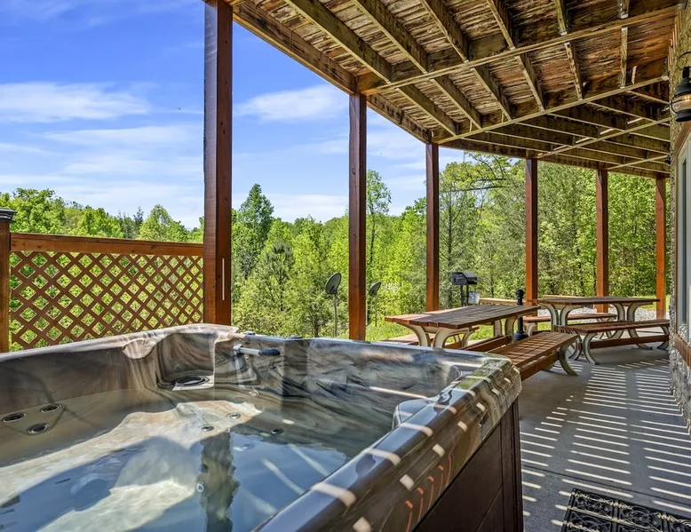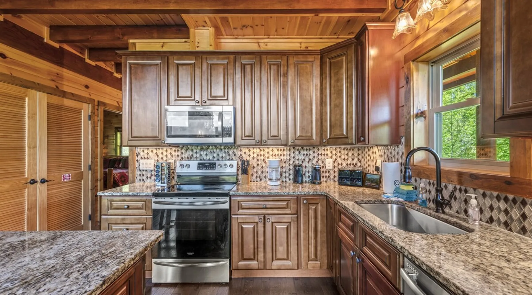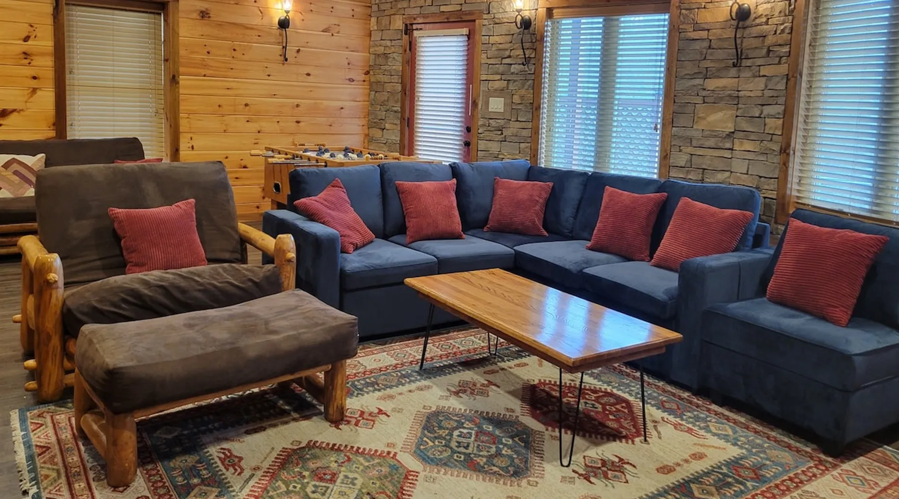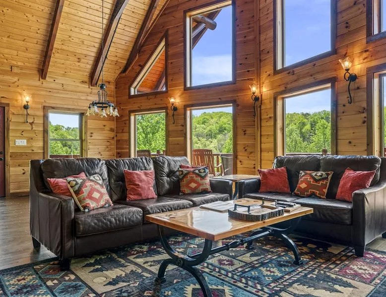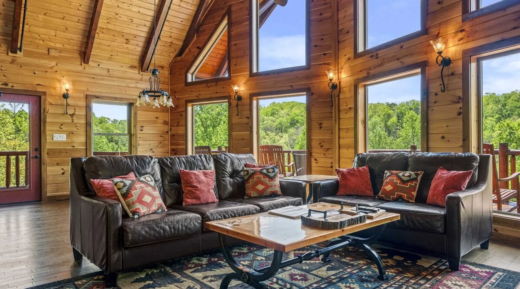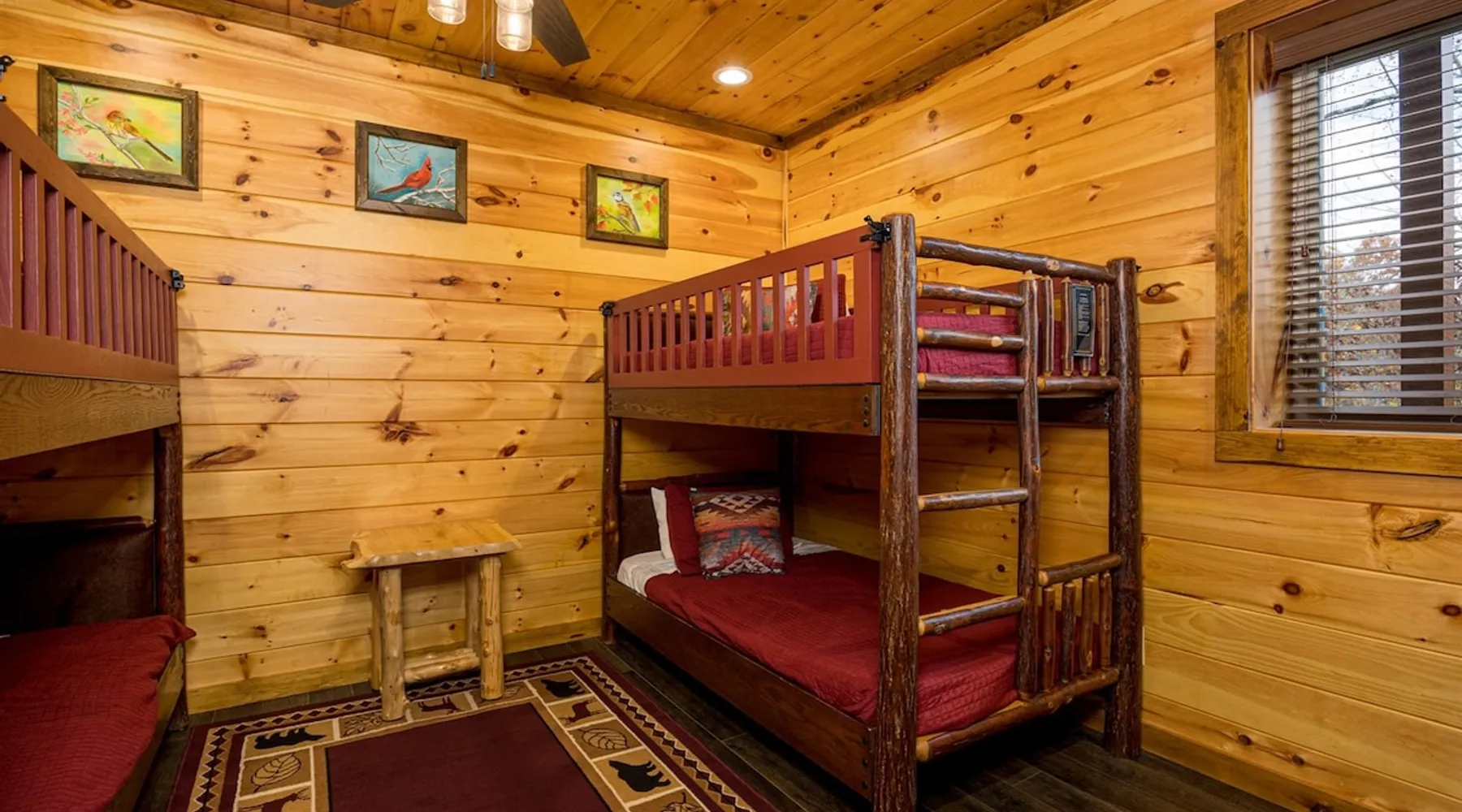 Ridge View Lodge - 3-level log home on 1.5 acres overlooks the ridge, woods & mountains. Floor-to-ceiling windows in the great room maximize the view. Modern kitchen + kitchenette. Open decks with rockers, covered porches, yard/firepit to enjoy nature. Media/Game room with smart TV, Foosball, skee-ball, and arcade. Pool table in loft. 2 fireplaces add a cozy touch (winter). Sleeps up to 16 (12 adults MAX). No parties/events. No indoor smoking. No pets/animals. The space ✔ 1.5-acre semi-private lot with mountain and wooded views ✔ Custom timber frame cabin with vaulted ceilings, exposed trusses ✔ 5 bedrooms, 3.5 bathrooms, sleeps up to 16 ✔ Complimentary WIFI via fiber optic Main Floor ✔ King bedroom with en-suite bathroom (dual vanity, walk-in shower, jetted tub) ✔ Great room with floor-to-ceiling windows, gas log fireplace, and UHD TV ✔ Modern kitchen with granite countertops, stainless steel appliances, a 4-seat island, and tall cabinetry ✔ Farm-style dining table with benches, seating 12 ✔ Expansive open deck with Mt. LeConte and wooded ridge views ✔ Covered side porches ✔ Triple-zone central heat/air and heated bathroom floors (winter) Upper Level ✔ Loft with pool table and TV ✔ King bedroom with access to a full bathroom (dual vanity) ✔ Queen bedroom with additional twin daybed ✔ TVs in all bedrooms Lower Level ✔ Queen bedroom with additional twin daybed ✔ Bunk room with two twin-over-twin bunk beds ✔ Entertainment area with gas log fireplace, 70" UHD TV, foosball, skee-ball game, classic arcade, and ample seating ✔ Kitchenette with full-size refrigerator, sink, microwave, and coffee maker Outdoors ✔ Walkout patio with 6-person hot tub ✔ Yard with games ✔ Fire pit with seating ✔ Plentiful paved and gravel parking for up to 6 cars ✔ Charcoal grill and picnic tables If you are looking for a spacious, unique, out-of-the-ordinary luxury mountain cabin in the Smokies, you just found it! Bring family and friends, have a couples retreat, or even a family reunion - this 5-bedroom upscale mountain home is sure to please. Ridge View Lodge was custom-built to offer ample common spaces and plenty of separation so that several families or couples can have privacy yet still share the amenities. Go for a day of hiking, or mountain biking, or, for the more adventurous, try zip-lining at the nearby Climb Works zip-line tours. Come back and soothe your sore muscles in our six-person hot tub. Relax in style on the oversized deck in our comfortable rockers while the kids stay entertained with the pool table, Foosball, and cocktail-style arcade game. Every bedroom is equipped with a TV. Sit out on covered side porches and you will feel like you are in a treehouse because the cabin is set atop the hill with a commanding view of the mountain ridges and wooded surroundings. If stargazing with a glass of wine is your thing, we’ve got a large deck with rockers for that. Sit out on covered side porches and feel like you are in a treehouse because the cabin is set on a hill with a commanding view of the mountain ridges and wooded surroundings. Movies or watching TV are your thing? There are TVs in every room of the house, some with game ports. Love games? We’ve got that too – from the cocktail-style 2-player arcade with all the favorite 80s classic games (Pac-Man and Centipede, anyone?), to the pool table and Foosball, we’ve got you covered! Moms and Dads can relax – youngsters will find plenty to keep them occupied. ★ 𝗠𝗔𝗜𝗡 𝗟𝗘𝗩𝗘𝗟: Soaring timber frame ceilings in the great room are sure to impress. Gather around the huge farm-style dining table handcrafted from rough-sawn cedar and enjoy the mountain ridge views through the wall of windows. The front “prow” of the cabin was designed to maximize the view, and on a clear day, you can see Mt. LeConte at a distance. Comfy leather sofas are great for watching a movie on a UHD TV or just enjoying a conversation or playing a game by the warmth of the fireplace. Open-concept kitchen with tall soft-close cabinetry, granite countertops, stainless steel appliances, and an island clad in reclaimed wood blends modern convenience with a rustic touch. The island seats four and is a great complement to the adjacent dining area that seats 12. Whether you want to cook your feast from scratch or just microwave-and-go, you will find everything you need. The main floor king master features a skip-planed pine log bed with a comfy memory foam mattress and a master closet. The large private bath has a separate shower and a jetted tub. We cannot help but mention the reclaimed wood vanity (handcrafted by owners!) with two vessel sinks and a unique countertop decorated with fall leaves gathered on the property. The rustic barn door to the bathroom adds character and texture. Heated bathroom floors (in the winter) feel oh-so-good! ★ 𝗧𝗢𝗣 𝗟𝗘𝗩𝗘𝗟: In the loft area with picture windows overlooking the mountain ridge, you find a 7’ pool table made by a local craftsman with reclaimed tree trunks. Enjoy a beverage sitting down at a reclaimed wood pub table accented by Mason jar lights, and watch others play... or just gaze through the picture window at the beautiful mountain surroundings. The upper level has a king bedroom that showcases rustic charm with its live-edge cypress headboard, “Ole Smoky Moonshine” mason jar night lights, and barn-style closet door handmade by the owners, and a restored antique dresser. There is also a queen bedroom is furnished with a rustic aspen log bed, a cushy memory foam mattress, plus a twin daybed – a retreat that can accommodate a small family. The top floor bathroom features a walk-in shower and a reclaimed wood double vanity, also lovingly handcrafted by the owners. Heated floors in winter add a touch of welcome warmth. ★ 𝗟𝗢𝗪𝗘𝗥 𝗟𝗘𝗩𝗘𝗟: Family/media room with a 70” 4K UHD TV, 2-player arcade, and Foosba