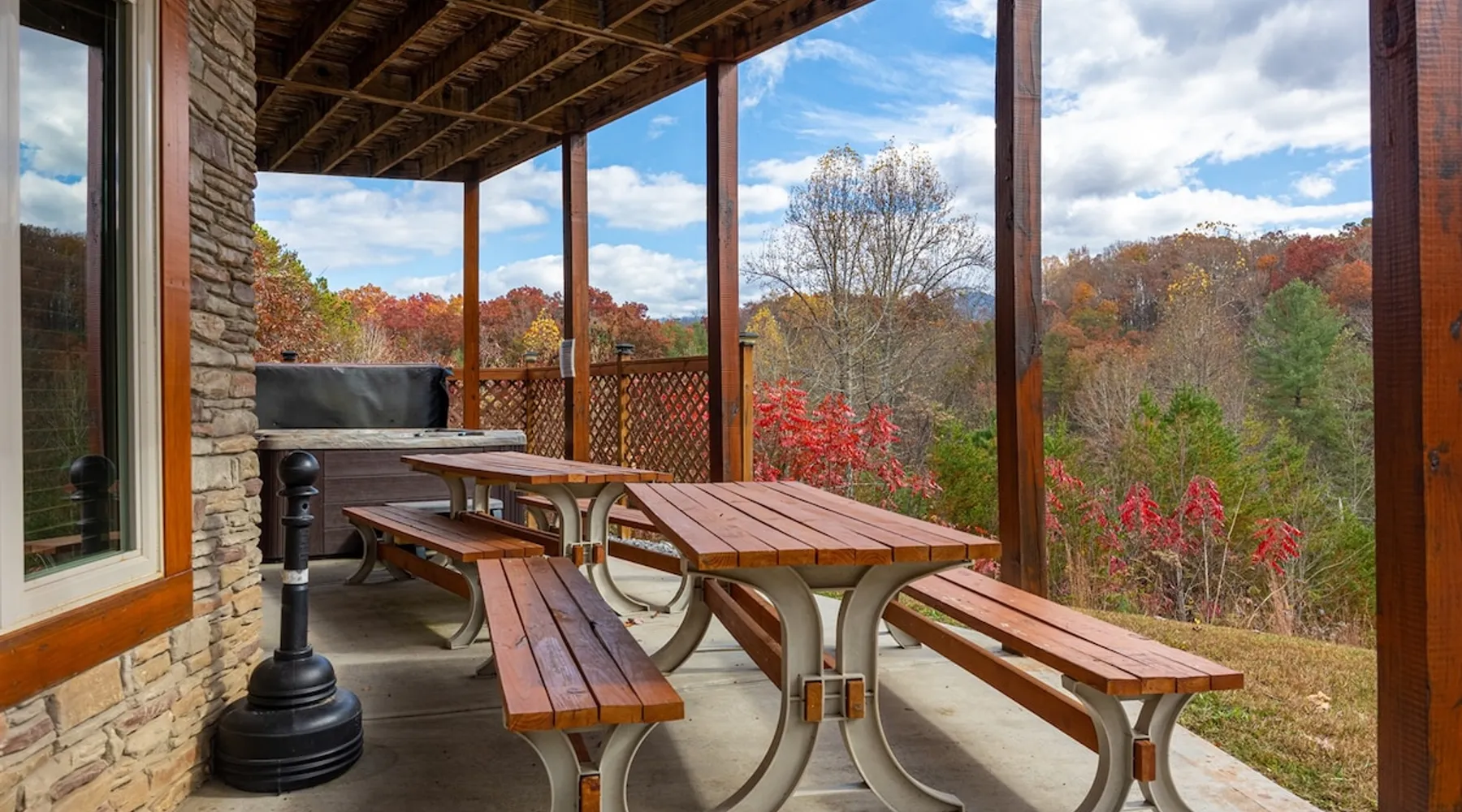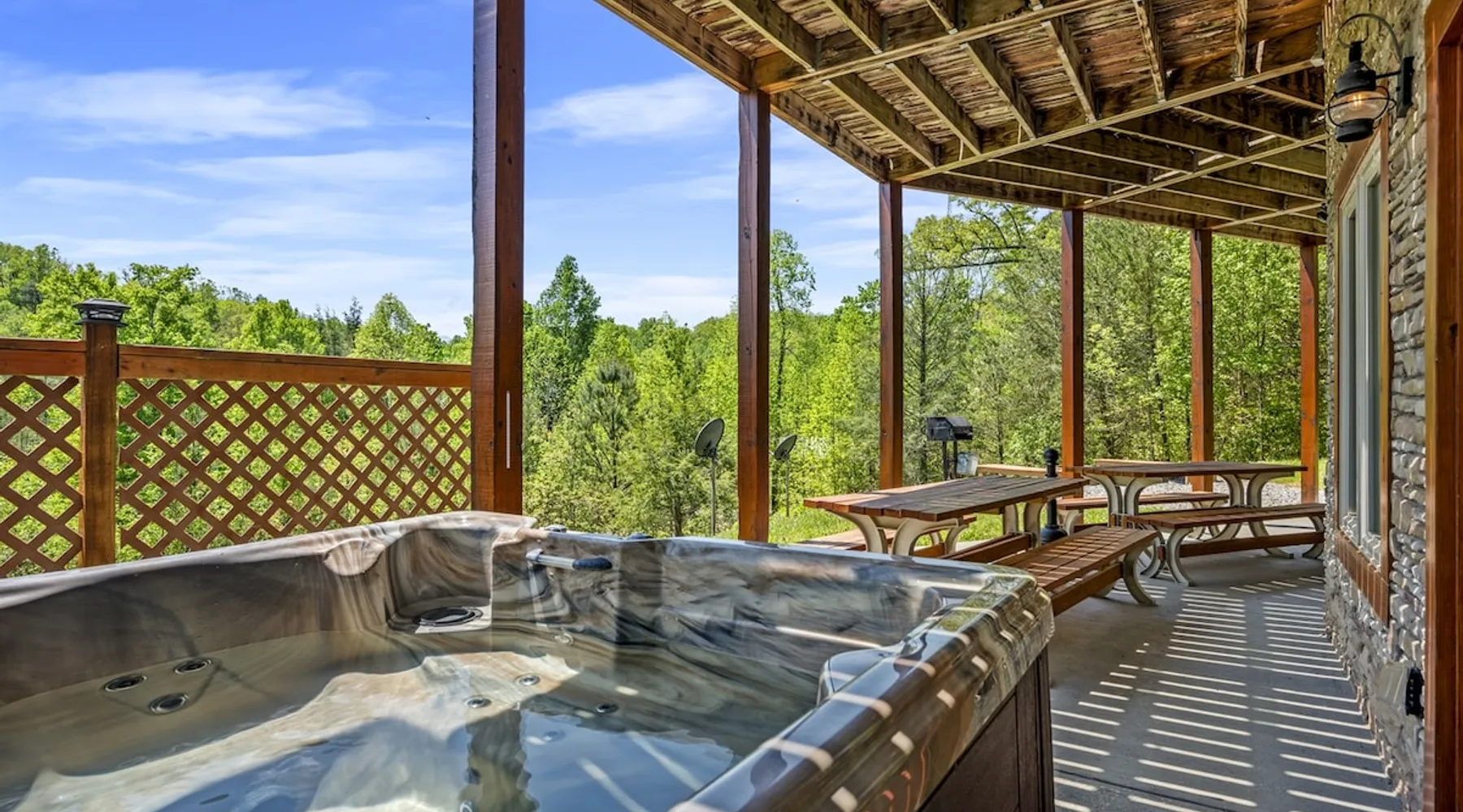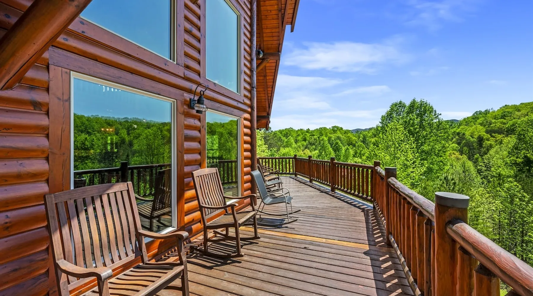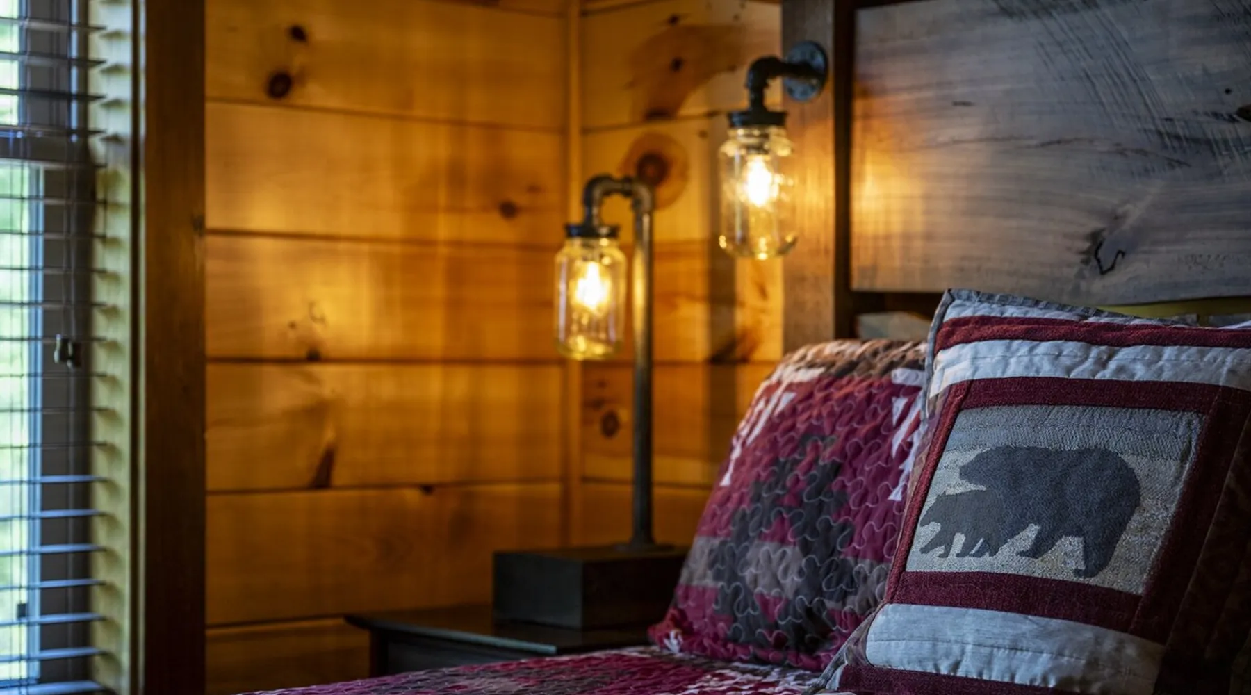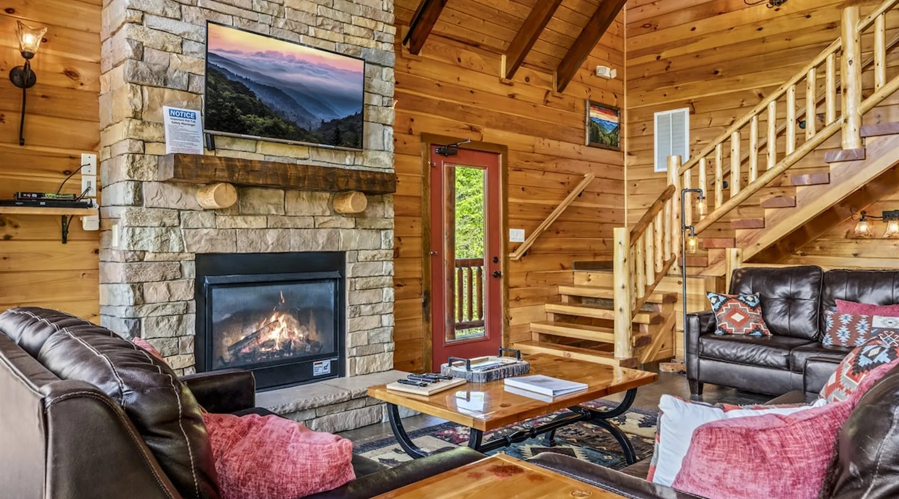 Ridge View Lodge - 3-level log home on 1.5 acres overlooks the ridge, woods & mountains. Floor-to-ceiling windows in the great room maximize the view. Modern kitchen + kitchenette. Open decks with rockers, covered porches, yard/firepit to enjoy nature. Media/Game room with smart TV, Foosball, skee-ball, and arcade. Pool table in loft. 2 fireplaces add a cozy touch (winter). Sleeps up to 16 (12 adults MAX). No parties/events. No indoor smoking. No pets/animals. The space ✔ 1.5-acre semi-private lot with mountain and wooded views ✔ Custom timber frame cabin with vaulted ceilings, exposed trusses ✔ 5 bedrooms, 3.5 bathrooms, sleeps up to 16 ✔ Complimentary WIFI via fiber optic Main Floor ✔ King bedroom with en-suite bathroom (dual vanity, walk-in shower, jetted tub) ✔ Great room with floor-to-ceiling windows, gas log fireplace, and UHD TV ✔ Modern kitchen with granite countertops, stainless steel appliances, a 4-seat island, and tall cabinetry ✔ Farm-style dining table with benches, seating 12 ✔ Expansive open deck with Mt. LeConte and wooded ridge views ✔ Covered side porches ✔ Triple-zone central heat/air and heated bathroom floors (winter) Upper Level ✔ Loft with pool table and TV ✔ King bedroom with access to a full bathroom (dual vanity) ✔ Queen bedroom with additional twin daybed ✔ TVs in all bedrooms Lower Level ✔ Queen bedroom with additional twin daybed ✔ Bunk room with two twin-over-twin bunk beds ✔ Entertainment area with gas log fireplace, 70" UHD TV, foosball, skee-ball game, classic arcade, and ample seating ✔ Kitchenette with full-size refrigerator, sink, microwave, and coffee maker Outdoors ✔ Walkout patio with 6-person hot tub ✔ Yard with games ✔ Fire pit with seating ✔ Plentiful paved and gravel parking for up to 6 cars ✔ Charcoal grill and picnic tables If you are looking for a spacious, unique, out-of-the-ordinary luxury mountain cabin in the Smokies, you just found it! Bring family and friends, have a couples retreat, or even a family reunion - this 5-bedroom upscale mountain home is sure to please. Ridge View Lodge was custom-built to offer ample common spaces and plenty of separation so that several families or couples can have privacy yet still share the amenities. Go for a day of hiking, or mountain biking, or, for the more adventurous, try zip-lining at the nearby Climb Works zip-line tours. Come back and soothe your sore muscles in our six-person hot tub. Relax in style on the oversized deck in our comfortable rockers while the kids stay entertained with the pool table, Foosball, and cocktail-style arcade game. Every bedroom is equipped with a TV. Sit out on covered side porches and you will feel like you are in a treehouse because the cabin is set atop the hill with a commanding view of the mountain ridges and wooded surroundings. If stargazing with a glass of wine is your thing, we’ve got a large deck with rockers for that. Sit out on covered side porches and feel like you are in a treehouse because the cabin is set on a hill with a commanding view of the mountain ridges and wooded surroundings. Movies or watching TV are your thing? There are TVs in every room of the house, some with game ports. Love games? We’ve got that too – from the cocktail-style 2-player arcade with all the favorite 80s classic games (Pac-Man and Centipede, anyone?), to the pool table and Foosball, we’ve got you covered! Moms and Dads can relax – youngsters will find plenty to keep them occupied. ★ 𝗠𝗔𝗜𝗡 𝗟𝗘𝗩𝗘𝗟: Soaring timber frame ceilings in the great room are sure to impress. Gather around the huge farm-style dining table handcrafted from rough-sawn cedar and enjoy the mountain ridge views through the wall of windows. The front “prow” of the cabin was designed to maximize the view, and on a clear day, you can see Mt. LeConte at a distance. Comfy leather sofas are great for watching a movie on a UHD TV or just enjoying a conversation or playing a game by the warmth of the fireplace. Open-concept kitchen with tall soft-close cabinetry, granite countertops, stainless steel appliances, and an island clad in reclaimed wood blends modern convenience with a rustic touch. The island seats four and is a great complement to the adjacent dining area that seats 12. Whether you want to cook your feast from scratch or just microwave-and-go, you will find everything you need. The main floor king master features a skip-planed pine log bed with a comfy memory foam mattress and a master closet. The large private bath has a separate shower and a jetted tub. We cannot help but mention the reclaimed wood vanity (handcrafted by owners!) with two vessel sinks and a unique countertop decorated with fall leaves gathered on the property. The rustic barn door to the bathroom adds character and texture. Heated bathroom floors (in the winter) feel oh-so-good! ★ 𝗧𝗢𝗣 𝗟𝗘𝗩𝗘𝗟: In the loft area with picture windows overlooking the mountain ridge, you find a 7’ pool table made by a local craftsman with reclaimed tree trunks. Enjoy a beverage sitting down at a reclaimed wood pub table accented by Mason jar lights, and watch others play... or just gaze through the picture window at the beautiful mountain surroundings. The upper level has a king bedroom that showcases rustic charm with its live-edge cypress headboard, “Ole Smoky Moonshine” mason jar night lights, and barn-style closet door handmade by the owners, and a restored antique dresser. There is also a queen bedroom is furnished with a rustic aspen log bed, a cushy memory foam mattress, plus a twin daybed – a retreat that can accommodate a small family. The top floor bathroom features a walk-in shower and a reclaimed wood double vanity, also lovingly handcrafted by the owners. Heated floors in winter add a touch of welcome warmth. ★ 𝗟𝗢𝗪𝗘𝗥 𝗟𝗘𝗩𝗘𝗟: Family/media room with a 70” 4K UHD TV, 2-player arcade, and Foosba