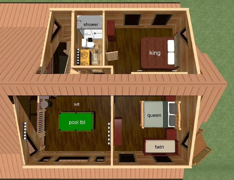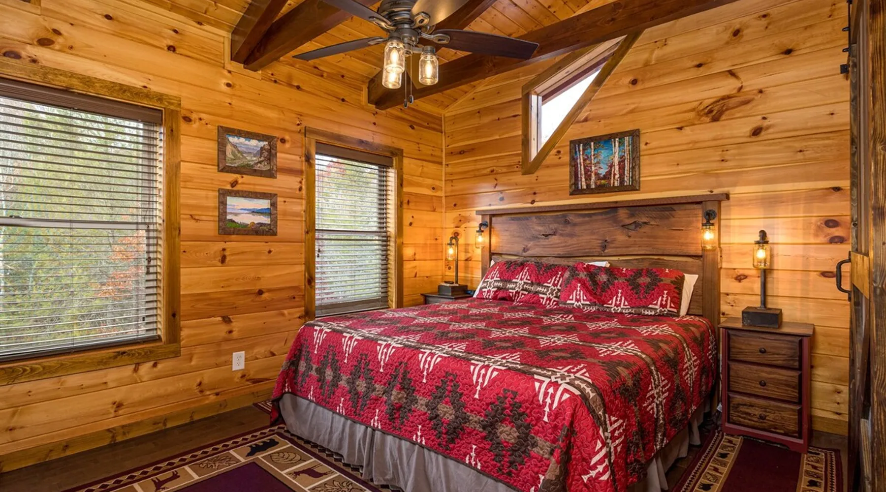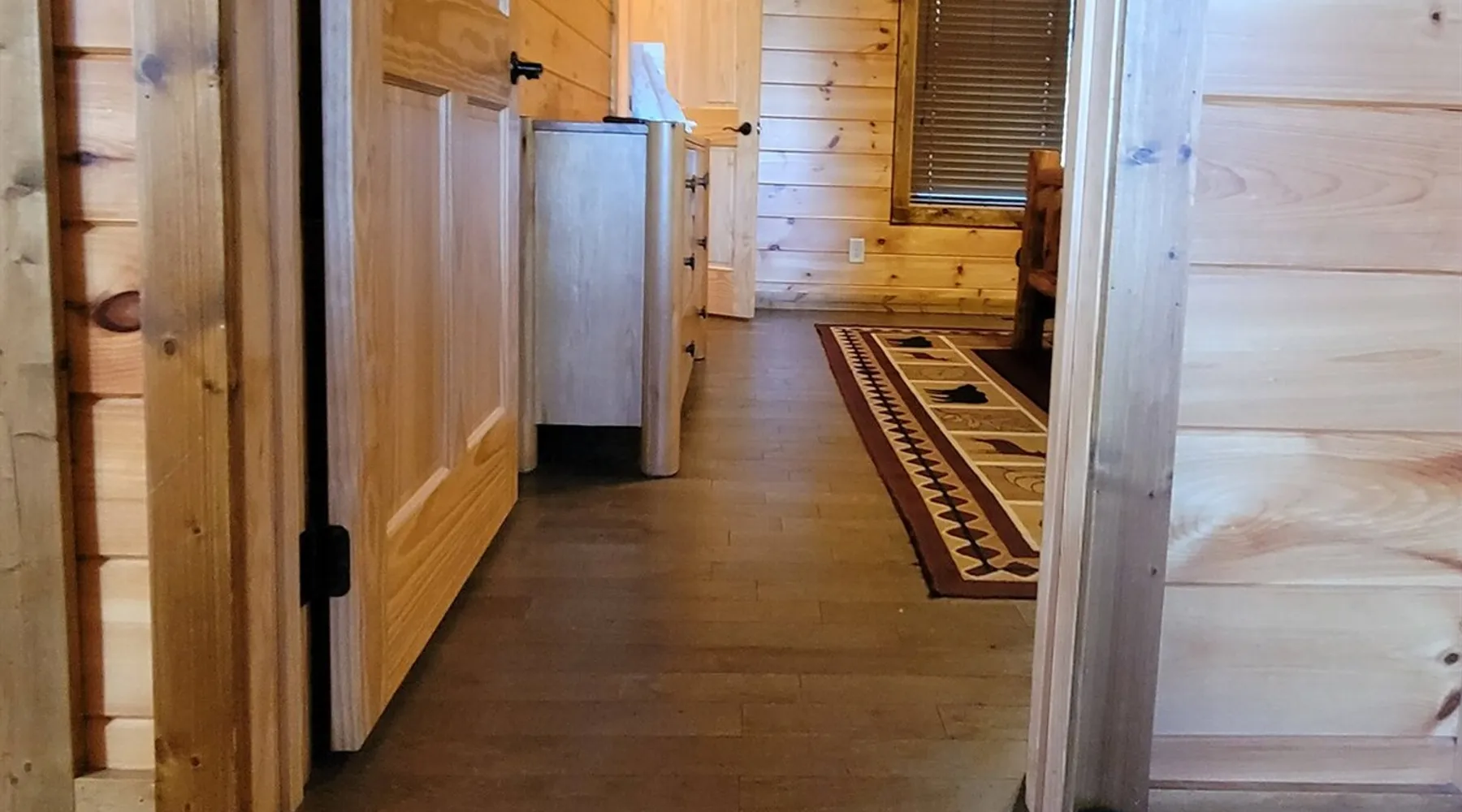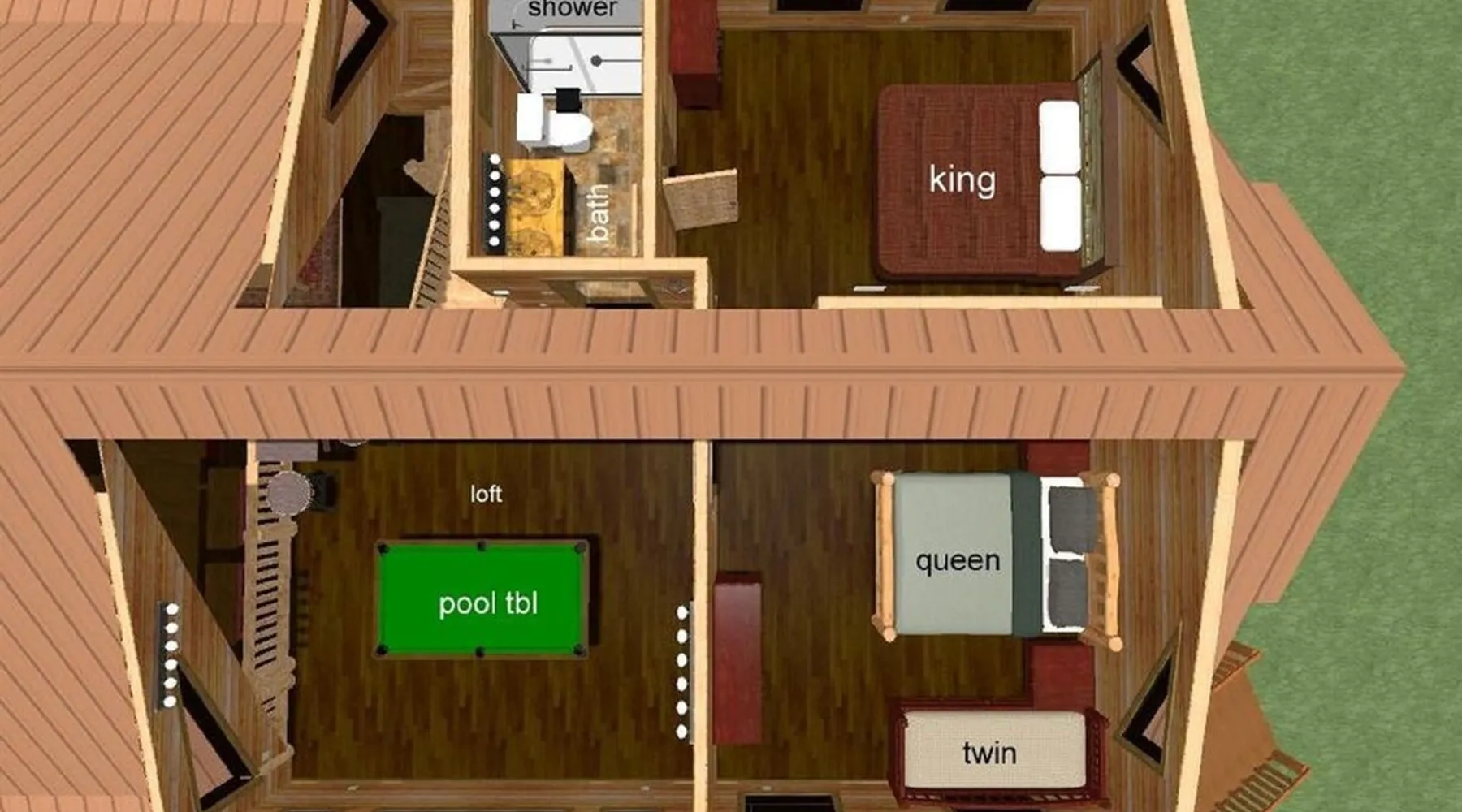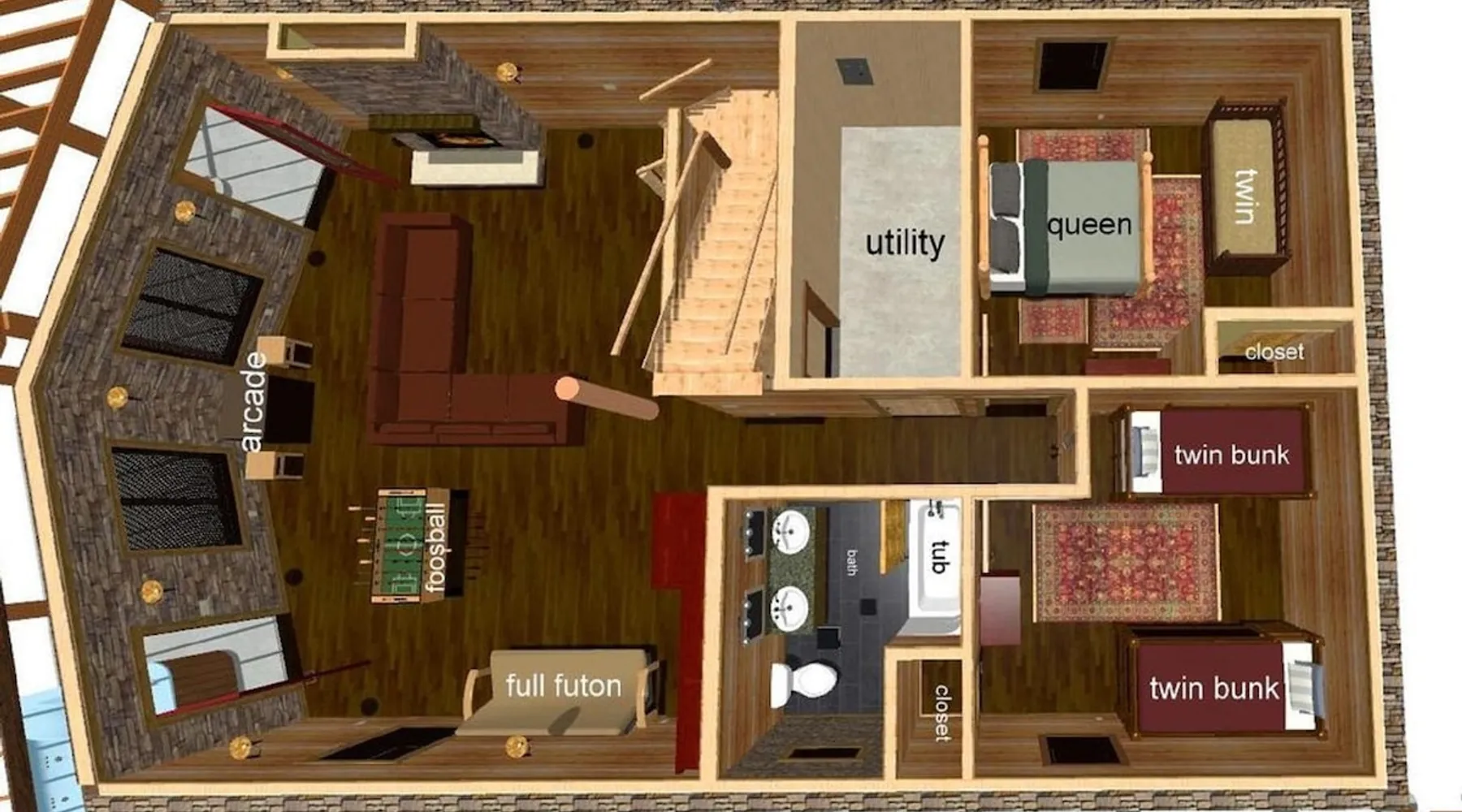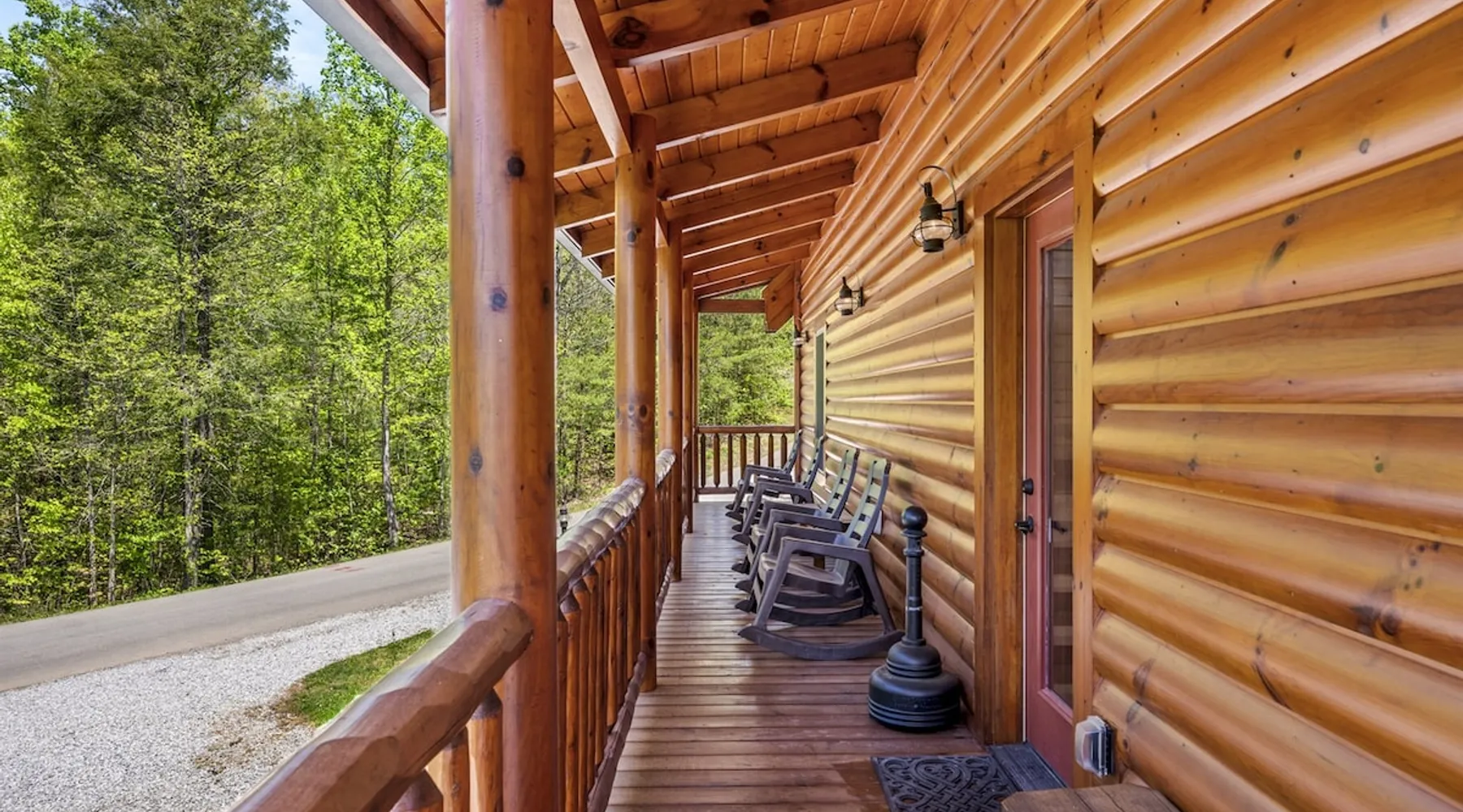 Ridge View Lodge - 3-level log home on 1.5 acres overlooks the ridge, woods & mountains. Floor-to-ceiling windows in the great room maximize the view. Modern kitchen + kitchenette. Open decks with rockers, covered porches, yard/firepit to enjoy nature. Media/Game room with smart TV, Foosball, skee-ball, and arcade. Pool table in loft. 2 fireplaces add a cozy touch (winter). Sleeps up to 16 (12 adults MAX). No parties/events. No indoor smoking. No pets/animals. The space ✔ 1.5-acre semi-private lot with mountain and wooded views ✔ Custom timber frame cabin with vaulted ceilings, exposed trusses ✔ 5 bedrooms, 3.5 bathrooms, sleeps up to 16 ✔ Complimentary WIFI via fiber optic Main Floor ✔ King bedroom with en-suite bathroom (dual vanity, walk-in shower, jetted tub) ✔ Great room with floor-to-ceiling windows, gas log fireplace, and UHD TV ✔ Modern kitchen with granite countertops, stainless steel appliances, a 4-seat island, and tall cabinetry ✔ Farm-style dining table with benches, seating 12 ✔ Expansive open deck with Mt. LeConte and wooded ridge views ✔ Covered side porches ✔ Triple-zone central heat/air and heated bathroom floors (winter) Upper Level ✔ Loft with pool table and TV ✔ King bedroom with access to a full bathroom (dual vanity) ✔ Queen bedroom with additional twin daybed ✔ TVs in all bedrooms Lower Level ✔ Queen bedroom with additional twin daybed ✔ Bunk room with two twin-over-twin bunk beds ✔ Entertainment area with gas log fireplace, 70" UHD TV, foosball, skee-ball game, classic arcade, and ample seating ✔ Kitchenette with full-size refrigerator, sink, microwave, and coffee maker Outdoors ✔ Walkout patio with 6-person hot tub ✔ Yard with games ✔ Fire pit with seating ✔ Plentiful paved and gravel parking for up to 6 cars ✔ Charcoal grill and picnic tables If you are looking for a spacious, unique, out-of-the-ordinary luxury mountain cabin in the Smokies, you just found it! Bring family and friends, have a couples retreat, or even a family reunion - this 5-bedroom upscale mountain home is sure to please. Ridge View Lodge was custom-built to offer ample common spaces and plenty of separation so that several families or couples can have privacy yet still share the amenities. Go for a day of hiking, or mountain biking, or, for the more adventurous, try zip-lining at the nearby Climb Works zip-line tours. Come back and soothe your sore muscles in our six-person hot tub. Relax in style on the oversized deck in our comfortable rockers while the kids stay entertained with the pool table, Foosball, and cocktail-style arcade game. Every bedroom is equipped with a TV. Sit out on covered side porches and you will feel like you are in a treehouse because the cabin is set atop the hill with a commanding view of the mountain ridges and wooded surroundings. If stargazing with a glass of wine is your thing, we’ve got a large deck with rockers for that. Sit out on covered side porches and feel like you are in a treehouse because the cabin is set on a hill with a commanding view of the mountain ridges and wooded surroundings. Movies or watching TV are your thing? There are TVs in every room of the house, some with game ports. Love games? We’ve got that too – from the cocktail-style 2-player arcade with all the favorite 80s classic games (Pac-Man and Centipede, anyone?), to the pool table and Foosball, we’ve got you covered! Moms and Dads can relax – youngsters will find plenty to keep them occupied. ★ 𝗠𝗔𝗜𝗡 𝗟𝗘𝗩𝗘𝗟: Soaring timber frame ceilings in the great room are sure to impress. Gather around the huge farm-style dining table handcrafted from rough-sawn cedar and enjoy the mountain ridge views through the wall of windows. The front “prow” of the cabin was designed to maximize the view, and on a clear day, you can see Mt. LeConte at a distance. Comfy leather sofas are great for watching a movie on a UHD TV or just enjoying a conversation or playing a game by the warmth of the fireplace. Open-concept kitchen with tall soft-close cabinetry, granite countertops, stainless steel appliances, and an island clad in reclaimed wood blends modern convenience with a rustic touch. The island seats four and is a great complement to the adjacent dining area that seats 12. Whether you want to cook your feast from scratch or just microwave-and-go, you will find everything you need. The main floor king master features a skip-planed pine log bed with a comfy memory foam mattress and a master closet. The large private bath has a separate shower and a jetted tub. We cannot help but mention the reclaimed wood vanity (handcrafted by owners!) with two vessel sinks and a unique countertop decorated with fall leaves gathered on the property. The rustic barn door to the bathroom adds character and texture. Heated bathroom floors (in the winter) feel oh-so-good! ★ 𝗧𝗢𝗣 𝗟𝗘𝗩𝗘𝗟: In the loft area with picture windows overlooking the mountain ridge, you find a 7’ pool table made by a local craftsman with reclaimed tree trunks. Enjoy a beverage sitting down at a reclaimed wood pub table accented by Mason jar lights, and watch others play... or just gaze through the picture window at the beautiful mountain surroundings. The upper level has a king bedroom that showcases rustic charm with its live-edge cypress headboard, “Ole Smoky Moonshine” mason jar night lights, and barn-style closet door handmade by the owners, and a restored antique dresser. There is also a queen bedroom is furnished with a rustic aspen log bed, a cushy memory foam mattress, plus a twin daybed – a retreat that can accommodate a small family. The top floor bathroom features a walk-in shower and a reclaimed wood double vanity, also lovingly handcrafted by the owners. Heated floors in winter add a touch of welcome warmth. ★ 𝗟𝗢𝗪𝗘𝗥 𝗟𝗘𝗩𝗘𝗟: Family/media room with a 70” 4K UHD TV, 2-player arcade, and Foosba