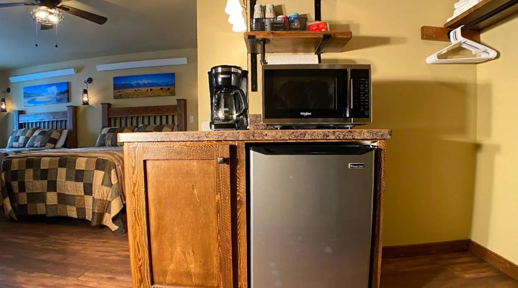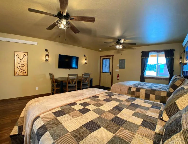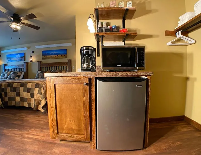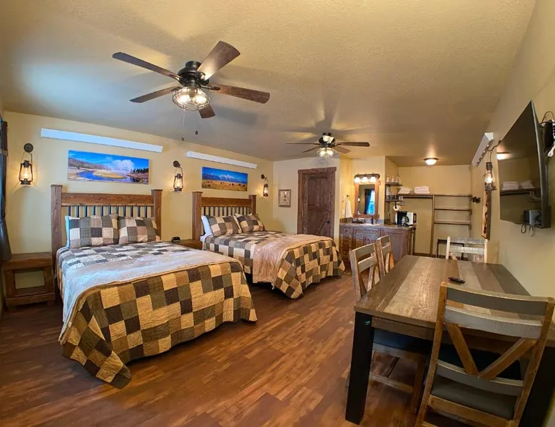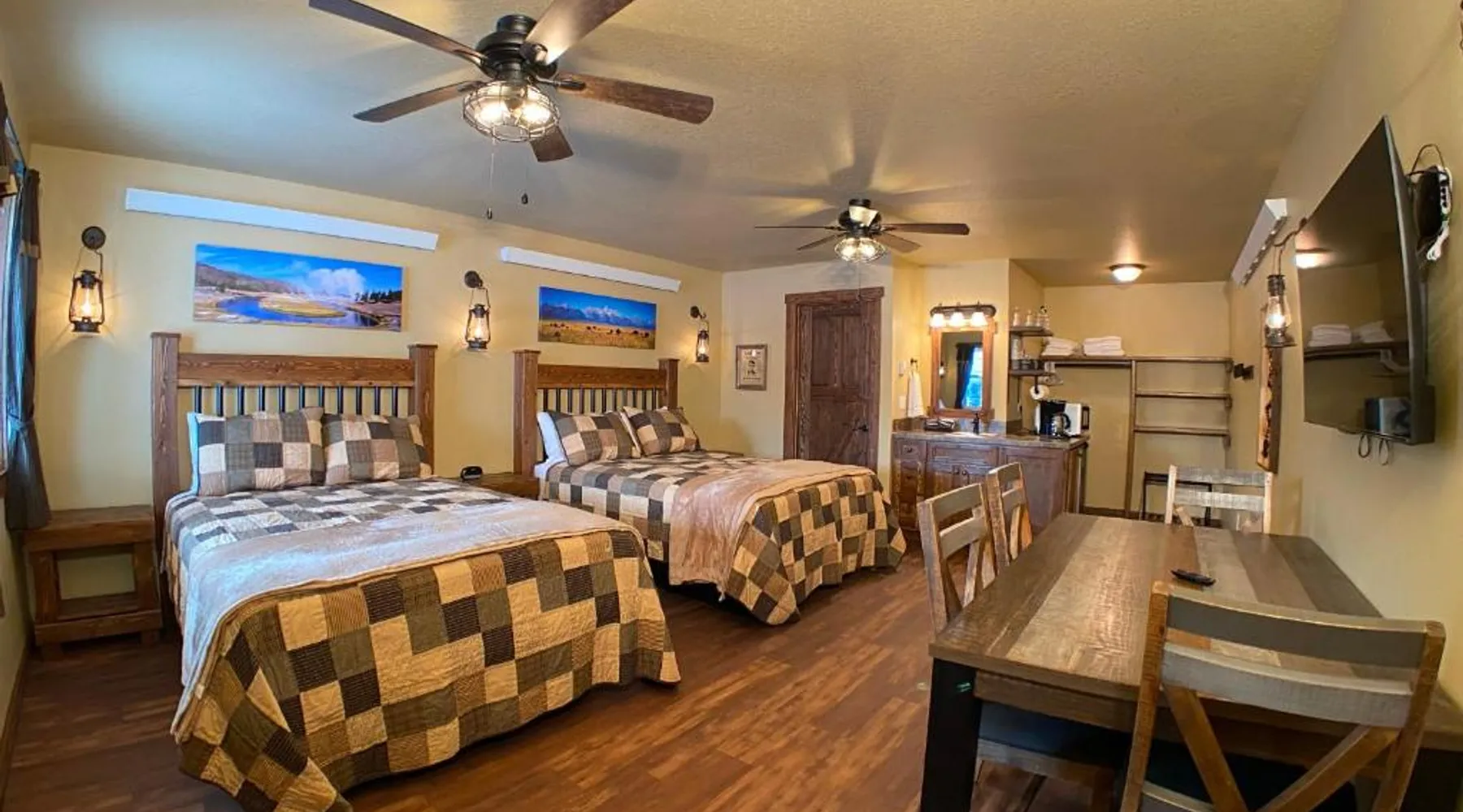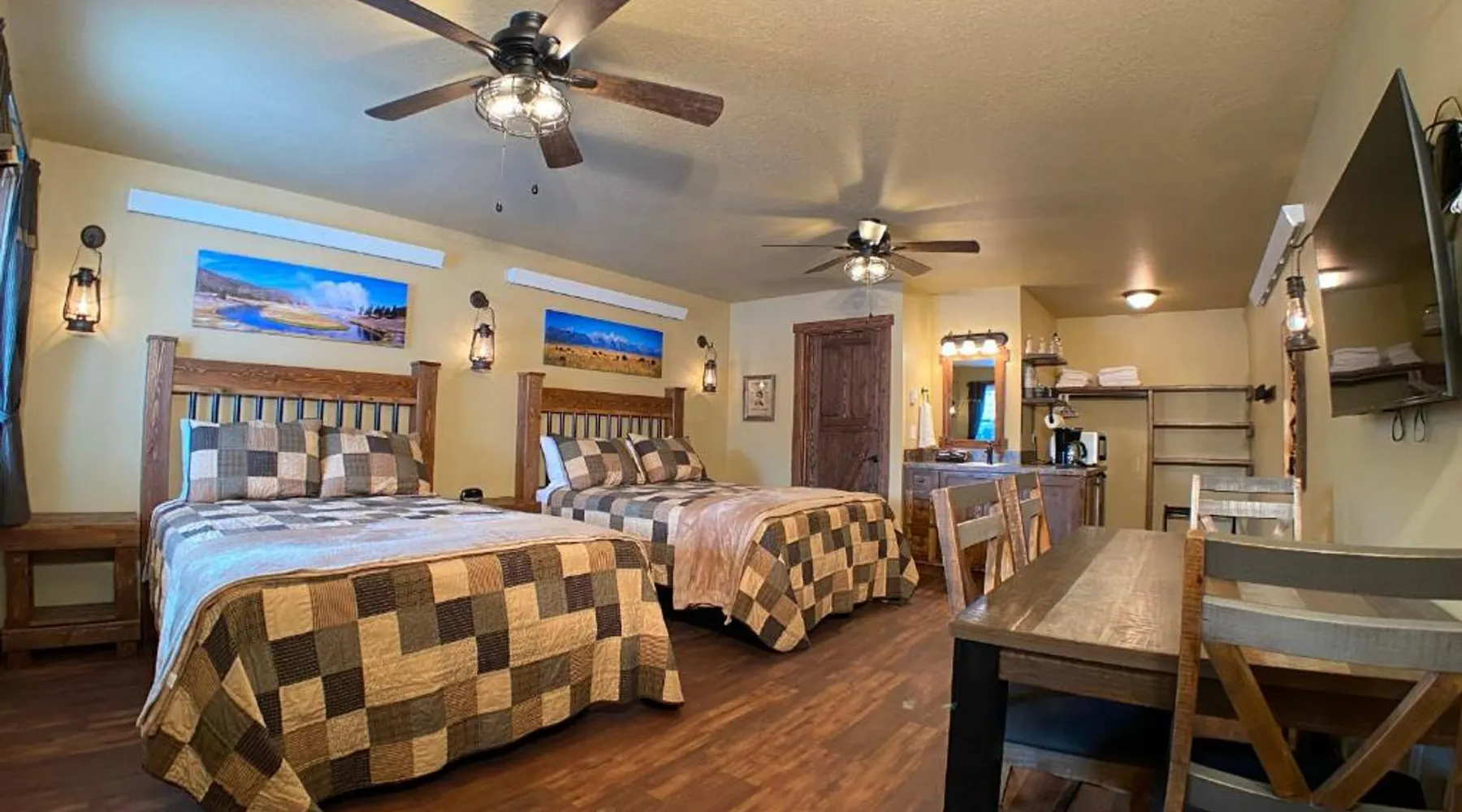 Comfortable Accommodations: Old West Escapes in Island Park offers a holiday home with family rooms. Guests enjoy a private bathroom, kitchenette, and free WiFi. Outdoor Amenities: The property features a garden and outdoor furniture, ideal for relaxation. Mountain views enhance the stay. Convenient Facilities: Free on-site private parking is available. Additional amenities include a washing machine, dishwasher, and TV. Nearby Attractions: Yellowstone National Park is 20 mi away. Other points of interest include the National Geographic Imax Theater and Yellowstone Historic Center Museum, each 22 mi from the property. Featuring a private entrance, this holiday home is consisted of of 1 living room, 1 separate bedroom and 1 bathroom with a bath and a hairdryer. Guests can make meals in the kitchen that is fitted with a stovetop, a refrigerator, a dishwasher and kitchenware. The holiday home offers a washing machine, a tea and coffee maker, a dining area, a flat-screen TV, as well as mountain views. The unit offers 2 beds.