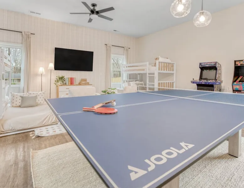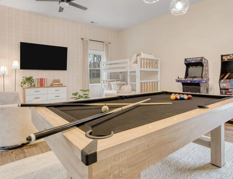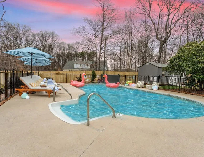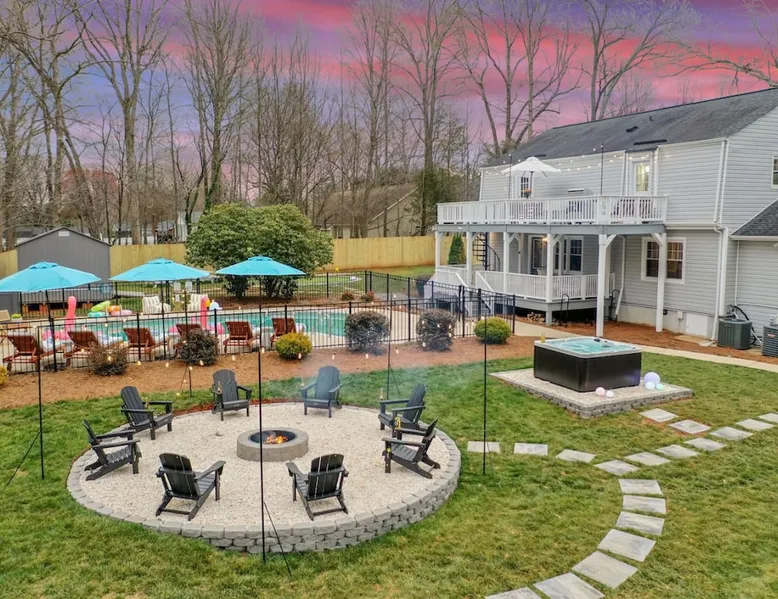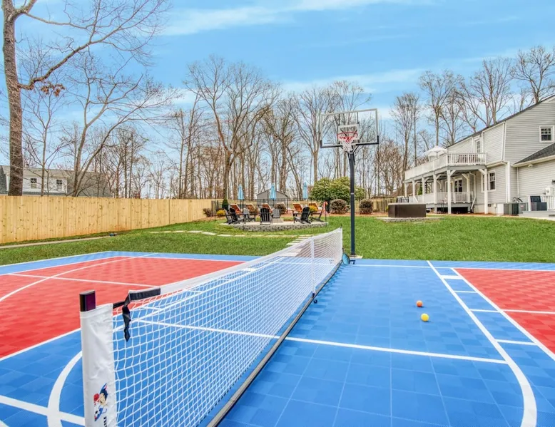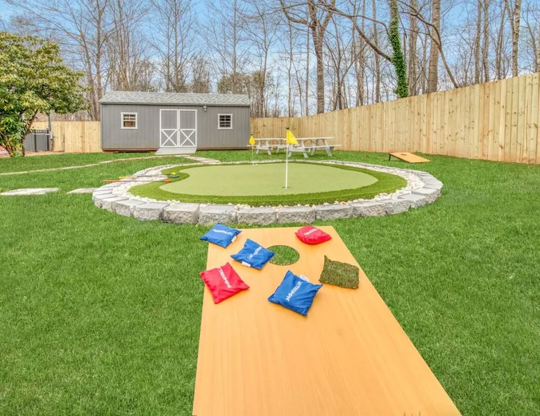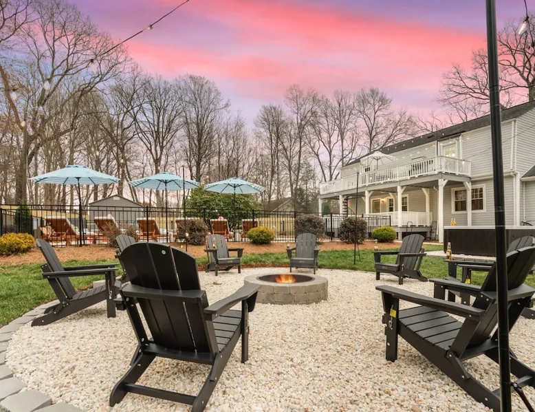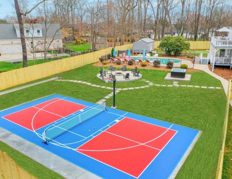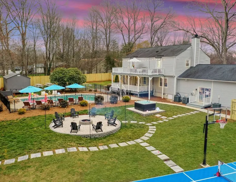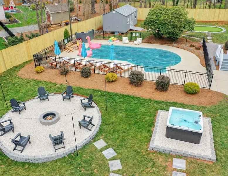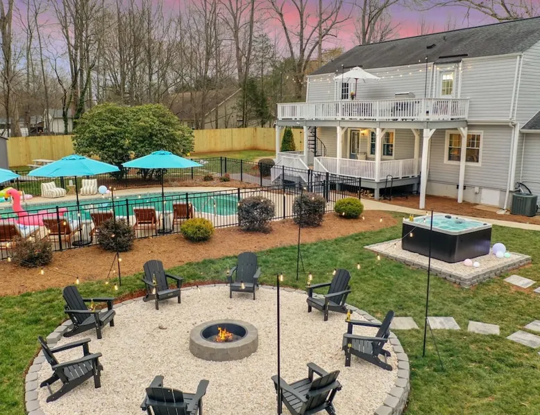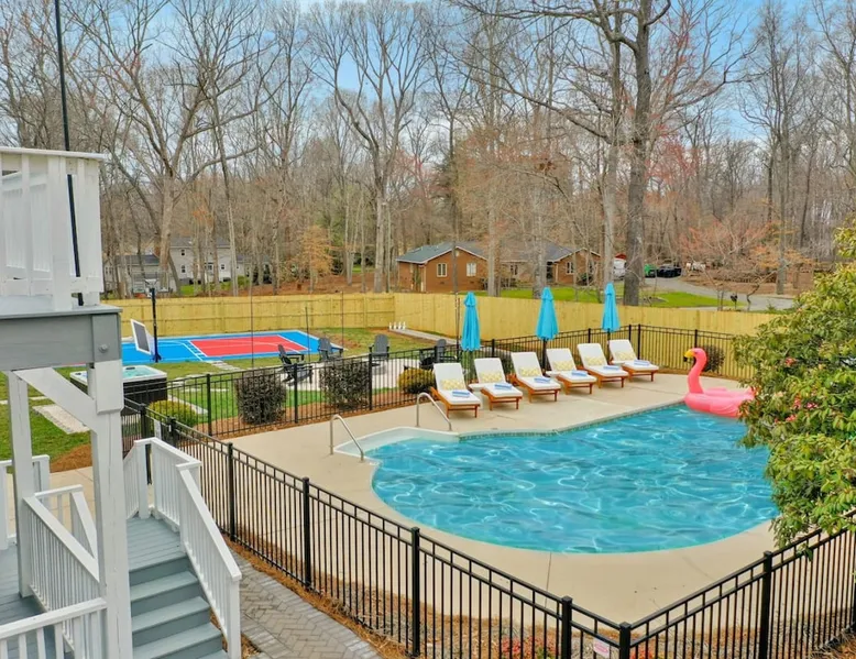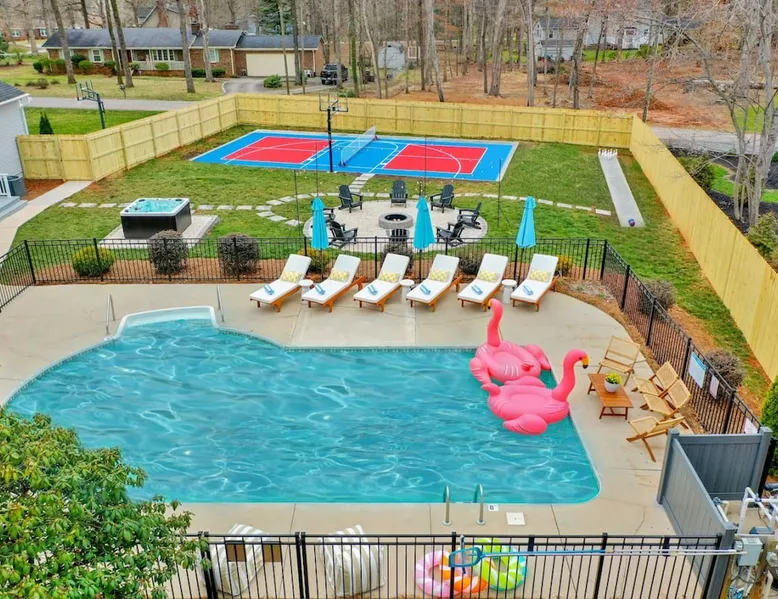 LUXURY! Vacation dream with our luxurious oasis for families! Boasting unique amenities like golf putting greens hot tub balcony deck pickleball court two basketball goals and outdoor bowling alley this home is a paradise for leisure and sports enthusiasts alike. Accommodate 10 adults and 6 kids with 11 beds. n n18 min to NCAA & ACC Tournaments' Greensboro Coliseum n18 min to PGA Tour Sedgefield Country Club Golf Course n28 min to High Point Furniture Market n nDiscover Unmatched Luxury Here! The space **NO PARTIES, GATHERINGS, OR EVENTS** *NO CHIPPING GOLF BALLS* *NO OUTDOOR MUSIC* ☆☆ PLEASE READ HOUSE RULES BEFORE BOOKING IN THE HOUSE RULES SECTION (NOT HERE)☆☆ KEY FEATURES: ☀ 5 beautiful bedrooms; 1 king, 2 queen, 2 full beds, & 6 twin beds (2 twin-over-twin bunk beds with trundle beds) ☀ 3.5 bathrooms, including a master ensuite ☀ Modern kitchen with new, stainless steel appliances ☀ Open living room with lots of comfy seating & smart TVs ☀ Dining within kitchen room seating to comfortably accommodate 10 (plus countertop seating & outdoor dining) ☀ STUNNING backyard with TONS of amenities; golf putting greens, pickleball court, outdoor bowling alley, pool, hot tub, fire pit, pool table, ping pong, BBQ grill, corn hole, & more! Here Are A Few Kind Words From Our Past Guests: "Absolutely loved our stay! Waking up to the serene glow of sunlight filtering in made each morning memorable. There are so many amenities that it was like an amusement park! Looking forward to our next stay!" - Olivia "Jordan was an outstanding host, offering prompt replies and helpful tips. The property itself is stunning, melding comfort with style, all while being conveniently near downtown Greensboro. Highly recommend for a memorable stay." - Sophia "I was charmed by this place from the moment we arrived, finding it exactly as depicted! Impeccably clean with a host that sets the bar for excellence. It's a definite must-return for me!" - Ava **NO PARTIES, GATHERINGS, OR EVENTS** *NO CHIPPING GOLF BALLS* *NO OUTDOOR MUSIC* ☆☆ PLEASE READ HOUSE RULES BEFORE BOOKING IN THE HOUSE RULES SECTION (NOT HERE)☆☆ Guest access ☆☆ BEDROOMS ☆☆ In this home, you'll find five bedrooms. The master bedroom is on the upper level, with two full beds, smart TV, and private ensuite bathroom. Right across the hall are four more bedrooms, with a king, queen, queen, and full bed accordingly. On the main level, there are two bedrooms located right off the kitchen & the rest of the entertainment area. Between the two bedrooms share a full bathroom. On the lower level den, there is an additional bedroom. This room has a pool table, ping pong table conversion kit, and arcade games. Plus it is filled with two twin-over-twin bunk beds and two trundle beds (total of 6 beds), swivel chairs, and lots of games, including board games! ☆☆ BATHROOMS ☆☆ There are three bathrooms spread out across this home, all of which have been completely renovated. The master ensuite has two sinks, a toilet, and shower only with a seat inside. The hallway bathroom right off of the other four second floor bedrooms is equipped with a sink, a toilet, and a shower/tub combo. On the lower level den, there is a full bathroom right off of the main entertaining area with a sink, toilet, and shower/tub combo. On the main floor, there is a half bath connected to the kitchen room. ☆☆ KITCHEN & DINING ☆☆ The modern, open kitchen is located right off of the main living areas, and is loaded with all new stainless steel appliances & a coffee station (including a Keurig & coffee pods). Bright, open, and beautifully designed, this is a chef's kitchen made for entertaining! The dining room is right next to the kitchen, with enough seating to comfortably fit 6 people (plus additional seating in the kitchen for 4 more) with lots of natural light, looking over all the amazing amenities in the backyard, just steps away! ☆☆ LIVING ROOM ☆☆ The main living room is on the main level, attached to the kitchen & dining areas. Lots of comfy seating on an oversized sectional, a large smart TV, and a separate seating area tucked away next to the main living area, with some additional seating & tabletop games to enjoy! ☆☆ OUTDOOR SPACE ☆☆ The main attraction of this home - WOW! This yard is HUGE and has everything you and your family/friends could ask for: ☀ Pool (unavailable September-May) ☀ Hot tub ☀ Golf Putting Greens ☀ Pickleball Court ☀ Basketball Court ☀ Fire pit (wood-burning) ☀ Corn Hole ☀ Sunbathing chairs ☀ Outdoor lounge seating ☀ Outdoor dining tables ☀ BBQ grill There is so much to do here, that all of your friends & family will be thoroughly entertained throughout your entire stay. No matter the season, this resort-style backyard has it all. Book your stay with us today and you will NOT be disappointed. Get ready for a vacation you will never forget! ★☆ Book Now & Let Us Take Care Of You In Greensboro! ☆★ Other things to note ☆☆ PLEASE READ HOUSE RULES BEFORE BOOKING IN THE HOUSE RULES SECTION (NOT HERE)☆☆ **NO PARTIES, GATHERINGS, OR EVENTS** Local Property Manager: Blake This property includes security features, such as Schlage smart locks and Ring floodlight cameras, and noise decibel detectors for your safety and peace of mind. We are pet-friendly! Pet Fee is $150, max of 2, under 50 lbs each. Pool is not heated. Although it remains uncovered throughout the year, the pool is not available for use from September to May; however, the hot tub will be operational during those months. We'd like to set your expectations that the pool temperature will continue to be determined by the weather temperature, as this is a major contributing factor. PARKING: - ALL cars must park in the driveway which has a maximum of FOUR (4) cars - Do NOT park on the street in from our direct neighbors. The neighbors will TOW you. - Do NOT park on the street directly in front of the driveway **NO PAR