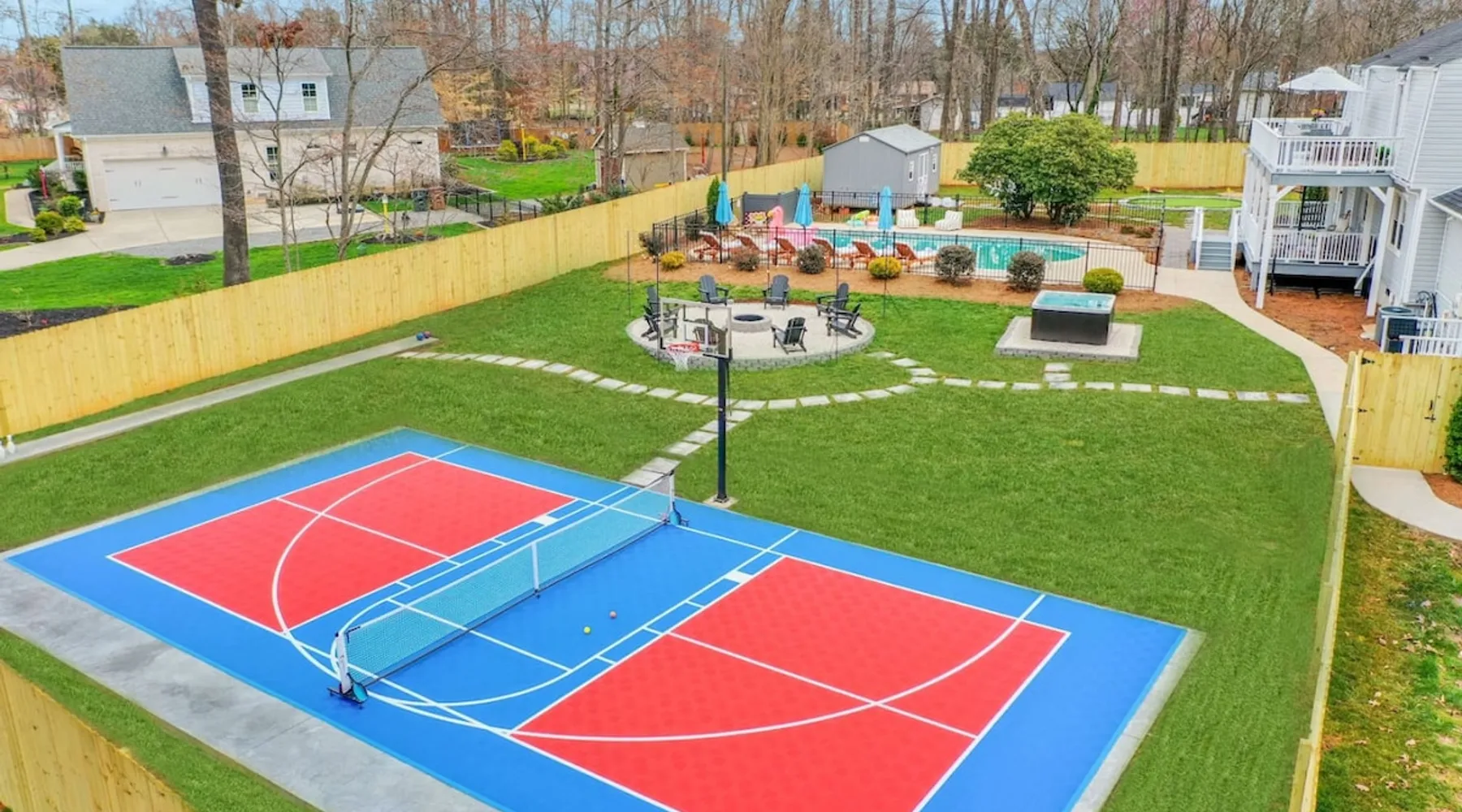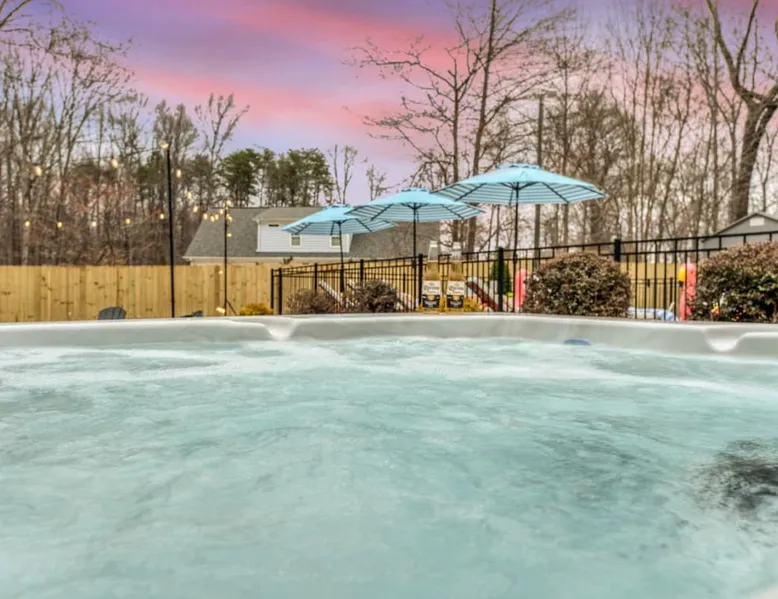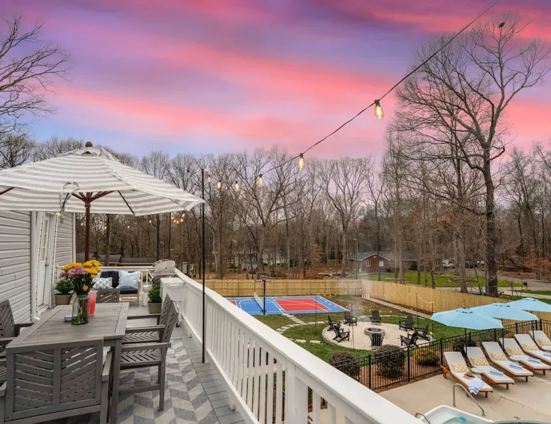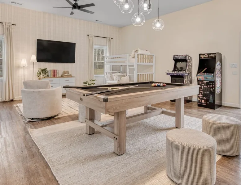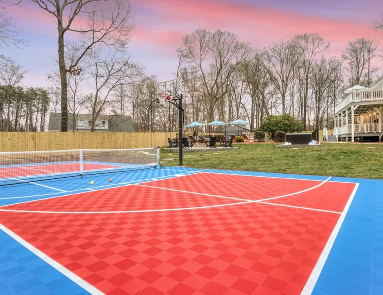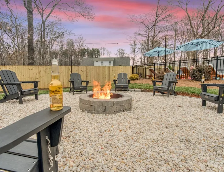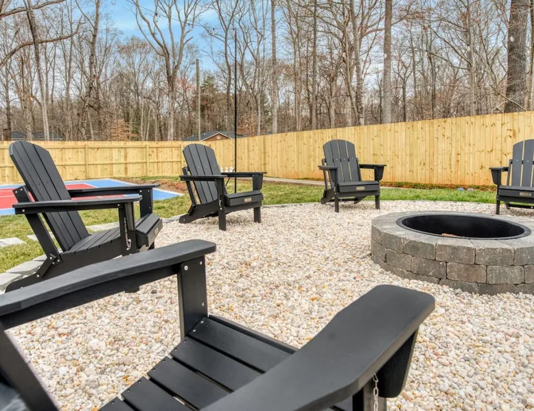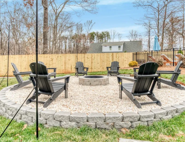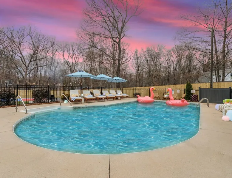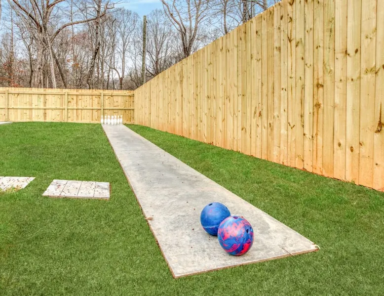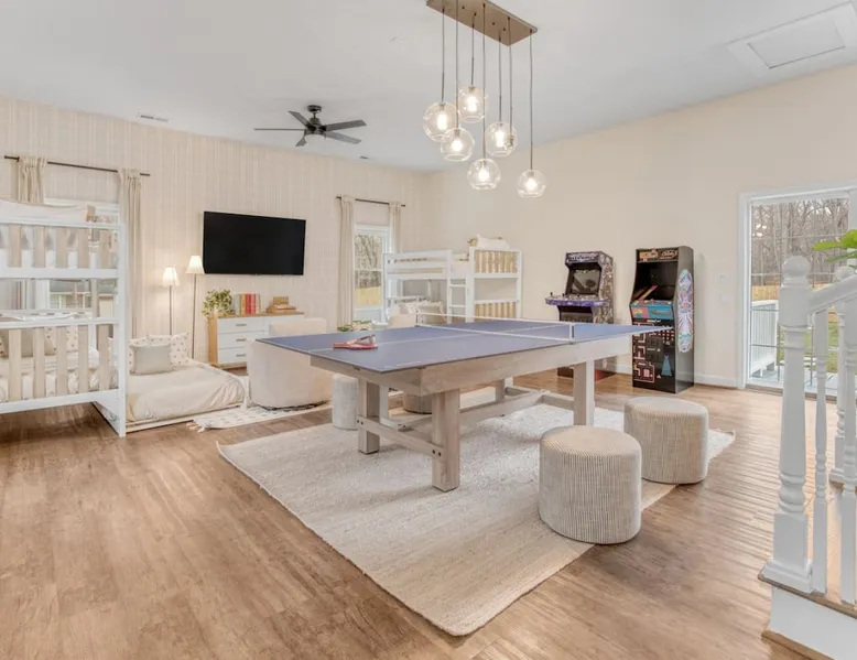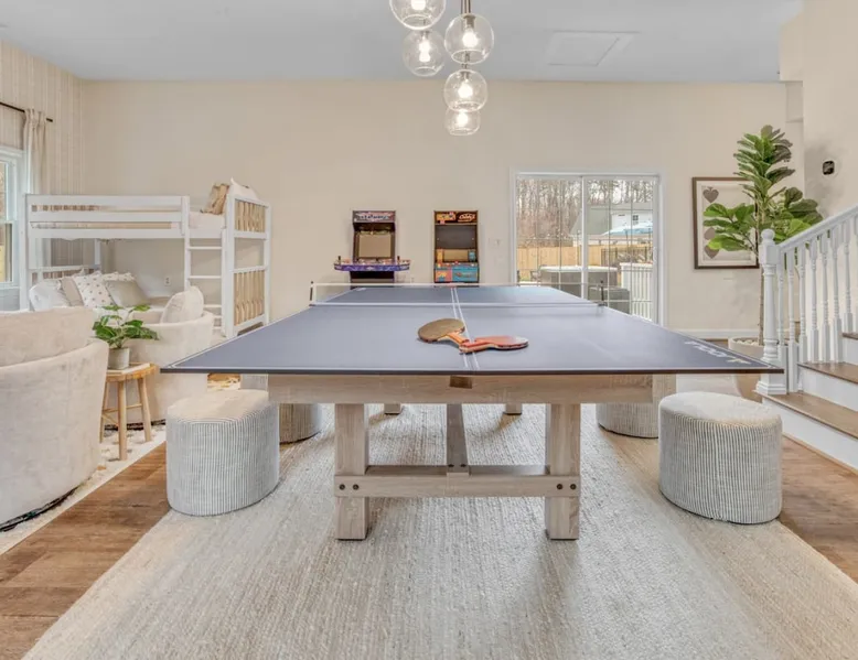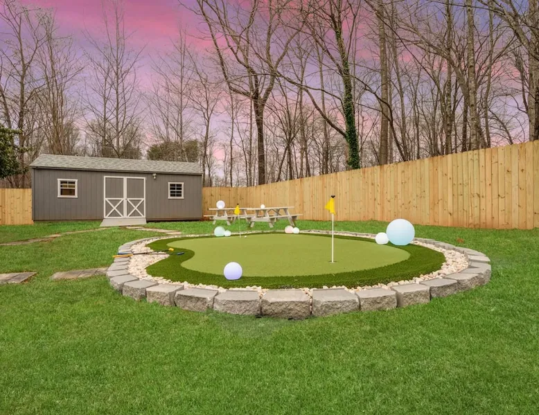 LUXURY! Vacation dream with our luxurious oasis for families! Boasting unique amenities like golf putting greens hot tub balcony deck pickleball court two basketball goals and outdoor bowling alley this home is a paradise for leisure and sports enthusiasts alike. Accommodate 10 adults and 6 kids with 11 beds. n n18 min to NCAA & ACC Tournaments' Greensboro Coliseum n18 min to PGA Tour Sedgefield Country Club Golf Course n28 min to High Point Furniture Market n nDiscover Unmatched Luxury Here! The space **NO PARTIES, GATHERINGS, OR EVENTS** *NO CHIPPING GOLF BALLS* *NO OUTDOOR MUSIC* ☆☆ PLEASE READ HOUSE RULES BEFORE BOOKING IN THE HOUSE RULES SECTION (NOT HERE)☆☆ KEY FEATURES: ☀ 5 beautiful bedrooms; 1 king, 2 queen, 2 full beds, & 6 twin beds (2 twin-over-twin bunk beds with trundle beds) ☀ 3.5 bathrooms, including a master ensuite ☀ Modern kitchen with new, stainless steel appliances ☀ Open living room with lots of comfy seating & smart TVs ☀ Dining within kitchen room seating to comfortably accommodate 10 (plus countertop seating & outdoor dining) ☀ STUNNING backyard with TONS of amenities; golf putting greens, pickleball court, outdoor bowling alley, pool, hot tub, fire pit, pool table, ping pong, BBQ grill, corn hole, & more! Here Are A Few Kind Words From Our Past Guests: "Absolutely loved our stay! Waking up to the serene glow of sunlight filtering in made each morning memorable. There are so many amenities that it was like an amusement park! Looking forward to our next stay!" - Olivia "Jordan was an outstanding host, offering prompt replies and helpful tips. The property itself is stunning, melding comfort with style, all while being conveniently near downtown Greensboro. Highly recommend for a memorable stay." - Sophia "I was charmed by this place from the moment we arrived, finding it exactly as depicted! Impeccably clean with a host that sets the bar for excellence. It's a definite must-return for me!" - Ava **NO PARTIES, GATHERINGS, OR EVENTS** *NO CHIPPING GOLF BALLS* *NO OUTDOOR MUSIC* ☆☆ PLEASE READ HOUSE RULES BEFORE BOOKING IN THE HOUSE RULES SECTION (NOT HERE)☆☆ Guest access ☆☆ BEDROOMS ☆☆ In this home, you'll find five bedrooms. The master bedroom is on the upper level, with two full beds, smart TV, and private ensuite bathroom. Right across the hall are four more bedrooms, with a king, queen, queen, and full bed accordingly. On the main level, there are two bedrooms located right off the kitchen & the rest of the entertainment area. Between the two bedrooms share a full bathroom. On the lower level den, there is an additional bedroom. This room has a pool table, ping pong table conversion kit, and arcade games. Plus it is filled with two twin-over-twin bunk beds and two trundle beds (total of 6 beds), swivel chairs, and lots of games, including board games! ☆☆ BATHROOMS ☆☆ There are three bathrooms spread out across this home, all of which have been completely renovated. The master ensuite has two sinks, a toilet, and shower only with a seat inside. The hallway bathroom right off of the other four second floor bedrooms is equipped with a sink, a toilet, and a shower/tub combo. On the lower level den, there is a full bathroom right off of the main entertaining area with a sink, toilet, and shower/tub combo. On the main floor, there is a half bath connected to the kitchen room. ☆☆ KITCHEN & DINING ☆☆ The modern, open kitchen is located right off of the main living areas, and is loaded with all new stainless steel appliances & a coffee station (including a Keurig & coffee pods). Bright, open, and beautifully designed, this is a chef's kitchen made for entertaining! The dining room is right next to the kitchen, with enough seating to comfortably fit 6 people (plus additional seating in the kitchen for 4 more) with lots of natural light, looking over all the amazing amenities in the backyard, just steps away! ☆☆ LIVING ROOM ☆☆ The main living room is on the main level, attached to the kitchen & dining areas. Lots of comfy seating on an oversized sectional, a large smart TV, and a separate seating area tucked away next to the main living area, with some additional seating & tabletop games to enjoy! ☆☆ OUTDOOR SPACE ☆☆ The main attraction of this home - WOW! This yard is HUGE and has everything you and your family/friends could ask for: ☀ Pool (unavailable September-May) ☀ Hot tub ☀ Golf Putting Greens ☀ Pickleball Court ☀ Basketball Court ☀ Fire pit (wood-burning) ☀ Corn Hole ☀ Sunbathing chairs ☀ Outdoor lounge seating ☀ Outdoor dining tables ☀ BBQ grill There is so much to do here, that all of your friends & family will be thoroughly entertained throughout your entire stay. No matter the season, this resort-style backyard has it all. Book your stay with us today and you will NOT be disappointed. Get ready for a vacation you will never forget! ★☆ Book Now & Let Us Take Care Of You In Greensboro! ☆★ Other things to note ☆☆ PLEASE READ HOUSE RULES BEFORE BOOKING IN THE HOUSE RULES SECTION (NOT HERE)☆☆ **NO PARTIES, GATHERINGS, OR EVENTS** Local Property Manager: Blake This property includes security features, such as Schlage smart locks and Ring floodlight cameras, and noise decibel detectors for your safety and peace of mind. We are pet-friendly! Pet Fee is $150, max of 2, under 50 lbs each. Pool is not heated. Although it remains uncovered throughout the year, the pool is not available for use from September to May; however, the hot tub will be operational during those months. We'd like to set your expectations that the pool temperature will continue to be determined by the weather temperature, as this is a major contributing factor. PARKING: - ALL cars must park in the driveway which has a maximum of FOUR (4) cars - Do NOT park on the street in from our direct neighbors. The neighbors will TOW you. - Do NOT park on the street directly in front of the driveway **NO PAR