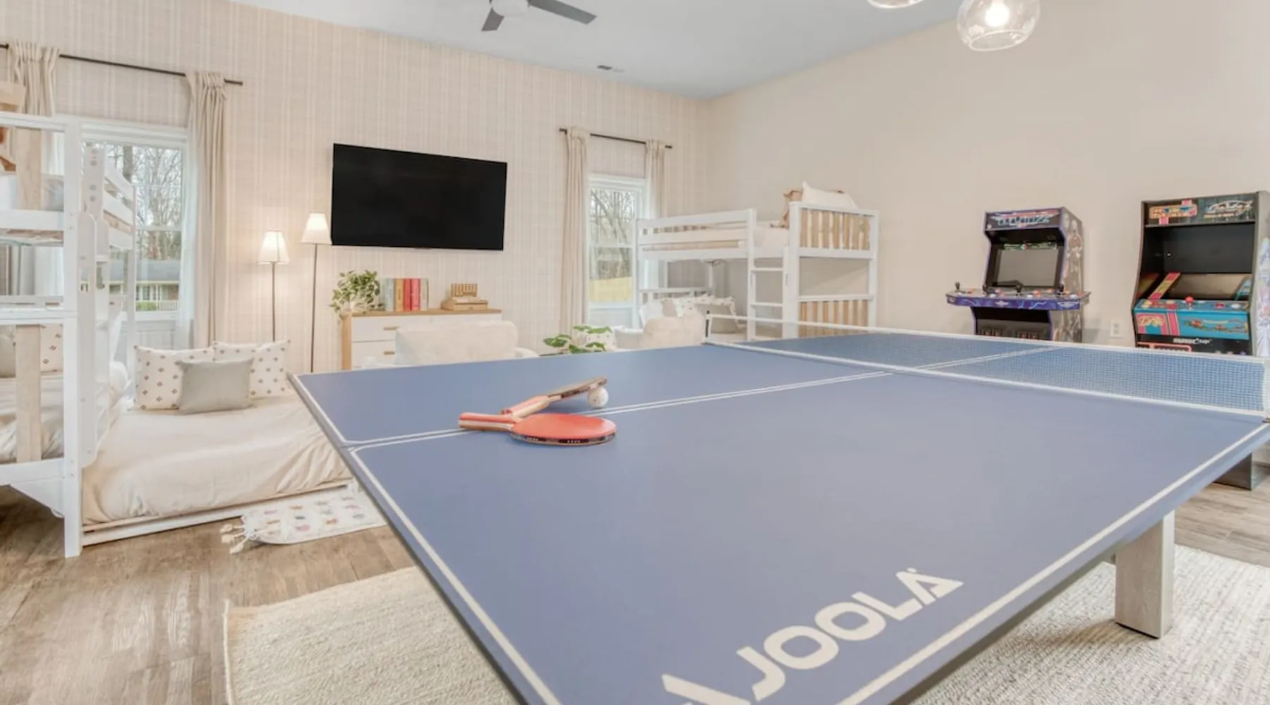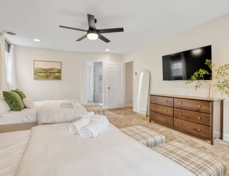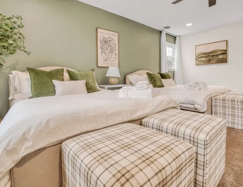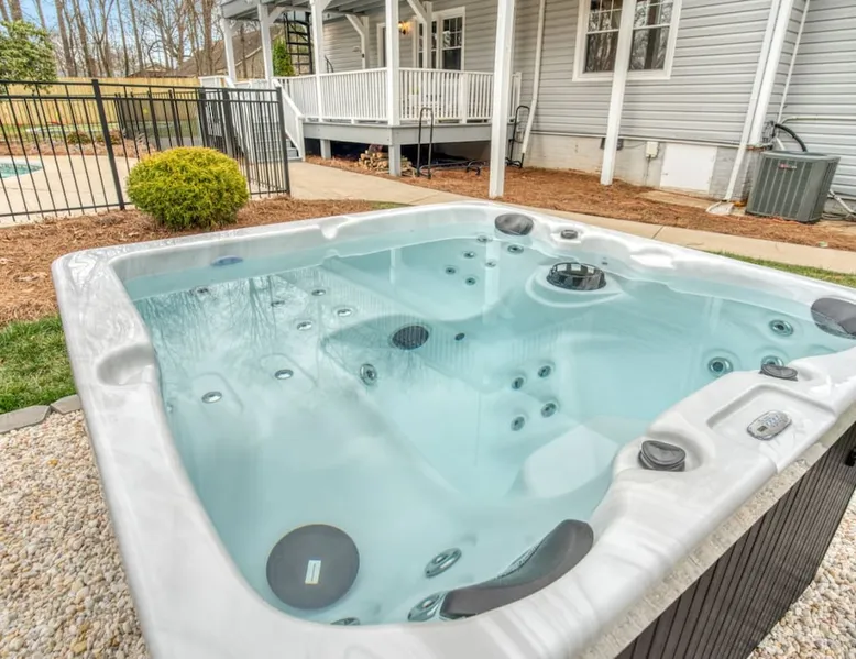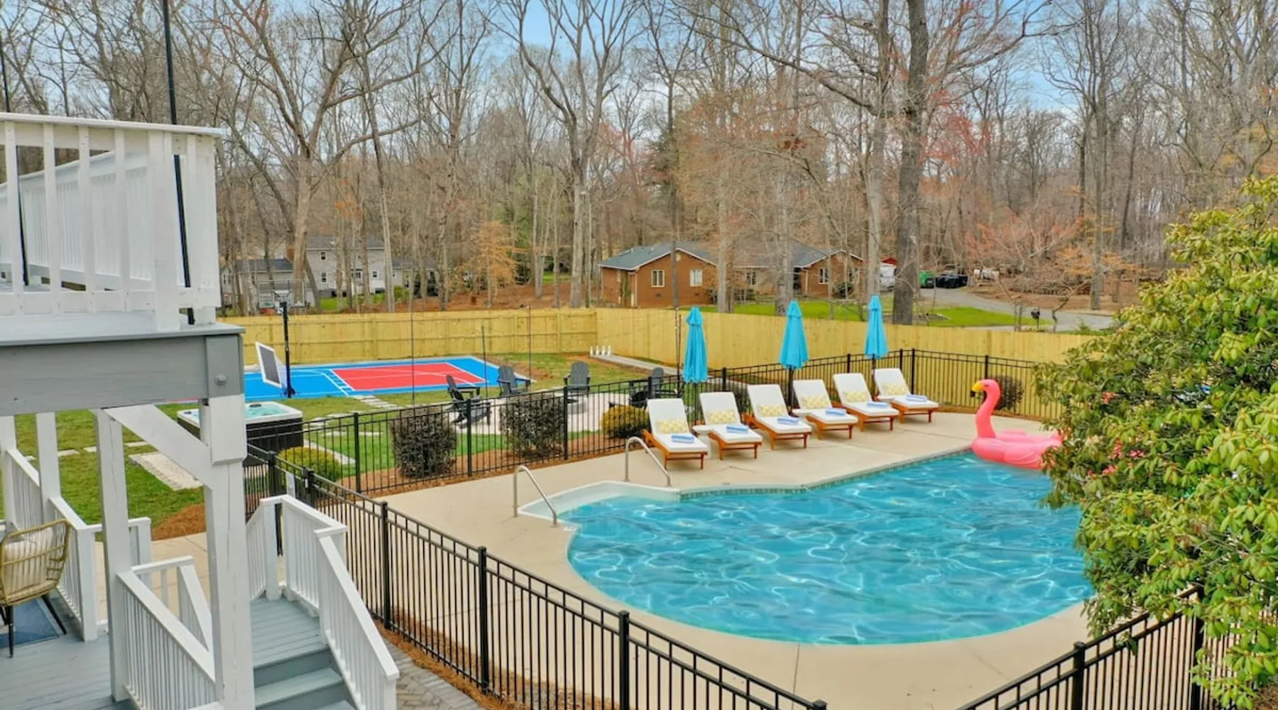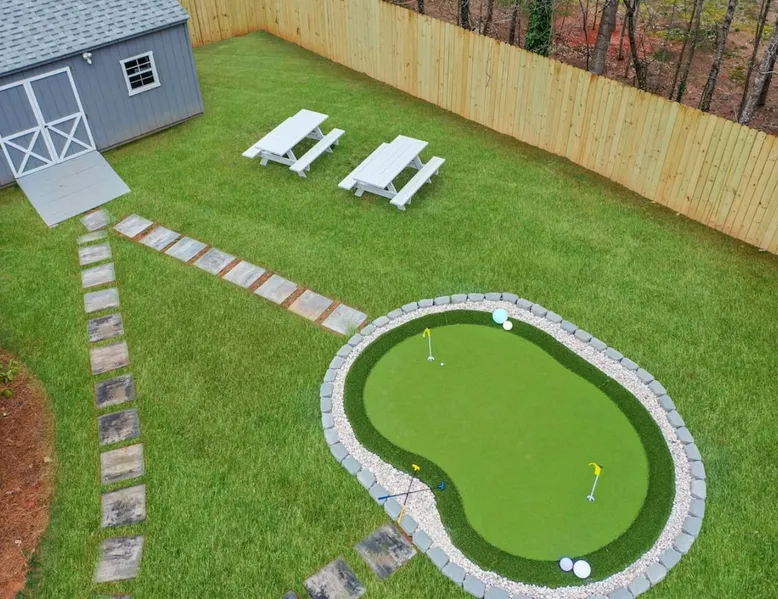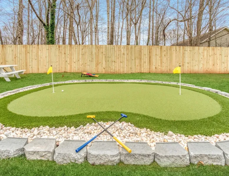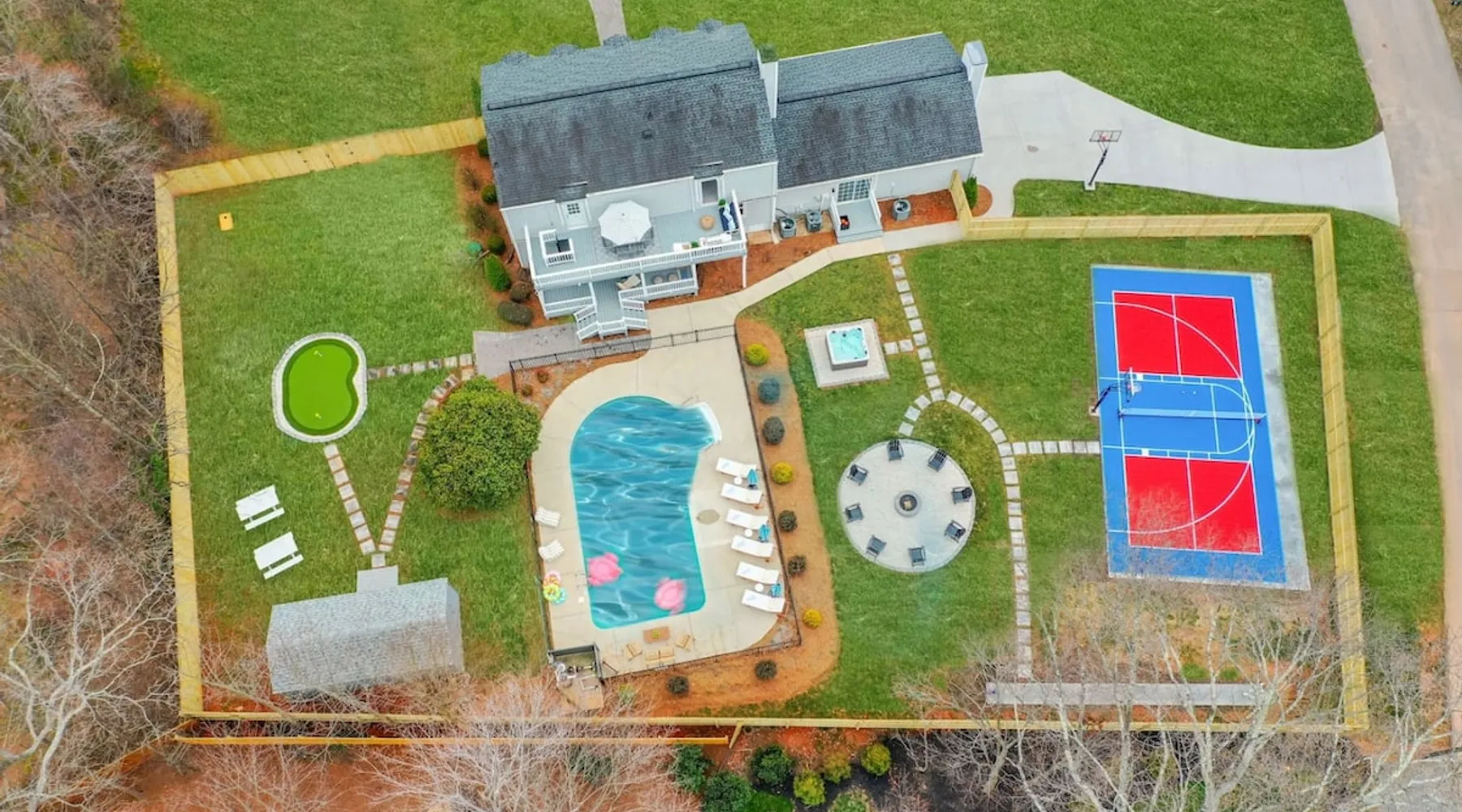 LUXURY! Vacation dream with our luxurious oasis for families! Boasting unique amenities like golf putting greens hot tub balcony deck pickleball court two basketball goals and outdoor bowling alley this home is a paradise for leisure and sports enthusiasts alike. Accommodate 10 adults and 6 kids with 11 beds. n n18 min to NCAA & ACC Tournaments' Greensboro Coliseum n18 min to PGA Tour Sedgefield Country Club Golf Course n28 min to High Point Furniture Market n nDiscover Unmatched Luxury Here! The space **NO PARTIES, GATHERINGS, OR EVENTS** *NO CHIPPING GOLF BALLS* *NO OUTDOOR MUSIC* ☆☆ PLEASE READ HOUSE RULES BEFORE BOOKING IN THE HOUSE RULES SECTION (NOT HERE)☆☆ KEY FEATURES: ☀ 5 beautiful bedrooms; 1 king, 2 queen, 2 full beds, & 6 twin beds (2 twin-over-twin bunk beds with trundle beds) ☀ 3.5 bathrooms, including a master ensuite ☀ Modern kitchen with new, stainless steel appliances ☀ Open living room with lots of comfy seating & smart TVs ☀ Dining within kitchen room seating to comfortably accommodate 10 (plus countertop seating & outdoor dining) ☀ STUNNING backyard with TONS of amenities; golf putting greens, pickleball court, outdoor bowling alley, pool, hot tub, fire pit, pool table, ping pong, BBQ grill, corn hole, & more! Here Are A Few Kind Words From Our Past Guests: "Absolutely loved our stay! Waking up to the serene glow of sunlight filtering in made each morning memorable. There are so many amenities that it was like an amusement park! Looking forward to our next stay!" - Olivia "Jordan was an outstanding host, offering prompt replies and helpful tips. The property itself is stunning, melding comfort with style, all while being conveniently near downtown Greensboro. Highly recommend for a memorable stay." - Sophia "I was charmed by this place from the moment we arrived, finding it exactly as depicted! Impeccably clean with a host that sets the bar for excellence. It's a definite must-return for me!" - Ava **NO PARTIES, GATHERINGS, OR EVENTS** *NO CHIPPING GOLF BALLS* *NO OUTDOOR MUSIC* ☆☆ PLEASE READ HOUSE RULES BEFORE BOOKING IN THE HOUSE RULES SECTION (NOT HERE)☆☆ Guest access ☆☆ BEDROOMS ☆☆ In this home, you'll find five bedrooms. The master bedroom is on the upper level, with two full beds, smart TV, and private ensuite bathroom. Right across the hall are four more bedrooms, with a king, queen, queen, and full bed accordingly. On the main level, there are two bedrooms located right off the kitchen & the rest of the entertainment area. Between the two bedrooms share a full bathroom. On the lower level den, there is an additional bedroom. This room has a pool table, ping pong table conversion kit, and arcade games. Plus it is filled with two twin-over-twin bunk beds and two trundle beds (total of 6 beds), swivel chairs, and lots of games, including board games! ☆☆ BATHROOMS ☆☆ There are three bathrooms spread out across this home, all of which have been completely renovated. The master ensuite has two sinks, a toilet, and shower only with a seat inside. The hallway bathroom right off of the other four second floor bedrooms is equipped with a sink, a toilet, and a shower/tub combo. On the lower level den, there is a full bathroom right off of the main entertaining area with a sink, toilet, and shower/tub combo. On the main floor, there is a half bath connected to the kitchen room. ☆☆ KITCHEN & DINING ☆☆ The modern, open kitchen is located right off of the main living areas, and is loaded with all new stainless steel appliances & a coffee station (including a Keurig & coffee pods). Bright, open, and beautifully designed, this is a chef's kitchen made for entertaining! The dining room is right next to the kitchen, with enough seating to comfortably fit 6 people (plus additional seating in the kitchen for 4 more) with lots of natural light, looking over all the amazing amenities in the backyard, just steps away! ☆☆ LIVING ROOM ☆☆ The main living room is on the main level, attached to the kitchen & dining areas. Lots of comfy seating on an oversized sectional, a large smart TV, and a separate seating area tucked away next to the main living area, with some additional seating & tabletop games to enjoy! ☆☆ OUTDOOR SPACE ☆☆ The main attraction of this home - WOW! This yard is HUGE and has everything you and your family/friends could ask for: ☀ Pool (unavailable September-May) ☀ Hot tub ☀ Golf Putting Greens ☀ Pickleball Court ☀ Basketball Court ☀ Fire pit (wood-burning) ☀ Corn Hole ☀ Sunbathing chairs ☀ Outdoor lounge seating ☀ Outdoor dining tables ☀ BBQ grill There is so much to do here, that all of your friends & family will be thoroughly entertained throughout your entire stay. No matter the season, this resort-style backyard has it all. Book your stay with us today and you will NOT be disappointed. Get ready for a vacation you will never forget! ★☆ Book Now & Let Us Take Care Of You In Greensboro! ☆★ Other things to note ☆☆ PLEASE READ HOUSE RULES BEFORE BOOKING IN THE HOUSE RULES SECTION (NOT HERE)☆☆ **NO PARTIES, GATHERINGS, OR EVENTS** Local Property Manager: Blake This property includes security features, such as Schlage smart locks and Ring floodlight cameras, and noise decibel detectors for your safety and peace of mind. We are pet-friendly! Pet Fee is $150, max of 2, under 50 lbs each. Pool is not heated. Although it remains uncovered throughout the year, the pool is not available for use from September to May; however, the hot tub will be operational during those months. We'd like to set your expectations that the pool temperature will continue to be determined by the weather temperature, as this is a major contributing factor. PARKING: - ALL cars must park in the driveway which has a maximum of FOUR (4) cars - Do NOT park on the street in from our direct neighbors. The neighbors will TOW you. - Do NOT park on the street directly in front of the driveway **NO PAR