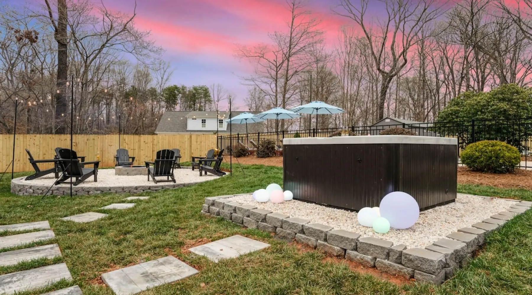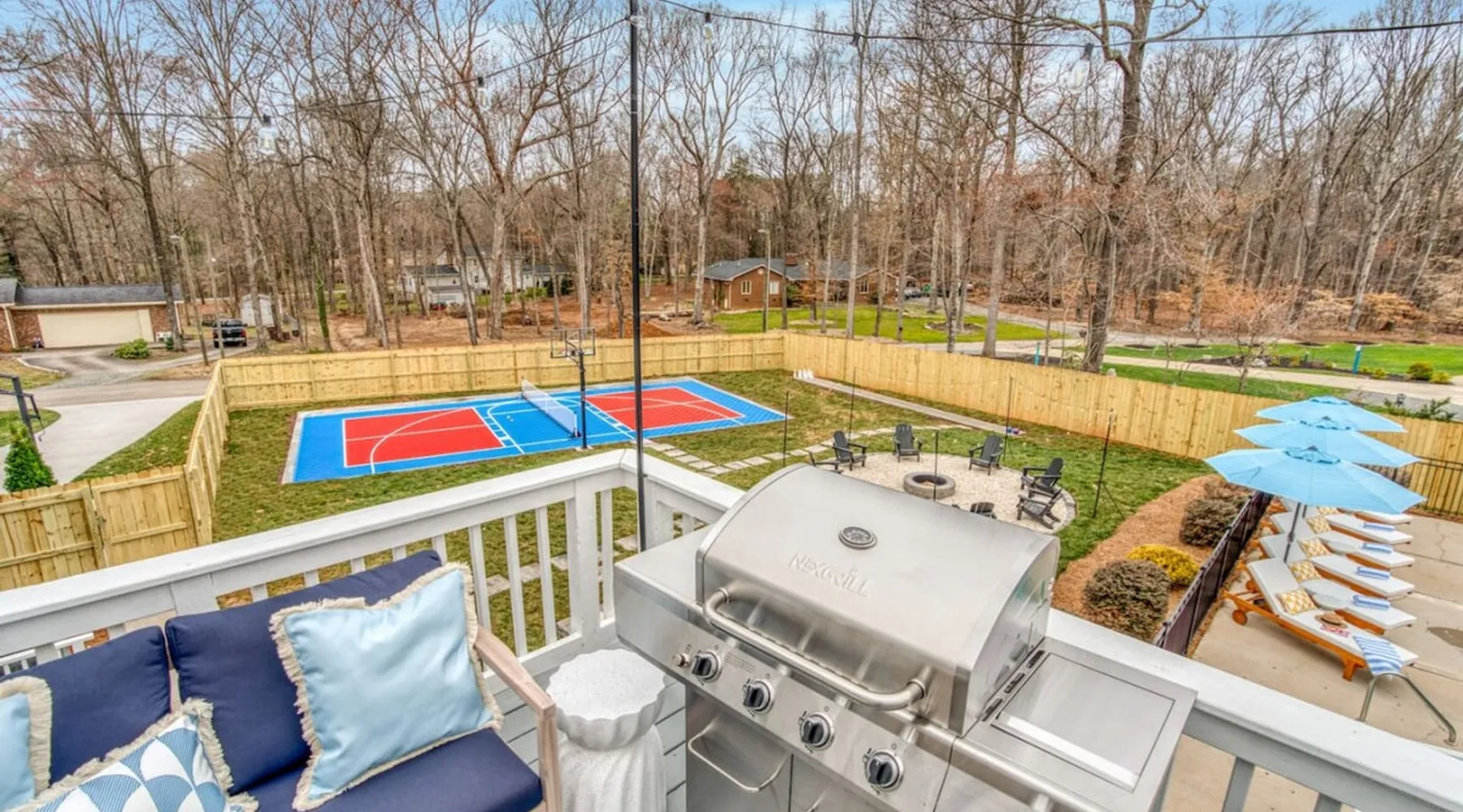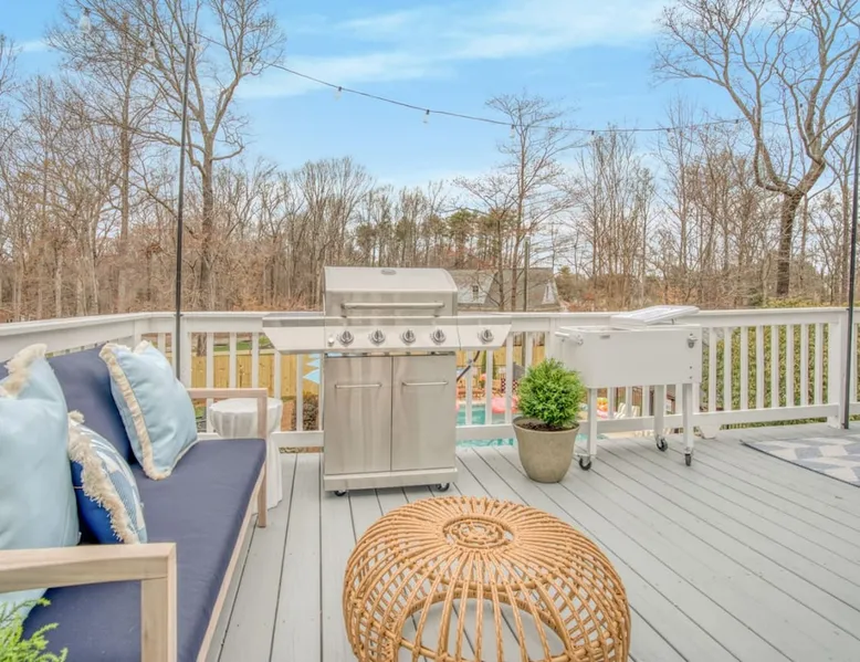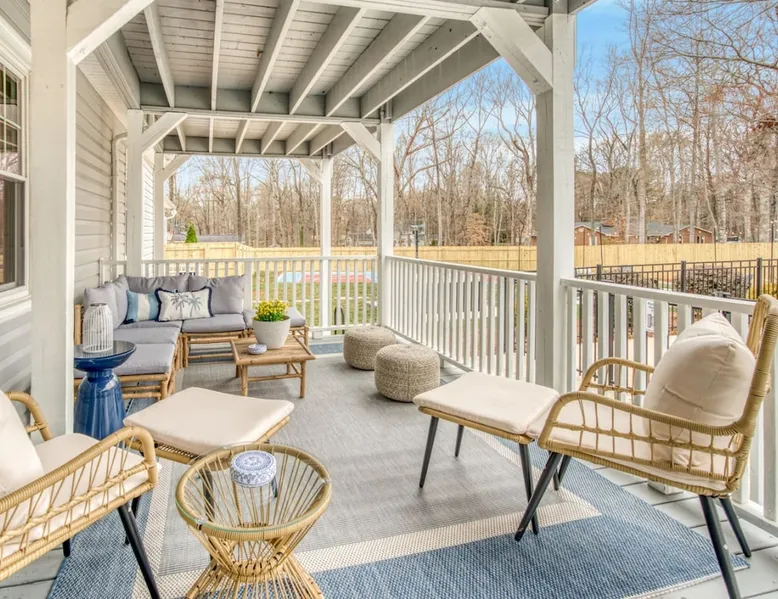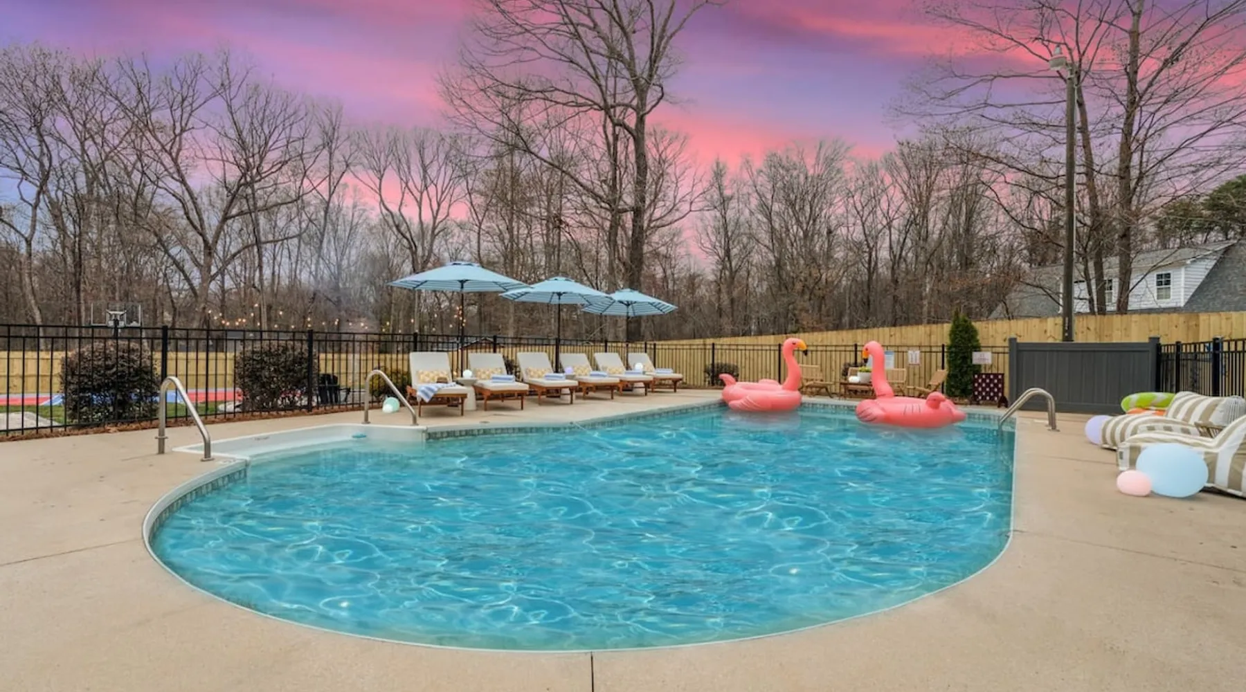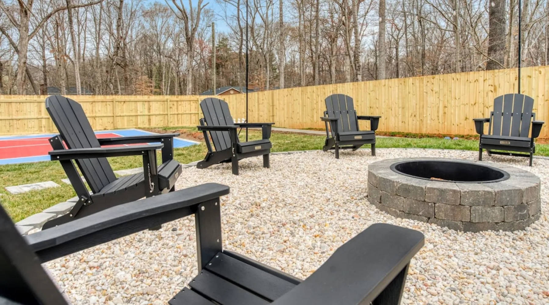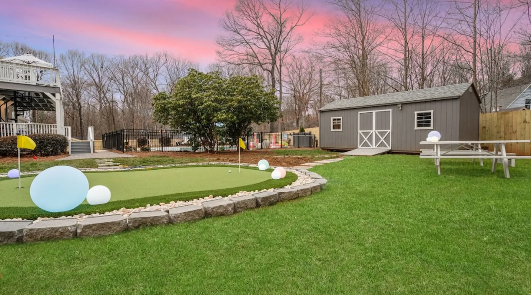 LUXURY! Vacation dream with our luxurious oasis for families! Boasting unique amenities like golf putting greens hot tub balcony deck pickleball court two basketball goals and outdoor bowling alley this home is a paradise for leisure and sports enthusiasts alike. Accommodate 10 adults and 6 kids with 11 beds. n n18 min to NCAA & ACC Tournaments' Greensboro Coliseum n18 min to PGA Tour Sedgefield Country Club Golf Course n28 min to High Point Furniture Market n nDiscover Unmatched Luxury Here! The space **NO PARTIES, GATHERINGS, OR EVENTS** *NO CHIPPING GOLF BALLS* *NO OUTDOOR MUSIC* ☆☆ PLEASE READ HOUSE RULES BEFORE BOOKING IN THE HOUSE RULES SECTION (NOT HERE)☆☆ KEY FEATURES: ☀ 5 beautiful bedrooms; 1 king, 2 queen, 2 full beds, & 6 twin beds (2 twin-over-twin bunk beds with trundle beds) ☀ 3.5 bathrooms, including a master ensuite ☀ Modern kitchen with new, stainless steel appliances ☀ Open living room with lots of comfy seating & smart TVs ☀ Dining within kitchen room seating to comfortably accommodate 10 (plus countertop seating & outdoor dining) ☀ STUNNING backyard with TONS of amenities; golf putting greens, pickleball court, outdoor bowling alley, pool, hot tub, fire pit, pool table, ping pong, BBQ grill, corn hole, & more! Here Are A Few Kind Words From Our Past Guests: "Absolutely loved our stay! Waking up to the serene glow of sunlight filtering in made each morning memorable. There are so many amenities that it was like an amusement park! Looking forward to our next stay!" - Olivia "Jordan was an outstanding host, offering prompt replies and helpful tips. The property itself is stunning, melding comfort with style, all while being conveniently near downtown Greensboro. Highly recommend for a memorable stay." - Sophia "I was charmed by this place from the moment we arrived, finding it exactly as depicted! Impeccably clean with a host that sets the bar for excellence. It's a definite must-return for me!" - Ava **NO PARTIES, GATHERINGS, OR EVENTS** *NO CHIPPING GOLF BALLS* *NO OUTDOOR MUSIC* ☆☆ PLEASE READ HOUSE RULES BEFORE BOOKING IN THE HOUSE RULES SECTION (NOT HERE)☆☆ Guest access ☆☆ BEDROOMS ☆☆ In this home, you'll find five bedrooms. The master bedroom is on the upper level, with two full beds, smart TV, and private ensuite bathroom. Right across the hall are four more bedrooms, with a king, queen, queen, and full bed accordingly. On the main level, there are two bedrooms located right off the kitchen & the rest of the entertainment area. Between the two bedrooms share a full bathroom. On the lower level den, there is an additional bedroom. This room has a pool table, ping pong table conversion kit, and arcade games. Plus it is filled with two twin-over-twin bunk beds and two trundle beds (total of 6 beds), swivel chairs, and lots of games, including board games! ☆☆ BATHROOMS ☆☆ There are three bathrooms spread out across this home, all of which have been completely renovated. The master ensuite has two sinks, a toilet, and shower only with a seat inside. The hallway bathroom right off of the other four second floor bedrooms is equipped with a sink, a toilet, and a shower/tub combo. On the lower level den, there is a full bathroom right off of the main entertaining area with a sink, toilet, and shower/tub combo. On the main floor, there is a half bath connected to the kitchen room. ☆☆ KITCHEN & DINING ☆☆ The modern, open kitchen is located right off of the main living areas, and is loaded with all new stainless steel appliances & a coffee station (including a Keurig & coffee pods). Bright, open, and beautifully designed, this is a chef's kitchen made for entertaining! The dining room is right next to the kitchen, with enough seating to comfortably fit 6 people (plus additional seating in the kitchen for 4 more) with lots of natural light, looking over all the amazing amenities in the backyard, just steps away! ☆☆ LIVING ROOM ☆☆ The main living room is on the main level, attached to the kitchen & dining areas. Lots of comfy seating on an oversized sectional, a large smart TV, and a separate seating area tucked away next to the main living area, with some additional seating & tabletop games to enjoy! ☆☆ OUTDOOR SPACE ☆☆ The main attraction of this home - WOW! This yard is HUGE and has everything you and your family/friends could ask for: ☀ Pool (unavailable September-May) ☀ Hot tub ☀ Golf Putting Greens ☀ Pickleball Court ☀ Basketball Court ☀ Fire pit (wood-burning) ☀ Corn Hole ☀ Sunbathing chairs ☀ Outdoor lounge seating ☀ Outdoor dining tables ☀ BBQ grill There is so much to do here, that all of your friends & family will be thoroughly entertained throughout your entire stay. No matter the season, this resort-style backyard has it all. Book your stay with us today and you will NOT be disappointed. Get ready for a vacation you will never forget! ★☆ Book Now & Let Us Take Care Of You In Greensboro! ☆★ Other things to note ☆☆ PLEASE READ HOUSE RULES BEFORE BOOKING IN THE HOUSE RULES SECTION (NOT HERE)☆☆ **NO PARTIES, GATHERINGS, OR EVENTS** Local Property Manager: Blake This property includes security features, such as Schlage smart locks and Ring floodlight cameras, and noise decibel detectors for your safety and peace of mind. We are pet-friendly! Pet Fee is $150, max of 2, under 50 lbs each. Pool is not heated. Although it remains uncovered throughout the year, the pool is not available for use from September to May; however, the hot tub will be operational during those months. We'd like to set your expectations that the pool temperature will continue to be determined by the weather temperature, as this is a major contributing factor. PARKING: - ALL cars must park in the driveway which has a maximum of FOUR (4) cars - Do NOT park on the street in from our direct neighbors. The neighbors will TOW you. - Do NOT park on the street directly in front of the driveway **NO PAR