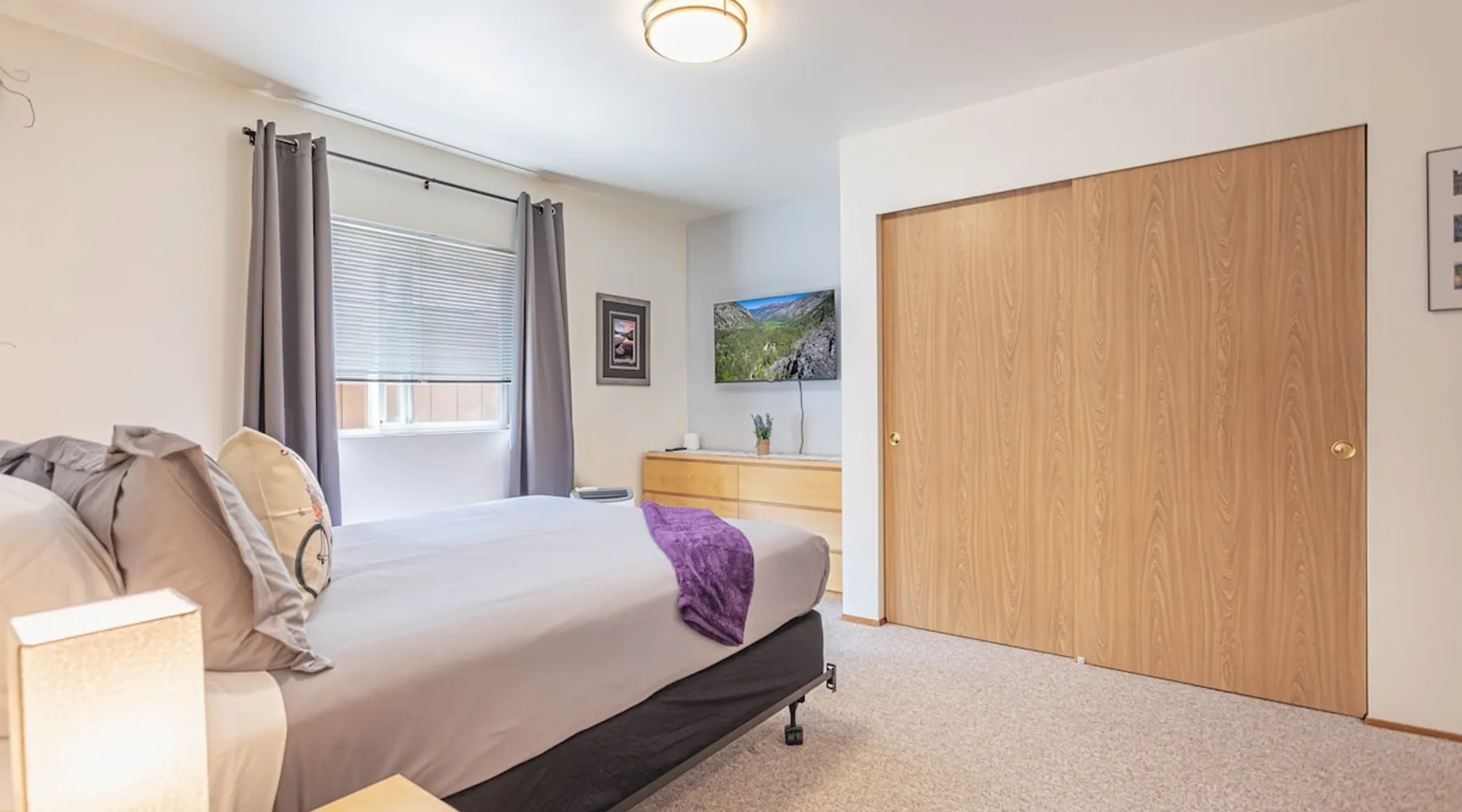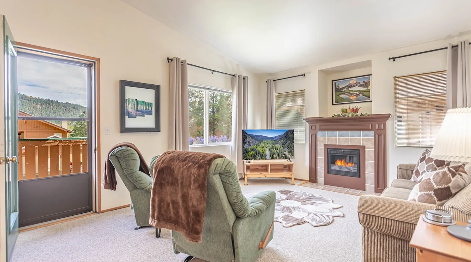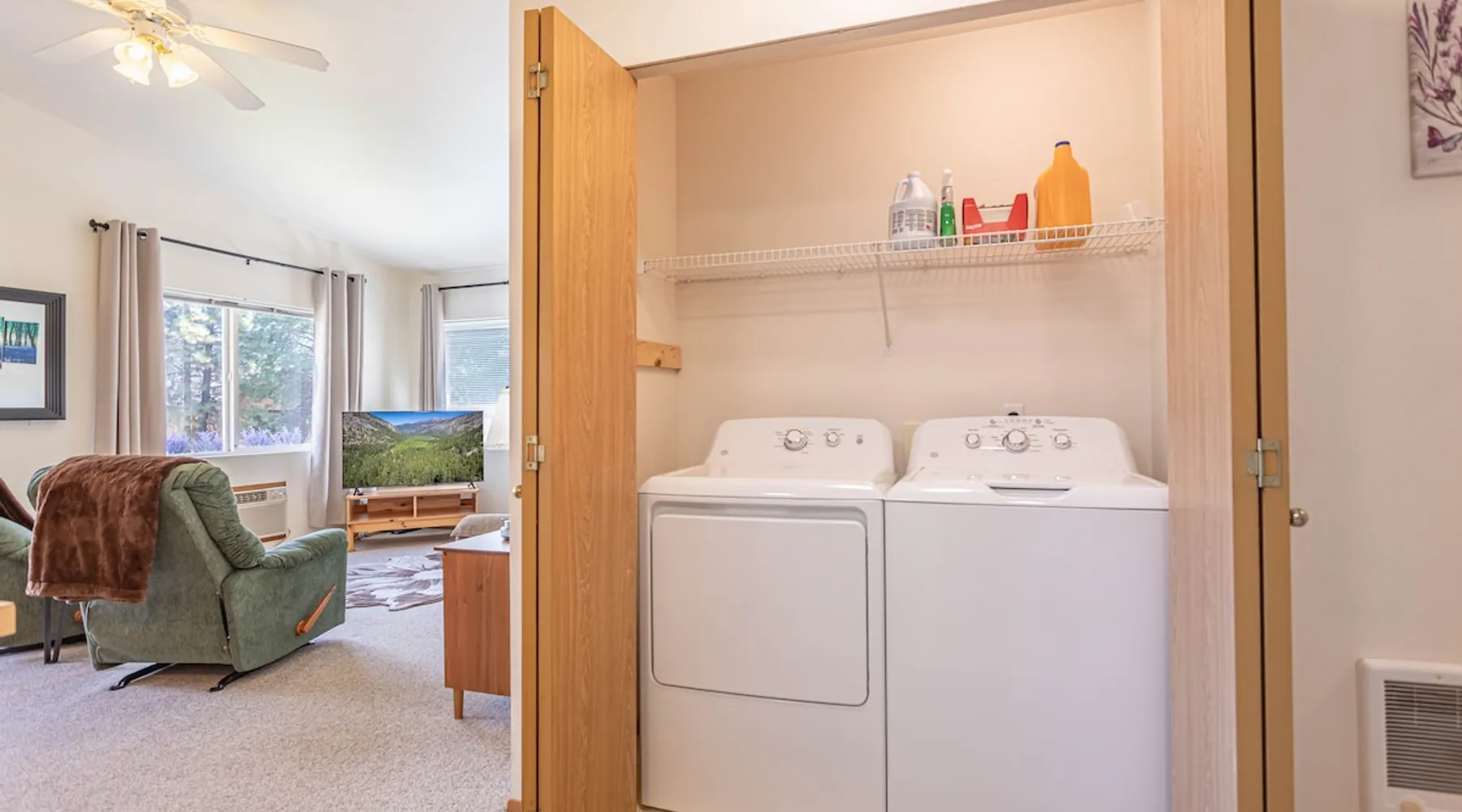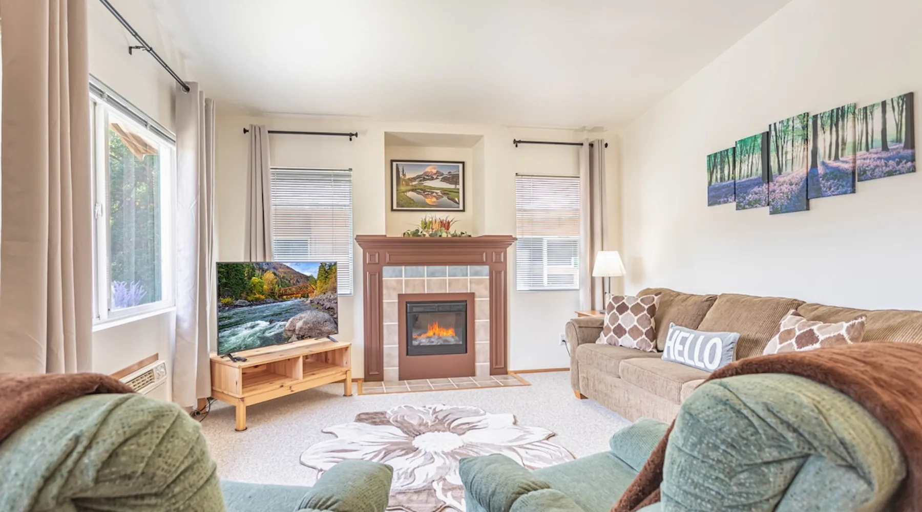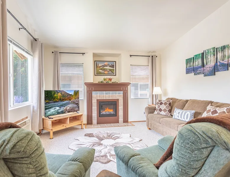 Introducing a peaceful, second-floor condo that is the perfect mountain retreat. Bright & cheerful with a calming theme, it features 2 bedrooms w/queen beds, 2 baths, and a pull-out sofa. The fully stocked kitchen, fireplace, air conditioning, & more, ensure a comfortable stay. Enjoy tranquil mountain views from the deck while sipping a glass of wine. Impeccably clean & pet-free, this condo has everything you need for a relaxing Bavarian getaway. Read More Details Below. The space Master Bedroom w/Private Bath, Queen bed, Dresser & Smart TV Second Bedroom: Queen Bed, Dresser Living Room: Pull out Sofa Bed (full size), Smart TV *Fully Stocked Kitchen *Dining area seating for 6+ *Dedicated Work Space (Desk) in Dining area *Living room with 2 Recliners, Sofa, Smart TV and Electric Fireplace *Ensuite Bathroom has Walk-in Shower, Hairdryer, shamp/cond/bodywash *Second Bathroom: Bathtub, Shower, Hairdryer, shamp/cond/bodywash *Two Smart TV's *Washer/Dryer with Detergent and Bounce *Private Deck with Seating and Mountain views *Boardgames *All Linens provided w/extra pillows *Bedside USB Plug-Ins *Air Conditioning in Summer Months *Heat Thermostats in each room QUESTIONS? Your questions are important to us and answered really fast! We're here to serve you & to make your stay incredibly memorable! Kristiina Miller, Property Manager iloveleavenworth Guest access The condo is entirely yours to enjoy, both inside and out, any time of day. Please note that the outdoor storage spaces and one indoor linen closet are locked for housekeeping use. Other things to note The Alpine Roller Coaster is conveniently located right across the street from the condo complex—just be sure to make reservations in advance. You’ll find a welcome book on the counter filled with helpful tips on where to eat, shop, and explore in Leavenworth. If you have any additional questions, feel free to give us a call—we're always here to help!