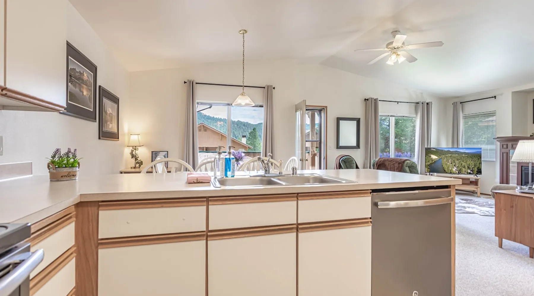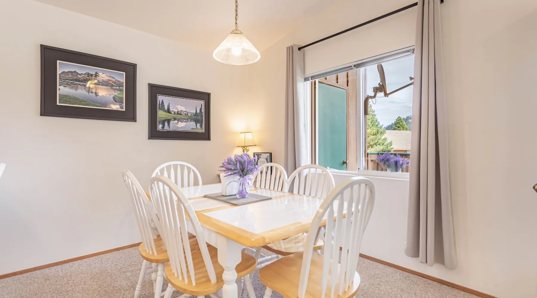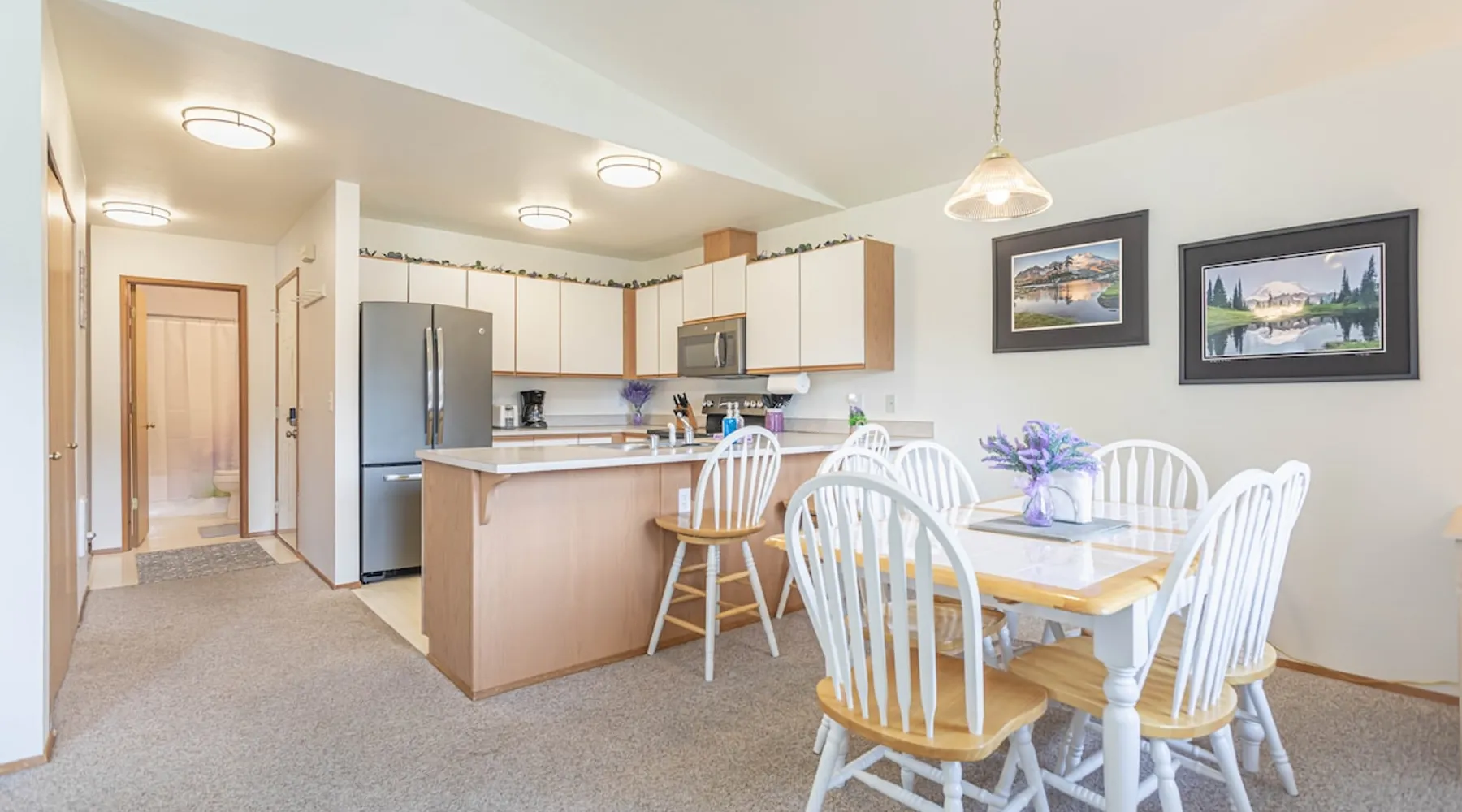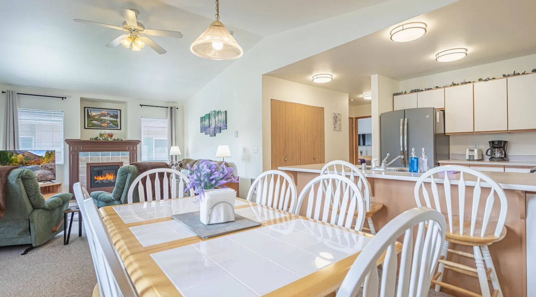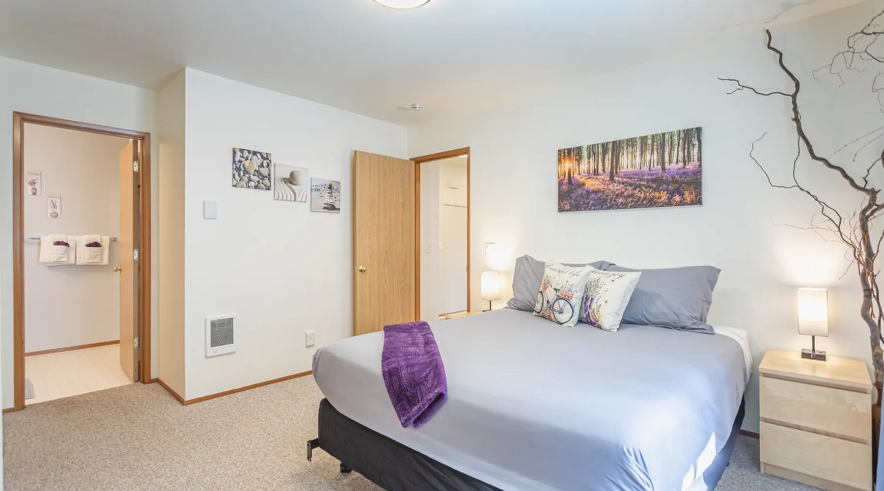 Introducing a peaceful, second-floor condo that is the perfect mountain retreat. Bright & cheerful with a calming theme, it features 2 bedrooms w/queen beds, 2 baths, and a pull-out sofa. The fully stocked kitchen, fireplace, air conditioning, & more, ensure a comfortable stay. Enjoy tranquil mountain views from the deck while sipping a glass of wine. Impeccably clean & pet-free, this condo has everything you need for a relaxing Bavarian getaway. Read More Details Below. The space Master Bedroom w/Private Bath, Queen bed, Dresser & Smart TV Second Bedroom: Queen Bed, Dresser Living Room: Pull out Sofa Bed (full size), Smart TV *Fully Stocked Kitchen *Dining area seating for 6+ *Dedicated Work Space (Desk) in Dining area *Living room with 2 Recliners, Sofa, Smart TV and Electric Fireplace *Ensuite Bathroom has Walk-in Shower, Hairdryer, shamp/cond/bodywash *Second Bathroom: Bathtub, Shower, Hairdryer, shamp/cond/bodywash *Two Smart TV's *Washer/Dryer with Detergent and Bounce *Private Deck with Seating and Mountain views *Boardgames *All Linens provided w/extra pillows *Bedside USB Plug-Ins *Air Conditioning in Summer Months *Heat Thermostats in each room QUESTIONS? Your questions are important to us and answered really fast! We're here to serve you & to make your stay incredibly memorable! Kristiina Miller, Property Manager iloveleavenworth Guest access The condo is entirely yours to enjoy, both inside and out, any time of day. Please note that the outdoor storage spaces and one indoor linen closet are locked for housekeeping use. Other things to note The Alpine Roller Coaster is conveniently located right across the street from the condo complex—just be sure to make reservations in advance. You’ll find a welcome book on the counter filled with helpful tips on where to eat, shop, and explore in Leavenworth. If you have any additional questions, feel free to give us a call—we're always here to help!