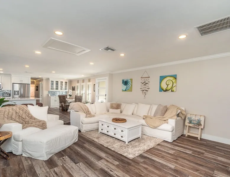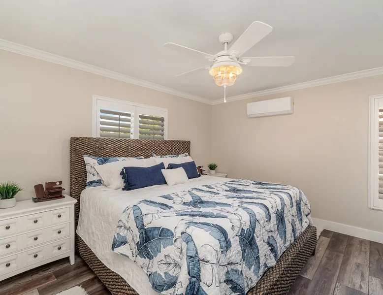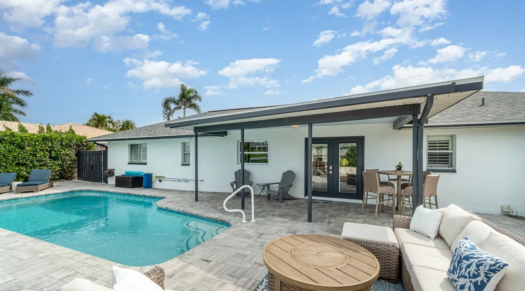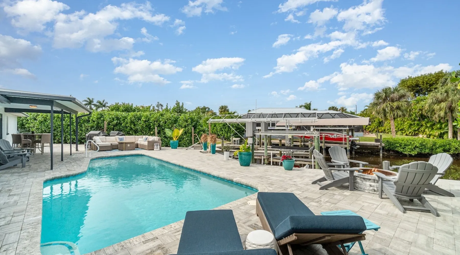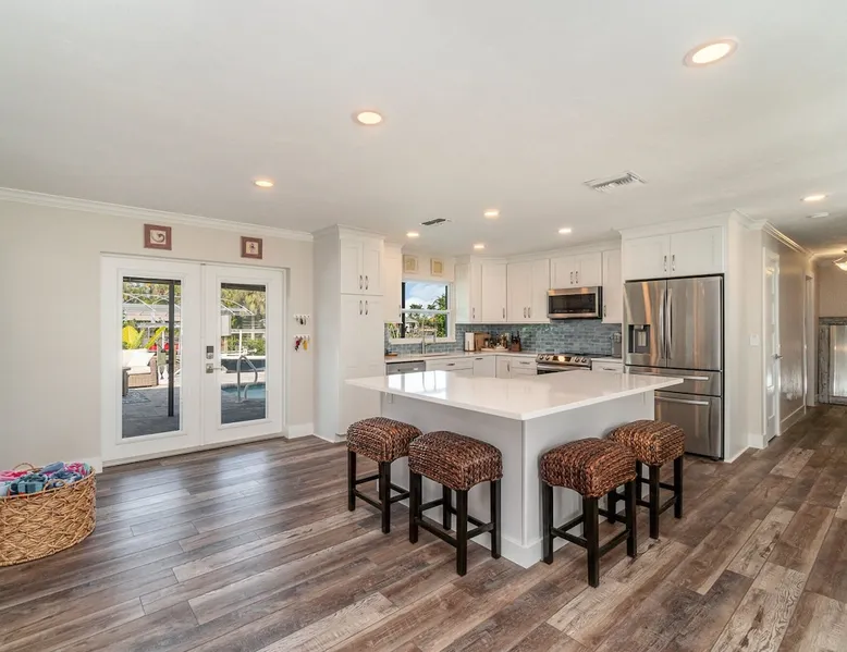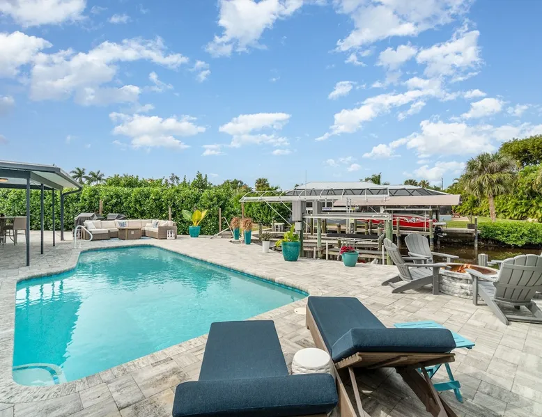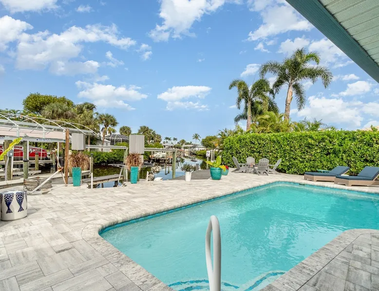 Sailboat access. Under 15 min from Fort Myers Beach. Fire Pit and Heated Pool The space Kick Back & Relax in Style! Enjoy the perks this stunning property and location have to offer. The incredible outdoor area boosts a perfect set up for relaxation. The fire pit, heated pool, canal view, boat dock, loungers, BBQ, outdoor seating, palm tress, and Ping Pong table, are just some of the features that will make you want to stay here forever. This home is perfect for guests who love exploring the waterways and area. All you can think of is just a short ride away! Water adventures, shopping, restaurants, sandy beaches, nightlife fun, trail parks, and so much more. You’ll feel right at home when you enter the house. This fully remodeled Villa features an open-concept living and dining area with plenty of seating along with an impressive 85-inch smart TV in the living room. The kitchen has a large island and is fully stocked with everything you need to cook a great meal for you and your family. The master bedroom features a comfortable king-size bed, a 65 ich smart TV, and a mini split AC unit for those who want to set the temp at night just the way they have it at home. The additional two bedrooms are equipped with a comfortable mattress for a good night’s sleep and a TV to watch your favorite TV shows. For those traveling with small children or planning to go to the beach, we provide some infant and beach equipment. Step outside to find yourself mesmerized by stunning water views, beautiful sunsets, and a wide variety of wildlife. Spend a cozy night gathered by the firepit roasting marshmallows and having fun with the whole family. For those who want to sit back and relax, you’ll love having your coffee/tea outside while spotting the dolphins and manatees. Spend your vacation relaxing in a spacious waterfront home and enjoy the beautiful sunsets from your lanai. You will be required to sign a rental agreement and credit card authorization form, which can be done electronically. You must be at least 25 years old to rent this property. Access to the home will be restricted if requirements are not completed. This property requires an energy contribution payment of $0.22 per KWh plus tax. Please note it when making your reservation. Please note that the garage is being used by the owner and you won't have access to it. The boat lift is used by the owner and not available to the guests. The boat dock can be used to tie a boat. There are security cameras at the front and on the sides of the house. Wood won't be provided for the fire pit.
