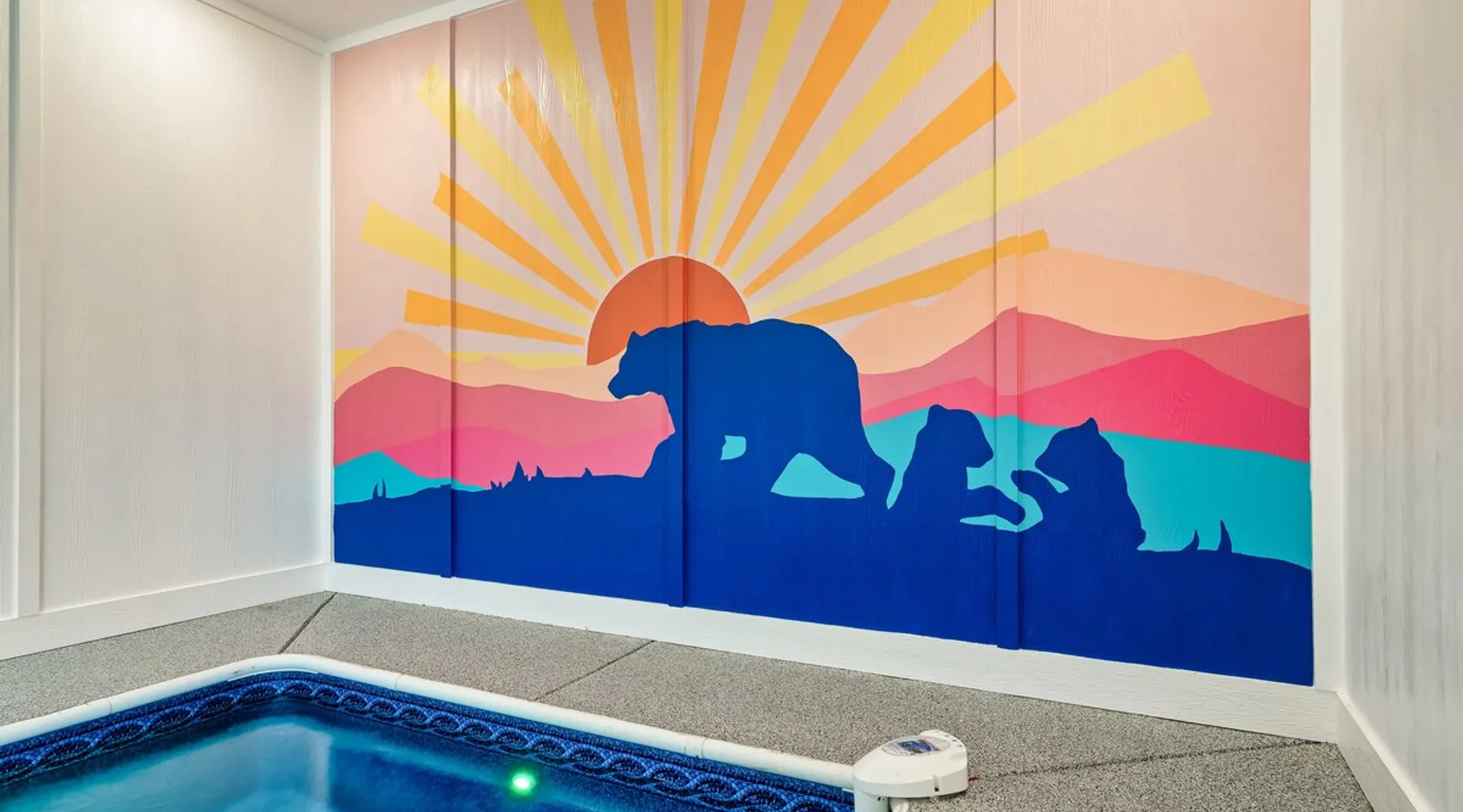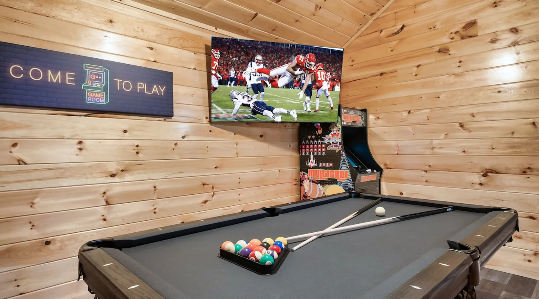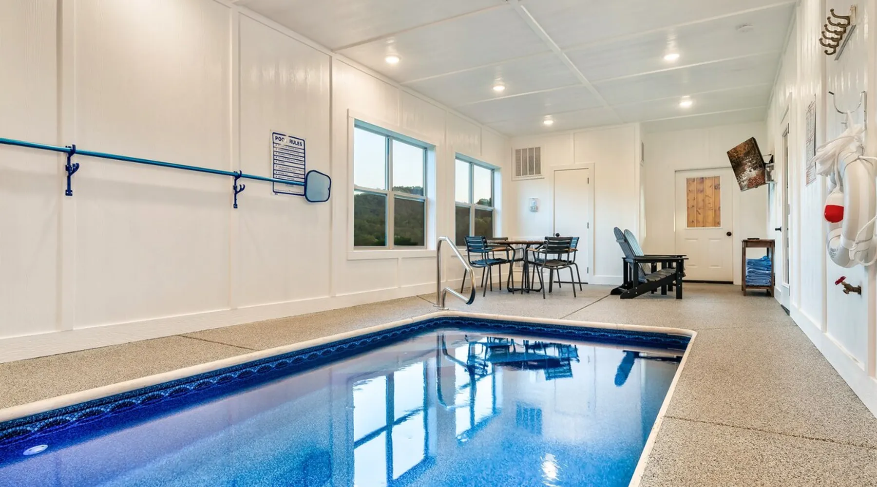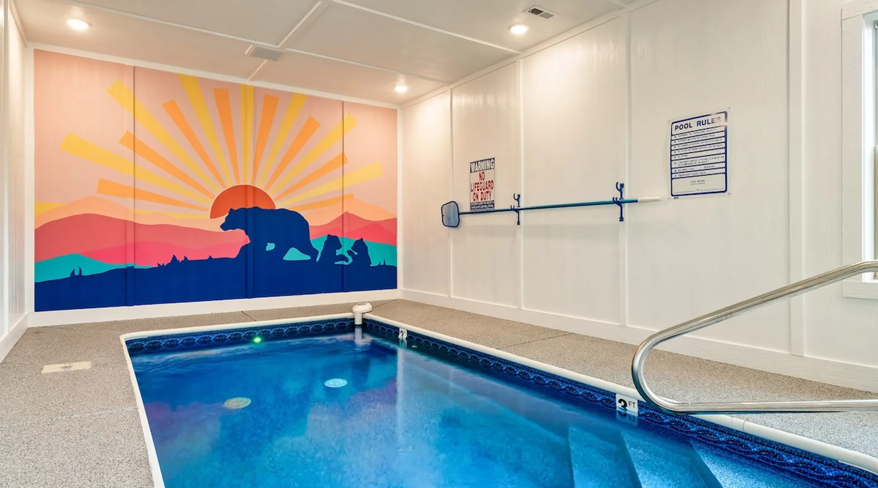 Sunshine Splashed by Thompson Retreats INDOOR HEATED SWIMMING POOL cabin that is ONE minute from the Pigeon Forge parkway and centrally located to all the attractions in Gatlinburg, Pigeon Forge, & the Smoky Mountains! This beautiful new cabin sleeps up to 12 people with 4 en- suite bedrooms. This cabin is the perfect base to explore the Smokies! It's close to local attractions and offers several of its own - indoor pool, pool table and multi-cade, outdoor grill, and streaming smart TVs. The space Escape to the heart of the Smoky Mountains and experience the ultimate in relaxation and entertainment at our stunning Indoor Heated Swimming Pool Cabin. This exceptional two-level cabin is perfectly situated right off the Parkway, offering unrivaled convenience and easy access to all the captivating attractions of Gatlinburg, Pigeon Forge, and the breathtaking Smoky Mountains. Accommodating up to 12 guests, this beautiful cabin boasts 4 spacious en-suite bedrooms, ensuring privacy and comfort for everyone in your group. The modern amenities and tasteful decor make it a cozy home away from home, promising an unforgettable retreat in the midst of nature's wonders. The highlight of this cabin is undoubtedly its private indoor heated swimming pool. Whether it's a summer getaway or a winter escape, you can enjoy a soothing swim in the crystal-clear waters year-round. For those seeking entertainment, the cabin offers a variety of options. Challenge your friends and family to a friendly game on the pool table, or relive the golden age of arcade gaming with our multi-cade machine, providing hours of nostalgia and fun. Craving the great outdoors? Go for a hike in the park or fire up the outdoor grill and savor a delicious barbecue meal while breathing in the fresh mountain air. The cabin's outdoor spaces are perfect for enjoying the natural beauty that surrounds you. When it's time to unwind indoors, you'll find modern comfort in our streaming smart TVs. Catch up on your favorite shows, watch a movie night with loved ones, or simply cozy up by the fireplace with a good book. This cabin isn't just a place to stay; it's your base camp for exploring the wonders of the Smoky Mountains. With its proximity to local attractions and its own array of amenities, your days can be filled with adventure and your nights with relaxation. Whether you're seeking adventure, tranquility, or a bit of both, our Indoor Heated Swimming Pool Cabin offers the perfect blend of luxury, convenience, and entertainment. Book your stay today and embark on an unforgettable journey in the heart of the Smokies! ★ ~2400 Sq Ft ★ Indoor saltwater pool heated to 84 degrees! ★ Reliable Very Fast High Speed Internet (~350MB!) ★ Multicade Barrel Arcade! ★ Pool Table ★ Parking that easily fits three to four cars (five if parked strategically or double parked) ★ Prime Smoky Mountains Location that is right off the Parkway. Private yet convenient ★ ONE minute to Parkway, 7 minutes to The Island, 12 minutes to Dollywood, 14 minutes to Gatlinburg Mountain Village and 15 minutes for the National Park ★ Streaming Roku Smart TV's. BYO password for streaming services such as Netflix, Amazon Prime, etc... ★ Washer/Dryer ★ Fully Equipped Kitchen ★ Enjoy the large deck with comfortable rockers, table and chairs, gas grill and hot tub ★ Close to restaurants, shopping and lots of entertainment ★ Sleeps 12 with three en-suite king bedrooms and an en-suite bunk room with two full over full bunks ★ Comfortable relaxing living room with electric fireplace ★ Private hot tub for 5 people ★ NO pets allowed ★ NO Smoking Guest access You will get a door code before check-in. No need to meet anyone for keys. You get the whole house to yourself. Other things to note ★ OCUPANCY 12 Person Max. All guests must be 25+ (children with parents are allowed) ★ ENTRY: The front door is equipped with an electronic keypad. We will send you your passcode for your door lock. Check in after 4pm No late check-out or early check-in. If you arrive early or depart late, there will be a $100 charge per half-hour. ★ HEATED INDOOR POOL The saltwater pool is the highlight of the cabin! The 16' x 8' Indoor Pool is heated to 84 degrees year round. The pool depth is 3 feet deep. Use at your own risk and supervise children as there is no life guard. The pool is private, exclusively for the use of cabin guests. ★ INTERNET/STREAMING TV’S: High Speed Wireless Internet is included in your stay throughout the cabin. The living room has a 65 inch large flat screen Roku smart TV, great for family movies or ballgames. The loft game room also has a 65 inch streaming Roku smart TVs. Streaming Roku Smart TV's. BYO password for streaming services such as Netflix, Amazon Prime, etc... ★ BEDROOMS There are 3 king master bedrooms with en-suite bathrooms which accommodate up to 6 adults comfortably. The top level also has an ensuite bedroom with 2 full over full bunk beds that can sleep 4 adults comfortably or up to 8 kids comfortably. ★ BATHROOMS 4 bathrooms: 3 with a walk-in showers and 1 with a shower/bathtub combo. ★ KITCHEN A dining table with 2 chairs and 2 benches in the kitchen can fit 8 people. There is also a table behind the sofa that can fit three additional people and a similar table in the loft for three people. The open dining area and a fully equipped kitchen provide for wonderful space for family gatherings. Appliances, pots, pans, cups, plates, utensils, drip/pod Keurig coffee maker. ★ DECK Large deck on the main level with two rockers and a side table, a table and two chairs, gas grill and 5 person hot tub. ★ LAUNDRY Washer and dryer, ironing board and iron. ★ AMENITIES Our cleaning service provides initial start-up supplies including toilet paper, paper towels, dishwasher detergent, trash bags, shampoo and bar soap. Depending on the length of your stay, you may need to purchase some of the items when the initial supply runs out. ★