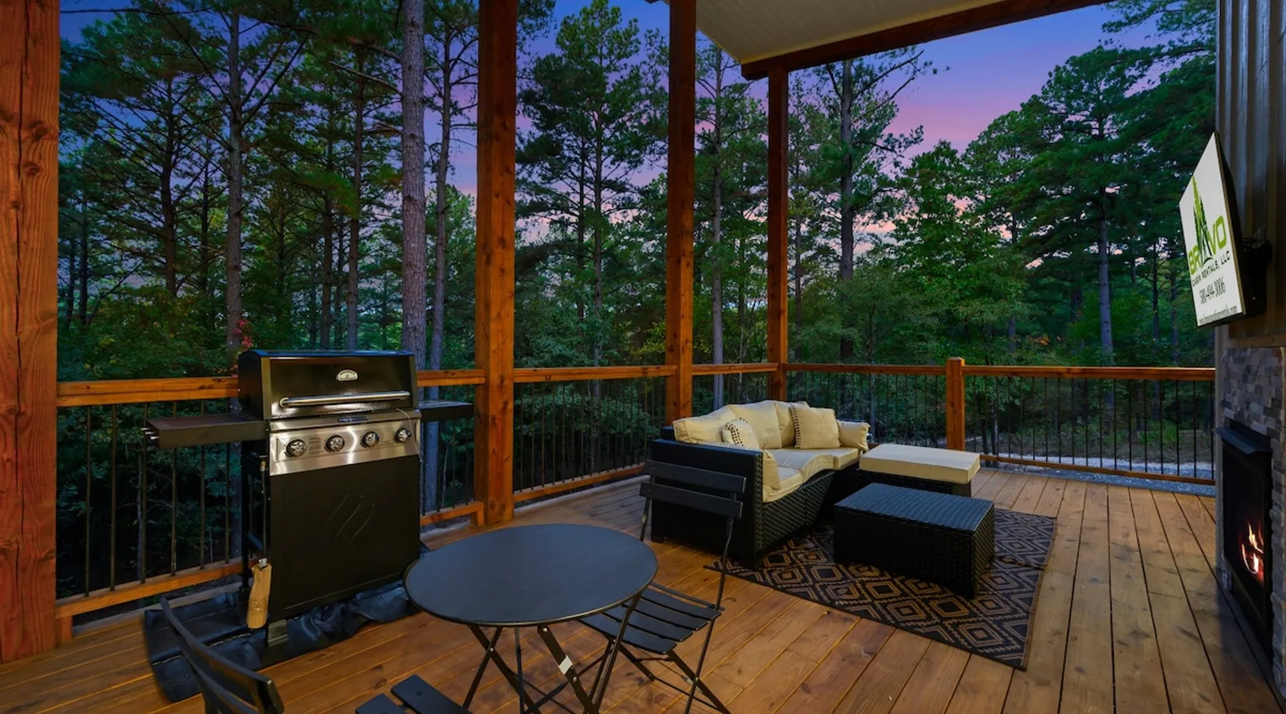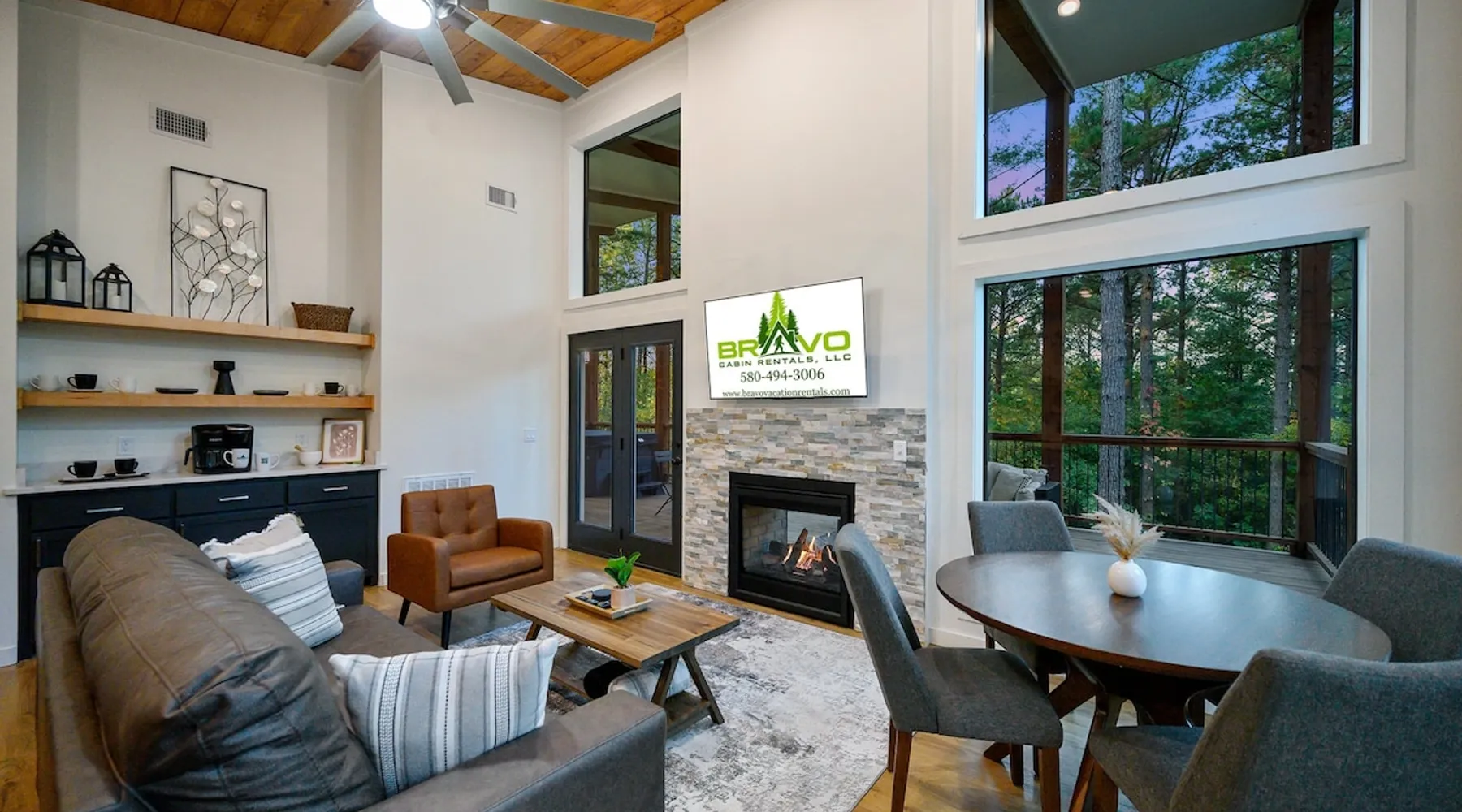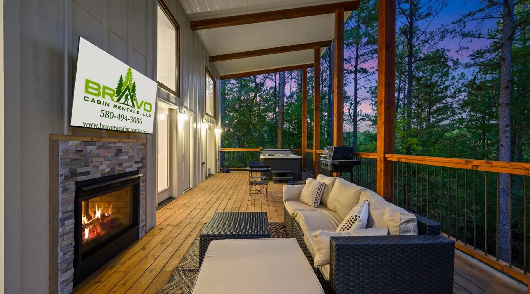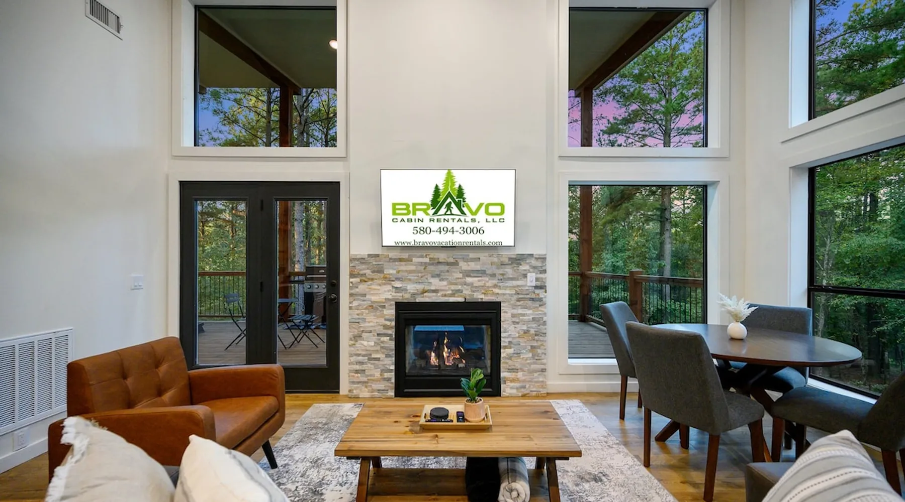 🏡 River’s Edge Looking for the perfect romantic getaway or peaceful solo retreat? River’s Edge is your cozy, woodland haven—nestled in the pines of Hochatown and just minutes from local adventures. Whether you're stargazing from the hot tub or relaxing beside the double-sided fireplace, this cabin offers all the comfort and charm you need to reconnect and unwind. The space 🛋️ LIVING ROOM Sleeper sofa (sleeps 2) and accent chair Throw blankets and coffee table Double-sided gas fireplace Big-screen TV Coffee bar with duo coffee pot/K-cup combo 🍽️ KITCHEN & DINING Fully stocked kitchen with full-size appliances Island seating for 4 Cooking basics: pots, pans, flatware, utensils, paper towels Dishwasher and detergent provided 🛏️ MASTER BEDROOM & BATHROOM King-size bed with nightstands and lamps Foot bench and accent chair Large dresser and walk-in closet with hangers Ensuite bathroom with: Double vanity sinks Large walk-in shower Private toilet 🌳OUTDOOR LIVING Private hot tub Double-sided fireplace Big-screen TV Gas grill Dining for 2 + additional seating for 3 Tranquil woodland views for morning coffee or starry nights 🐾 PET FRIENDLY 2 dogs under 50 lbs each (6 months or older) $125 per pet (non-refundable) 📌 GENERAL INFO Full-size washer and dryer Sleeper sofa bedding in the master dresser Gas fireplaces are seasonal (October–May 15th) Free Wi-Fi Refund policy: 6% processing fee on refunds. Max occupancy: 4 guests – NO EXCEPTIONS Guest access Guest has access to entire cabin Other things to note It is located near all the best restaurants, activities, and park amenities. It is just a short drive to Broken Bow Lake, Beavers Bend State Park, popular hiking trails, restaurants, breweries, wineries, and downtown Hochatown, and access to all the outdoors activities you want – boating, hiking, fly-fishing, kayaking, zip-lining, ATV trails, horseback riding, Cedar Creek Golf Course, Choctaw Landing Casino, mini-golf, helicopter rides, mining for gold, train rides, go-carts, and a great petting zoo. Don’t forget these items when you come to visit: • Rain gear and light jackets (Our average rainfall is 55″-60″ each year). • We have beautiful scenic trails; good hiking boots are a must. • Water shoes for our vast shorelines and streams. • Insect repellent, sunblock, and other first-aid supplies. • Coffee and filters – enjoy this while sitting on the deck in the early morning. • Condiments --A starter supply of coffee/filters, salt/pepper, paper towels, toilet paper, bath soap, dish soap, dishwasher tablets, trash bags, and laundry soap is provided. Still, guests may need to bring additional supplies. If we are missing something or you have a question we haven't answered, please feel free to reach out to us directly at Bravo Cabin Rentals and we will personally respond as soon as possible. We look forward to making your next vacation in Broken Bow/Hochatown one you won’t forget!