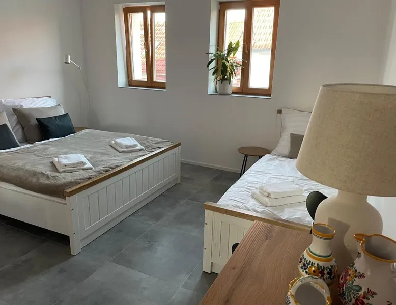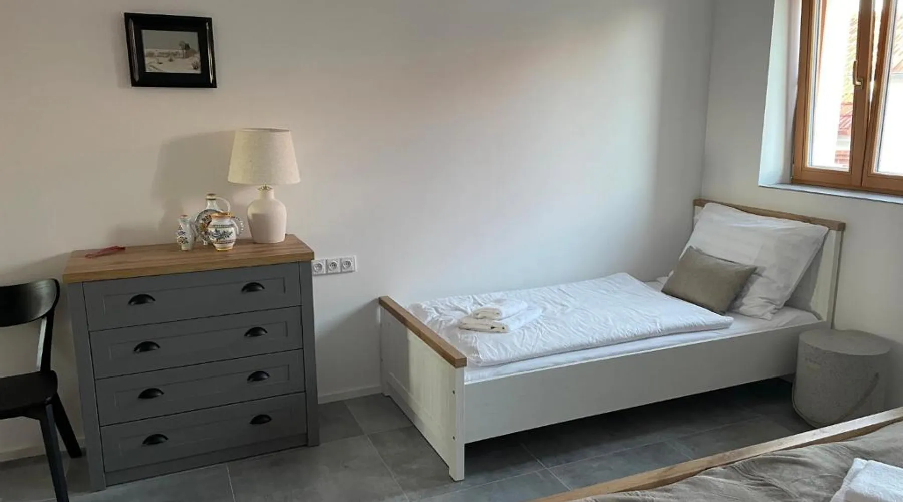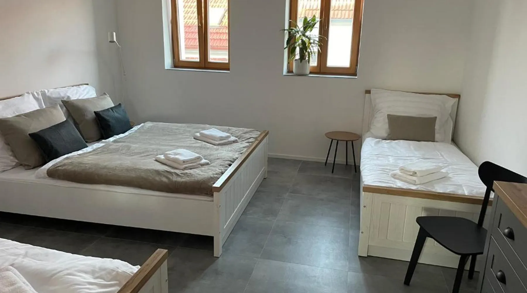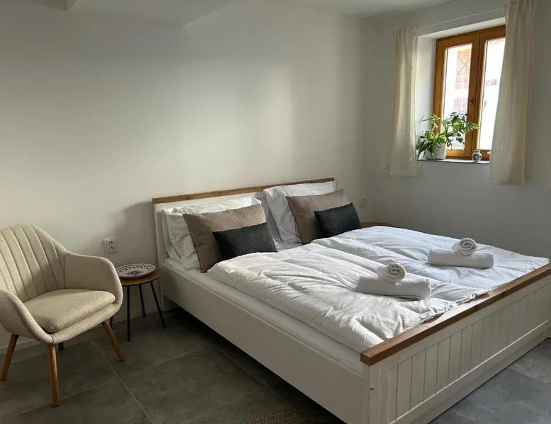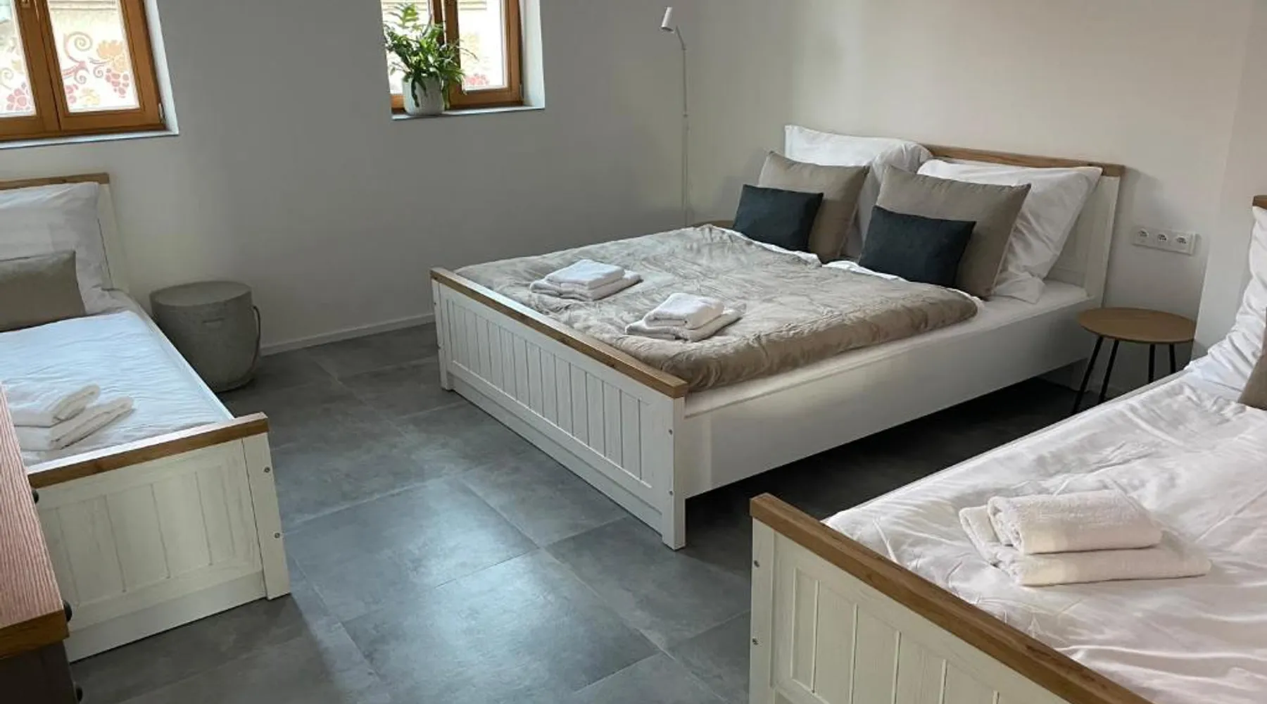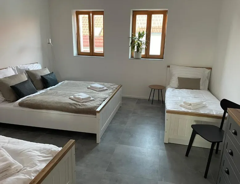 Modern Comforts: Penzion U Blechy a Švába in Mikulčice offers a recently renovated apartment with air-conditioning, a terrace, and a garden. Guests enjoy free WiFi, a lounge, and a shared kitchen equipped with a kitchenette. Outdoor Spaces: The property features a sun terrace, outdoor seating area, and picnic spots. Additional amenities include a barbecue, dining table, and outdoor furniture, providing ample space for relaxation and leisure. Convenient Facilities: Private check-in and check-out services, bicycle parking, and a tour desk enhance the stay. Free on-site parking is available, and the Brno–Turany Airport is 40 mi away. Local Attractions: Nearby points of interest include The Valtice Palace and Lednice Chateau, each 16 mi away, and Minaret and Chateau Jan, each 16 mi distant. Guests can also enjoy cycling and visit local golf resorts. Guests will find a stovetop, a refrigerator, a dishwasher and kitchenware in the well-equipped kitchenette. The quadruple room also has a barbecue. The quadruple room offers air conditioning, a tea and coffee maker, a terrace with garden views as well as a private bathroom featuring a shower. The unit offers 3 beds.