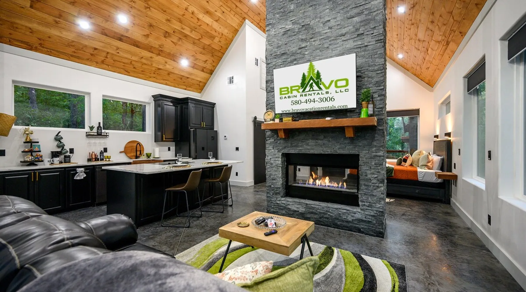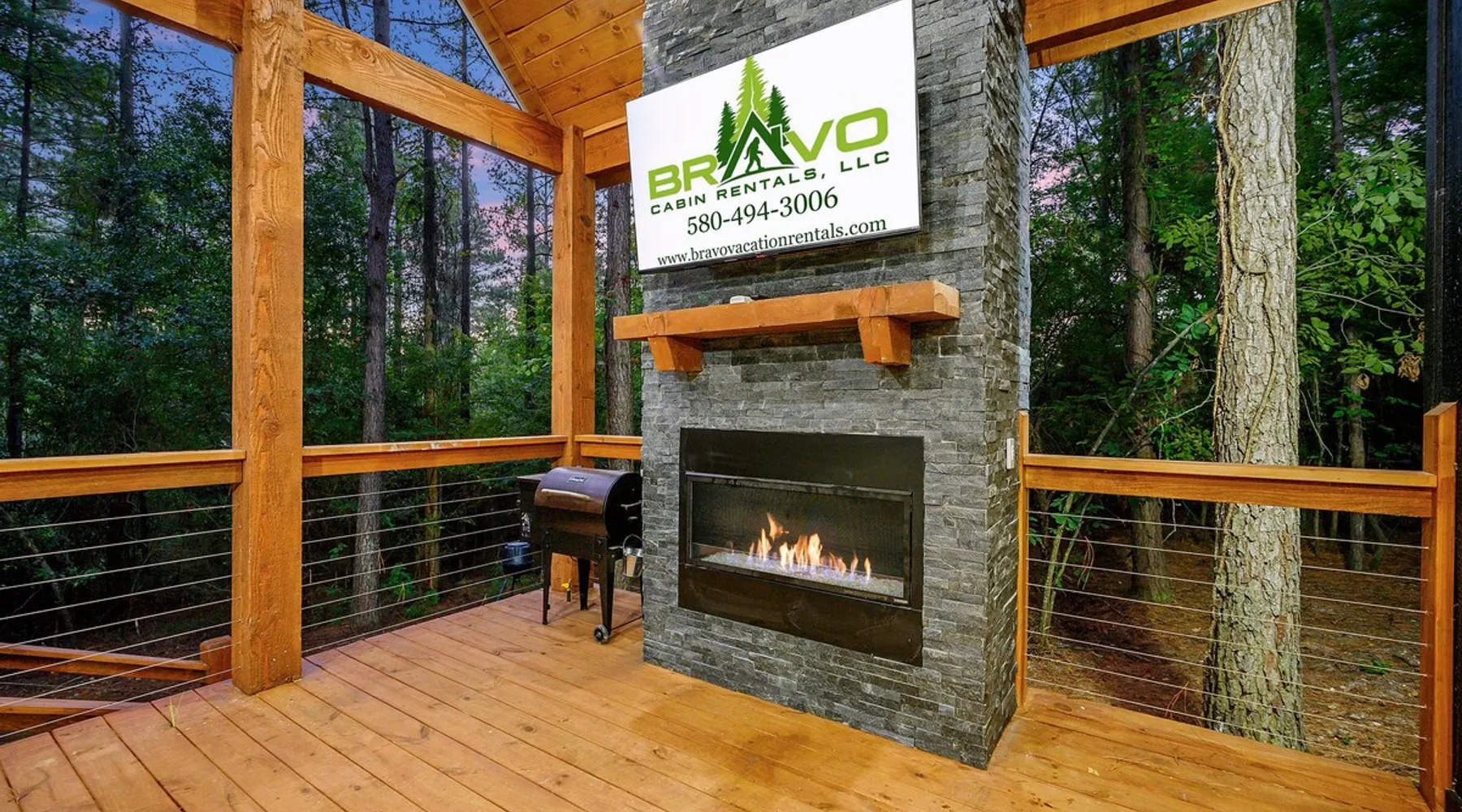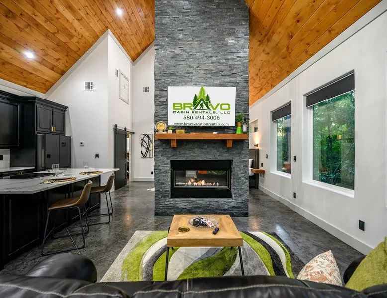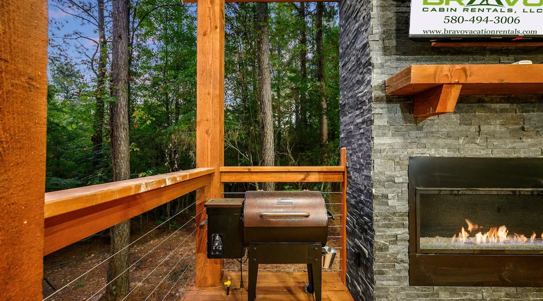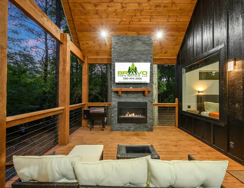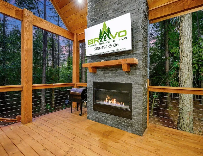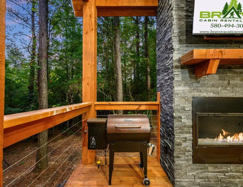 Wonderful Tonight – Hosted by Bravo Cabin Rentals This beautifully designed retreat offers an ideal escape for couples seeking tranquility and connection. Unwind in the luxurious hot tub under a starlit sky, or gather around the cozy firepit to share stories and create lasting memories. The cabin is equipped with an EV plug for electric vehicle charging, ensuring that your eco-friendly travel needs are met, although please note that a charger is not provided. The space **PET FRIENDLY** - 1 dog under 60lbs - $125 non-refundable pet fee - Fee is not included in your total and will be collected separately The epitome of comfort and style is this beautifully designed living space, featuring a luxurious leather pull-out sofa that effortlessly accommodates guests, complemented by a big-screen TV for your entertainment needs. The inviting coffee table serves as a perfect centerpiece, while the double-sided gas firepit adds a touch of warmth and ambiance, making it an ideal setting for both relaxation and social gatherings. The open-concept kitchen is a culinary enthusiast's dream, fully stocked with all the essential tools and appliances required for cooking and entertaining. The kitchen island provides a cozy dining area for two, allowing for intimate meals or casual breakfasts, all within a bright and airy space that encourages creativity and connection. Retreat to the serene bedroom, where a king-size bed promises restful nights and rejuvenating sleep. The room is thoughtfully furnished with nightstands and lamps for convenience, along with another big-screen TV, ensuring that you can unwind in comfort. The bathroom is a sanctuary of relaxation, featuring a large walk-in shower alongside a luxurious soaker tub, perfect for unwinding after a long day. All linens, as well as quality shampoo, conditioner, and body wash, are provided, ensuring that your stay is as comfortable and convenient as possible. Imagine cozy evenings gathered around the gas fireplace, providing warmth and ambiance as you enjoy the company of friends or family on the comfortable seating for three. For those who love to watch the big game or a movie under the stars, the large screen TV is perfectly positioned for optimal viewing. A charming small table for two invites intimate dining experiences, while the Pellet Grill (pellets not included) allows you to unleash your inner chef and savor delicious grilled meals. After a delightful dinner, unwind in the inviting hot tub, where you can soak away the stresses of the day. As the night deepens, gather around the firepit with seating for two, sharing stories and laughter under the twinkling night sky. This outdoor living ensemble is not just a space; it's an experience waiting to be enjoyed! General Information – A full-size washer and dryer are available in the laundry closet. Gas fireplaces are seasonally available (October – May 15th). Please also note that this property uses exterior surveillance cameras facing away from and monitoring activity approaching the cabin’s entrances. The only cameras being monitored during your stay are the front-facing cameras to ensure guests do not go over max occupancy at check-in. Wi-Fi can be spotty if you are in a rural area. An EV plug is provided, but a charger will be needed. For any cancellation processed in which a refund is due to the guest, there will be a $50 processing fee. Maximum occupancy for this cabin is 4 guests, with NO EXCEPTIONS. Guest access Guest has access to entire cabin Other things to note It is located near all the best restaurants, activities, and park amenities. It is just a short drive to Broken Bow Lake, Beavers Bend State Park, popular hiking trails, restaurants, breweries, wineries, and downtown Hochatown, and access to all the outdoors activities you want – boating, hiking, fly-fishing, kayaking, zip-lining, ATV trails, horseback riding, Cedar Creek Golf Course, Choctaw Landing Casino, mini-golf, helicopter rides, mining for gold, train rides, go-carts, and a great petting zoo. Don’t forget these items when you come to visit: • Rain gear and light jackets (Our average rainfall is 55″-60″ each year). • We have beautiful scenic trails; good hiking boots are a must. • Water shoes for our vast shorelines and streams. • Insect repellent, sunblock, and other first-aid supplies. • Coffee and filters – enjoy this while sitting on the deck in the early morning. • Condiments --A starter supply of coffee/filters, salt/pepper, paper towels, toilet paper, bath soap, dish soap, dishwasher tablets, trash bags, and laundry soap is provided. Still, guests may need to bring additional supplies. If we are missing something or you have a question we haven't answered, please feel free to reach out to us directly at Bravo Cabin Rentals and we will personally respond as soon as possible. We look forward to making your next vacation in Broken Bow/Hochatown one you won’t forget!