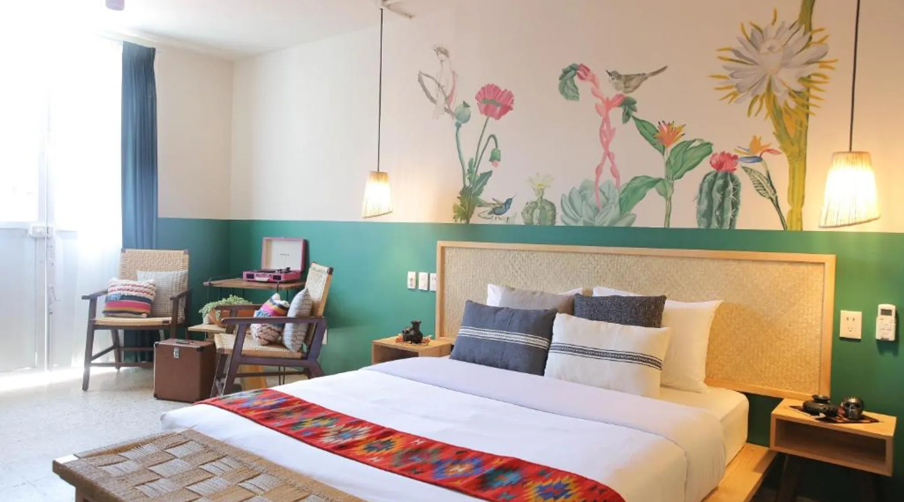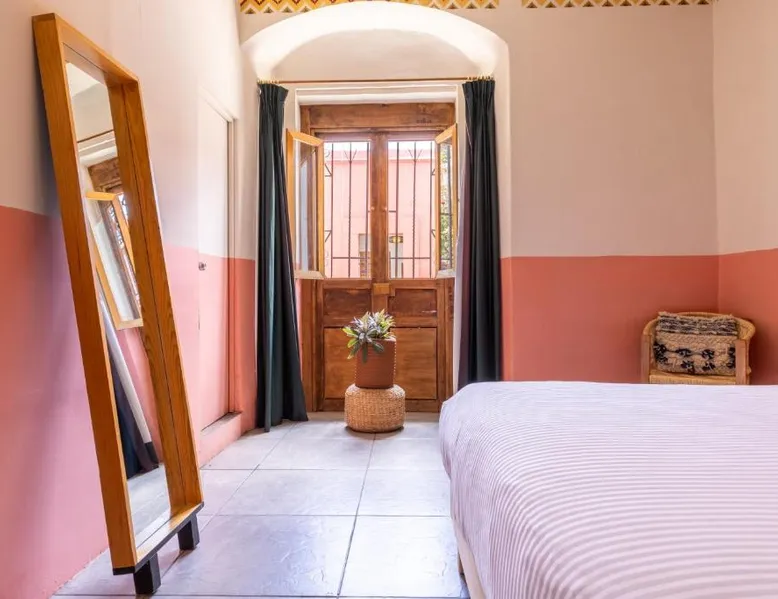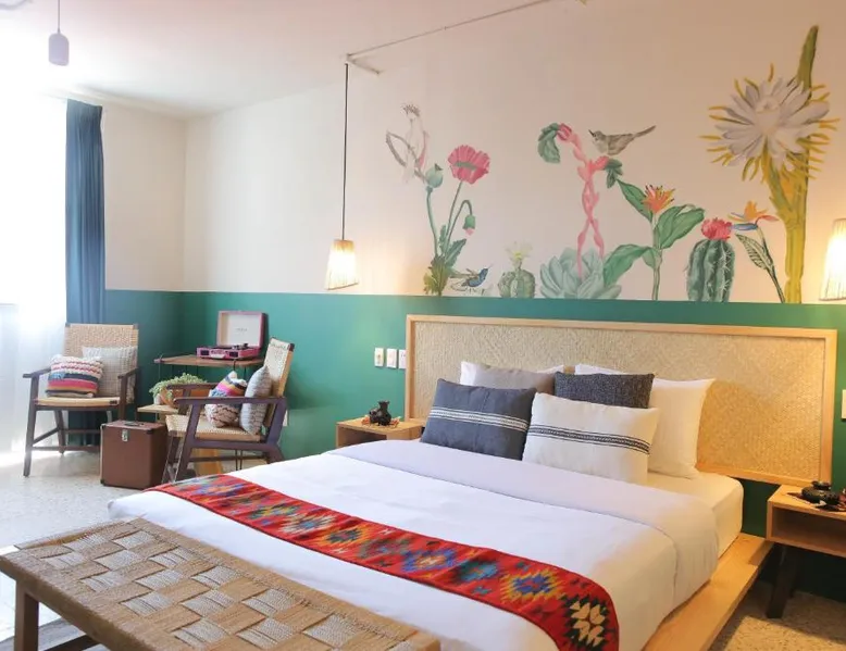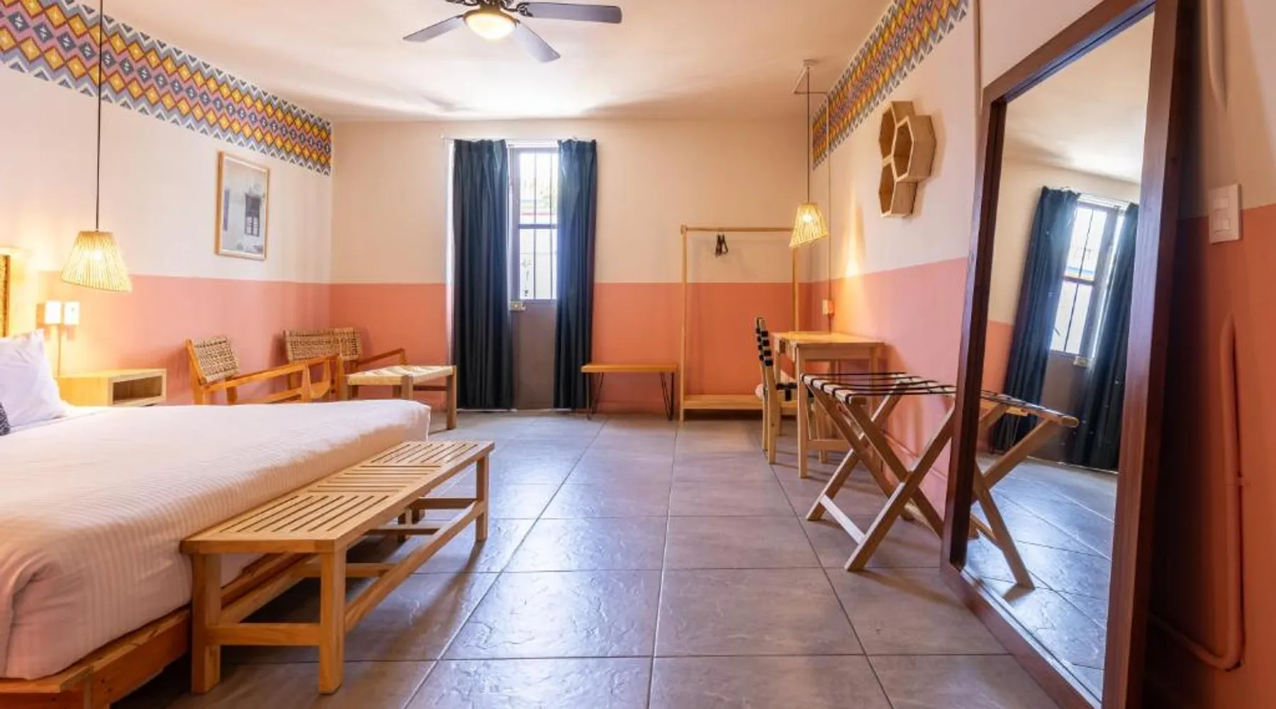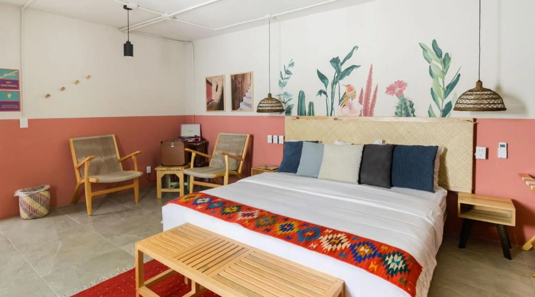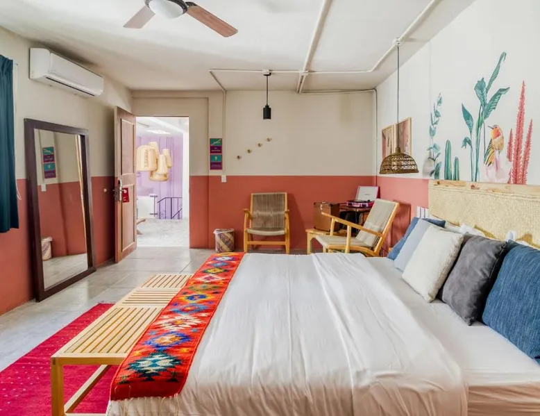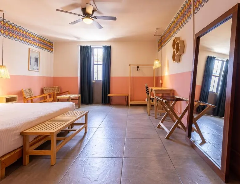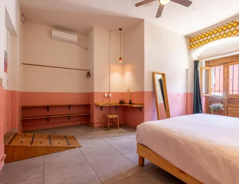 Comfortable Accommodations: Selina Oaxaca in Oaxaca City offers family rooms with air-conditioning, private bathrooms, and soundproofing. Each room includes a work desk, sofa, and free toiletries. Essential Facilities: Guests enjoy a bar and free WiFi. Additional amenities include a tour desk, live music, yoga classes, and luggage storage. Dining Options: A continental breakfast is available, including vegetarian and vegan options. Prime Location: Located 4.3 mi from Oaxaca International Airport, the hotel is an 8-minute walk from Oaxaca Cathedral and 1312 feet from Santo Domingo Temple. Nearby attractions include Monte Alban (5 mi) and Tule Tree (6.8 mi). The suite features 1 bedroom and 1 bathroom with a shower and free toiletries. The suite is furnished with a desk and a seating area and provides air conditioning and soundproof walls. The unit offers 1 bed.