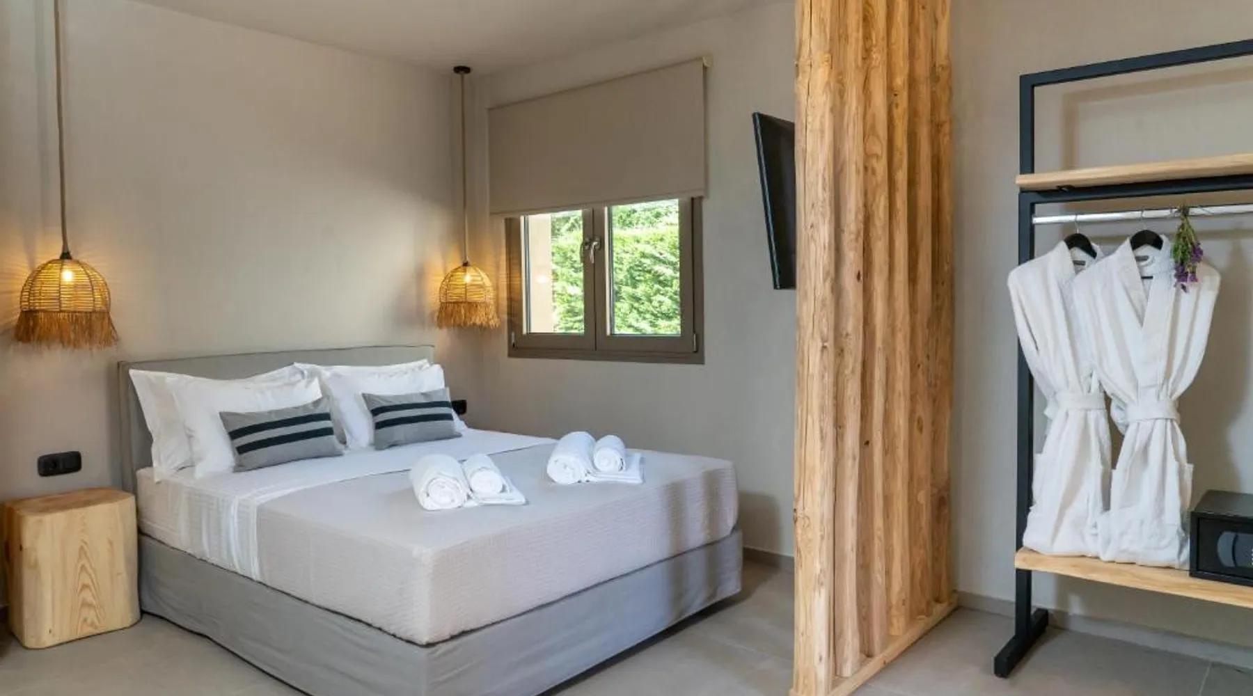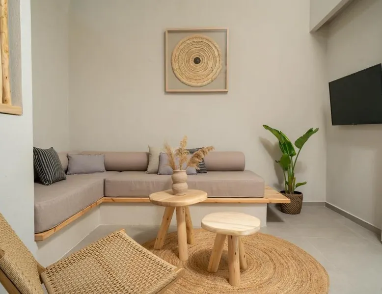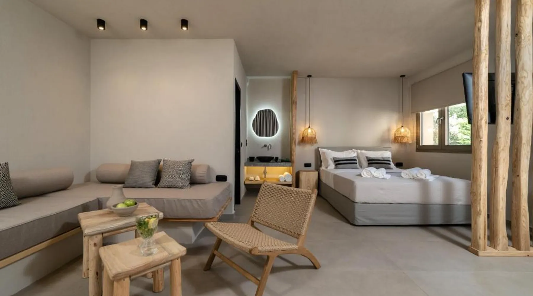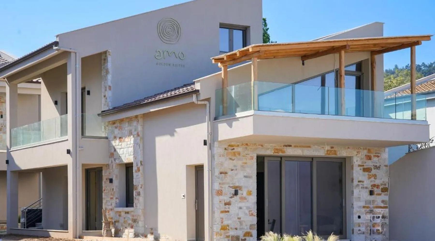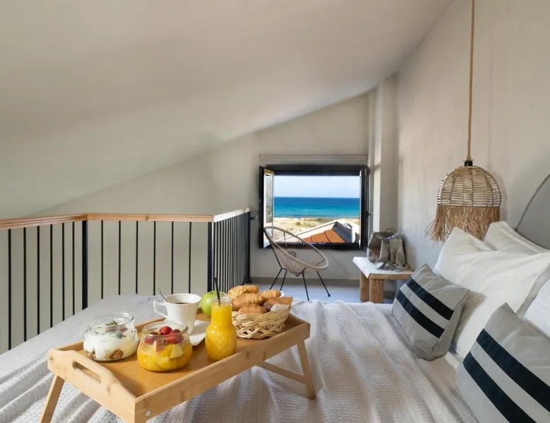 Elegant Accommodations: Amo Golden Suites in Chrysi Ammoudia offers a garden, terrace, and outdoor swimming pool. Guests enjoy free WiFi, sea views, and air-conditioning. Comfortable Amenities: Each room features a balcony, private bathroom, bathrobes, and free toiletries. Additional amenities include a work desk, TV, and dining area. Dining Options: A continental and à la carte breakfast is served, including juice, fresh pastries, cheese, and fruits. Prime Location: Located 21 mi from Kavala International Airport, the hotel is a 2-minute walk from Golden Beach and less than 0.6 mi from Παραλια Χρυση Αμμουδια. Nearby attractions include Museum Polygnotou Vagi and Agios Ioannis Church. Guest Satisfaction: Highly rated for beach access, attentive staff, and convenient location. The unit has 2 beds.