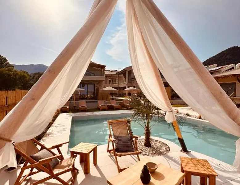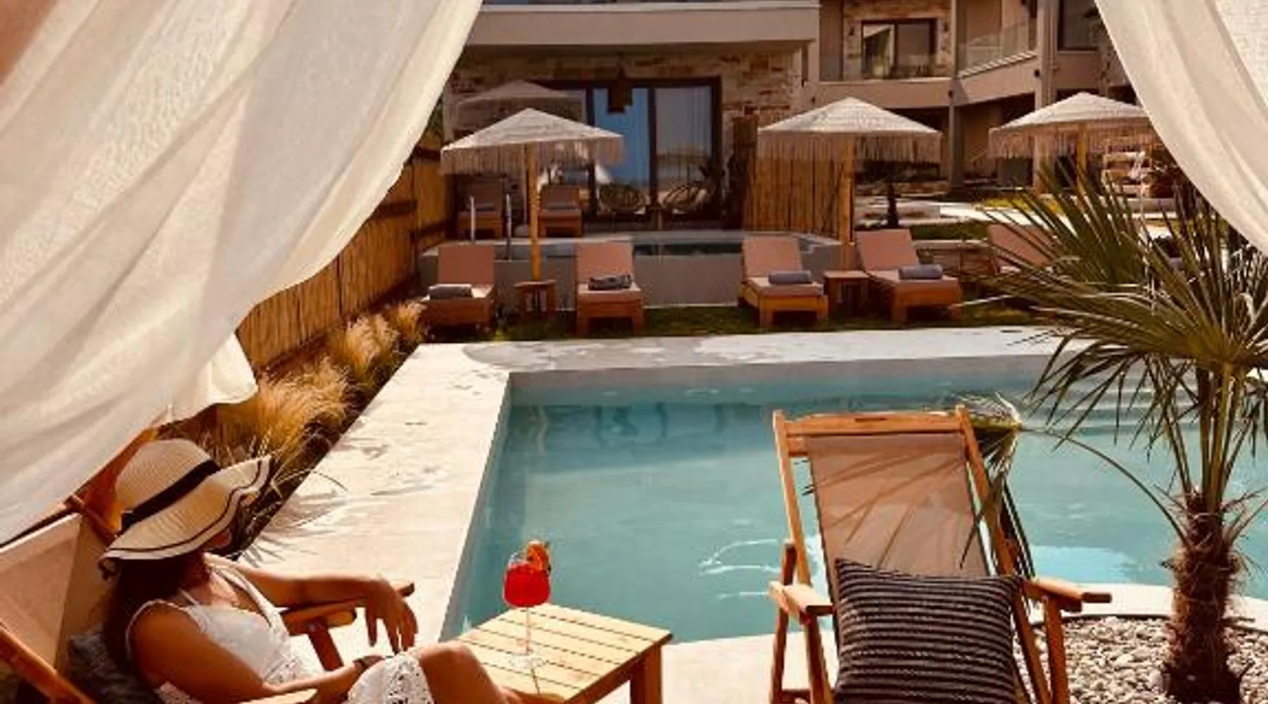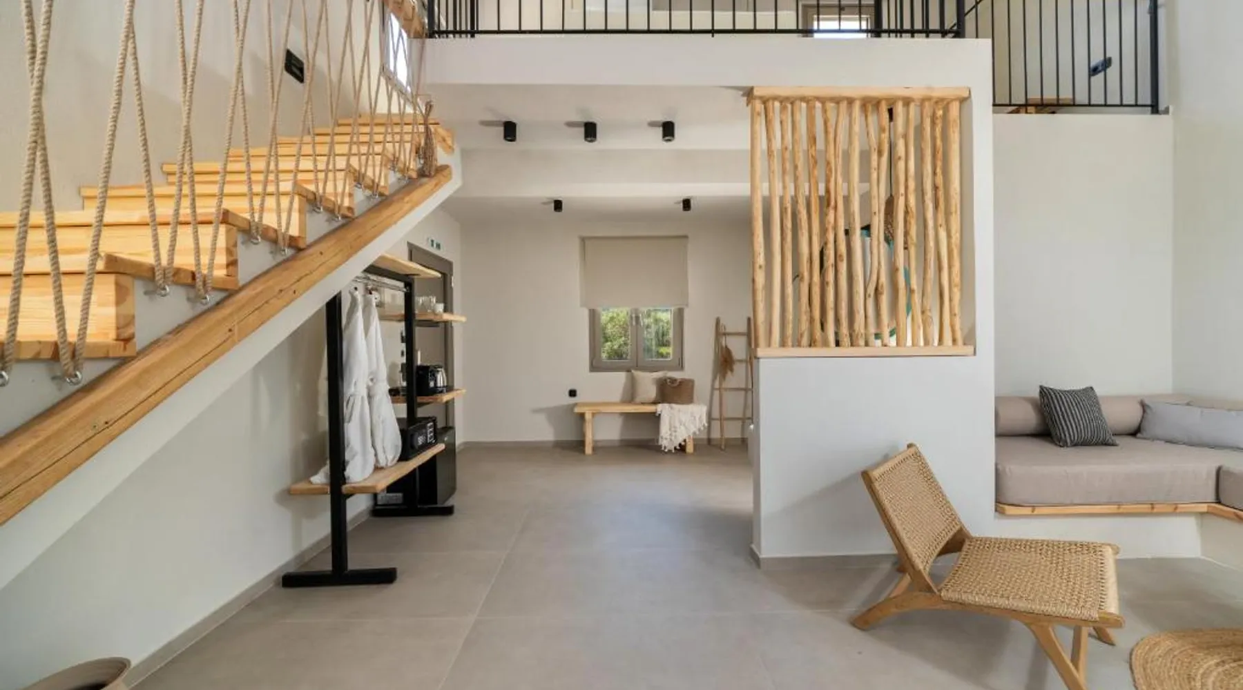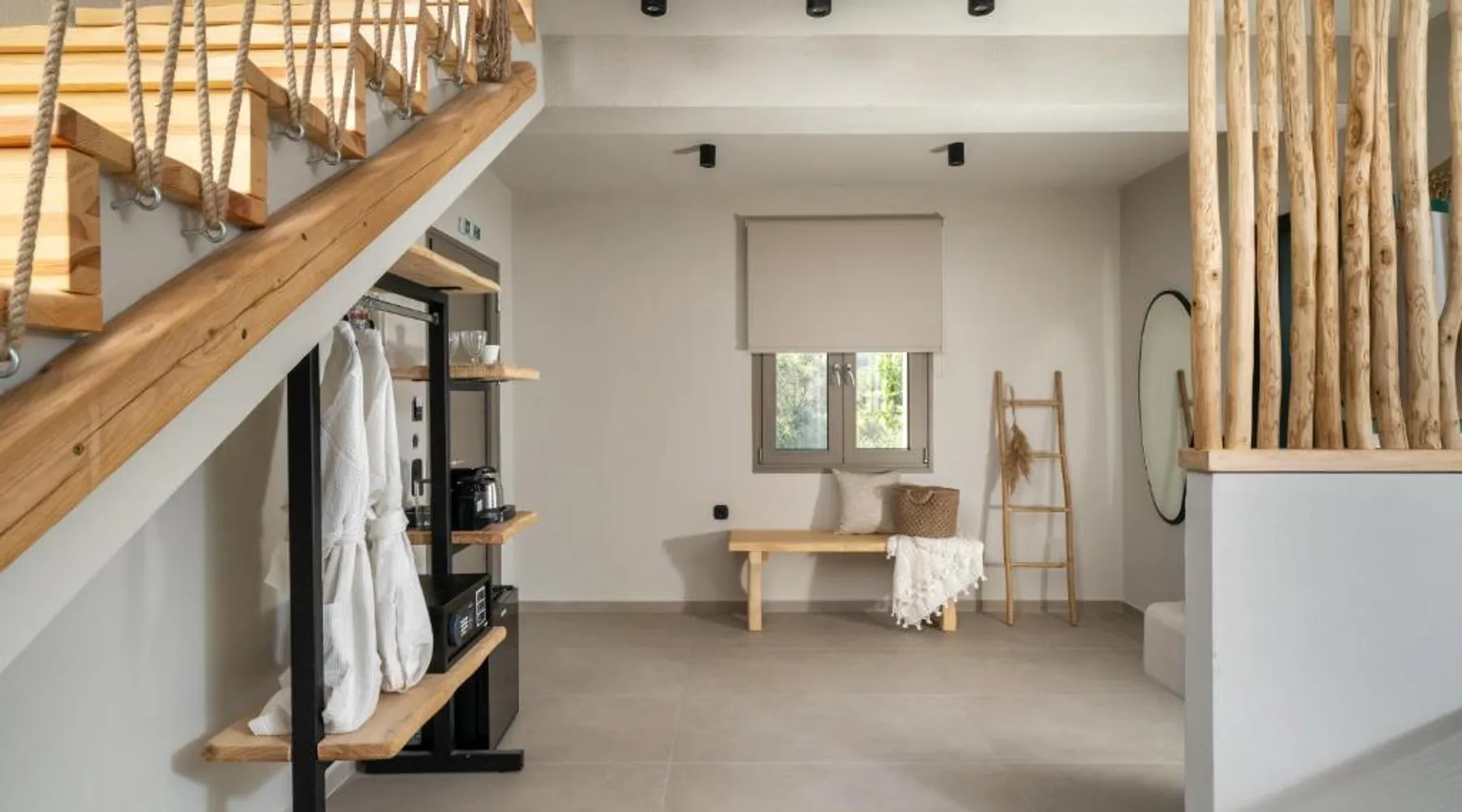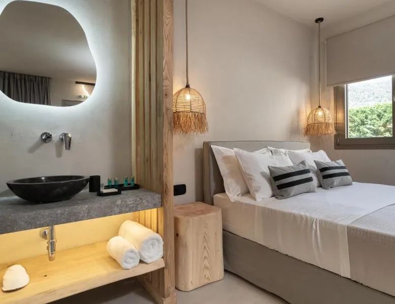 Elegant Accommodations: Amo Golden Suites in Chrysi Ammoudia offers a garden, terrace, and outdoor swimming pool. Guests enjoy free WiFi, sea views, and air-conditioning. Comfortable Amenities: Each room features a balcony, private bathroom, bathrobes, and free toiletries. Additional amenities include a work desk, TV, and dining area. Dining Options: A continental and à la carte breakfast is served, including juice, fresh pastries, cheese, and fruits. Prime Location: Located 21 mi from Kavala International Airport, the hotel is a 2-minute walk from Golden Beach and less than 0.6 mi from Παραλια Χρυση Αμμουδια. Nearby attractions include Museum Polygnotou Vagi and Agios Ioannis Church. Guest Satisfaction: Highly rated for beach access, attentive staff, and convenient location. The unit has 2 beds.