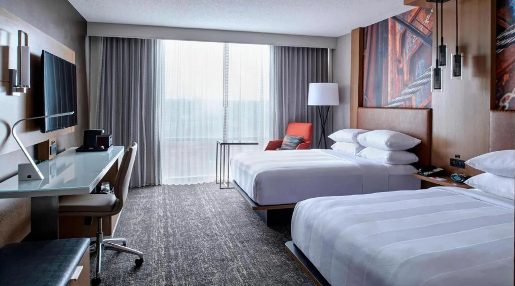 Comfortable Accommodations: Rooms feature air-conditioning, private bathrooms, tea and coffee makers, hairdryers, and free toiletries. Additional amenities include bathrobes, refrigerators, and mini-bars. Dining and Leisure: The hotel offers a terrace, restaurant, and bar. Guests can enjoy American cuisine at the on-site restaurant and relax at the bar. Convenient Facilities: The property includes a lounge, public bath, outdoor fireplace, fitness room, elevator, 24-hour front desk, electric vehicle charging station, outdoor seating area, breakfast in the room, express check-in and check-out services, and room service. Location and Attractions: Located in Pontiac, the hotel is 30 mi from Detroit Metro Airport. Nearby attractions include Meadow Brook Music Festival (8.1 mi) and Royal Oak Music Theater (11 mi). This air-conditioned double room includes a flat-screen TV with cable channels and a private bathroom. The unit offers 2 beds.