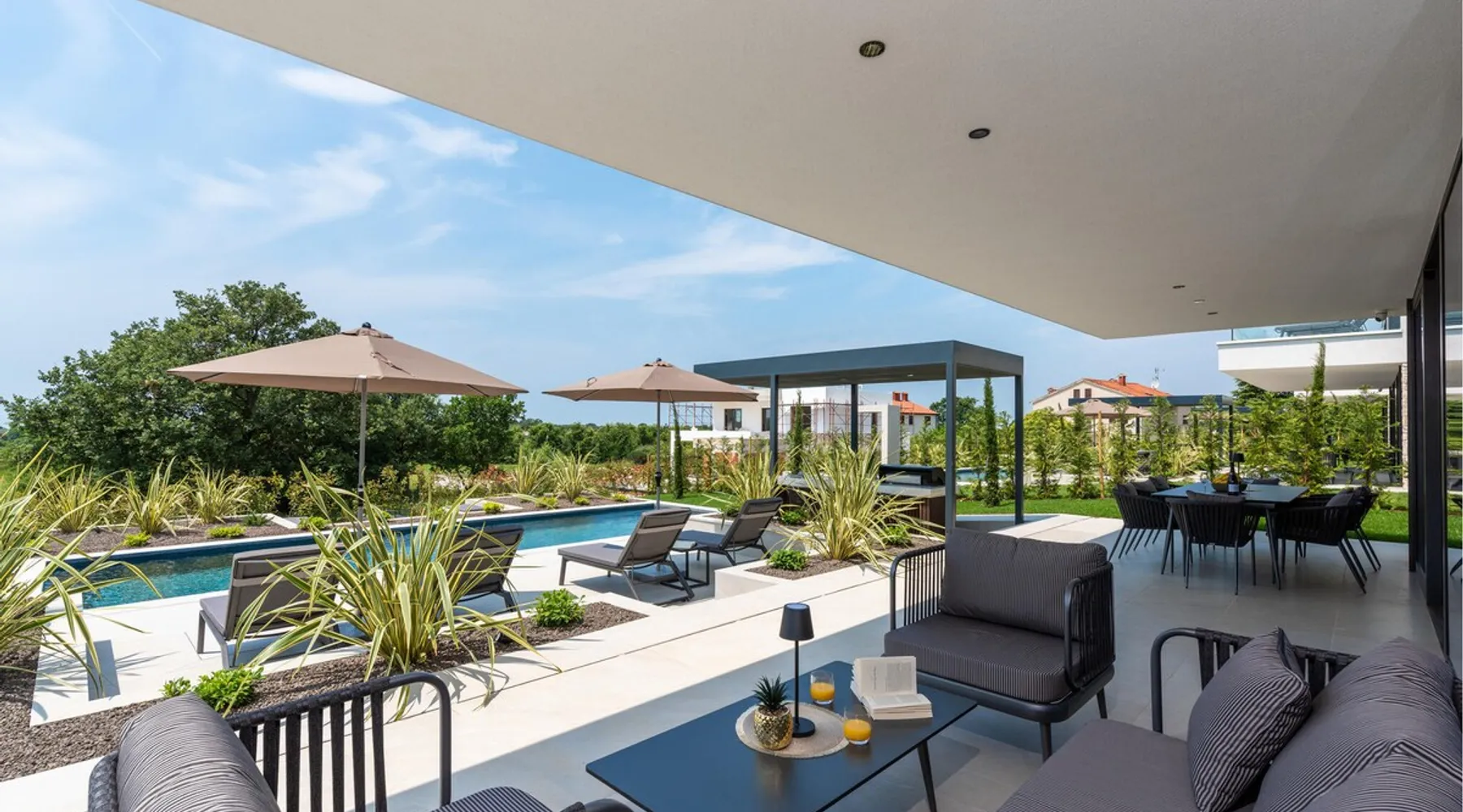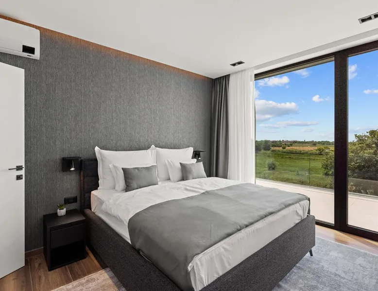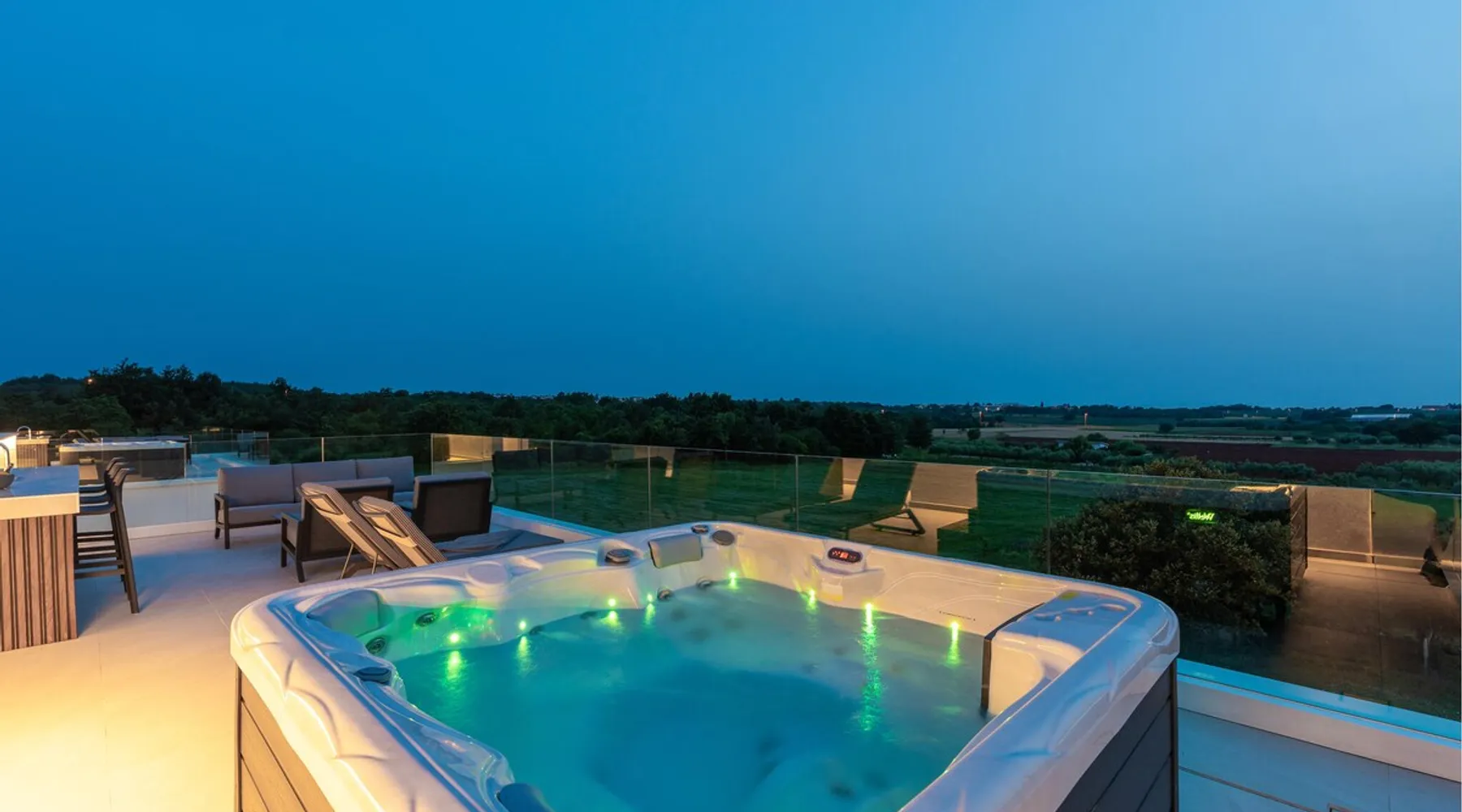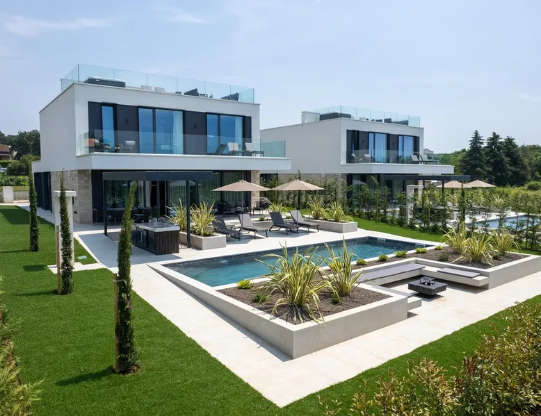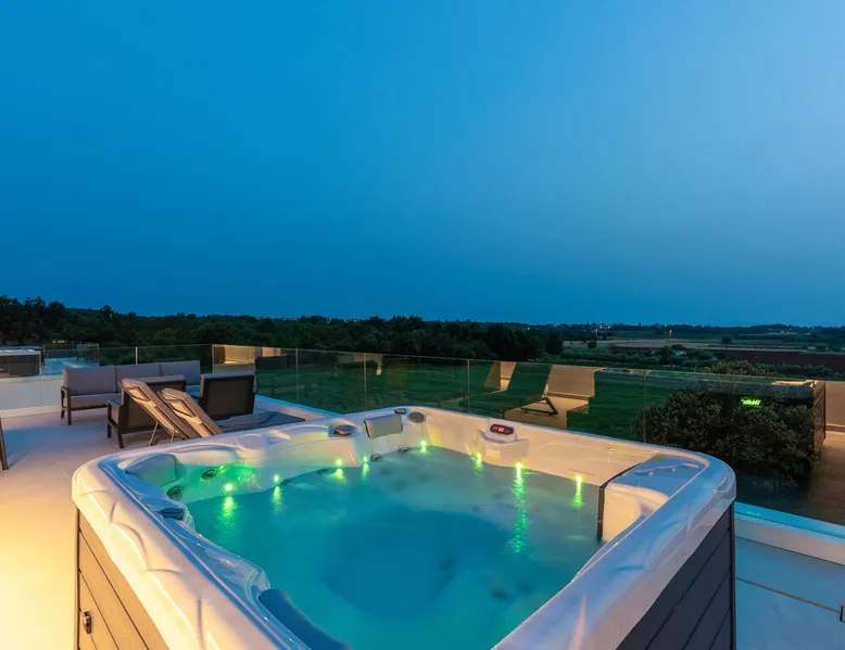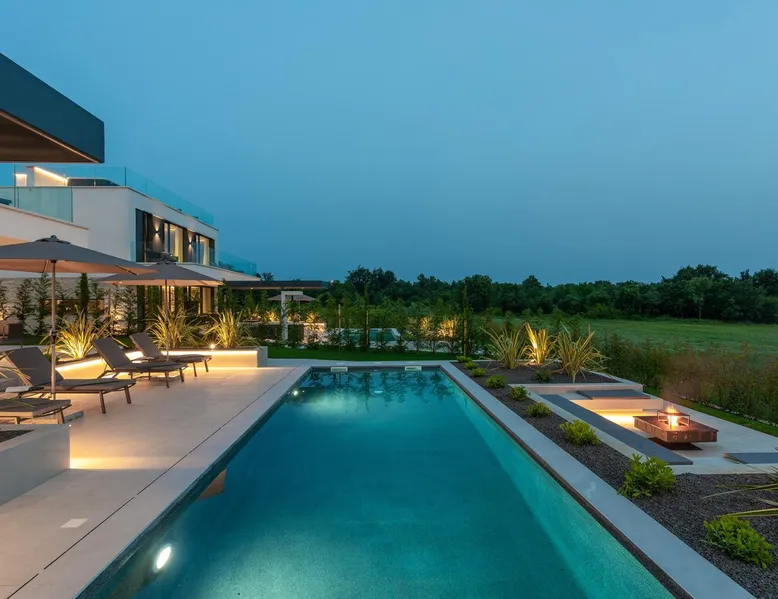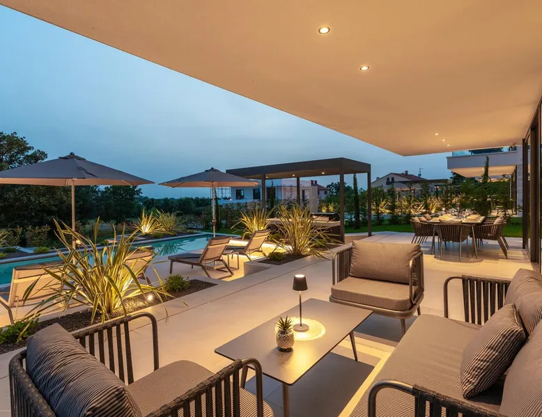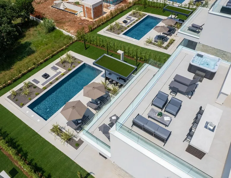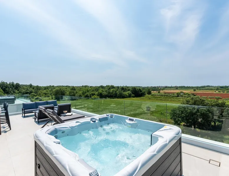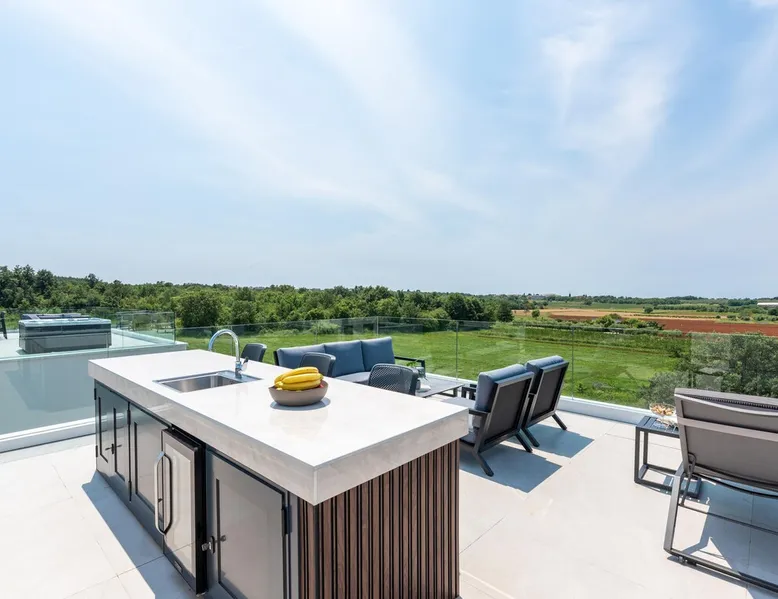 Experience a luxurious holiday in this exclusive holiday home in Porec Kukci. The space Experience a luxurious holiday in this exclusive holiday home in Porec Kukci. Welcome to your dream holiday. The two-storey villa will impress you with its stylish furnishings and modern amenities. High-quality materials, select design and attention to detail create an atmosphere of rest and relaxation in this holiday home. Numerous rooms invite you to enjoy your privacy or get together in the open-plan living room on the ground floor. The spacious bedrooms with en-suite bathrooms ensure maximum comfort. On the roof terrace you will find a whirlpool and a kitchenette with cooling facilities for drinks, perfect for relaxing evenings. The terrace with covered summer kitchen and adjoining pool with sun deck invites you to linger. A sauna and a fireplace offer additional relaxation and socialising. Discover the charming old town of Porec, just a few kilometres away, with its rich history and lively atmosphere. Go on bike tours or hikes through the picturesque Istrian countryside and find peace and quiet. For water sports enthusiasts, the nearby beaches offer a variety of opportunities for swimming, diving and sailing. Try out new water sports and really burn off some energy. You can also visit local wineries and enjoy the culinary specialities of the region. Note: Other identical holiday homes in the immediate vicinity offer space for larger groups or families. Can comfortably fit up to 8 people