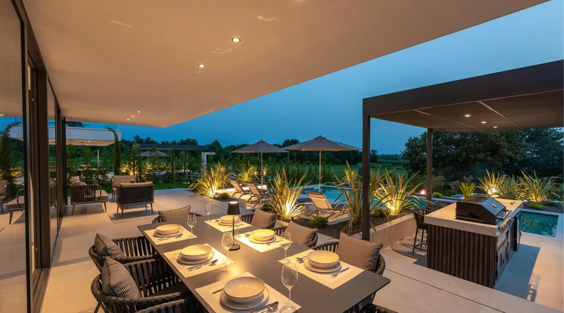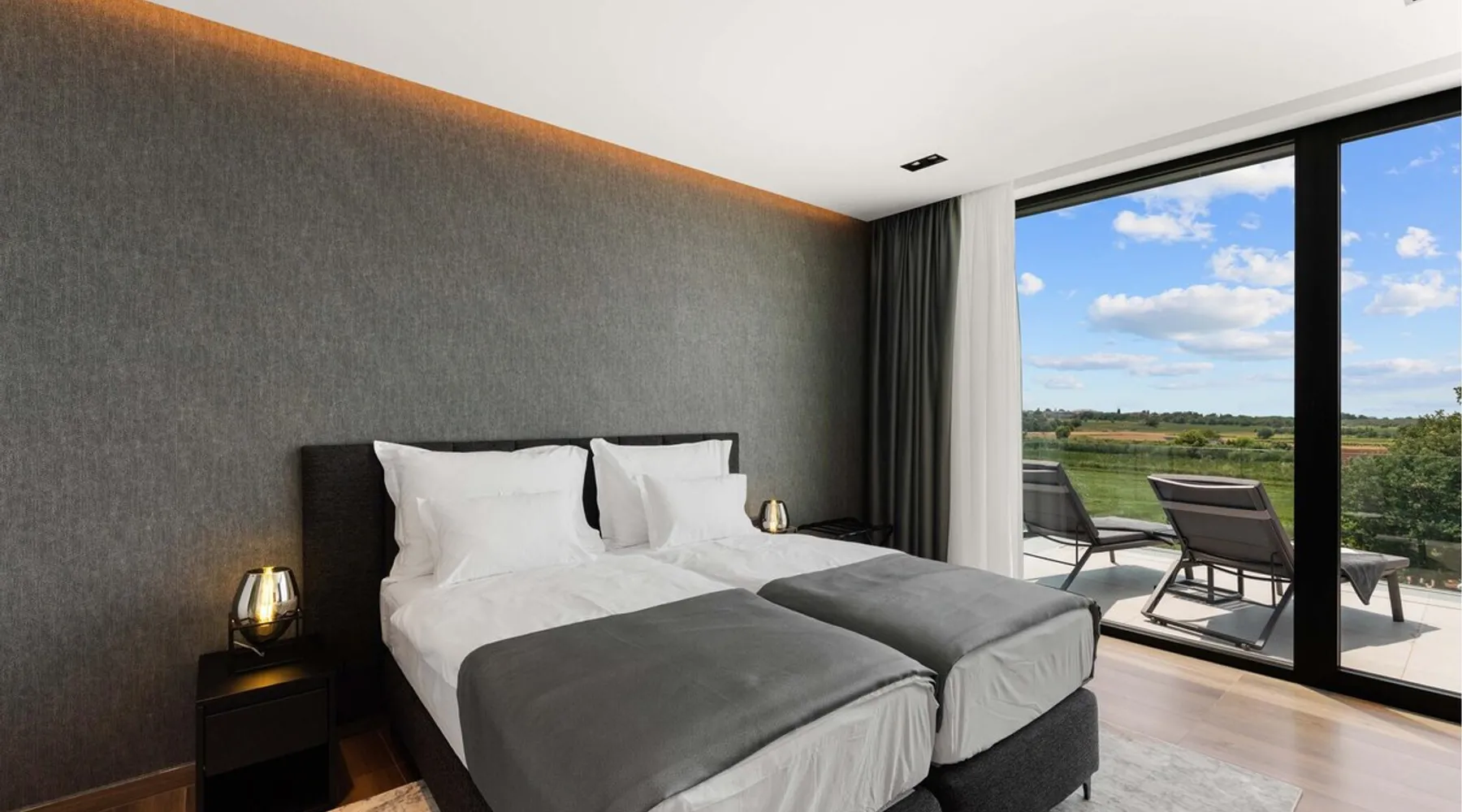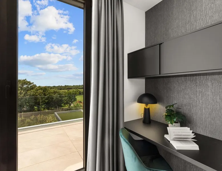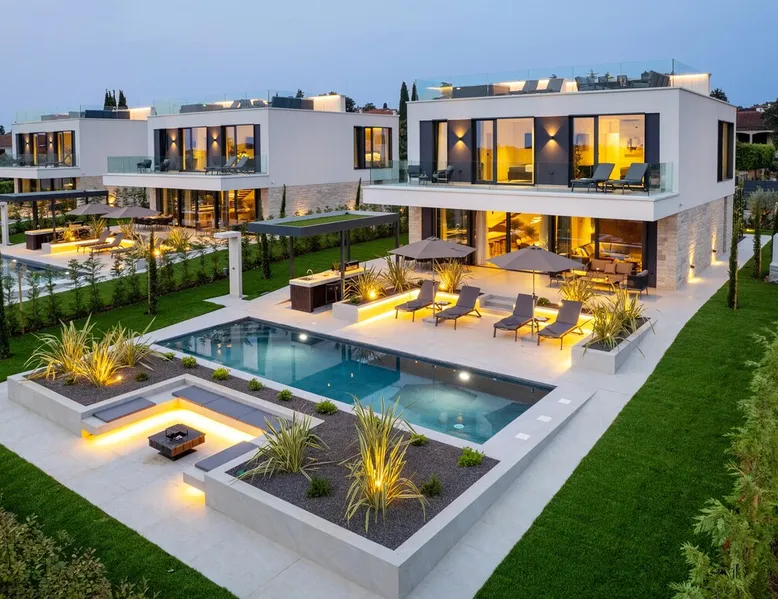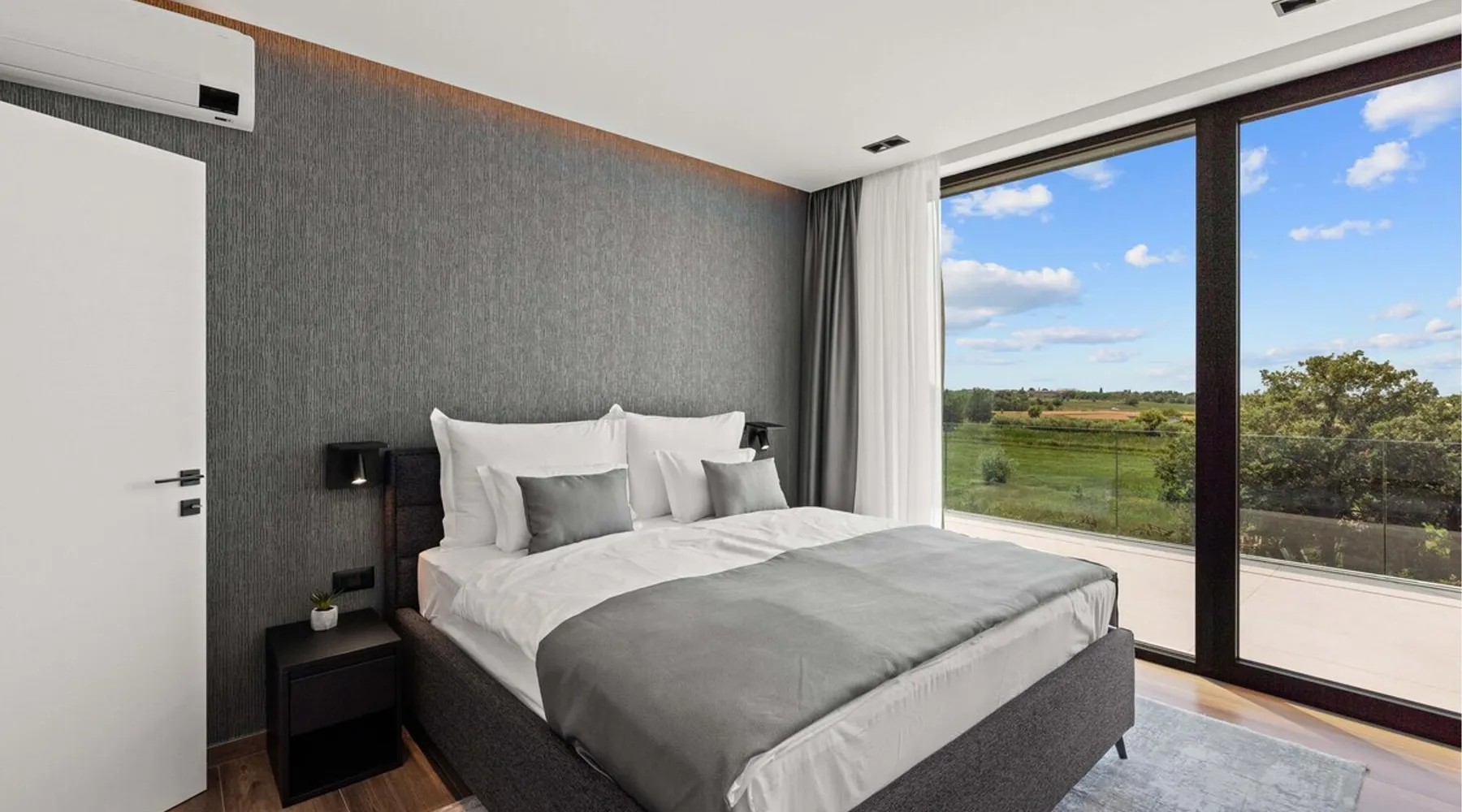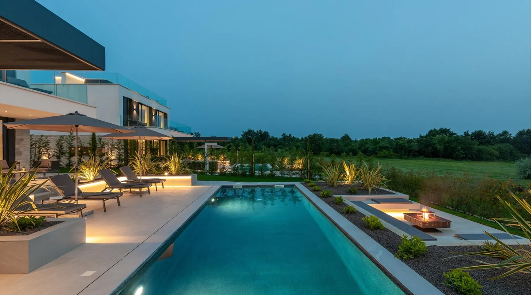 Experience a luxurious holiday in this exclusive holiday home in Porec Kukci. The space Experience a luxurious holiday in this exclusive holiday home in Porec Kukci. Welcome to your dream holiday. The two-storey villa will impress you with its stylish furnishings and modern amenities. High-quality materials, select design and attention to detail create an atmosphere of rest and relaxation in this holiday home. Numerous rooms invite you to enjoy your privacy or get together in the open-plan living room on the ground floor. The spacious bedrooms with en-suite bathrooms ensure maximum comfort. On the roof terrace you will find a whirlpool and a kitchenette with cooling facilities for drinks, perfect for relaxing evenings. The terrace with covered summer kitchen and adjoining pool with sun deck invites you to linger. A sauna and a fireplace offer additional relaxation and socialising. Discover the charming old town of Porec, just a few kilometres away, with its rich history and lively atmosphere. Go on bike tours or hikes through the picturesque Istrian countryside and find peace and quiet. For water sports enthusiasts, the nearby beaches offer a variety of opportunities for swimming, diving and sailing. Try out new water sports and really burn off some energy. You can also visit local wineries and enjoy the culinary specialities of the region. Note: Other identical holiday homes in the immediate vicinity offer space for larger groups or families. Can comfortably fit up to 8 people
