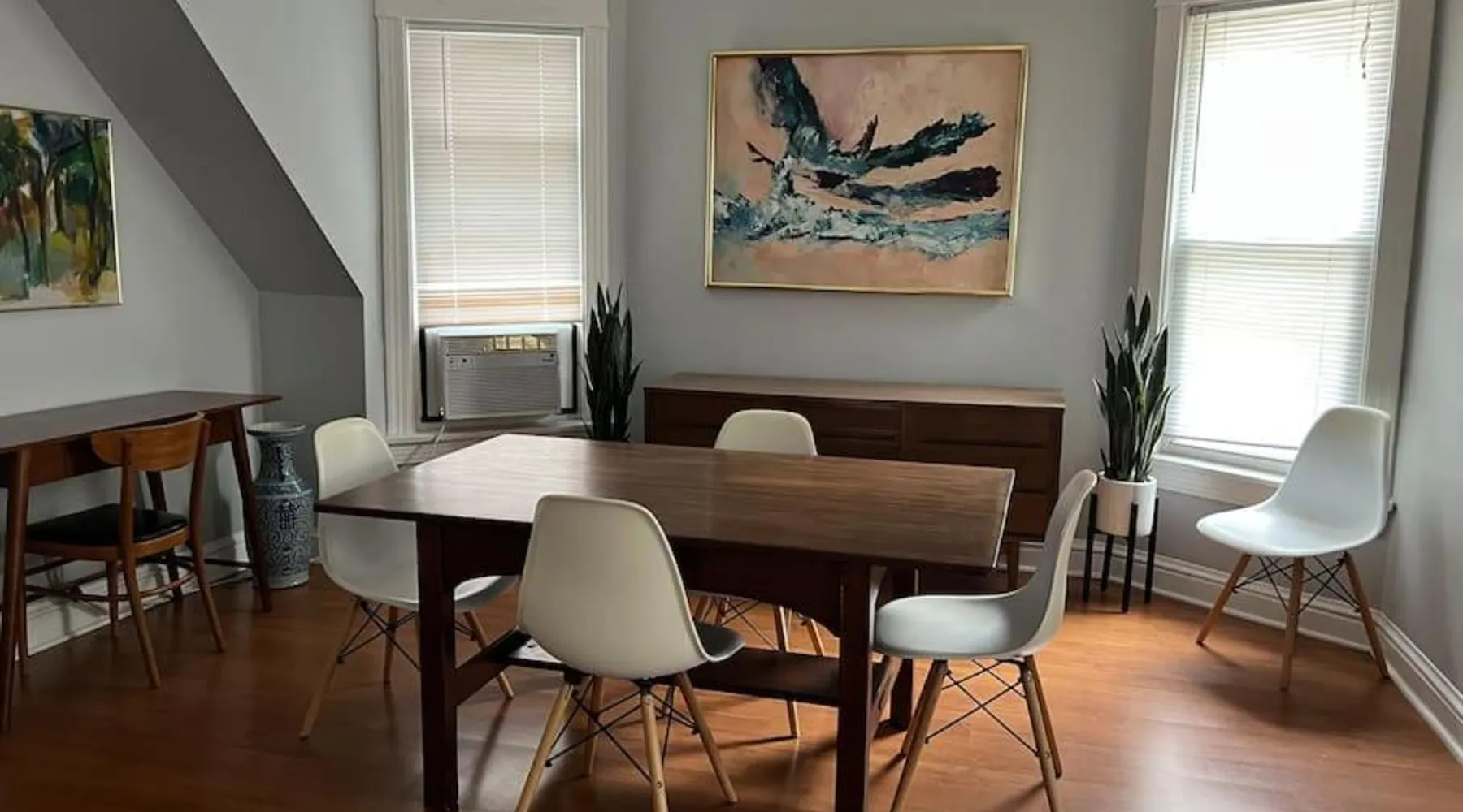 Spacious Accommodations: Bright, big family escape, W/parking, dogs welcome in Oak Park offers a spacious apartment with two bedrooms and a bathroom. Free WiFi and private on-site parking are available. Modern Amenities: The apartment includes air-conditioning, streaming services, a fully equipped kitchen with a coffee machine, dishwasher, and microwave. Additional features include a work desk, dining area, and a sofa. Convenient Location: Located 9.3 mi from Chicago O'Hare International Airport, the property is near attractions such as United Center (6.2 mi), Water Tower Chicago (8.1 mi), and Lincoln Park Zoo (9.3 mi). An ice-skating rink is also nearby. Guest Satisfaction: Highly rated by guests for its convenient location, the apartment provides a comfortable and welcoming environment. In the well-fitted kitchen, guests will find a stovetop, a refrigerator, a dishwasher and kitchenware. The spacious air-conditioned apartment offers a flat-screen TV with streaming services, a private entrance, a tea and coffee maker and a seating area. The unit has 2 beds.