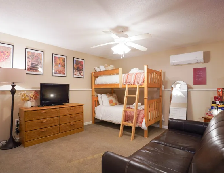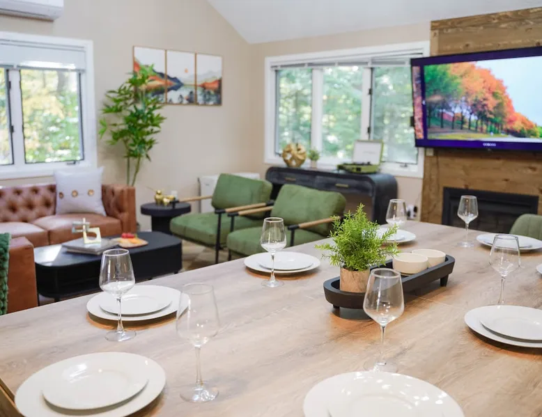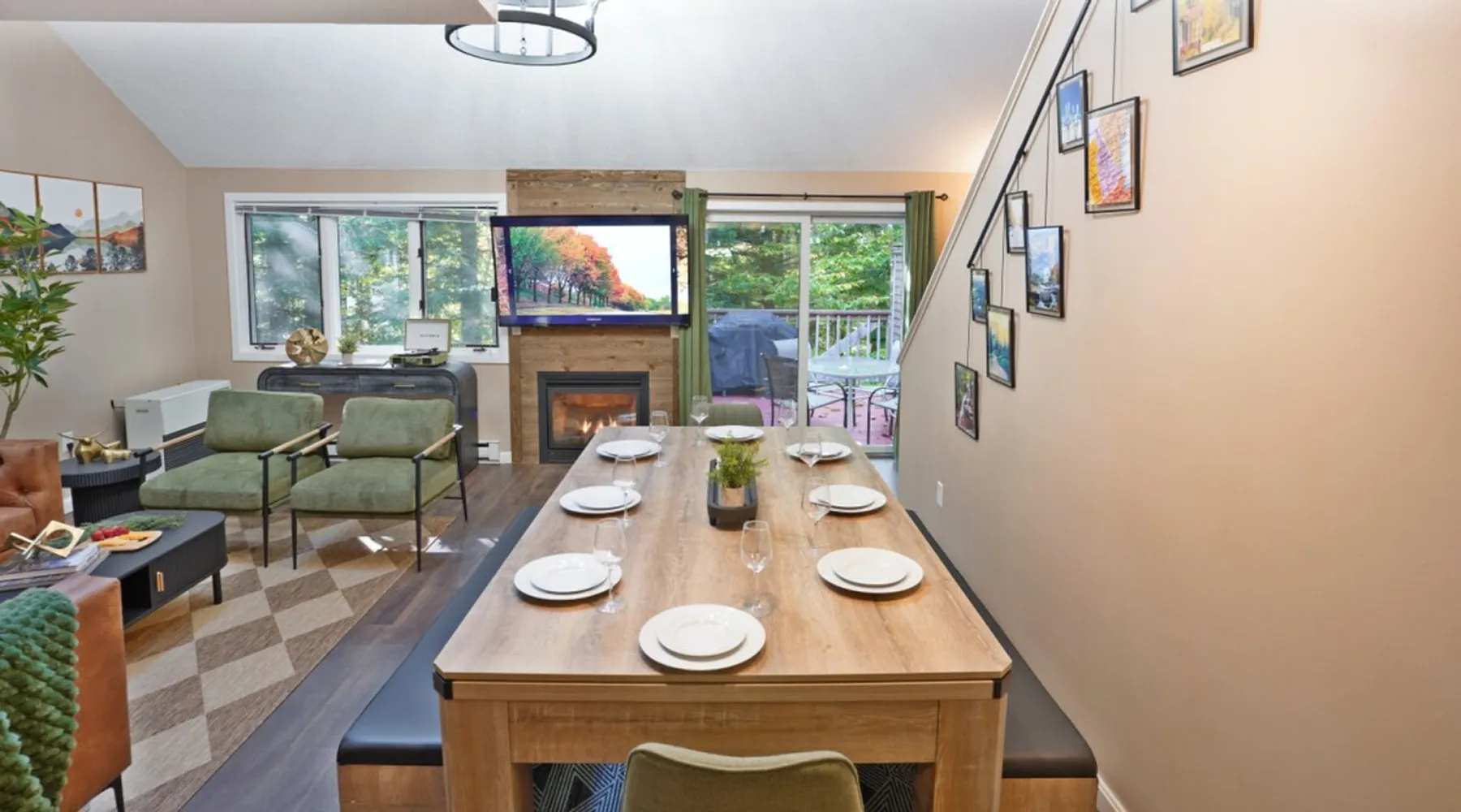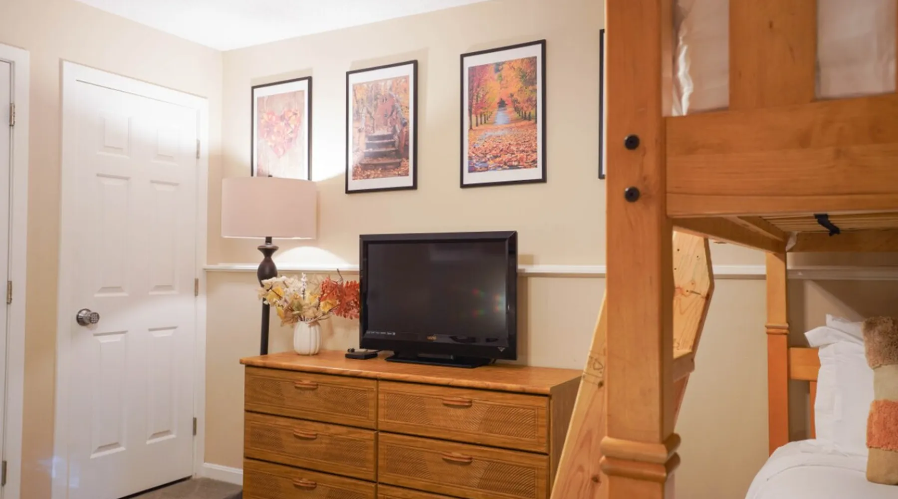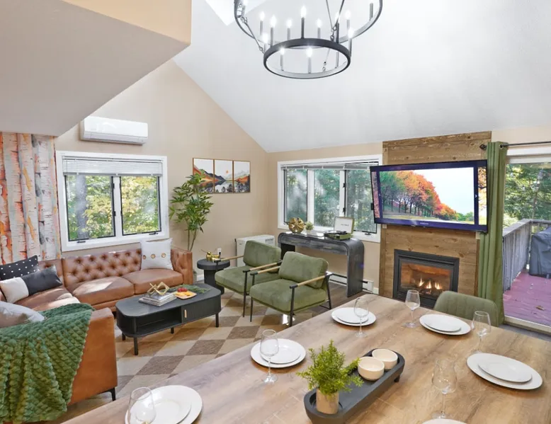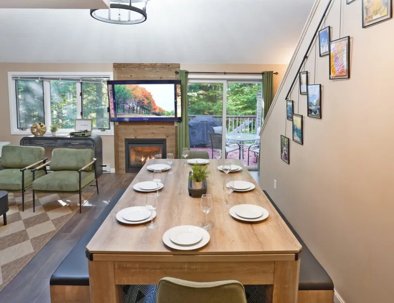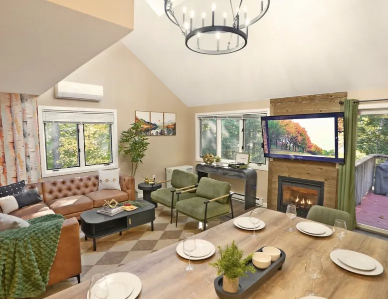 Welcome to Cranmore Hideaway — a cozy, newly designed 3-bedroom, 2-bath townhome tucked away in the heart of North Conway. Surrounded by peaceful forest views, this charming retreat offers the perfect blend of rustic character and modern comfort, ideal for families, couples, or small groups year-round. The space Whether you're visiting for a snowy ski getaway, a vibrant fall foliage tour, a summer hiking adventure, or a springtime escape, you'll find comfort and inspiration here. Just 5 minutes from Cranmore Mountain Resort and close to downtown's shops, restaurants, and attractions, the location is perfect for exploring everything the White Mountains have to offer. After a day of adventure or relaxation, return to your private deck and unwind in the fresh mountain air. Cranmore Hideaway is your four-season sanctuary — book your stay today and make lasting memories in every season. This 3-level townhome is the perfect family-friendly retreat for your next White Mountain adventure, offering 3 bedrooms and 2 baths, with sleeping arrangements for up to 8 guests. Thoughtfully designed for comfort and relaxation, this cozy escape provides plenty of space for everyone to spread out while making the most of your time together. Main Level: The main level features an open-concept kitchen and living area with soaring vaulted ceilings and gorgeous wagon wheel chandelier. The living room boasts a wood-accented gas fireplace, creating a perfect spot to relax after a day on the slopes. This level also includes a bedroom (queen) and bathroom, along with a cozy coffee bar stocked with local brews for your enjoyment. Upper Level: The entire upper level is a large primary bedroom (king) suite with a bathroom, a standing shower and separate soaking tub for apres-ski relaxation. Lower Level: It includes bunk beds (twin over twin) and a full sofa bed, offering additional sleeping space. This area can also serve as a second living room, perfect for playing games or watching TV. Amenities include fully stocked kitchen, furnished bedrooms, smart TV (in living room and all bedrooms), central heating, split ACs in all rooms and exclusive access to the community's tennis court and playground. DINING AREA + GAME SPACE: We have a lovely dining nook (seats 8) where you can enjoy a relaxed meal or enjoy board games with your family and friends. The nook includes billiards, table tennis, and a dining table with dual storage bench seating (all in one). Challenge your companions to various games for a laid-back evening indoors. PARKING: House comes with 2 car dedicated parking spots (right outside the house) KITCHEN + COFFEE BAR When it's time to refuel, the fully equipped kitchen provides everything you need to whip up delicious meals and snacks. Enjoy your culinary creations at the dining table. Our coffee station provides a variety of local brews and teas. OUTDOOR: Step right outside from the main living area to a charming porch, perfect for summer dining or enjoying a BBQ grill session. ABOUT THE LOCATION: After a day of outdoor fun, come home to unwind by the cozy gas fireplace. Whether you're here for skiing, hiking, or simply soaking in the serene surroundings, this condo is the perfect base for your Conway adventures. Book now for a memorable mountain escape! ADDITIONAL: We do have video surveillance of the front door, parking and backyard which helps us in maintaining the property from a distance. The video is motion activated, but can be checked at any time by the hosts via live feed. Any attempt at disabling or obscuring the cameras is prohibited. PETS: - Up to 2 pets allowed ($100 fee per stay). Approval needed for more, with extra fees. - Keep pets leashed while walking in the neighborhood. - No unattended pets - No pets on furniture (sofas, beds, etc). - Clean up after them inside and outside - Prevent excessive barking or noise. While $100 pet fee covers extra cleaning, but additional charges apply for uncollected pet waste, soiled linens, or damaged furniture. Thanks for keeping our space pet-friendly for all! SMOKING/DRUGS POLICY This is no smoking and no drug use house. Use of such is strictly prohibited inside or outside on premises. $500 fee for evidence of smoking or drug use plus additional cleaning fees apply. The nightly rates are reflective of minimum guest booking with no pets. We request you to add the exact count of guests, children and pets at the time of reservation for the nightly rates to be accurately reflected for any additional charges.