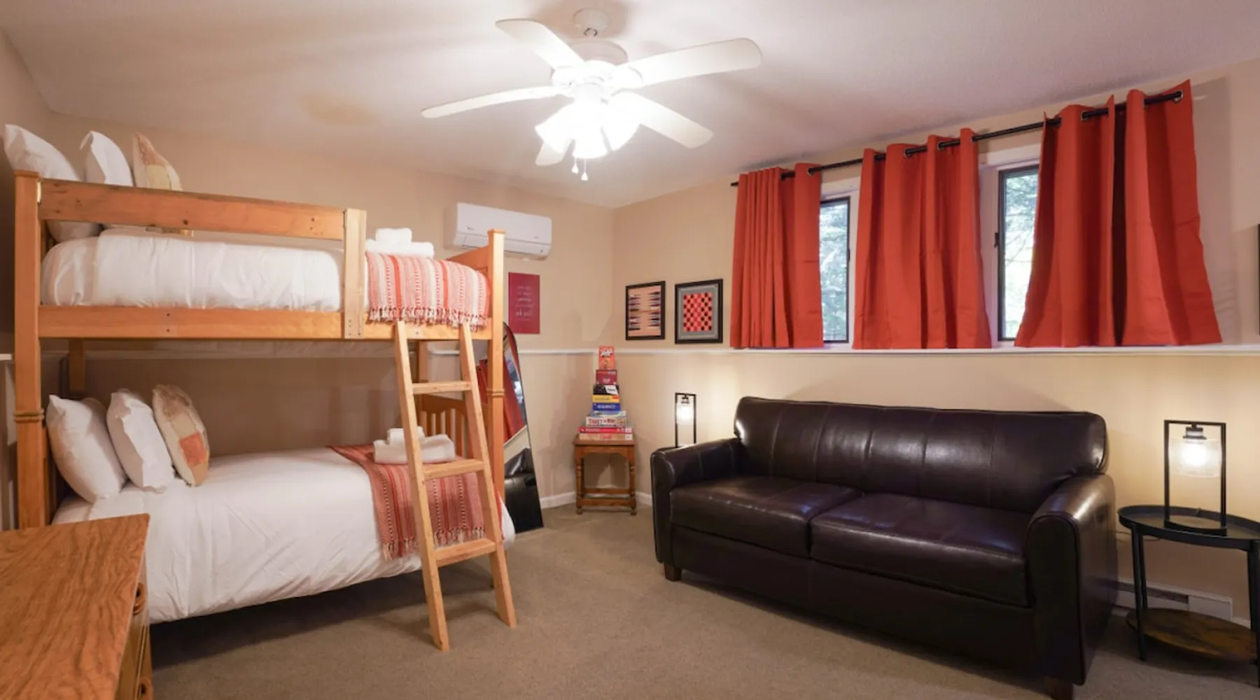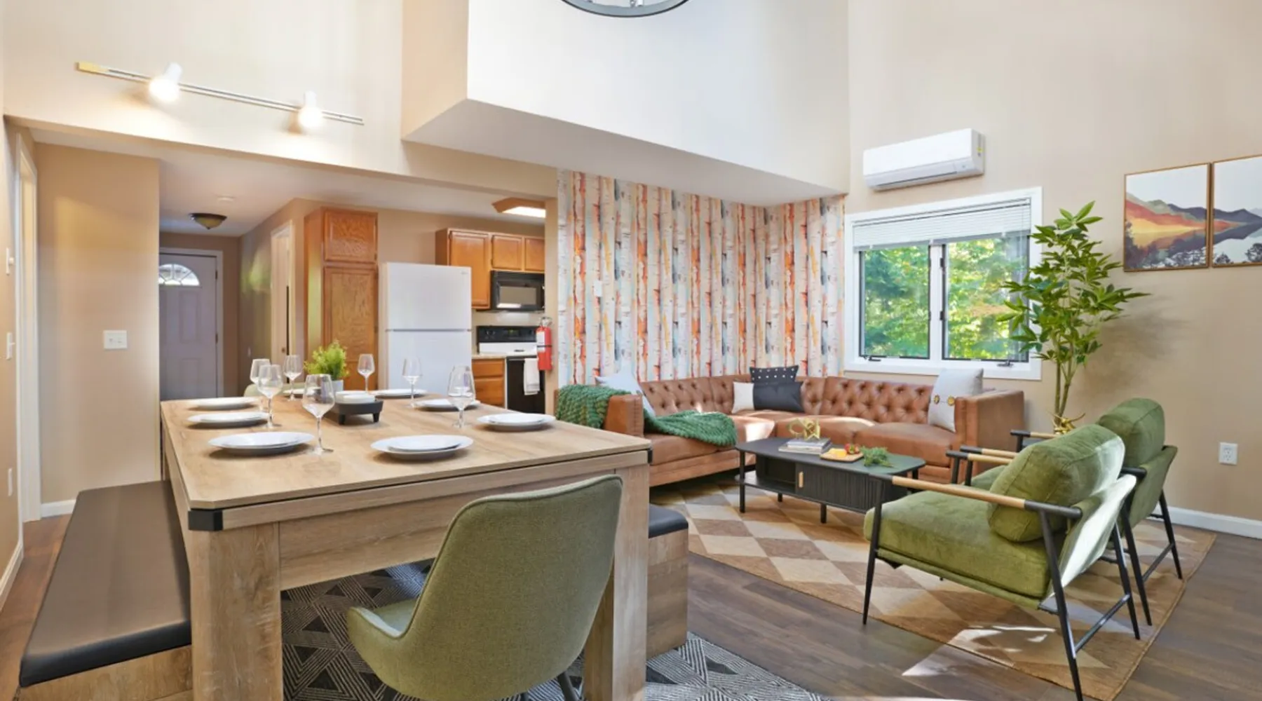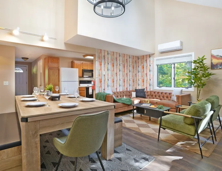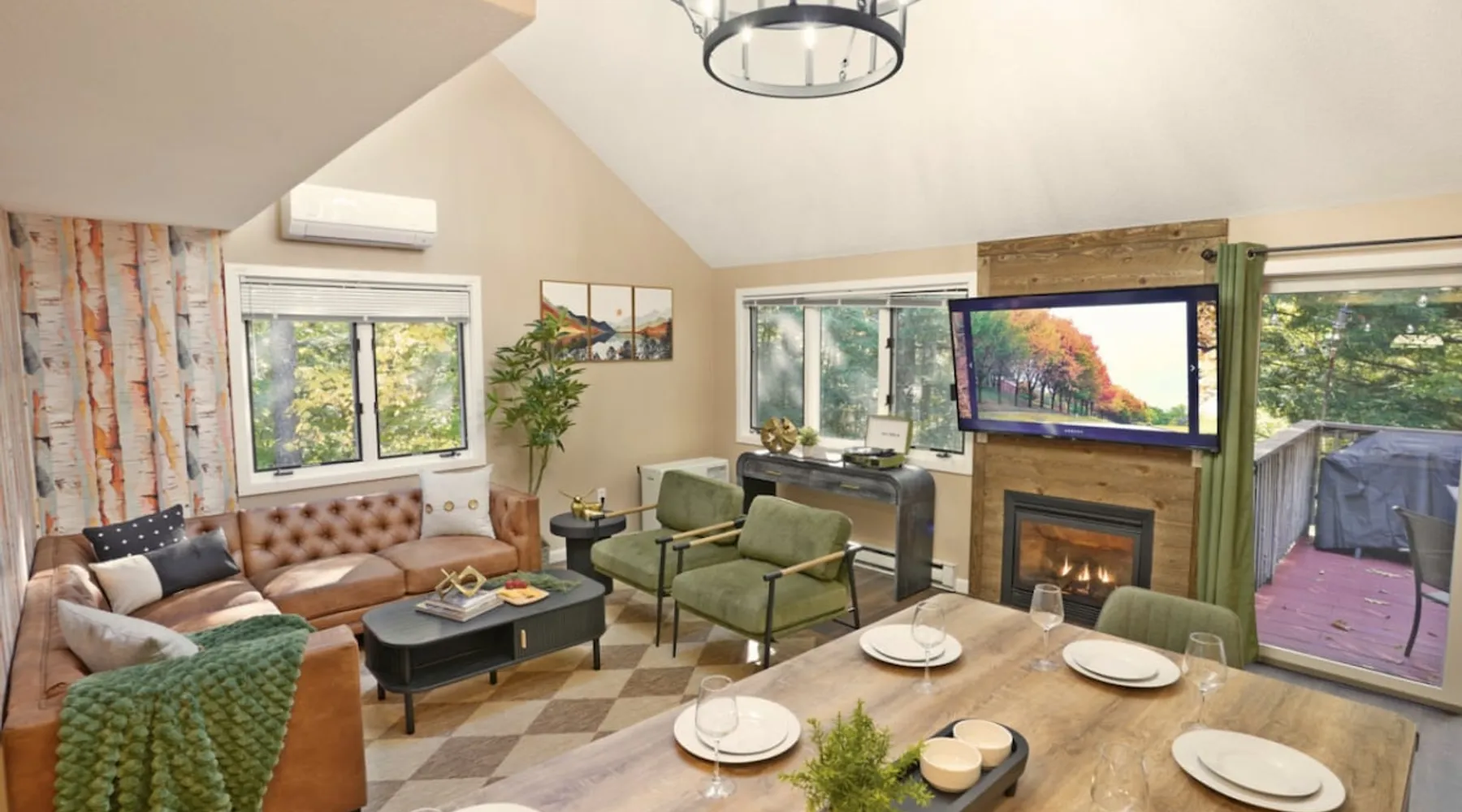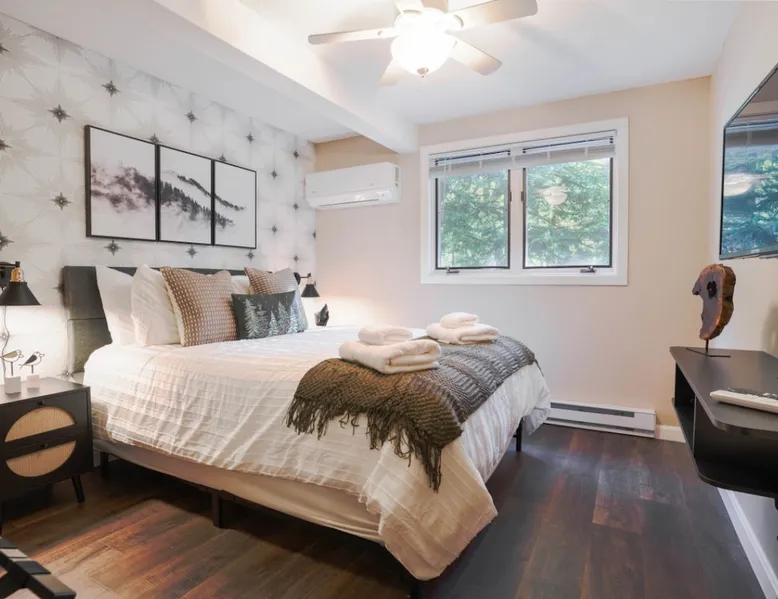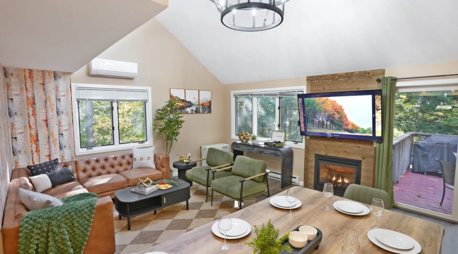 Welcome to Cranmore Hideaway — a cozy, newly designed 3-bedroom, 2-bath townhome tucked away in the heart of North Conway. Surrounded by peaceful forest views, this charming retreat offers the perfect blend of rustic character and modern comfort, ideal for families, couples, or small groups year-round. The space Whether you're visiting for a snowy ski getaway, a vibrant fall foliage tour, a summer hiking adventure, or a springtime escape, you'll find comfort and inspiration here. Just 5 minutes from Cranmore Mountain Resort and close to downtown's shops, restaurants, and attractions, the location is perfect for exploring everything the White Mountains have to offer. After a day of adventure or relaxation, return to your private deck and unwind in the fresh mountain air. Cranmore Hideaway is your four-season sanctuary — book your stay today and make lasting memories in every season. This 3-level townhome is the perfect family-friendly retreat for your next White Mountain adventure, offering 3 bedrooms and 2 baths, with sleeping arrangements for up to 8 guests. Thoughtfully designed for comfort and relaxation, this cozy escape provides plenty of space for everyone to spread out while making the most of your time together. Main Level: The main level features an open-concept kitchen and living area with soaring vaulted ceilings and gorgeous wagon wheel chandelier. The living room boasts a wood-accented gas fireplace, creating a perfect spot to relax after a day on the slopes. This level also includes a bedroom (queen) and bathroom, along with a cozy coffee bar stocked with local brews for your enjoyment. Upper Level: The entire upper level is a large primary bedroom (king) suite with a bathroom, a standing shower and separate soaking tub for apres-ski relaxation. Lower Level: It includes bunk beds (twin over twin) and a full sofa bed, offering additional sleeping space. This area can also serve as a second living room, perfect for playing games or watching TV. Amenities include fully stocked kitchen, furnished bedrooms, smart TV (in living room and all bedrooms), central heating, split ACs in all rooms and exclusive access to the community's tennis court and playground. DINING AREA + GAME SPACE: We have a lovely dining nook (seats 8) where you can enjoy a relaxed meal or enjoy board games with your family and friends. The nook includes billiards, table tennis, and a dining table with dual storage bench seating (all in one). Challenge your companions to various games for a laid-back evening indoors. PARKING: House comes with 2 car dedicated parking spots (right outside the house) KITCHEN + COFFEE BAR When it's time to refuel, the fully equipped kitchen provides everything you need to whip up delicious meals and snacks. Enjoy your culinary creations at the dining table. Our coffee station provides a variety of local brews and teas. OUTDOOR: Step right outside from the main living area to a charming porch, perfect for summer dining or enjoying a BBQ grill session. ABOUT THE LOCATION: After a day of outdoor fun, come home to unwind by the cozy gas fireplace. Whether you're here for skiing, hiking, or simply soaking in the serene surroundings, this condo is the perfect base for your Conway adventures. Book now for a memorable mountain escape! ADDITIONAL: We do have video surveillance of the front door, parking and backyard which helps us in maintaining the property from a distance. The video is motion activated, but can be checked at any time by the hosts via live feed. Any attempt at disabling or obscuring the cameras is prohibited. PETS: - Up to 2 pets allowed ($100 fee per stay). Approval needed for more, with extra fees. - Keep pets leashed while walking in the neighborhood. - No unattended pets - No pets on furniture (sofas, beds, etc). - Clean up after them inside and outside - Prevent excessive barking or noise. While $100 pet fee covers extra cleaning, but additional charges apply for uncollected pet waste, soiled linens, or damaged furniture. Thanks for keeping our space pet-friendly for all! SMOKING/DRUGS POLICY This is no smoking and no drug use house. Use of such is strictly prohibited inside or outside on premises. $500 fee for evidence of smoking or drug use plus additional cleaning fees apply. The nightly rates are reflective of minimum guest booking with no pets. We request you to add the exact count of guests, children and pets at the time of reservation for the nightly rates to be accurately reflected for any additional charges.
